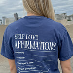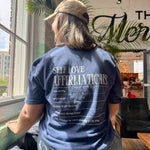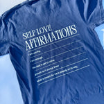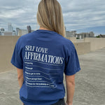 Spread love and positivity with our Affirmations Tee! This self-affirmation tshirt in a gorgeous blue reminds you to love yourself and radiate positivity. The perfect addition to your daily wardrobe. (Self-love never looked so good!)