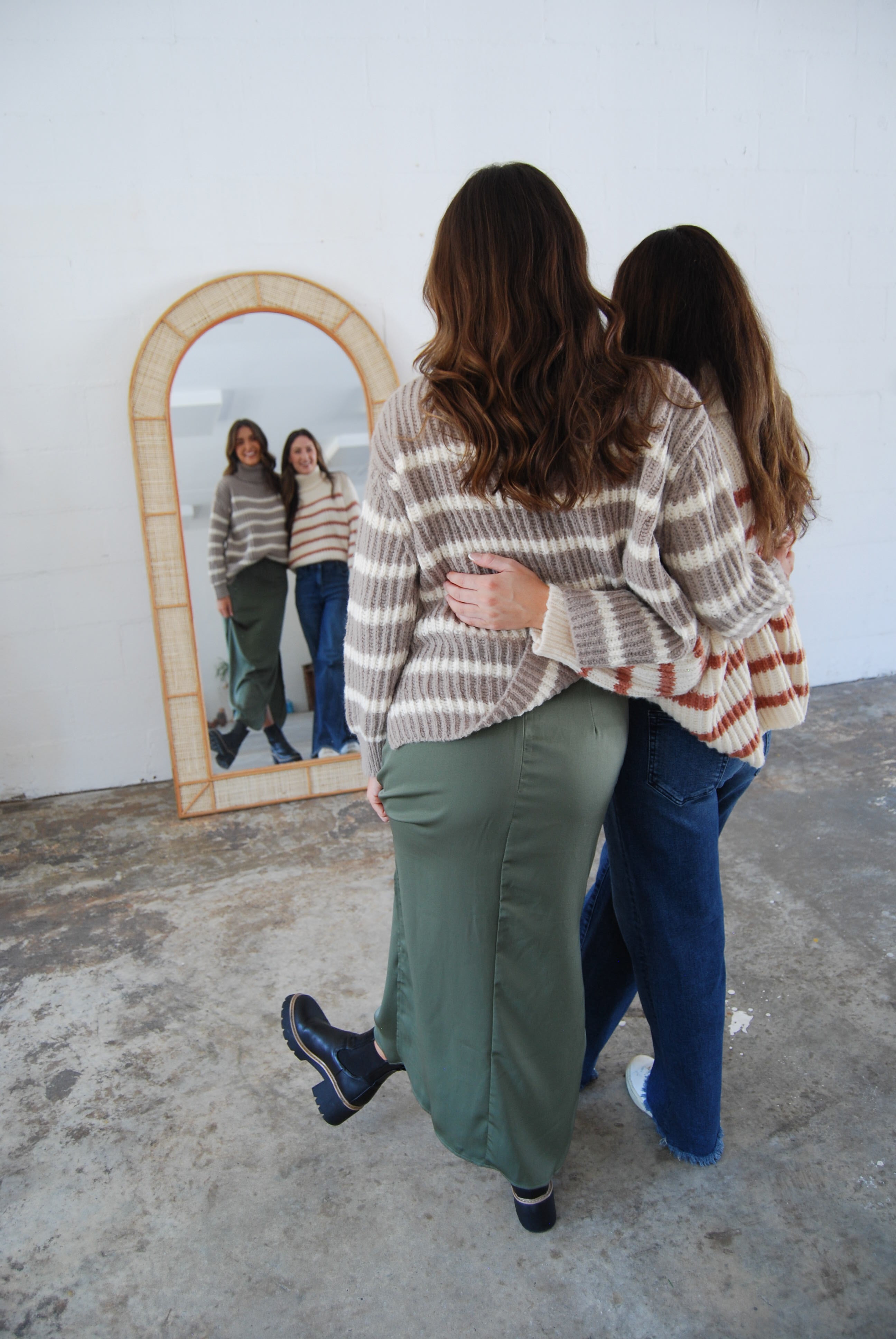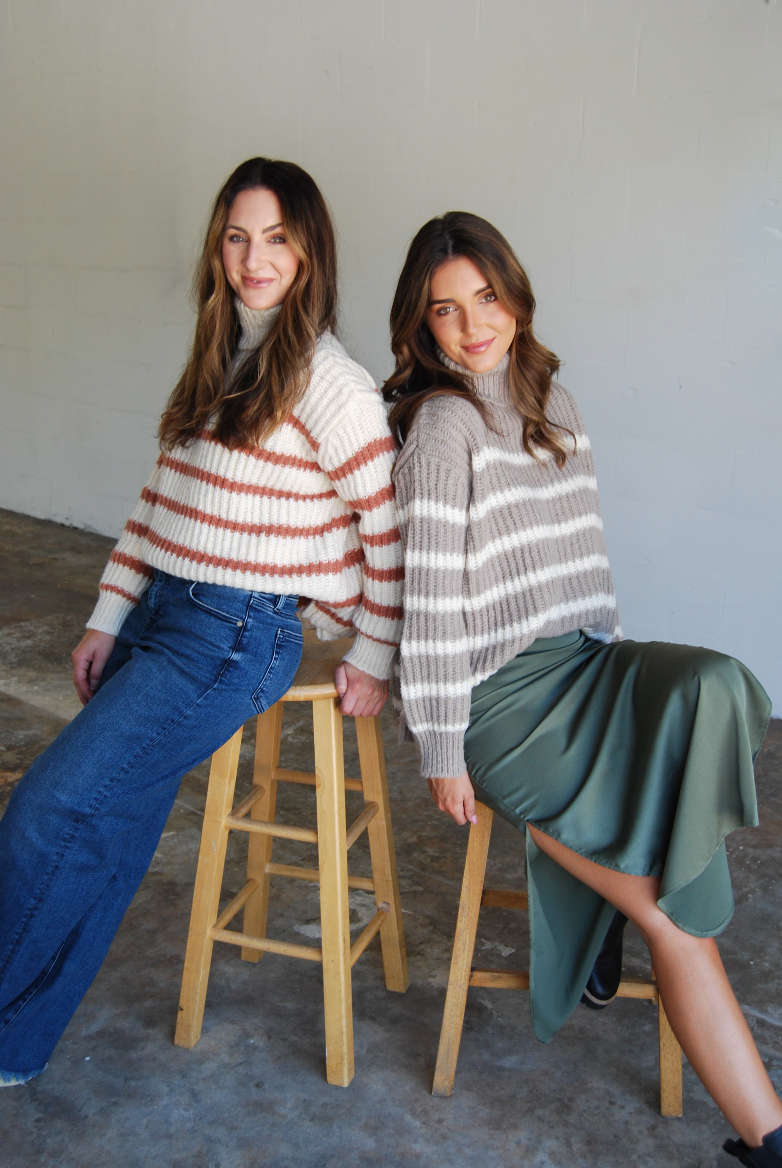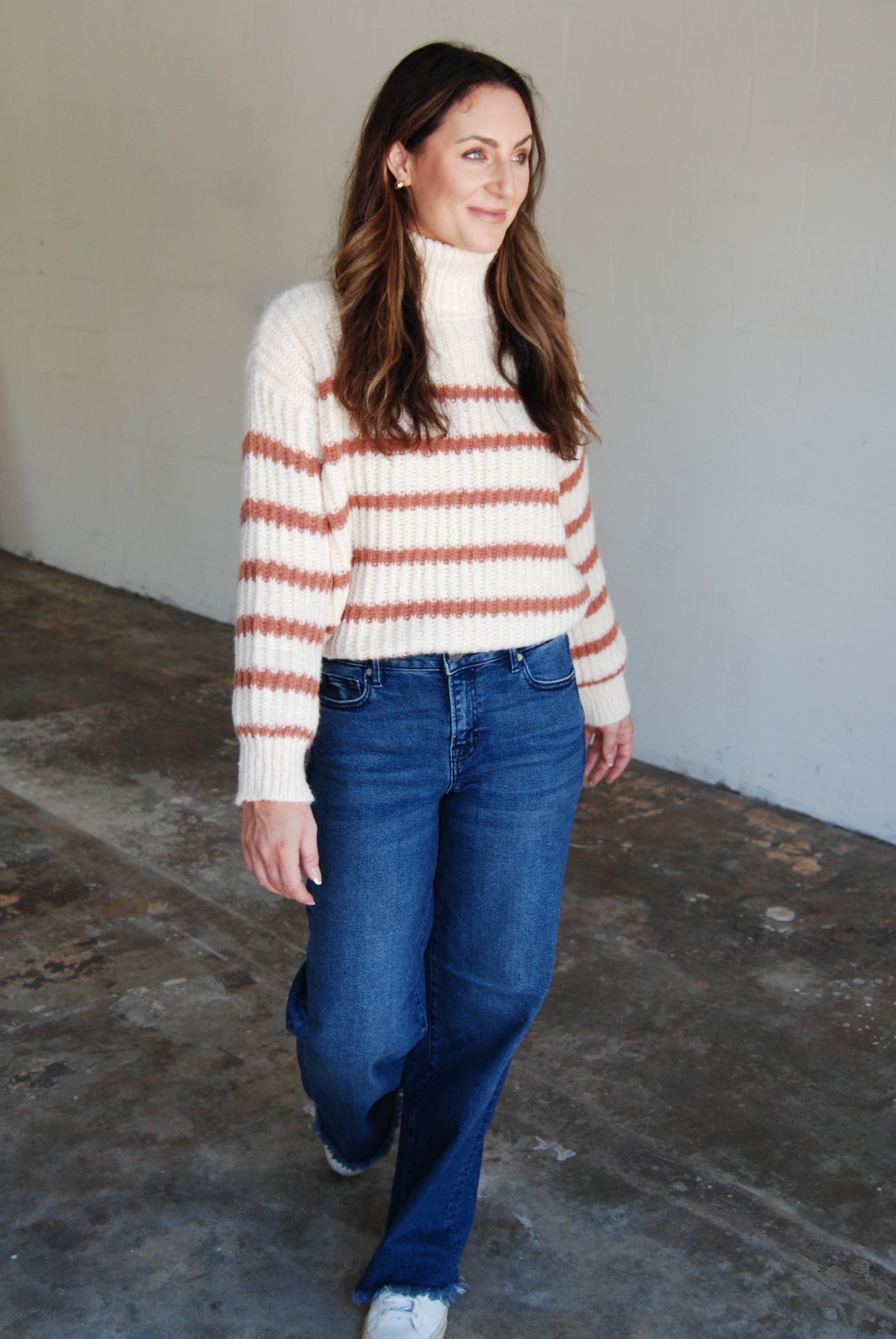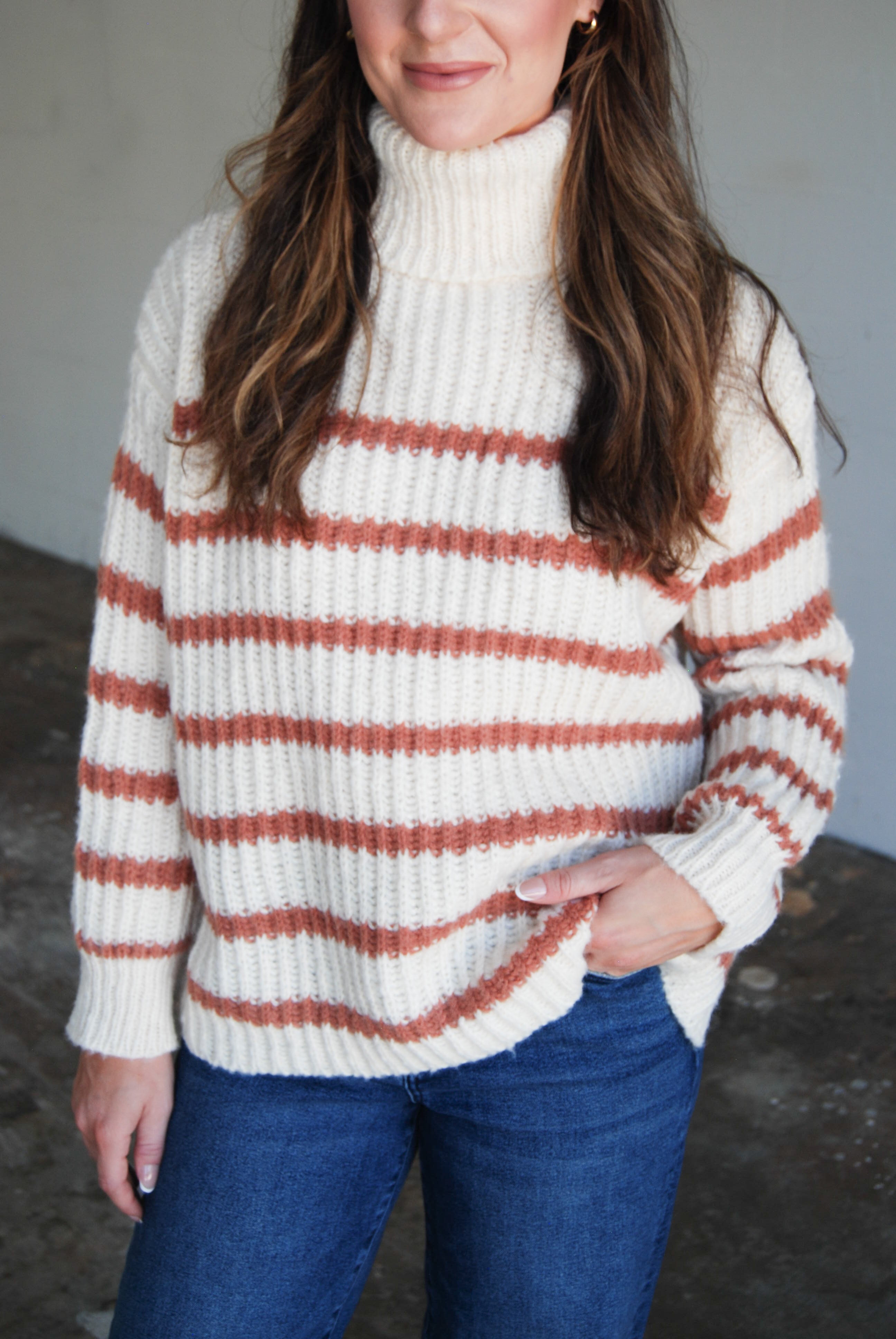 Get cozy and cute in our Aki Turtleneck Striped Sweater! This chunky sweater features a stylish turtleneck and comes in two colors. Perfect for chilly days, this sweater is both fashionable and comfortable.