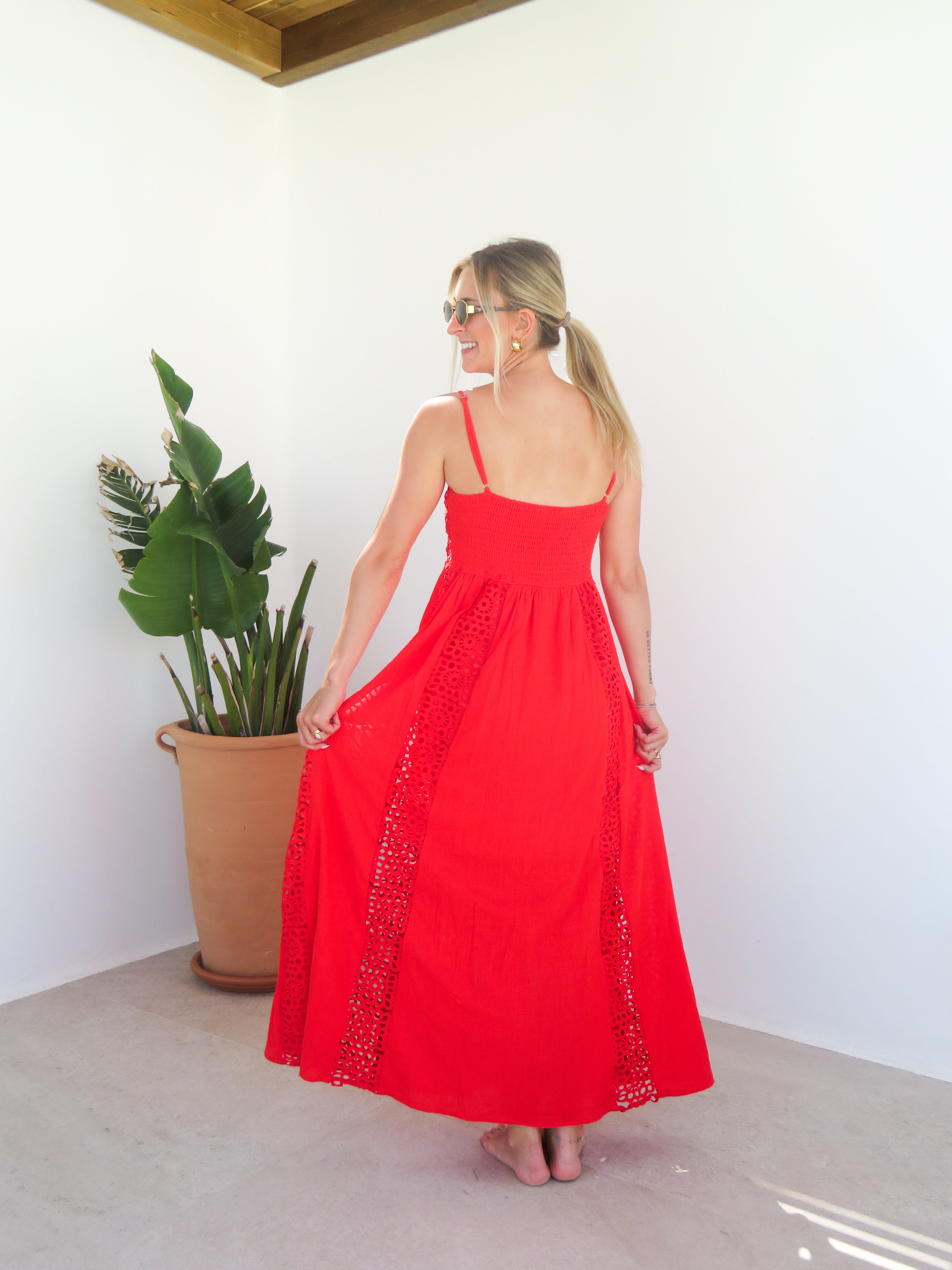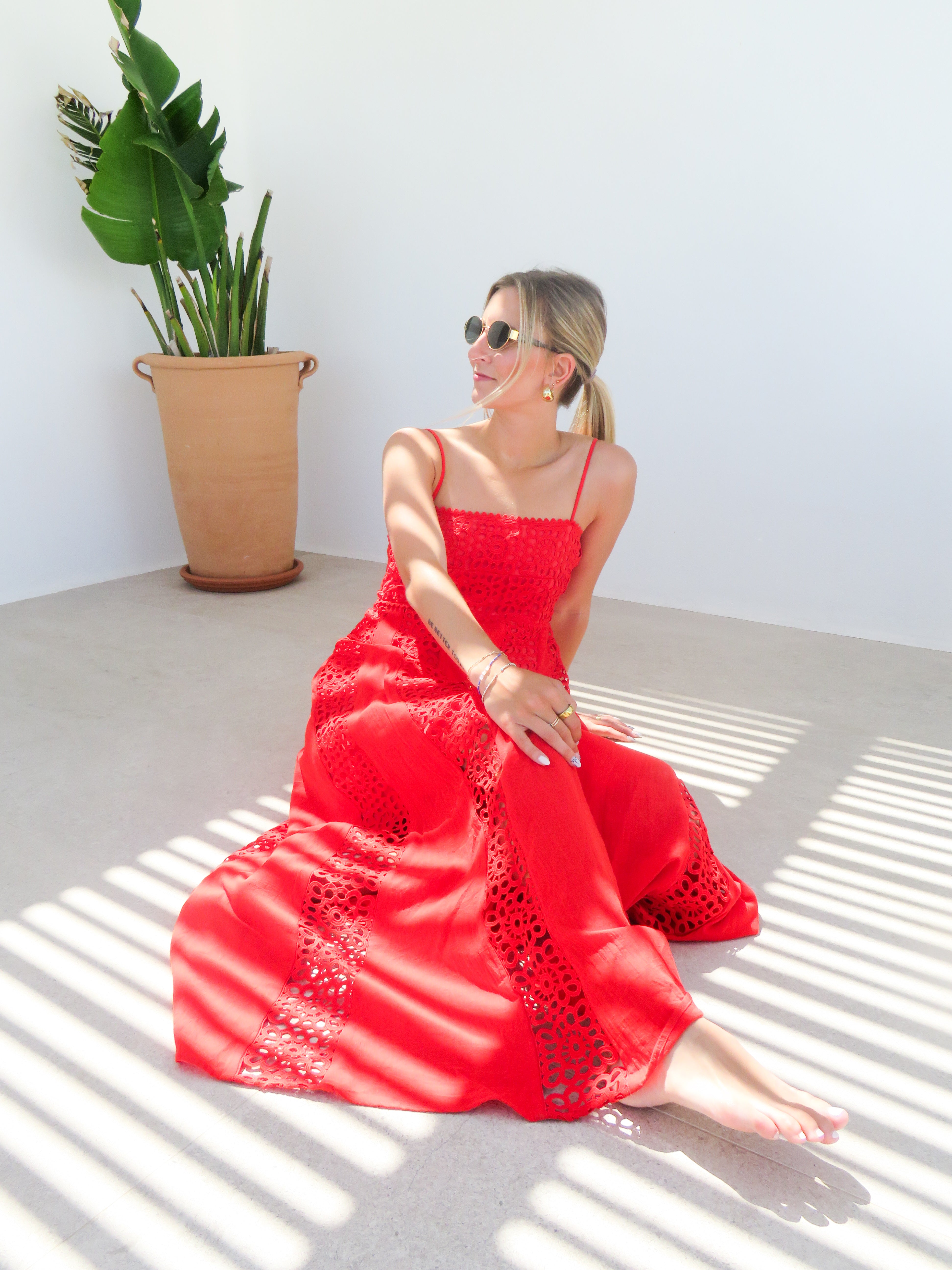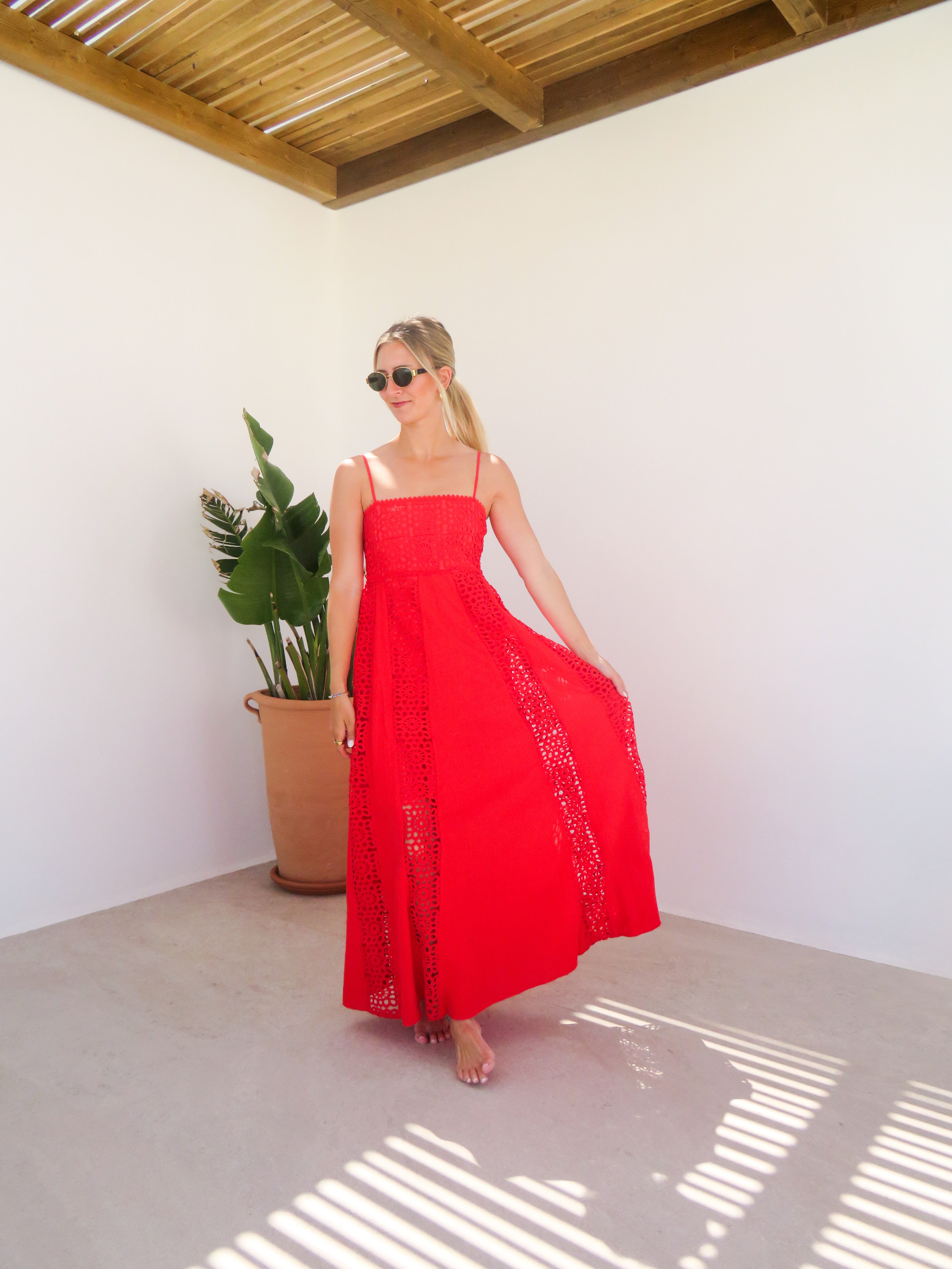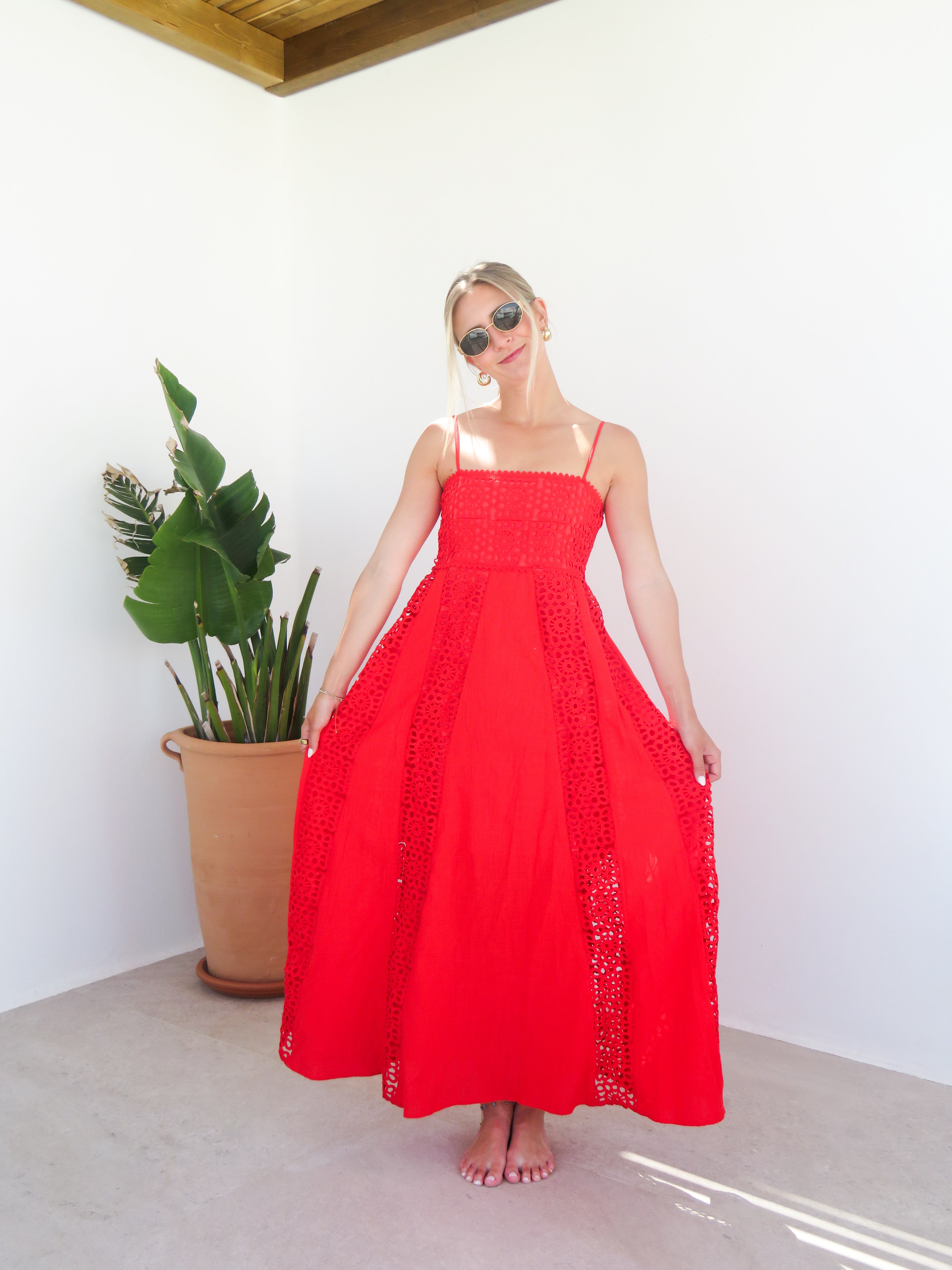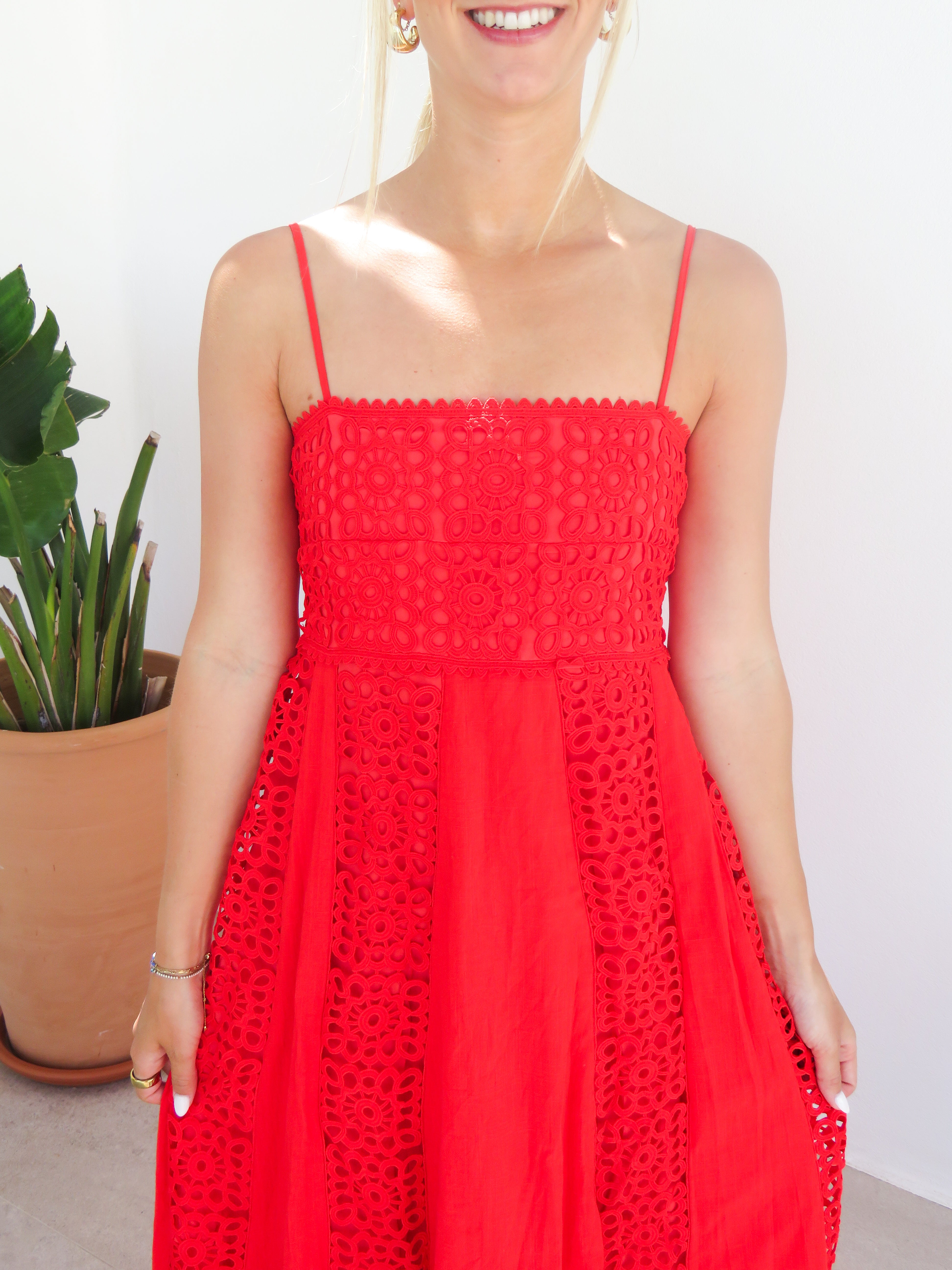 Get ready to turn heads in the Amaryllis Dress! With its eye-catching red color and delicate eyelet detailing, this spaghetti strap dress is the perfect choice for any occasion. Showcase your playful side in this flirty and fun design.