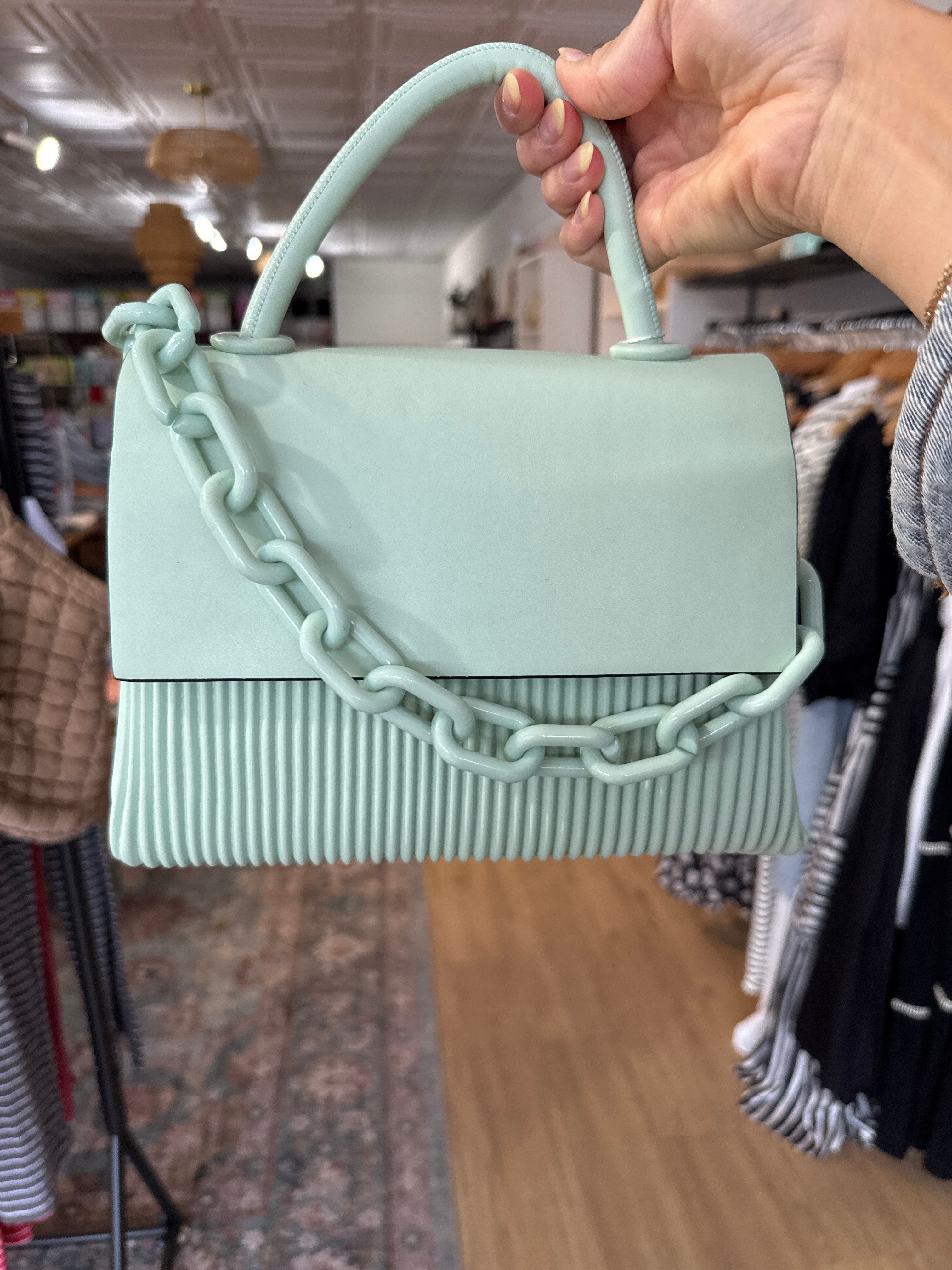 The Anne Pleated Crossbody Bag brings playful charm to your outfit with its stylish pleated design and sleek square shape. Switch up your look easily using the chic chainlink handle or the removable crossbody strap. With a magnetic closure, your essentials stay safe while you enjoy hands-free convenience and a dash of fun flair.