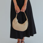 Add a touch of fun to your outfit with the Aria Whipstitch Shoulder Bag. Its crescent shape and whipstitch detailing bring a playful twist, while the crossbody strap keeps your hands free for adventures. Perfect for carrying your essentials with style and ease!