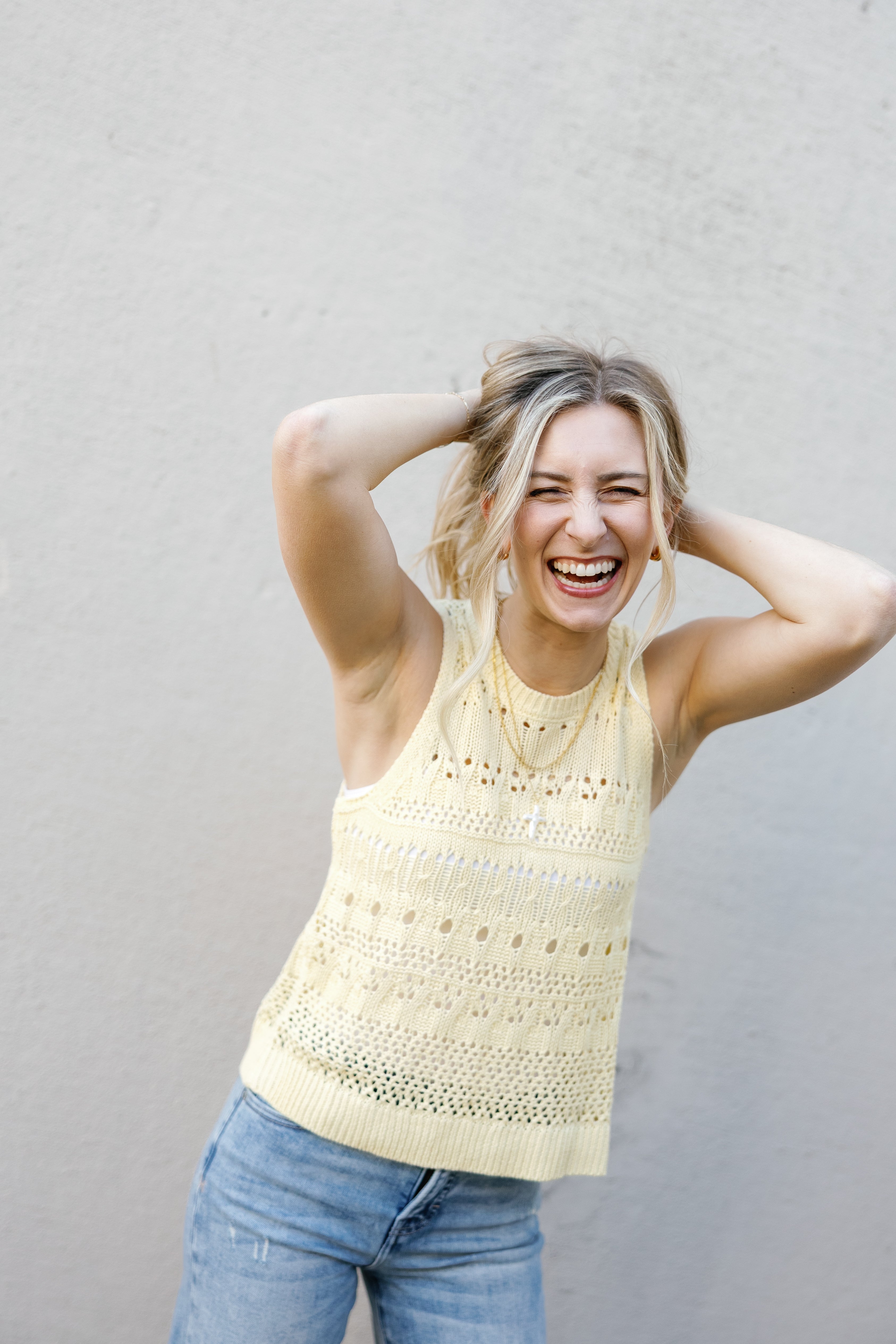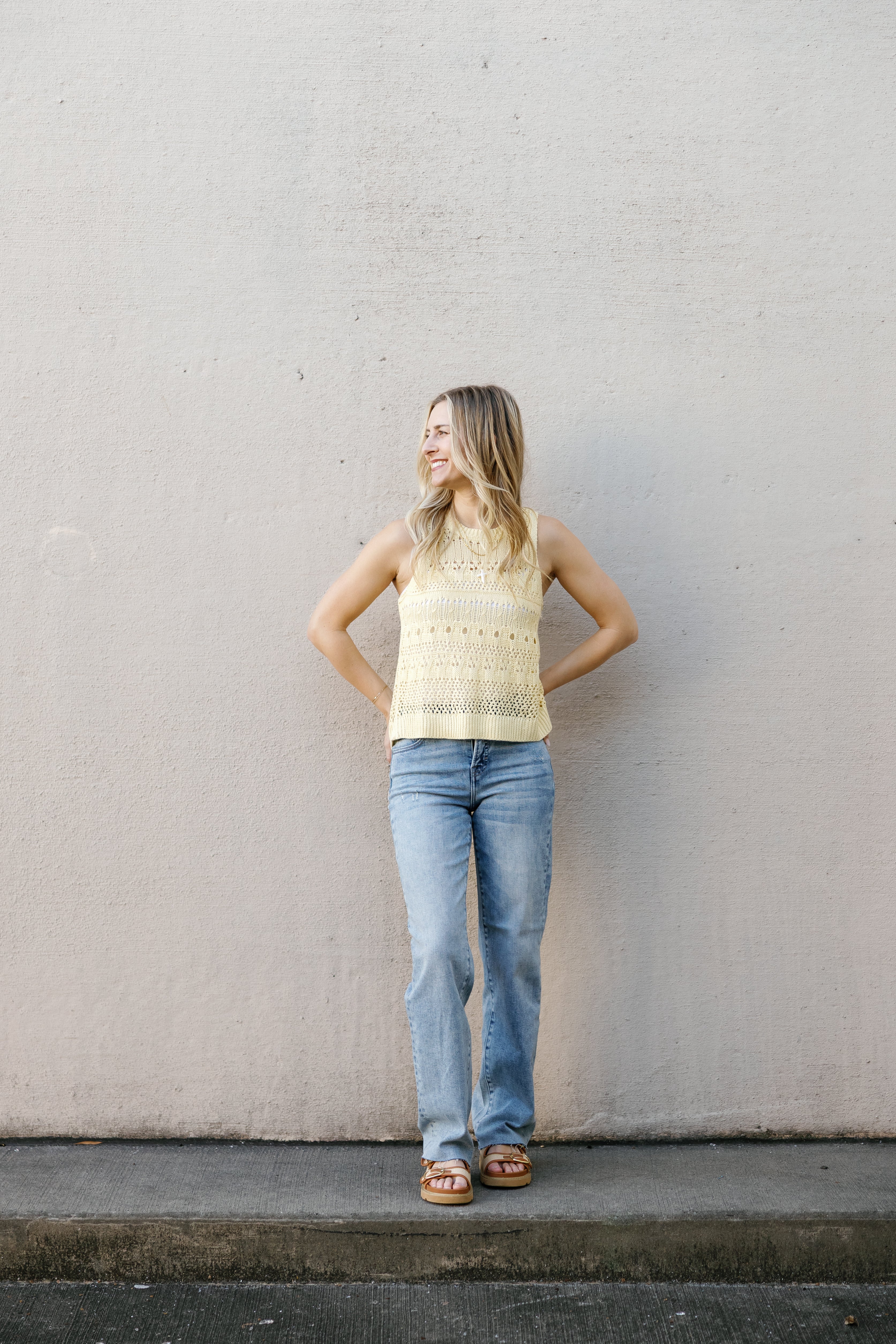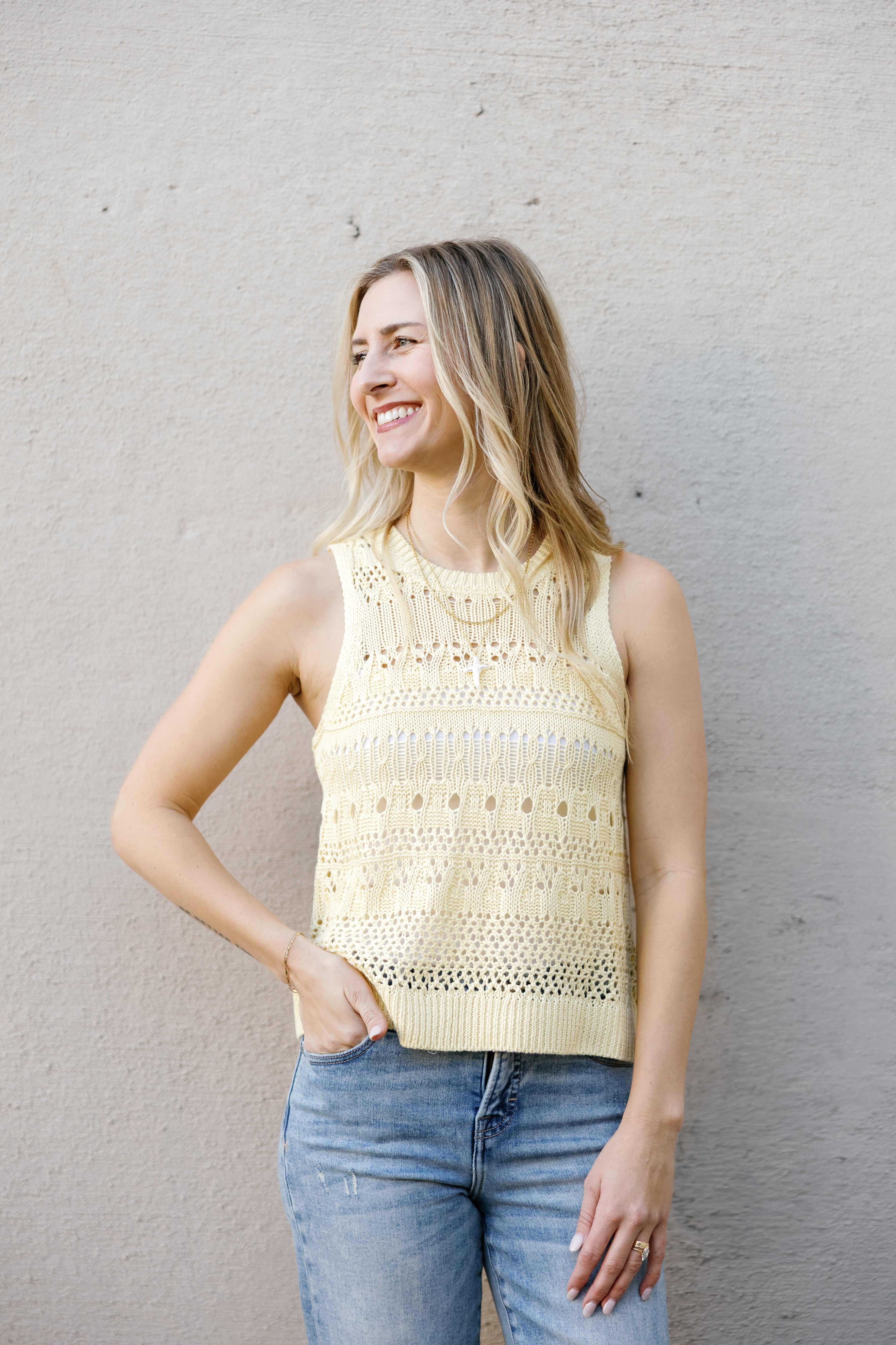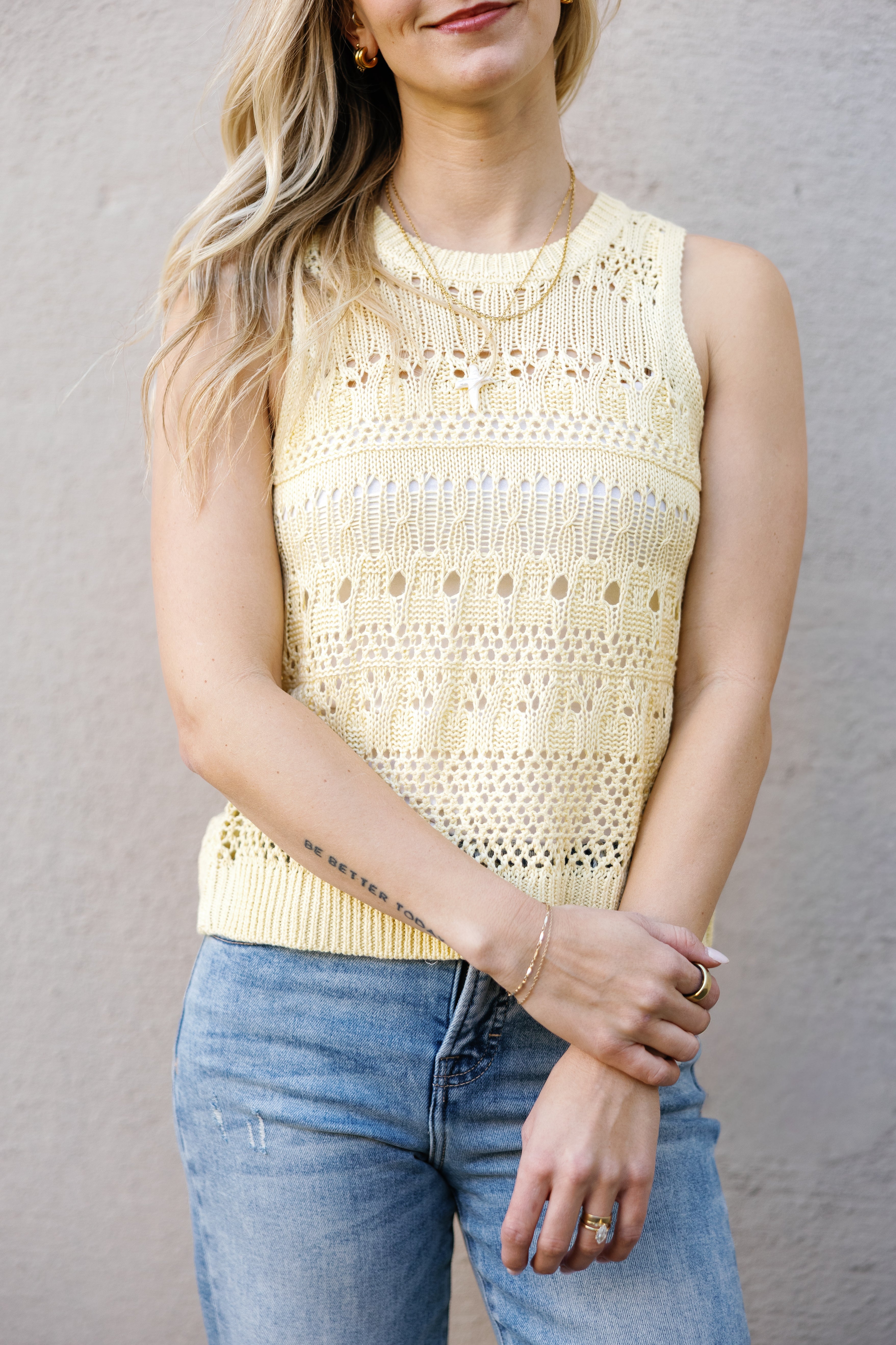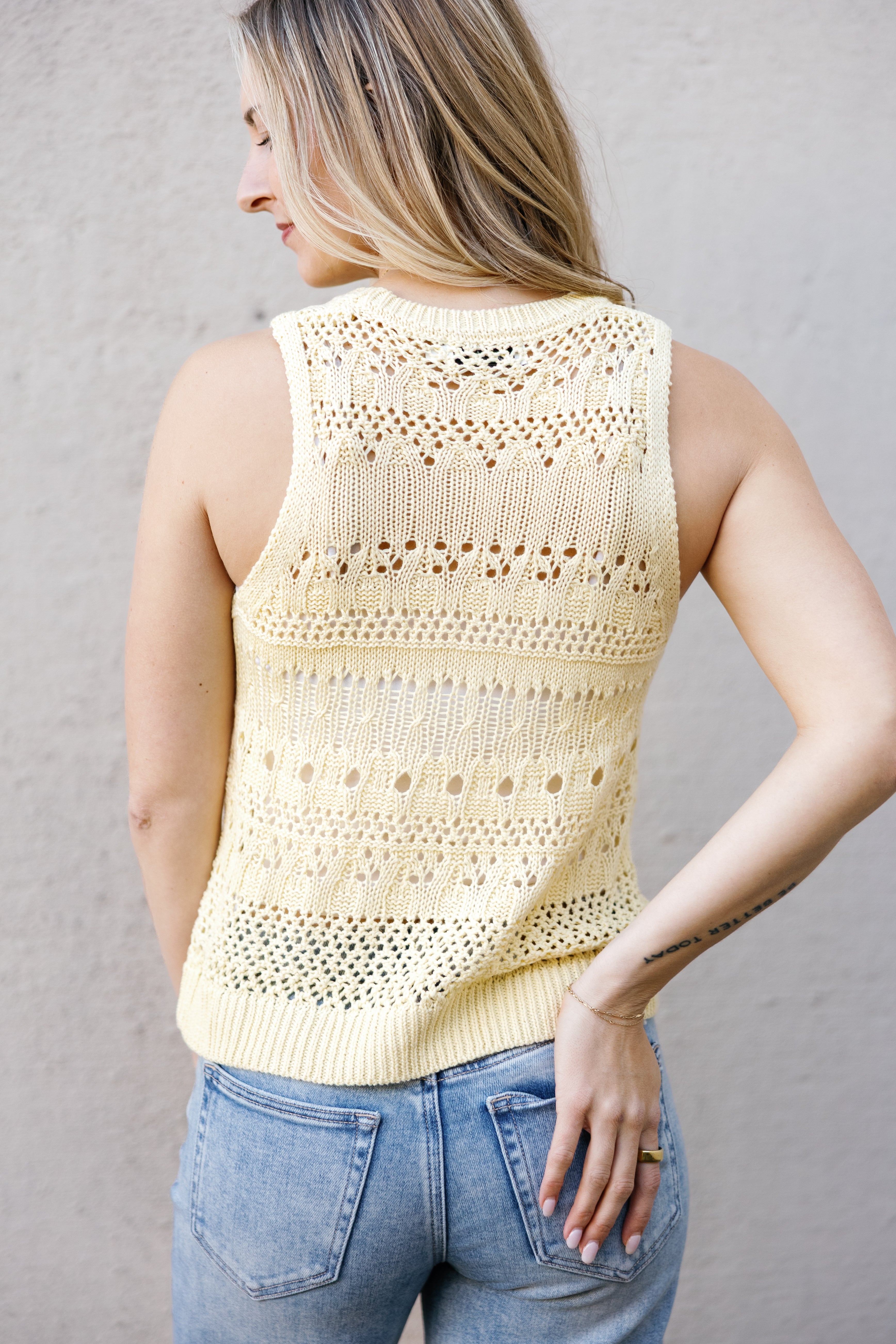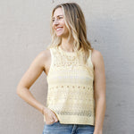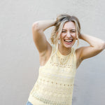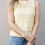 Brighten your wardrobe with this cheerful butter yellow crochet tank! Featuring a flattering high neckline and delicate sheer detailing, the Aster Sweater Tank brings instant joy to any look. The airy crochet construction keeps things light and breezy, while the sunny hue lifts your mood and complements every season. Perfect for layering or wearing solo, this playful piece is your new go-to for adding a pop of happiness to your everyday style.