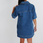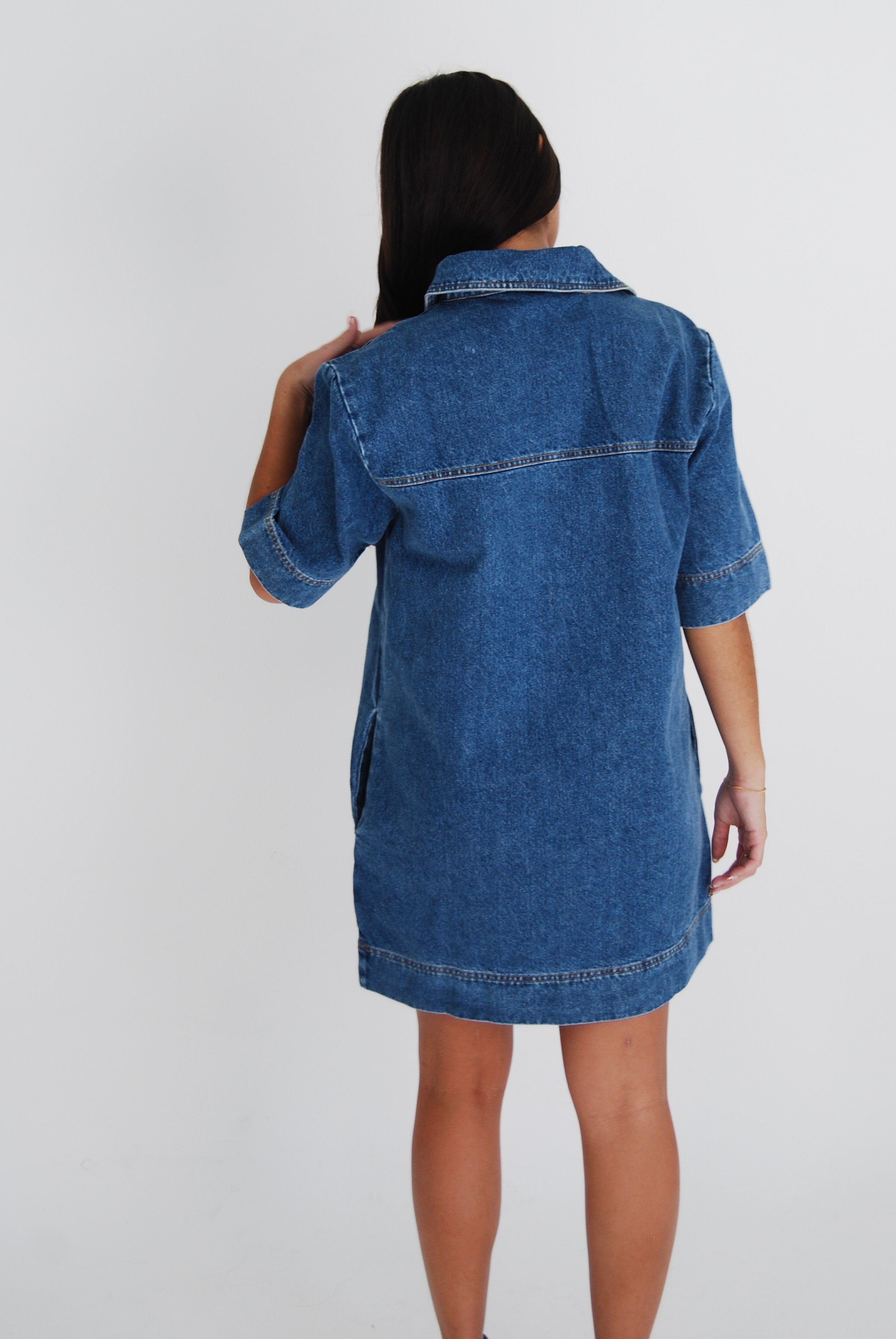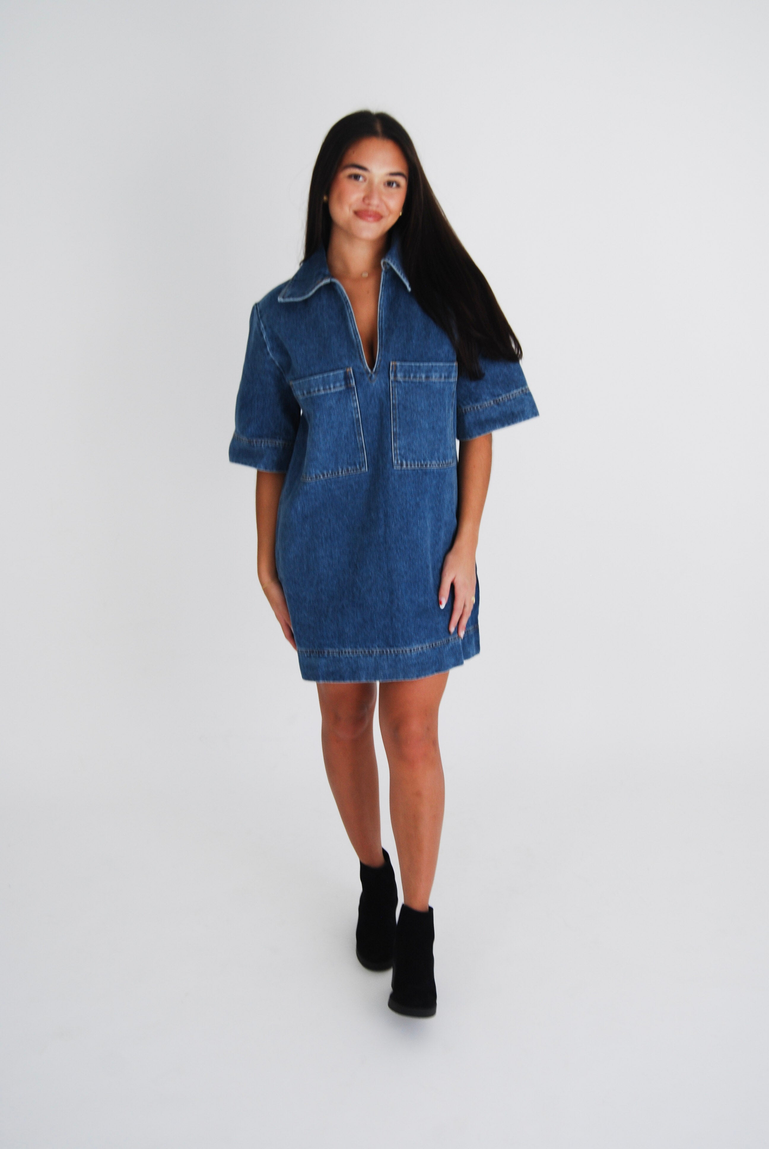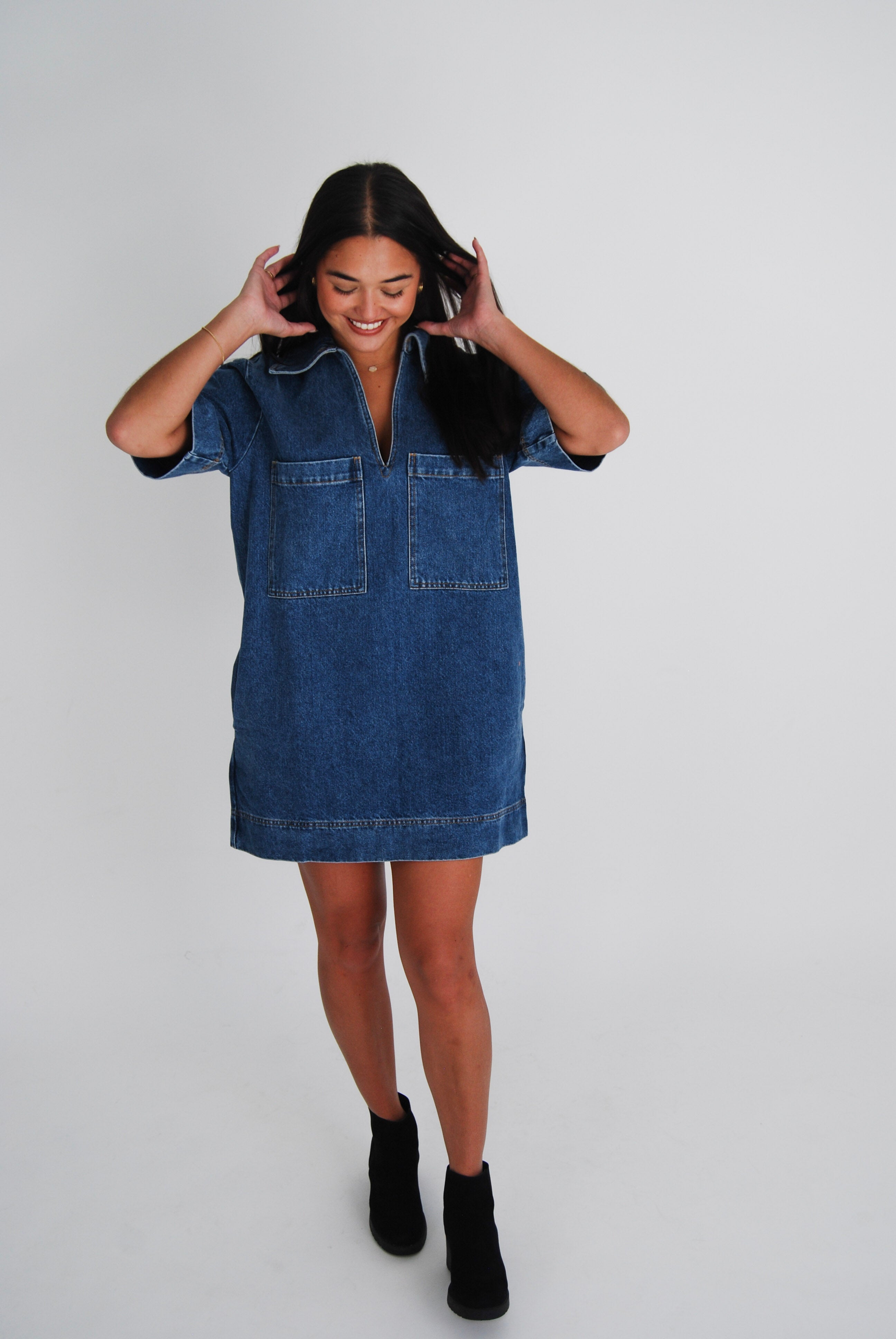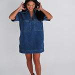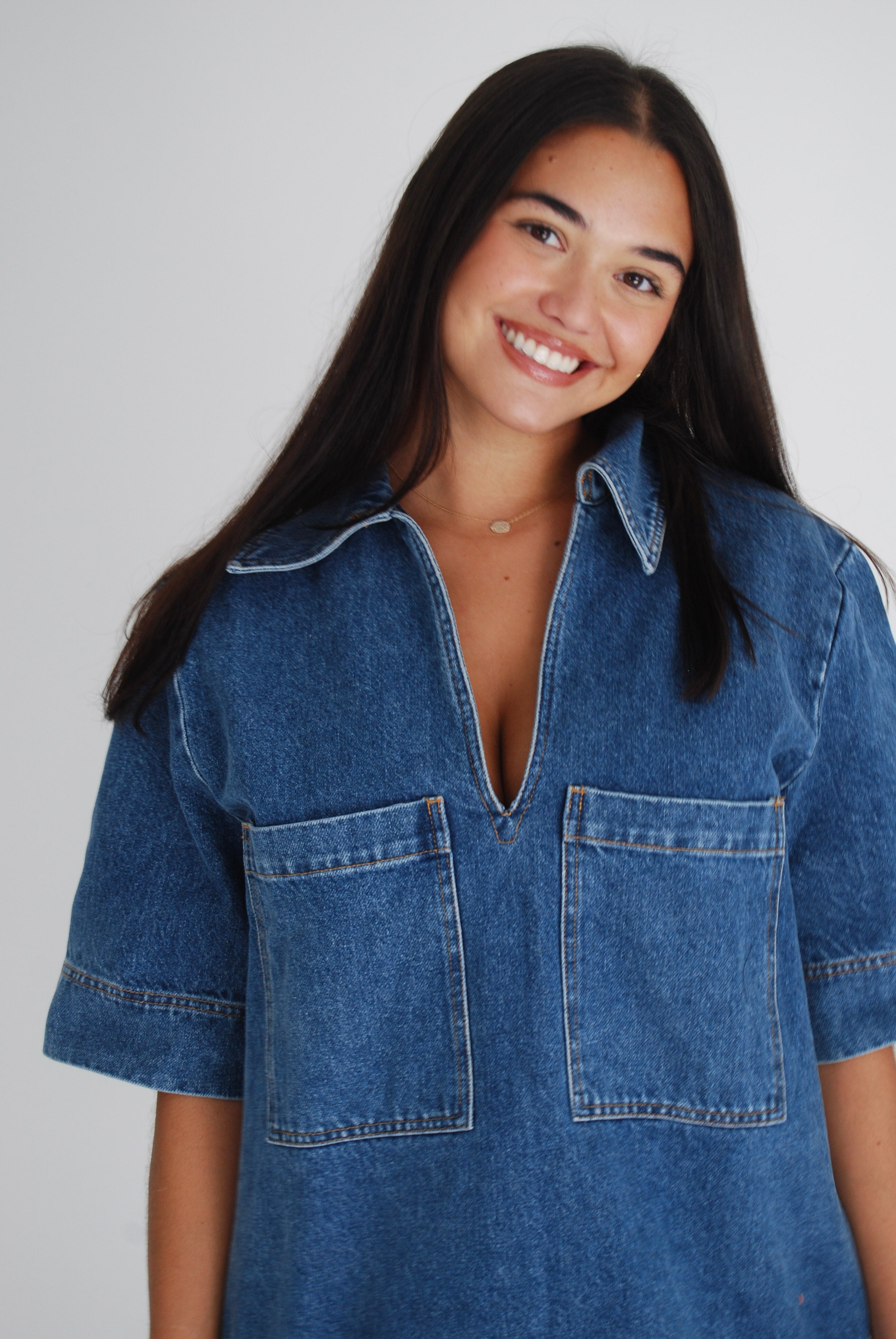 Get ready to turn heads in the Ava Denim Dress! This playful short sleeve number features a plunging V neckline that adds a flirty edge, while the statement pockets bring fun and function together. Perfect for sunny days and spontaneous adventures, this dress combines denim’s classic charm with a modern twist we know you'll love.