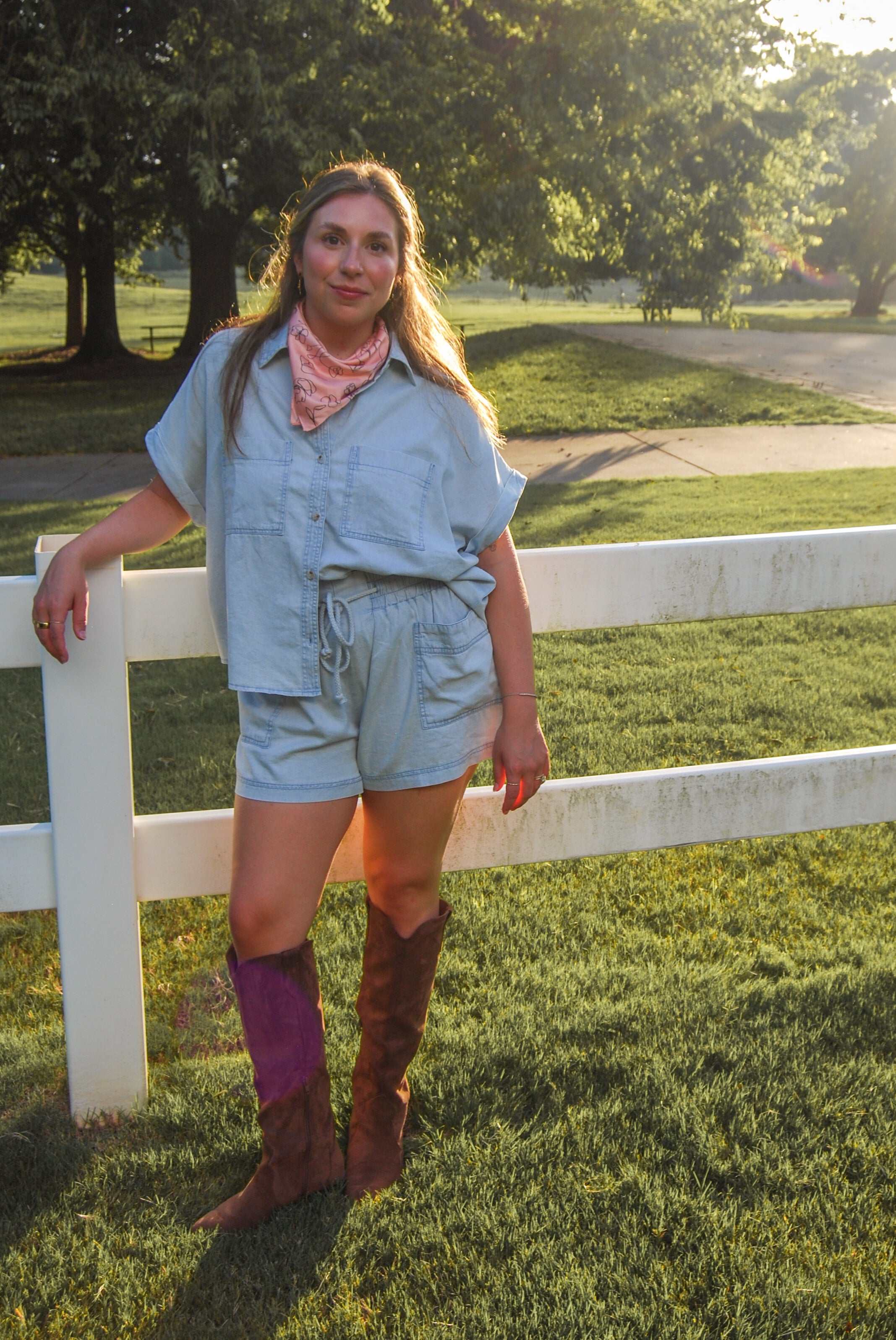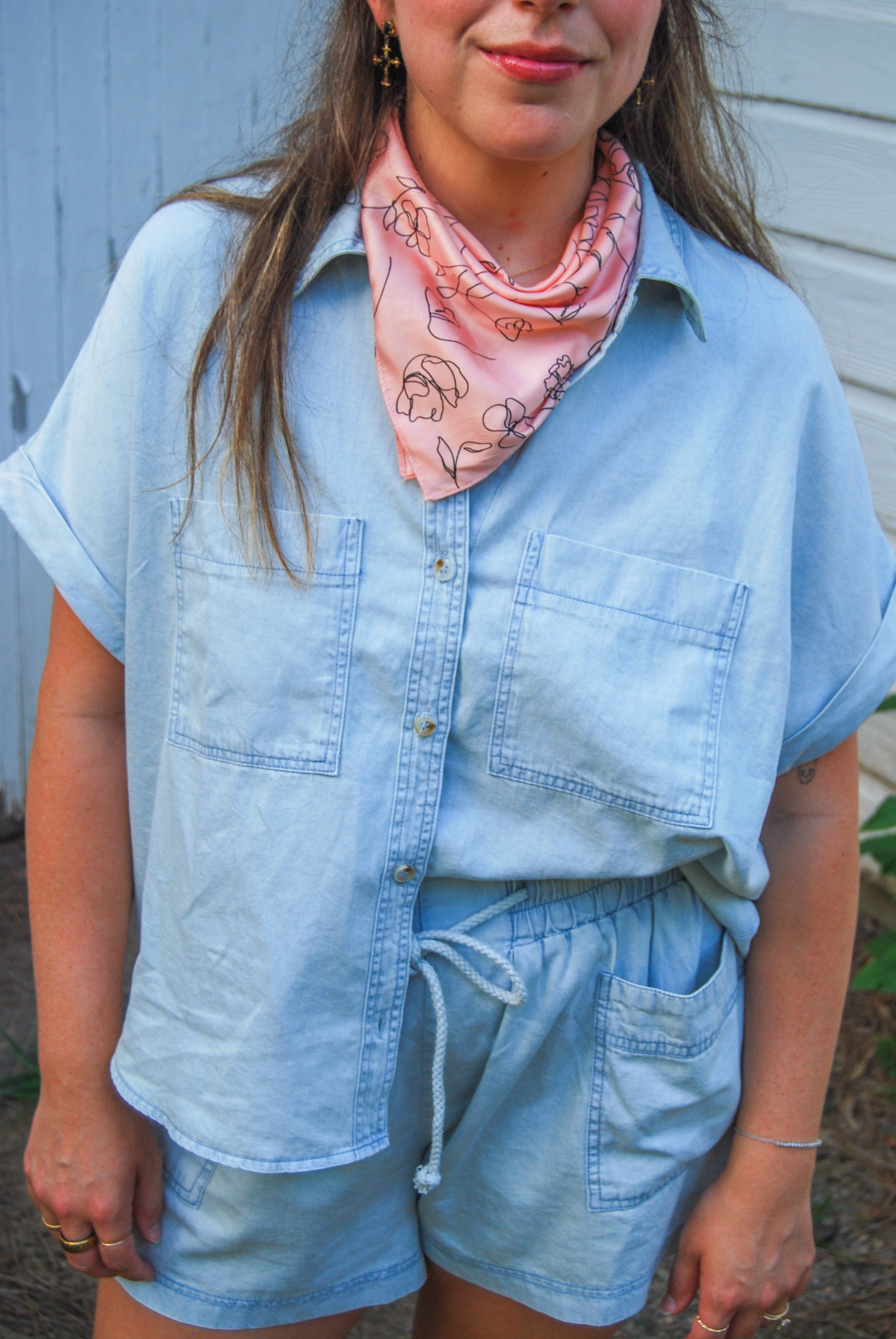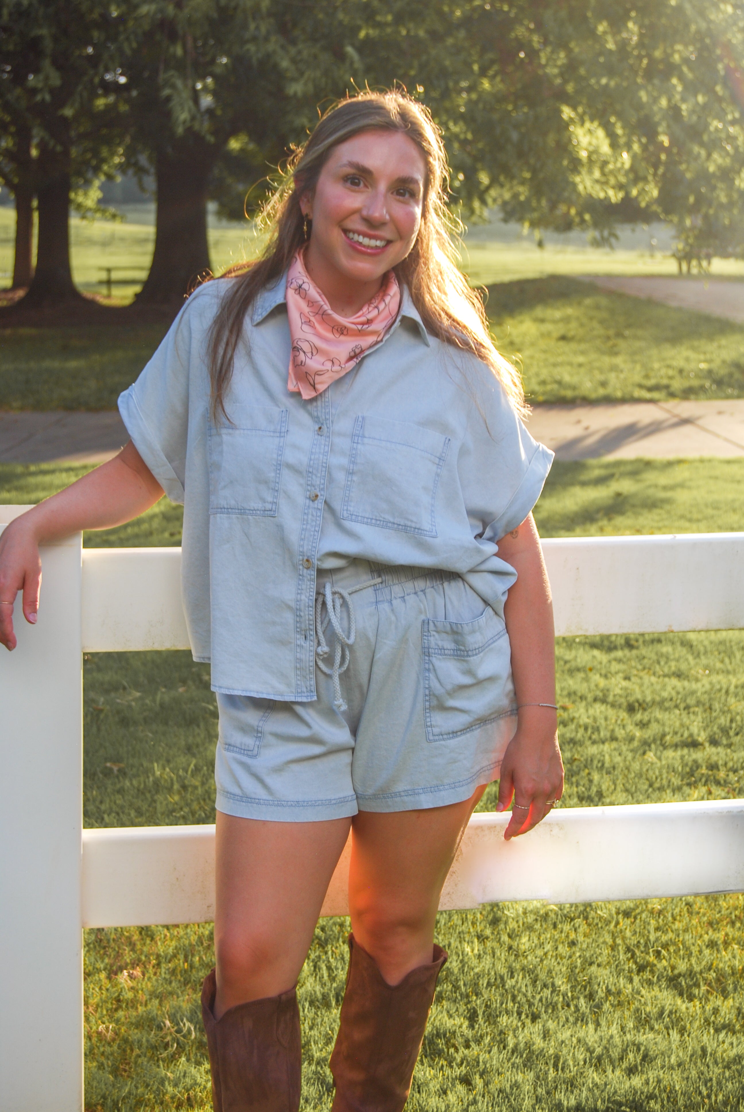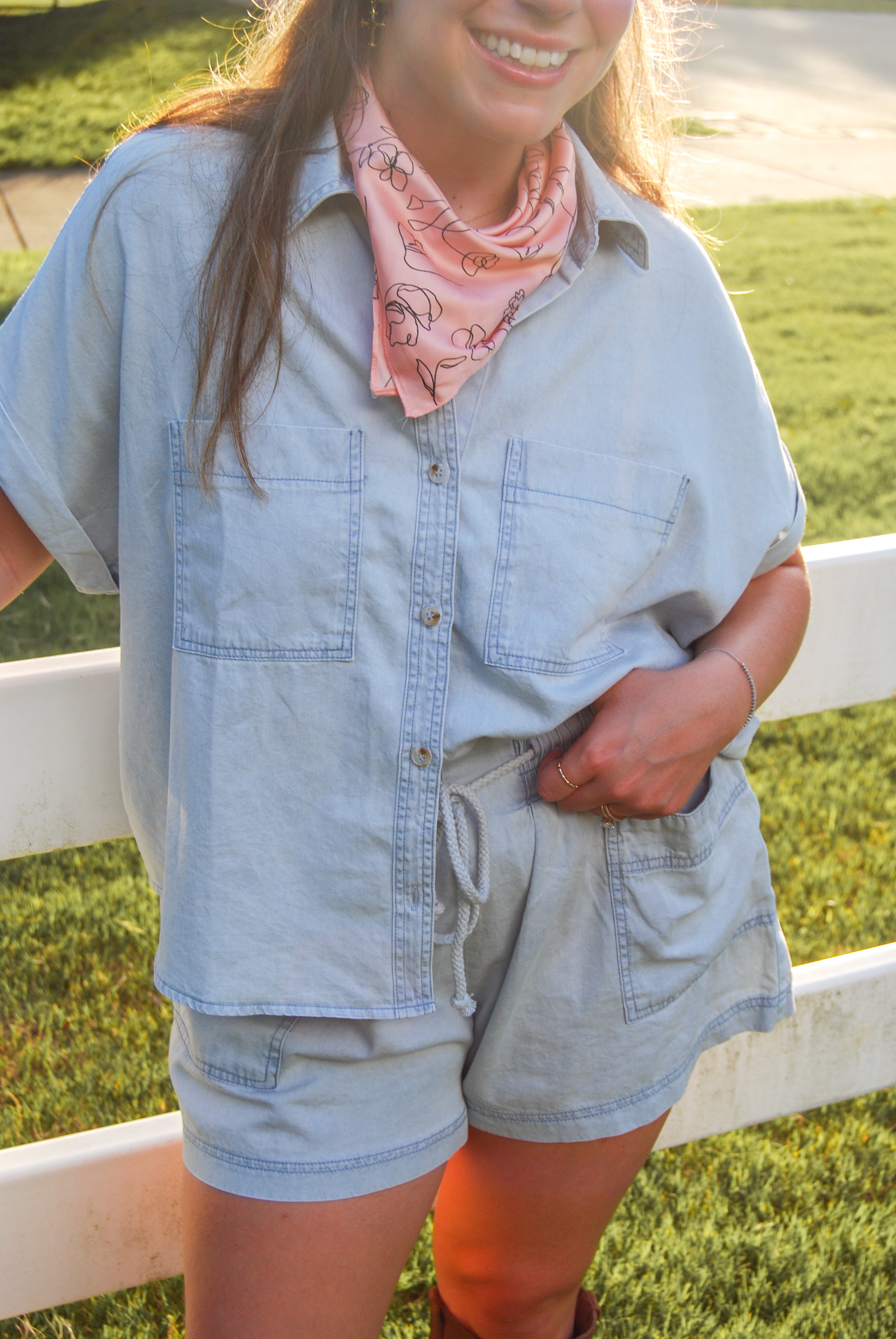 The Backroads Denim Top is a playful chambray button-up shirt with convenient front pockets and a stylish back pleat for extra movement. It pairs perfectly with the Backroads Shorts to create a cute, coordinated look that’s ready for any casual outing or weekend adventure.