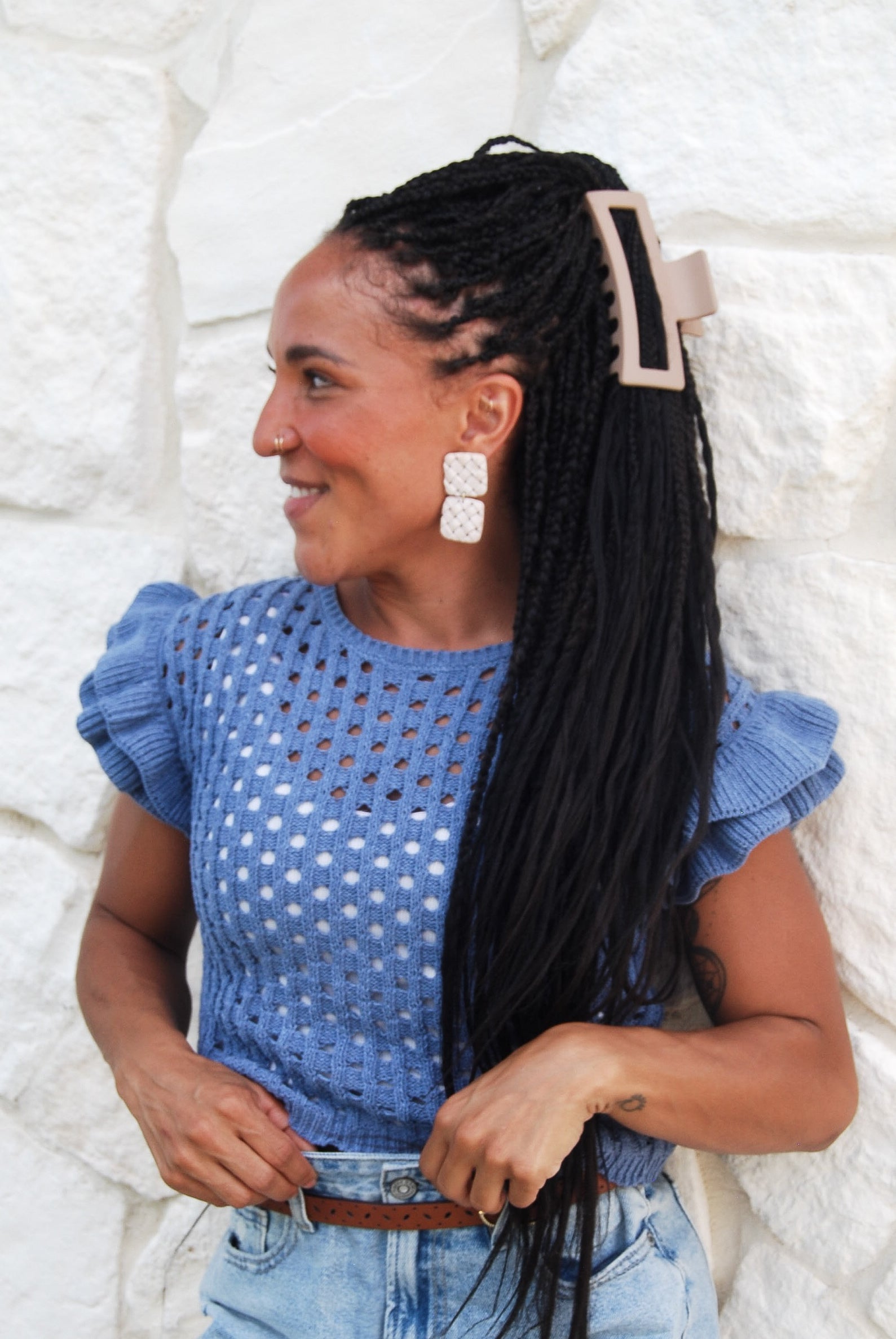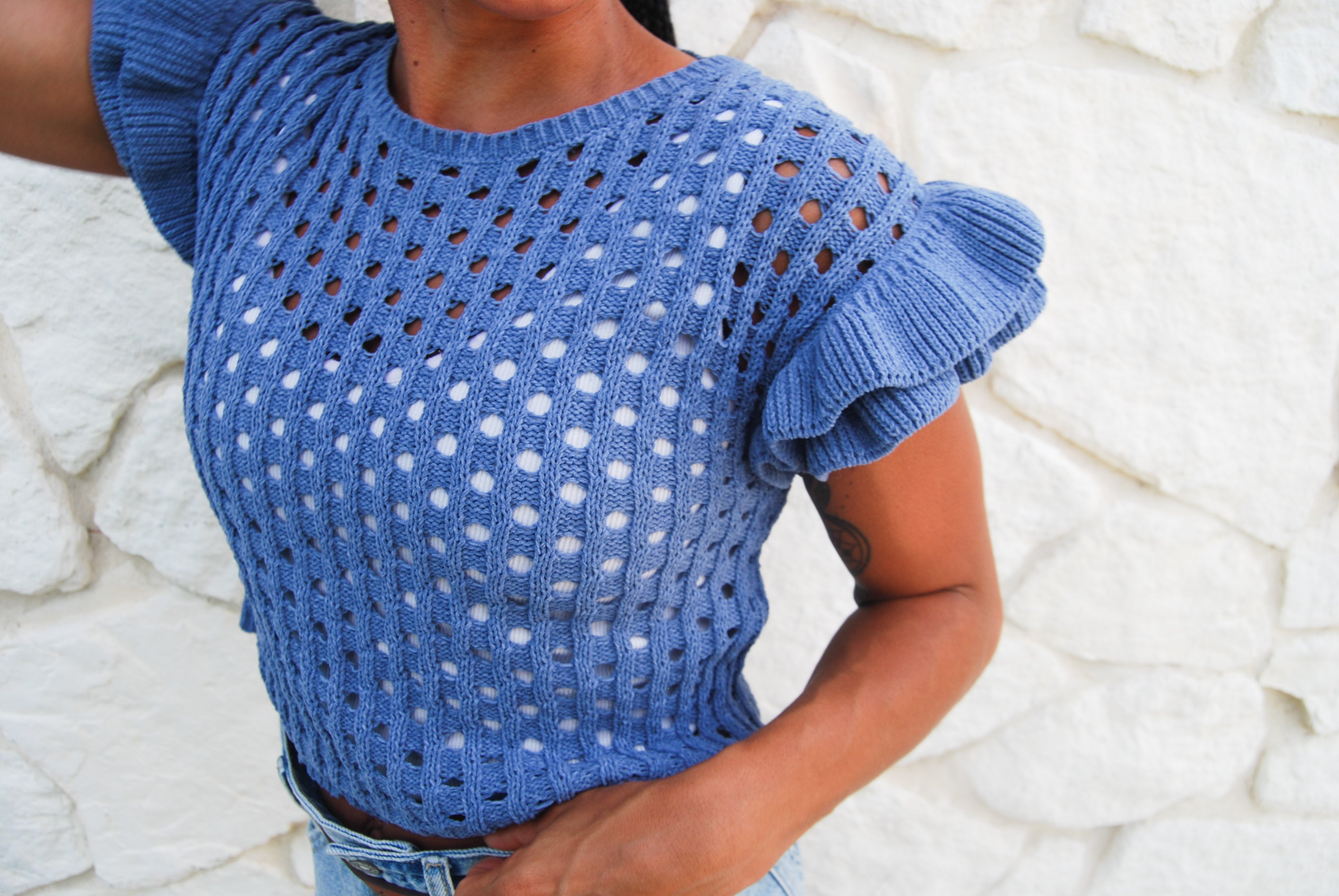 Get ready to charm in our Blue Charming Knit Top! With a crochet knit design and playful ruffle sleeves, this slightly cropped top can be dressed up or down for any occasion. Effortlessly stylish, this top is sure to turn heads. (Warning: may cause excessive compliments!)
