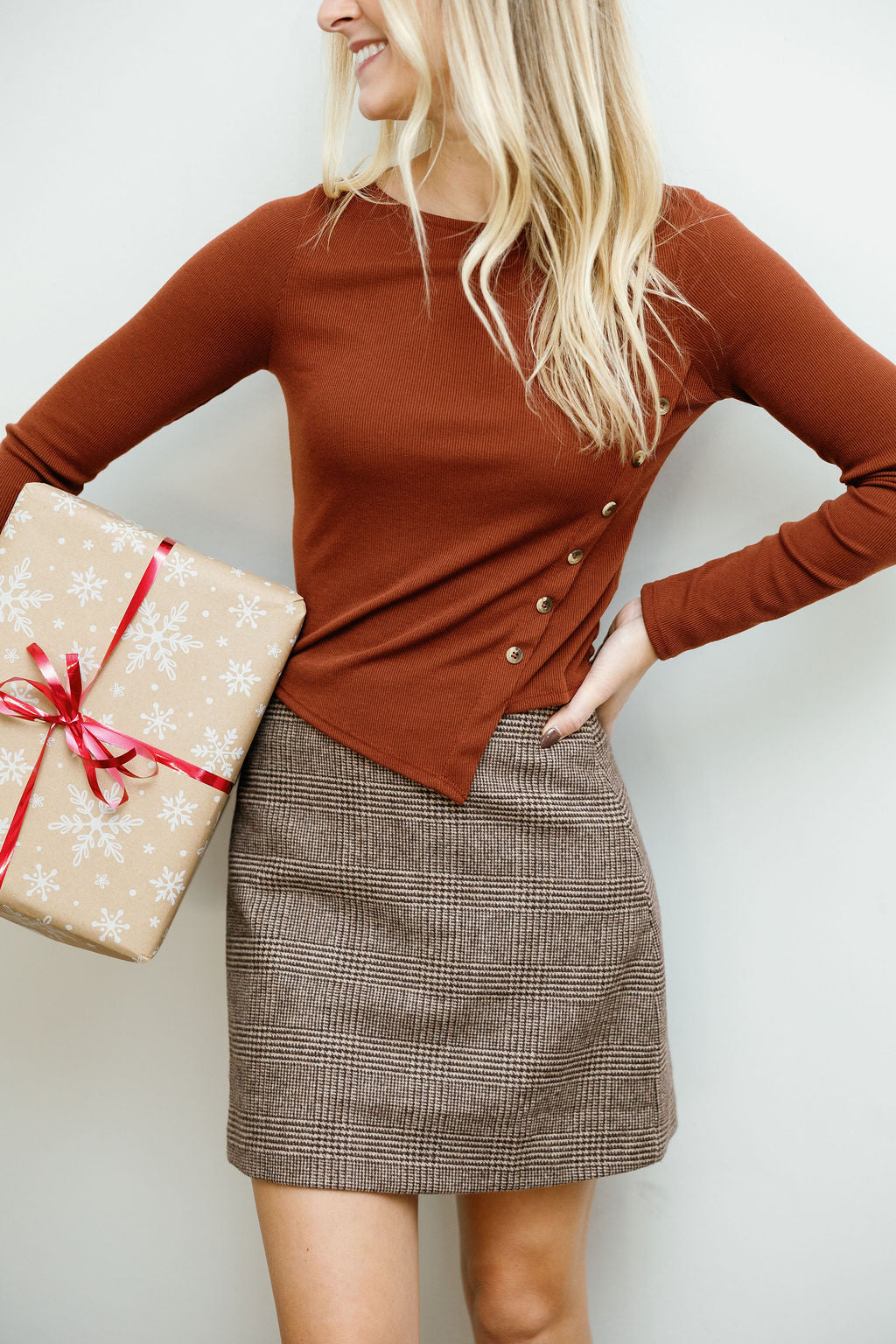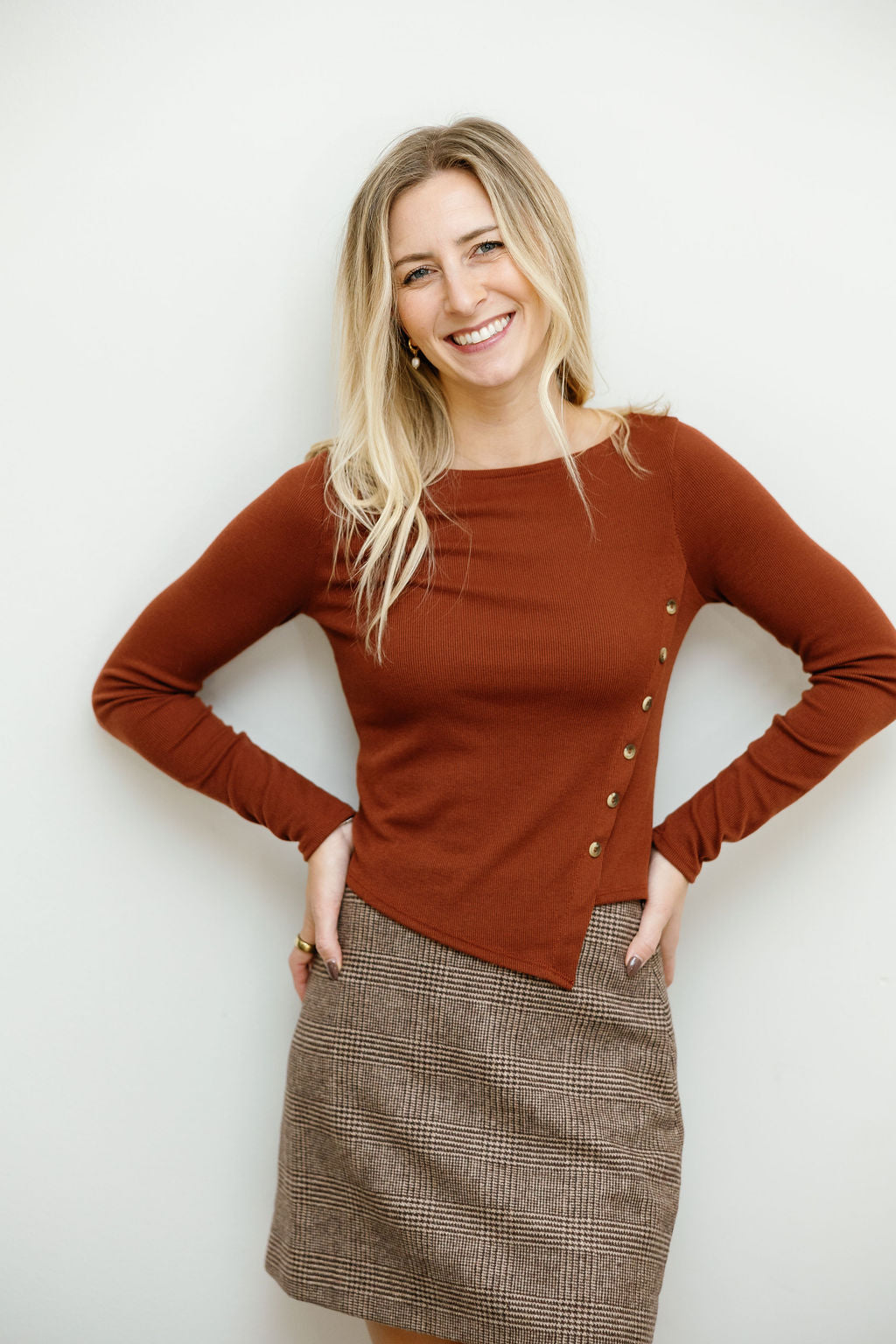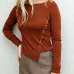 Layer this versatile knit top for effortless style that transitions from casual to chic. The asymmetrical hem adds modern flair while diagonal button details create visual interest down the front. Crafted for comfort, it's the perfect piece to dress up with tailored pants or keep it cozy with your favorite jeans. Whether you're heading to brunch or the office, this top wraps up your look with playful sophistication.