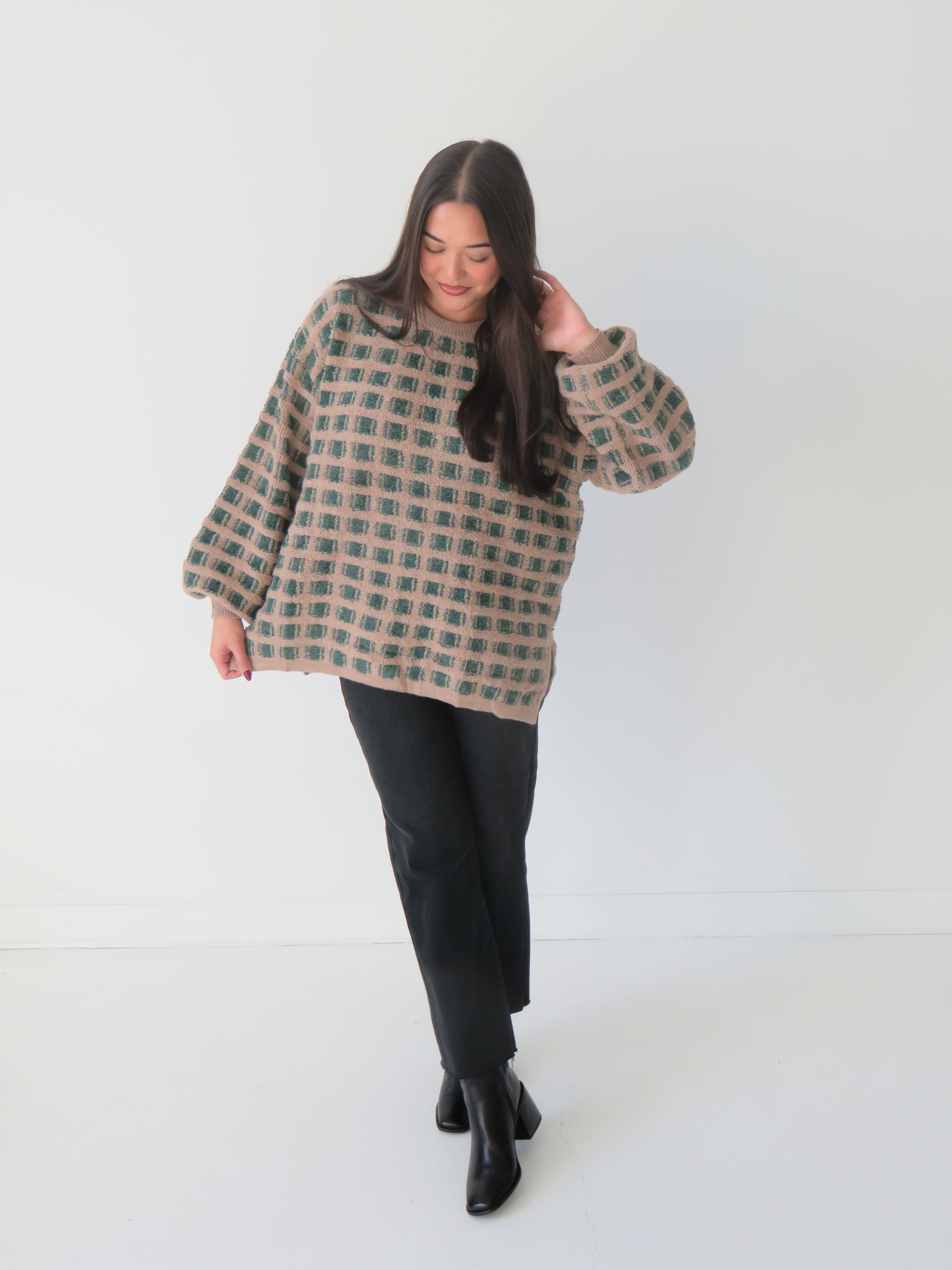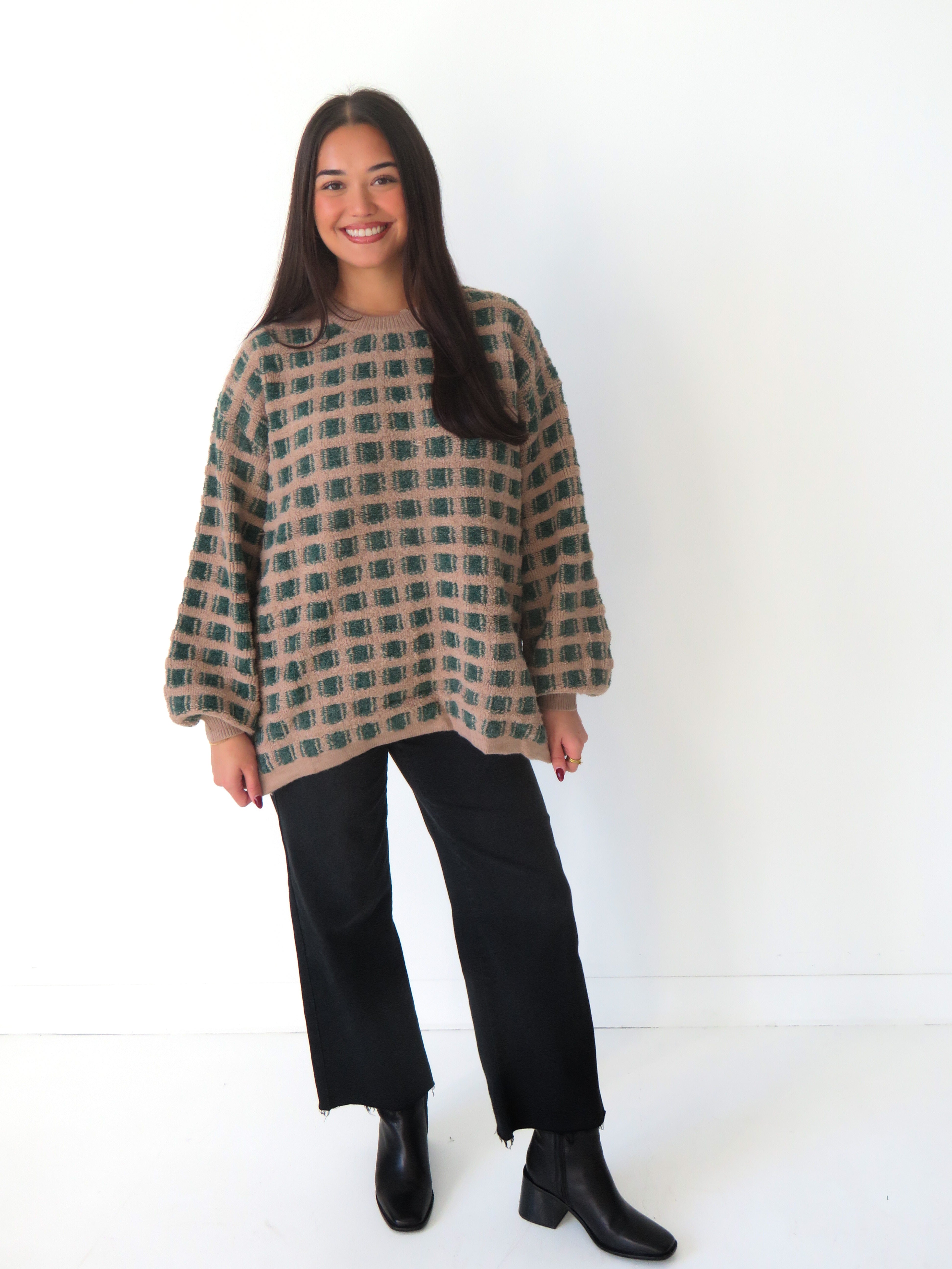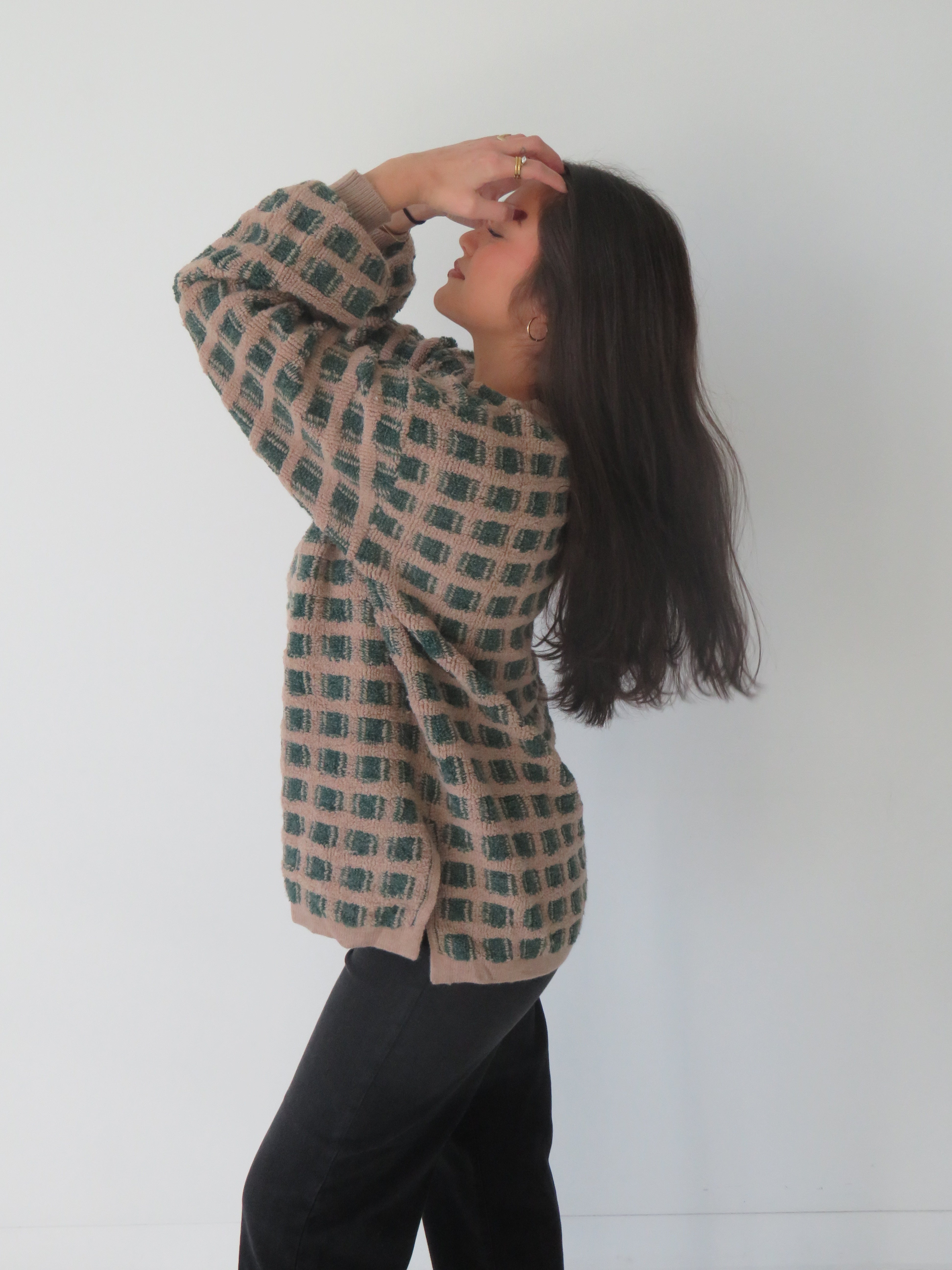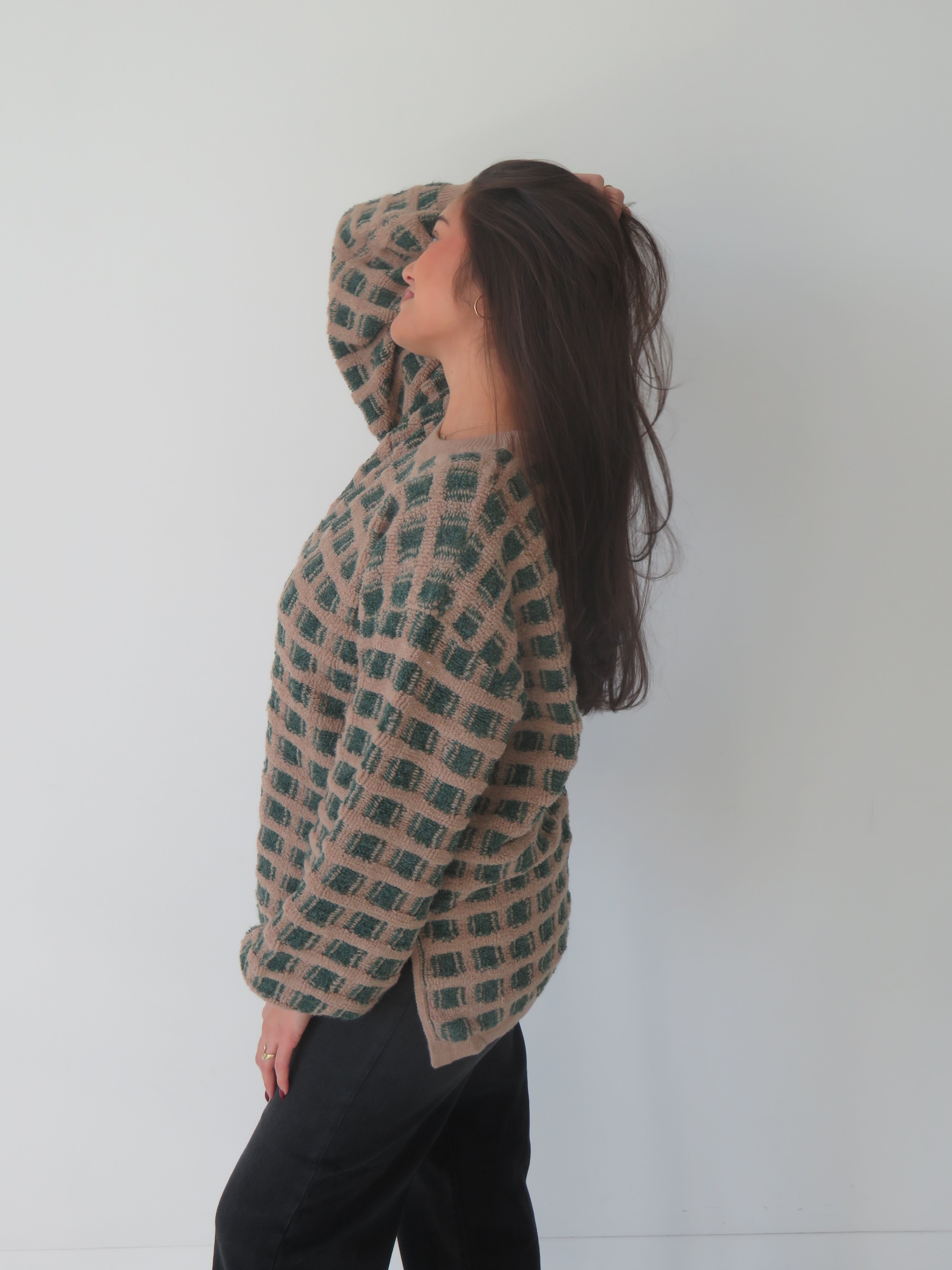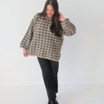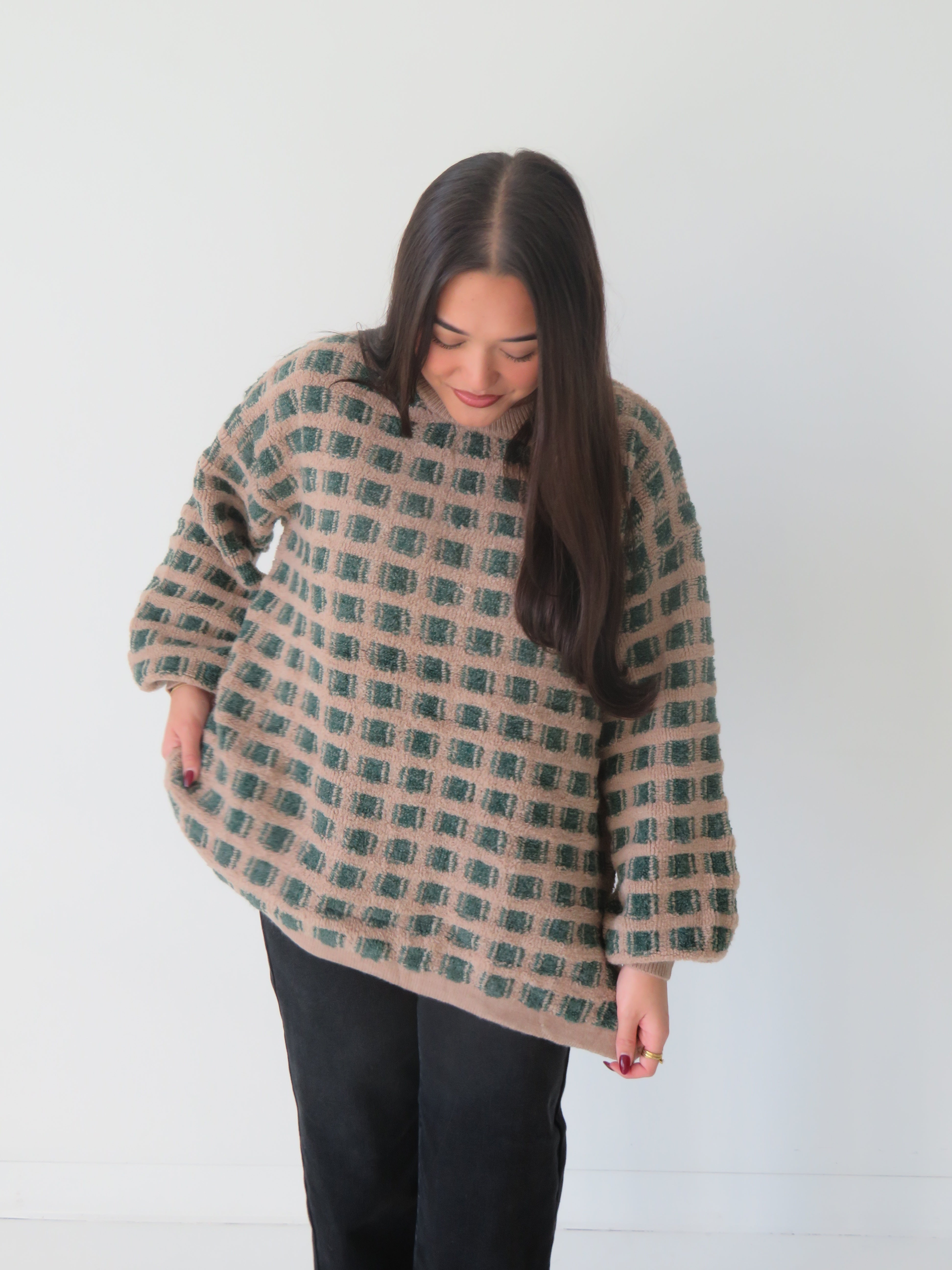 Wrap yourself in retro vibes with our Vintage Squares Sweater—a playful take on timeless style. This oversized knit celebrates a bold checkered design that works as hard as you do, whether you're curled up with a book or grabbing coffee with friends. The relaxed fit makes layering a breeze, while the vintage-inspired pattern keeps things interesting. Cozy, cool, and unapologetically fun—your new go-to piece for effortless cool-girl energy.