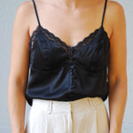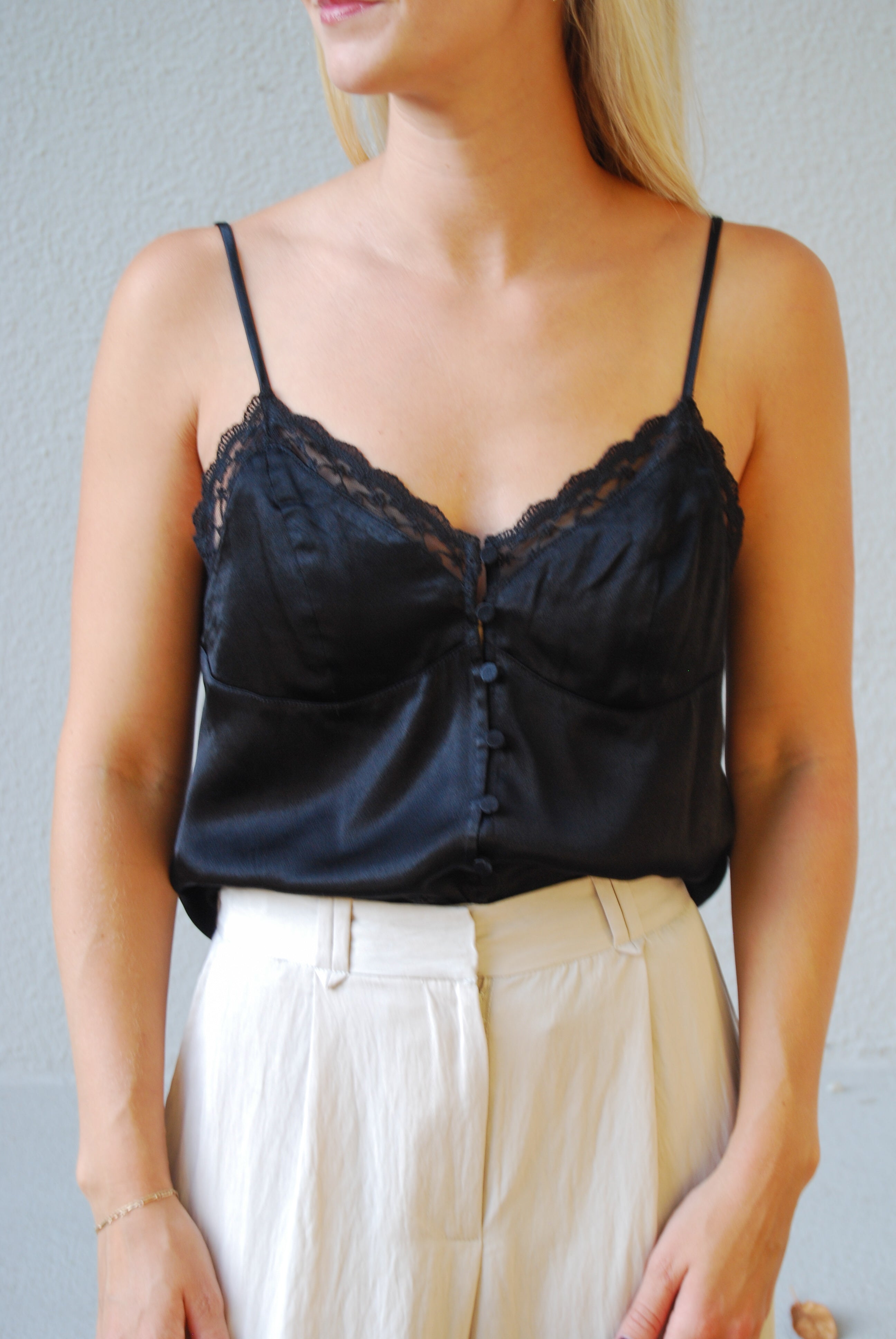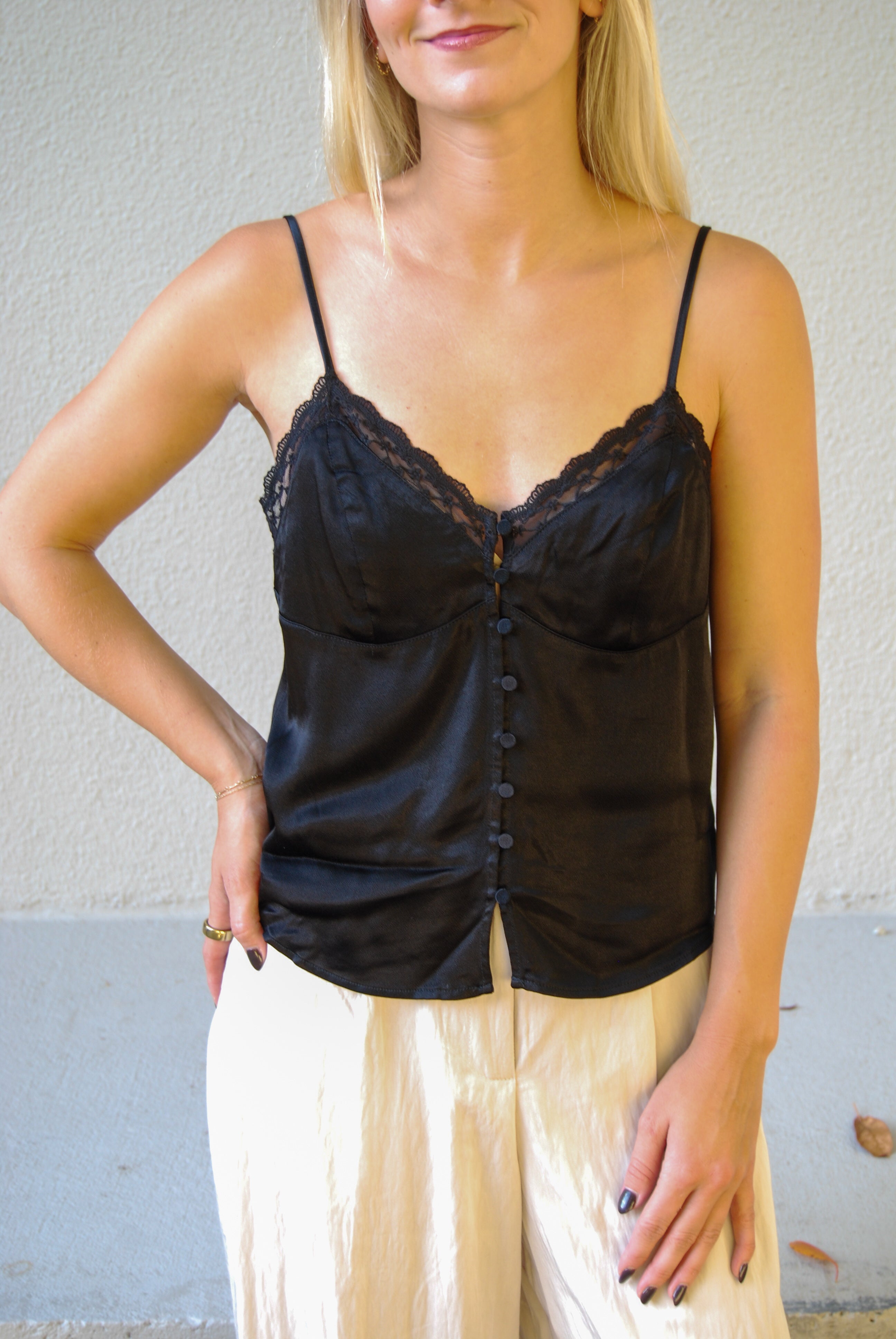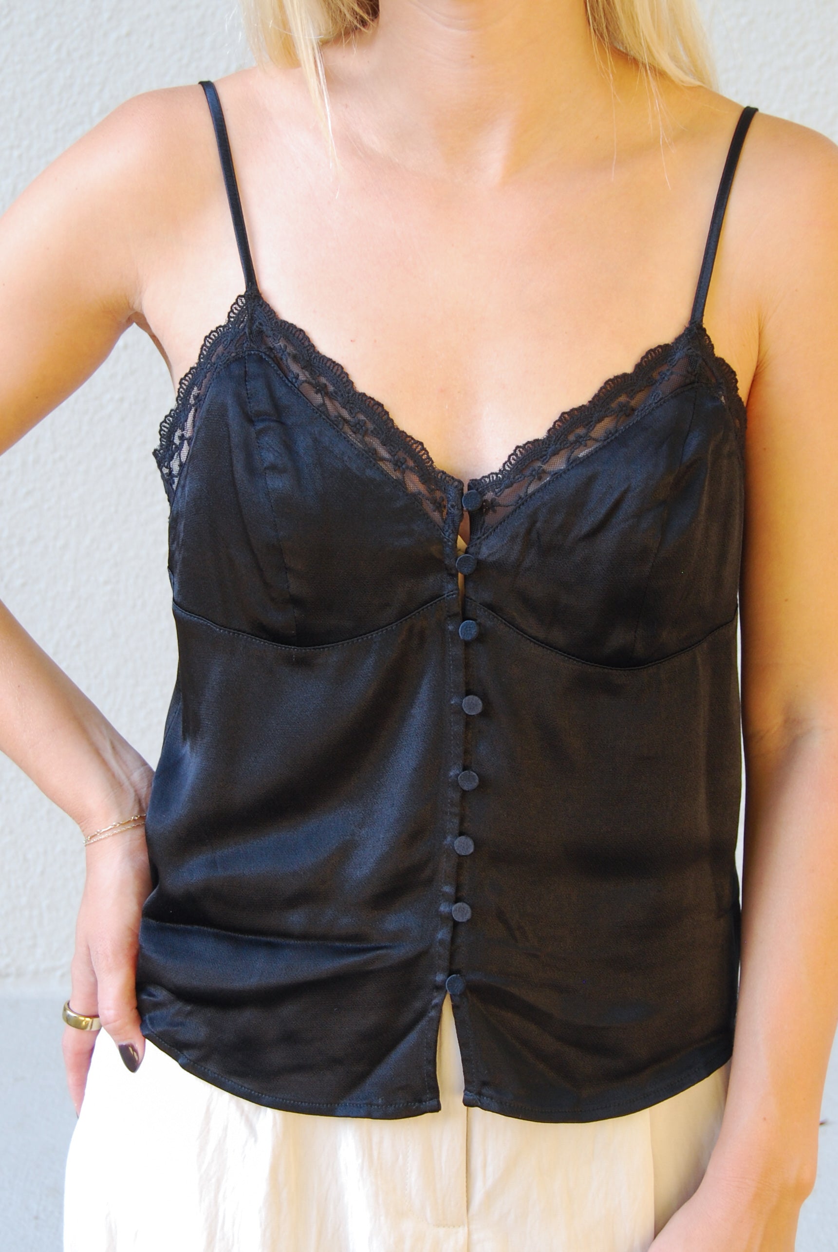 Elevate your look with the Cheri Tank, a playful black lace piece featuring charming front buttons. Its delicate lace adds a flirty touch, while the button details invite a hint of fun and versatility. Perfect for layering or wearing solo, this tank blends bold style with sweet elegance effortlessly.