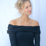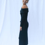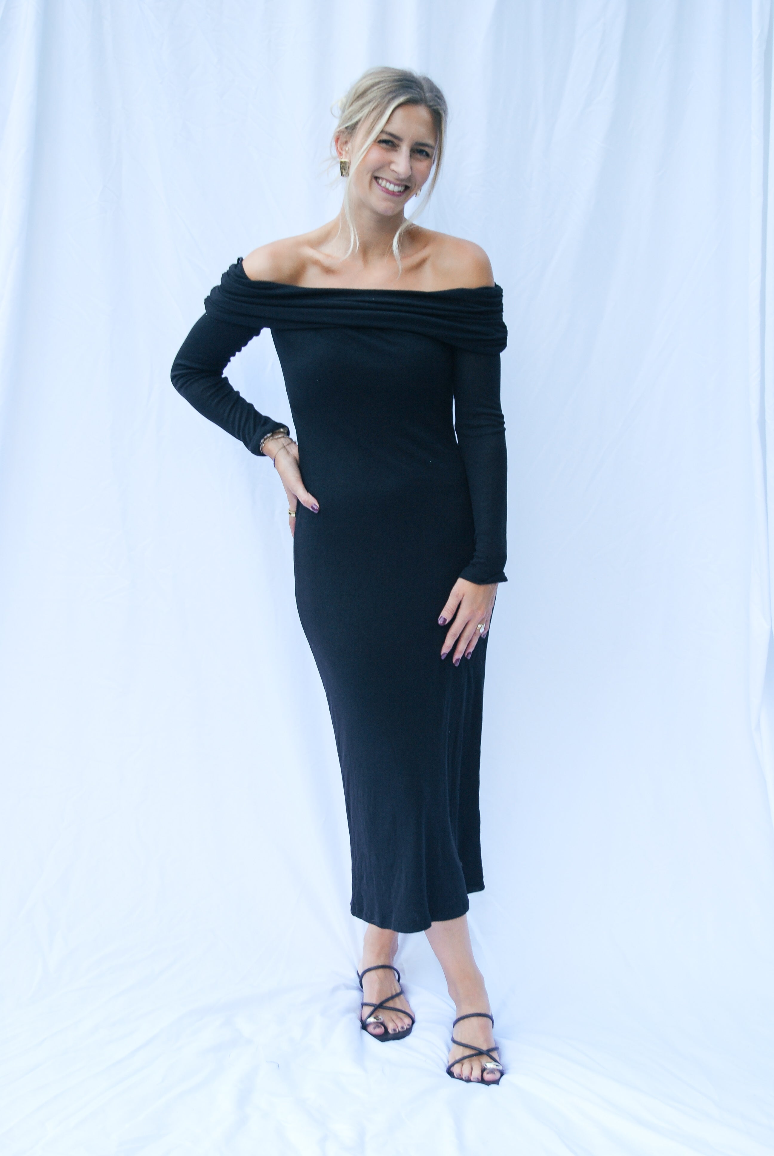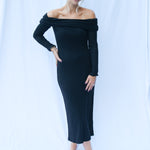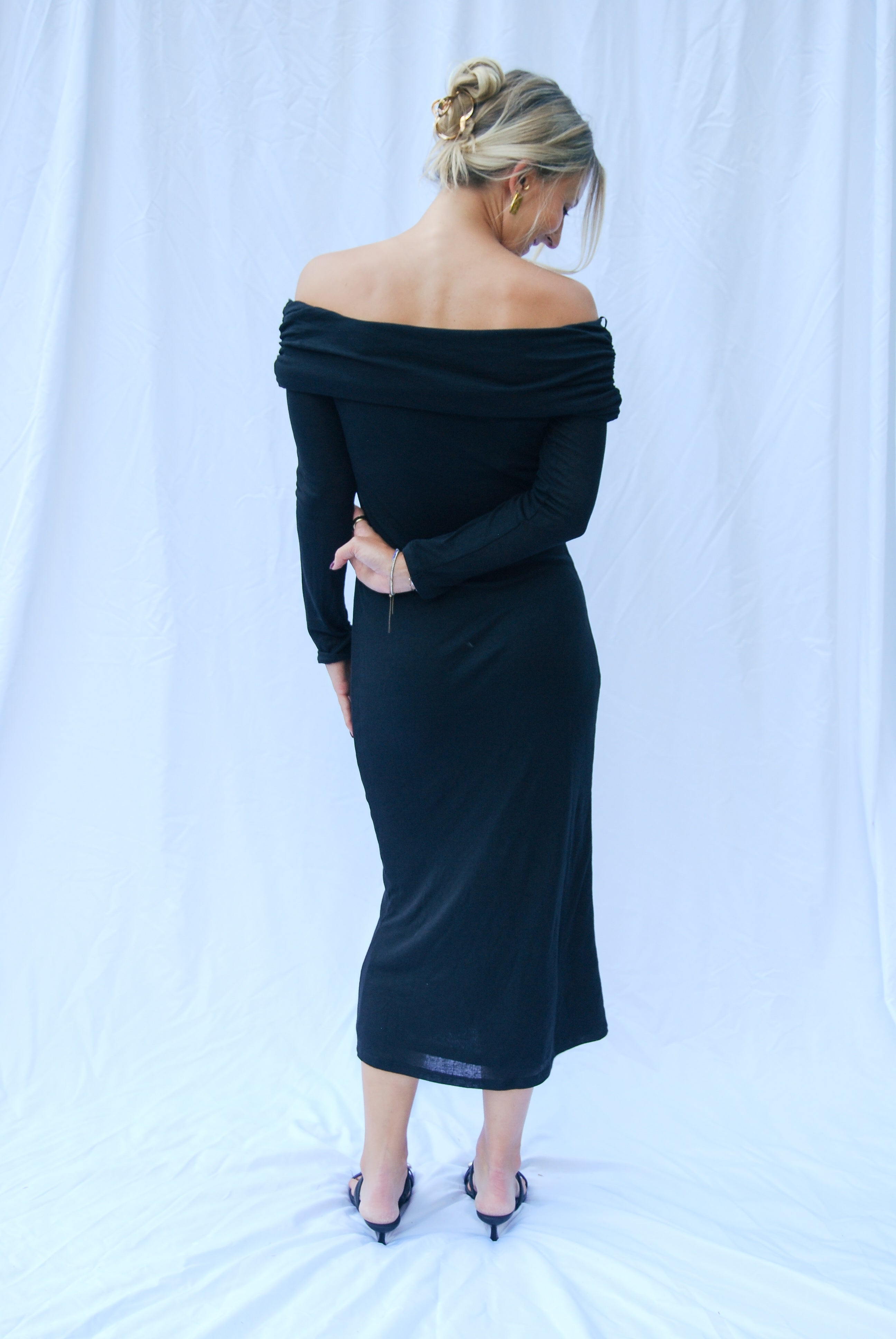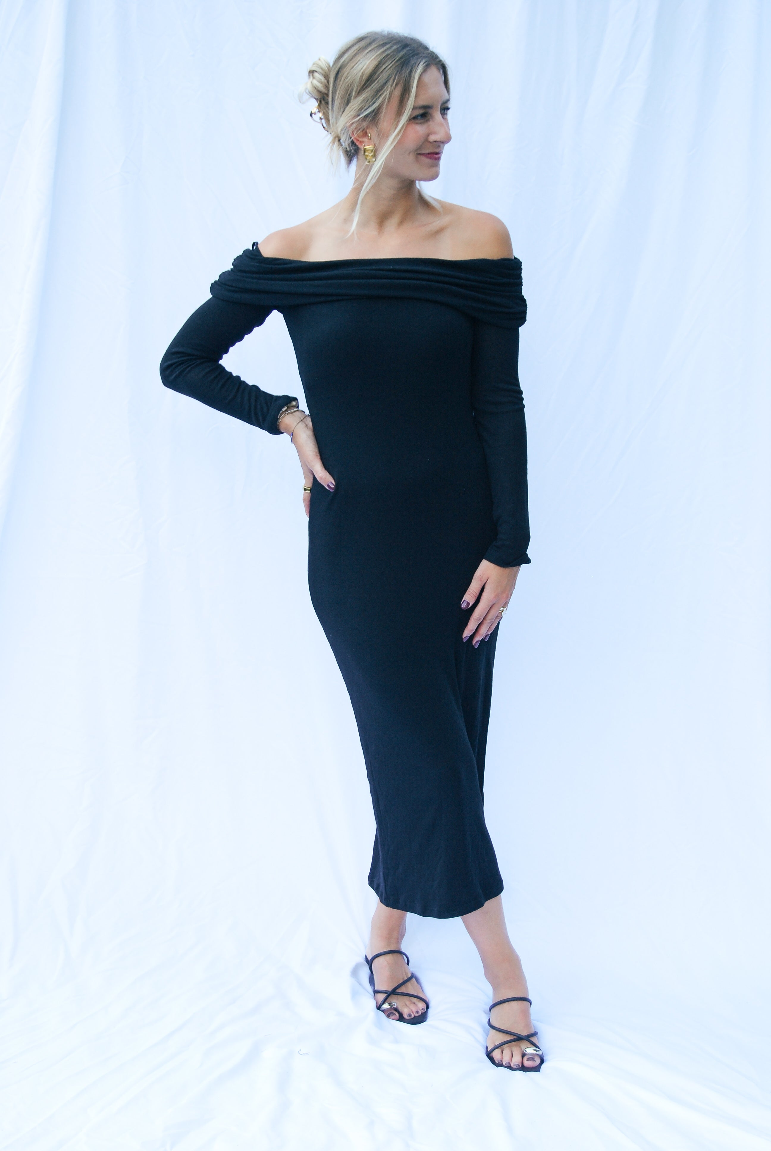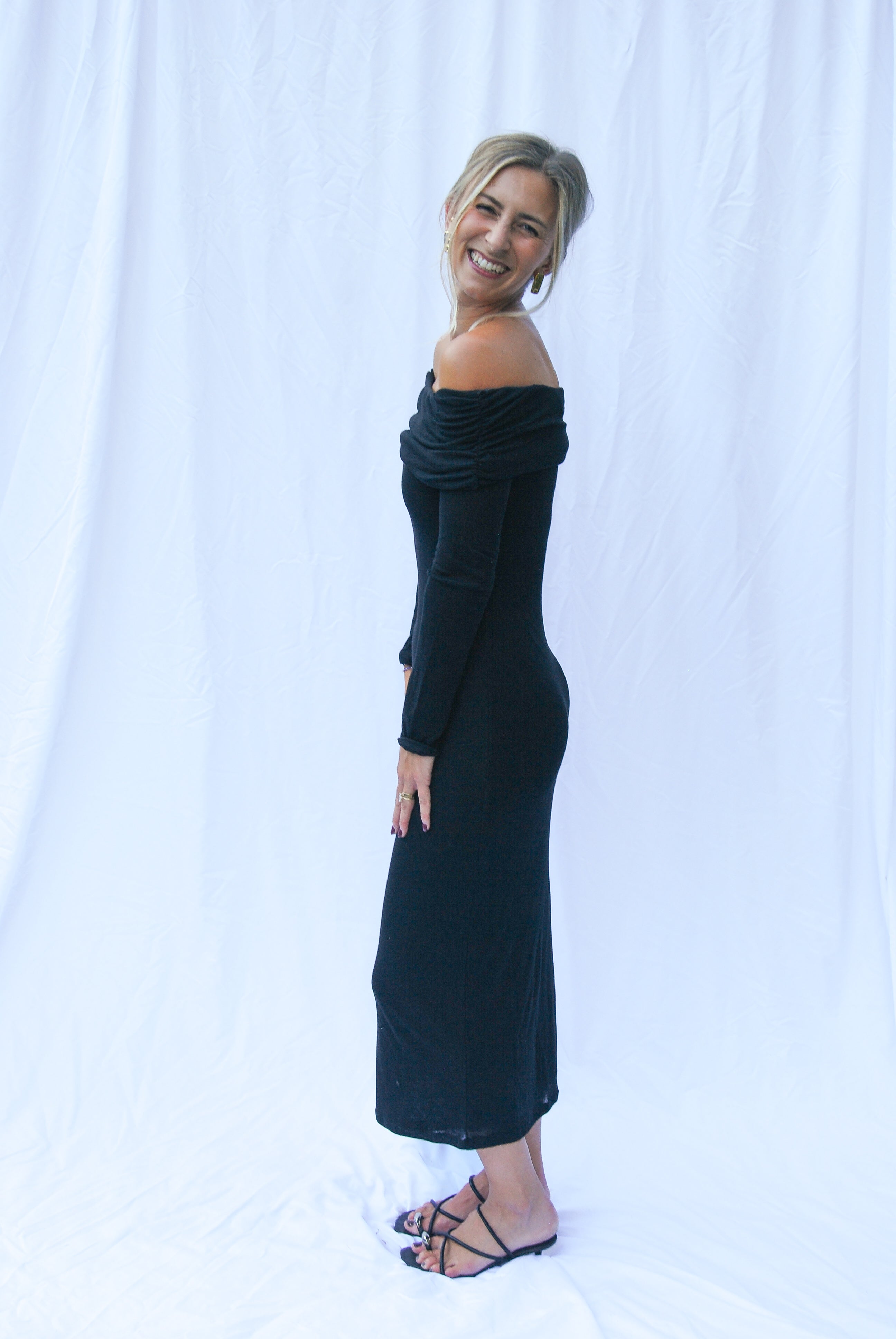 Turn heads with the Cocktail Hour Dress—where comfort meets class in a playful package. This off-shoulder, long-sleeve knit dress features flattering ruching that hugs your curves while letting you move with ease. Perfect for sipping cocktails or dancing the night away, it adds a touch of effortless charm to any occasion.