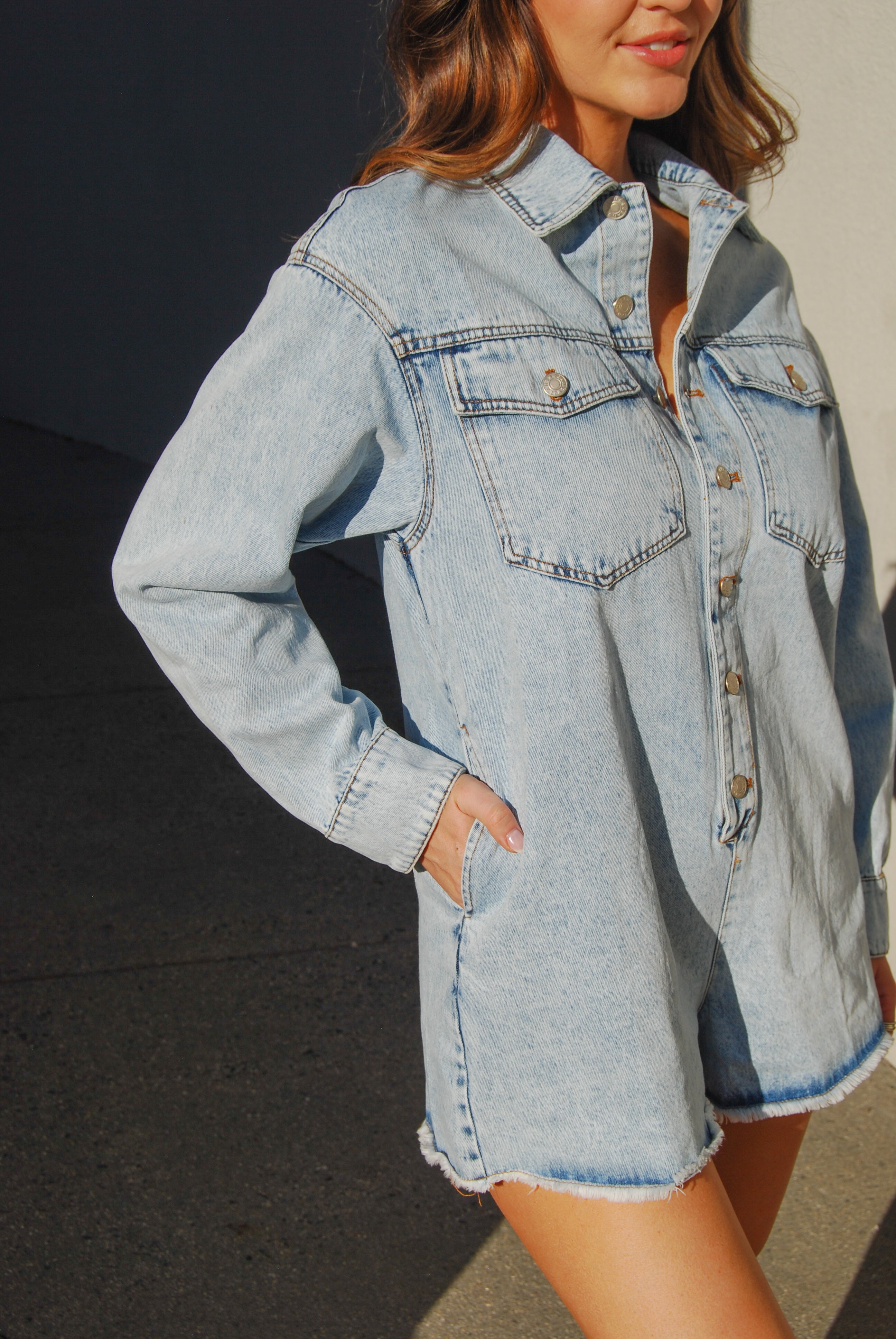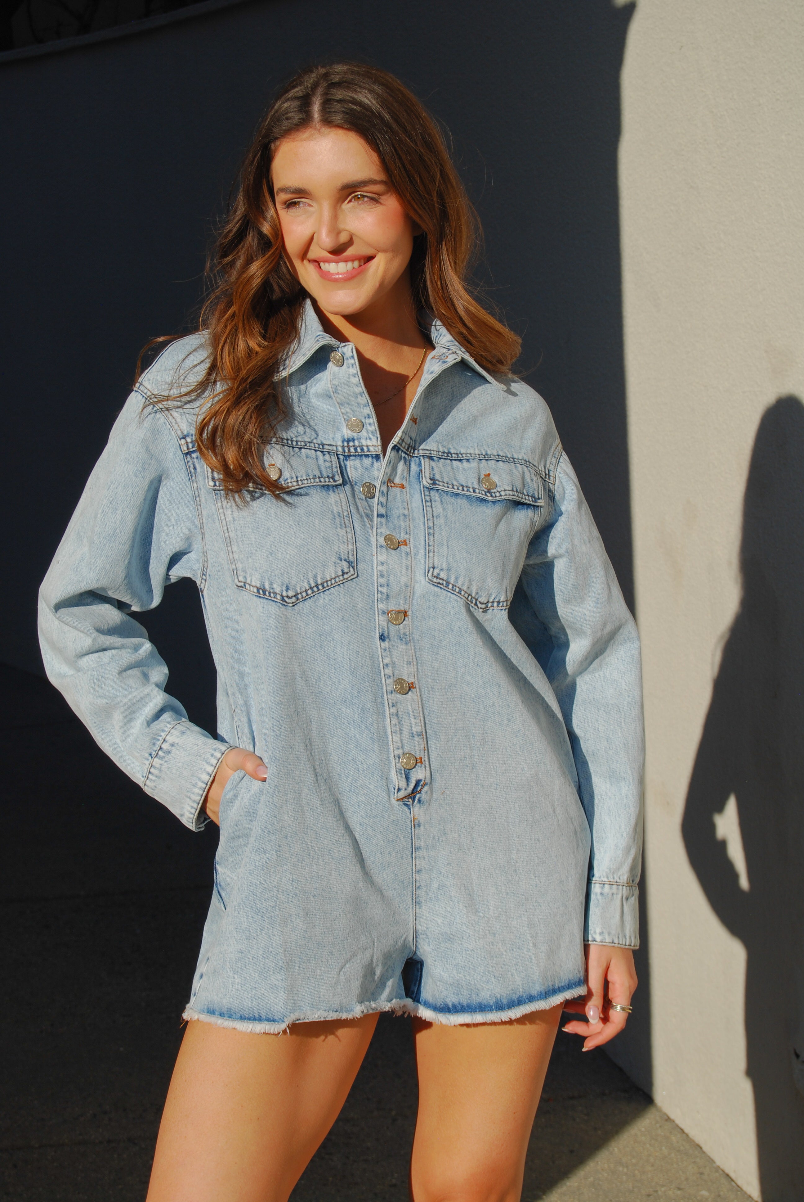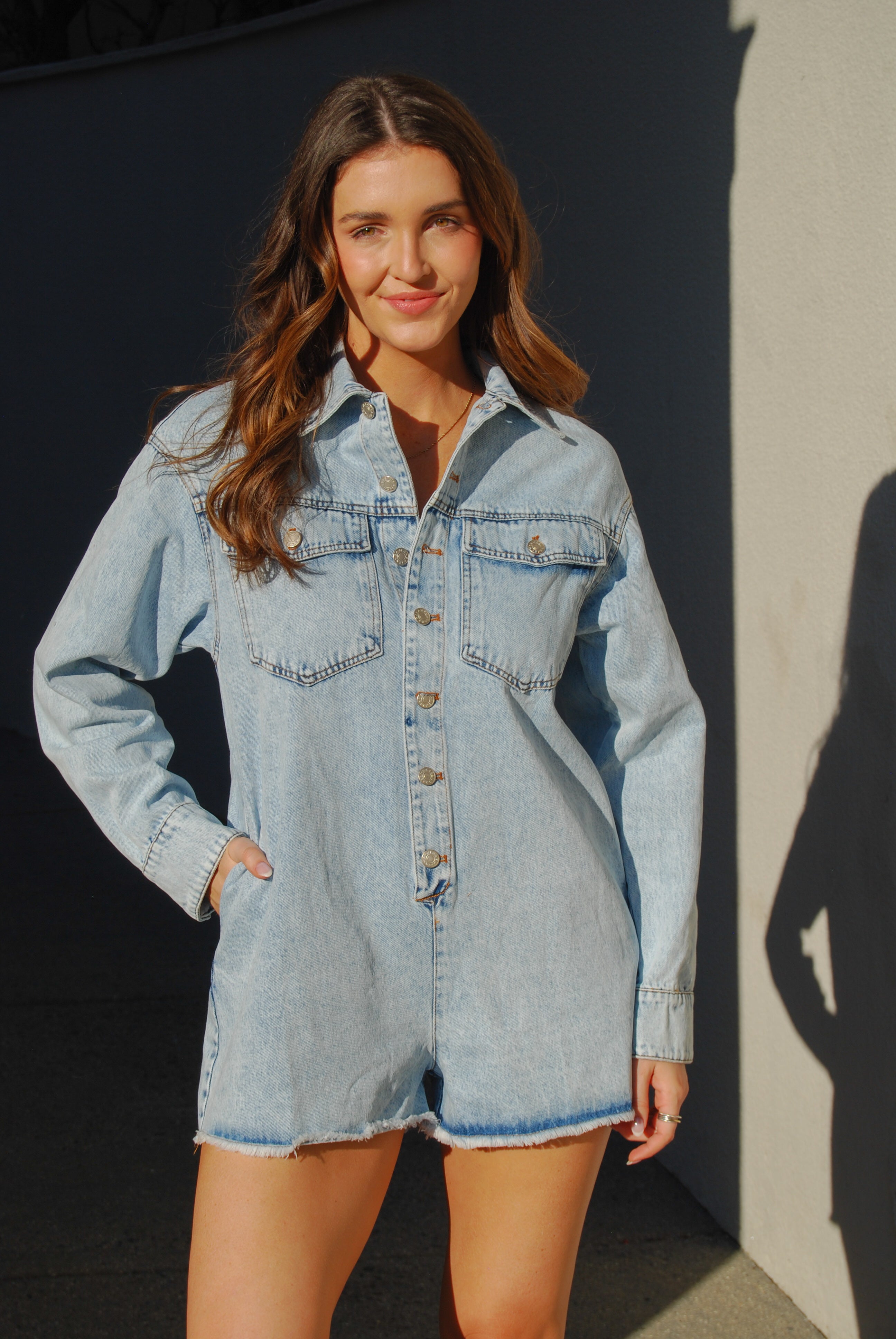 Effortlessly chic, this oversized denim romper offers a relaxed fit and structured style with its button-front design and chest pockets. The frayed hem adds a casual touch, making it perfect for everyday wear. So go ahead, show off your easy-going vibes in this romper.