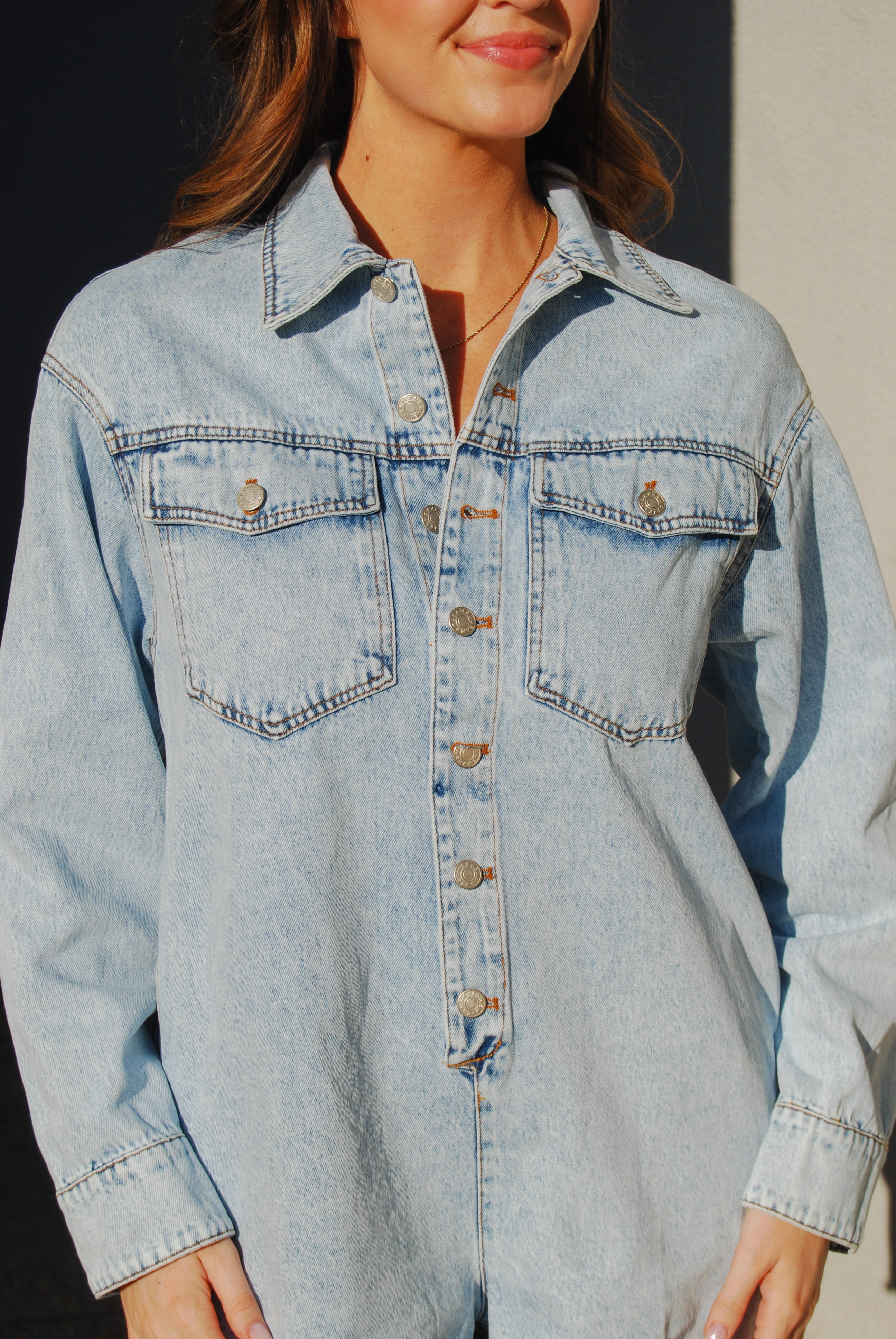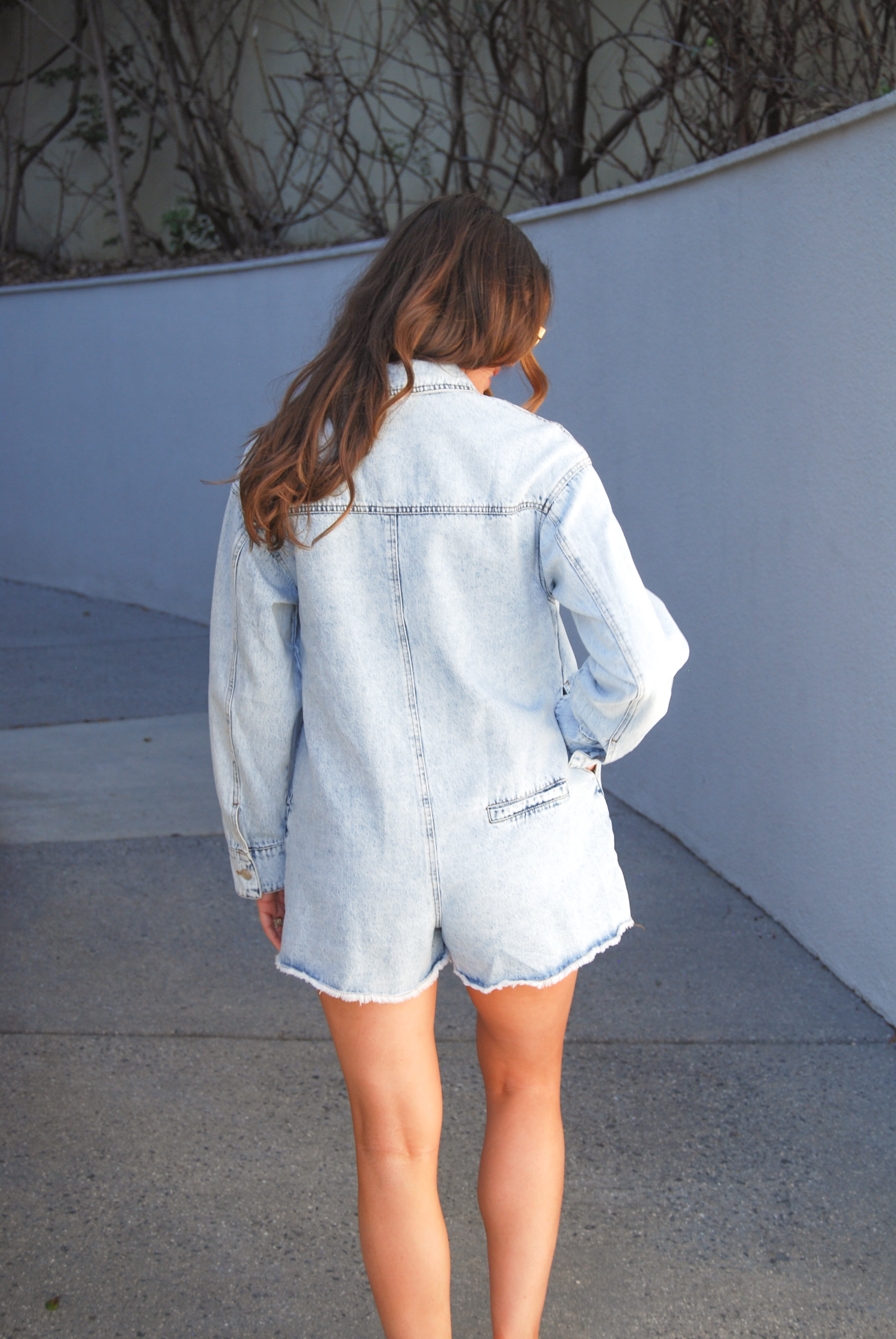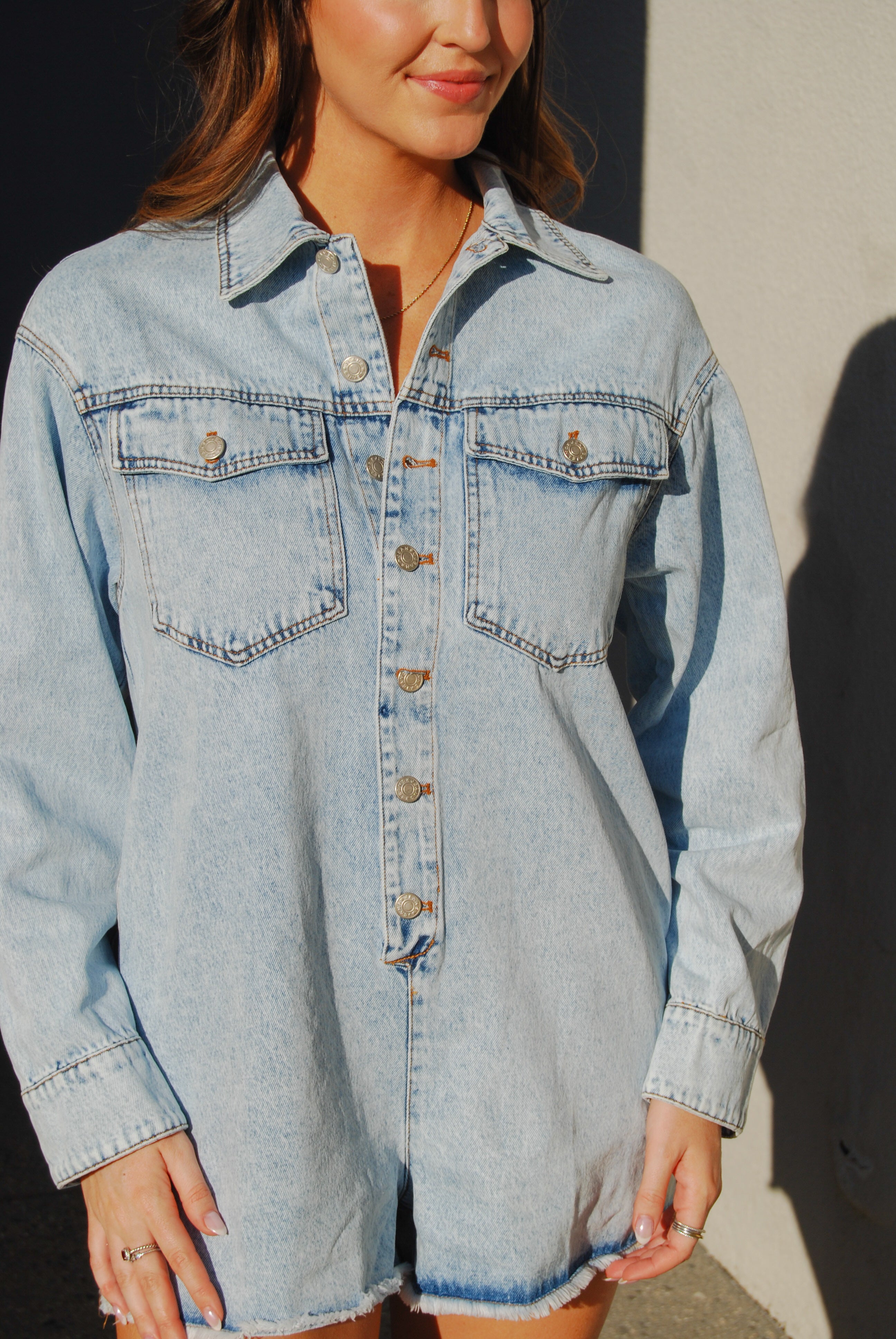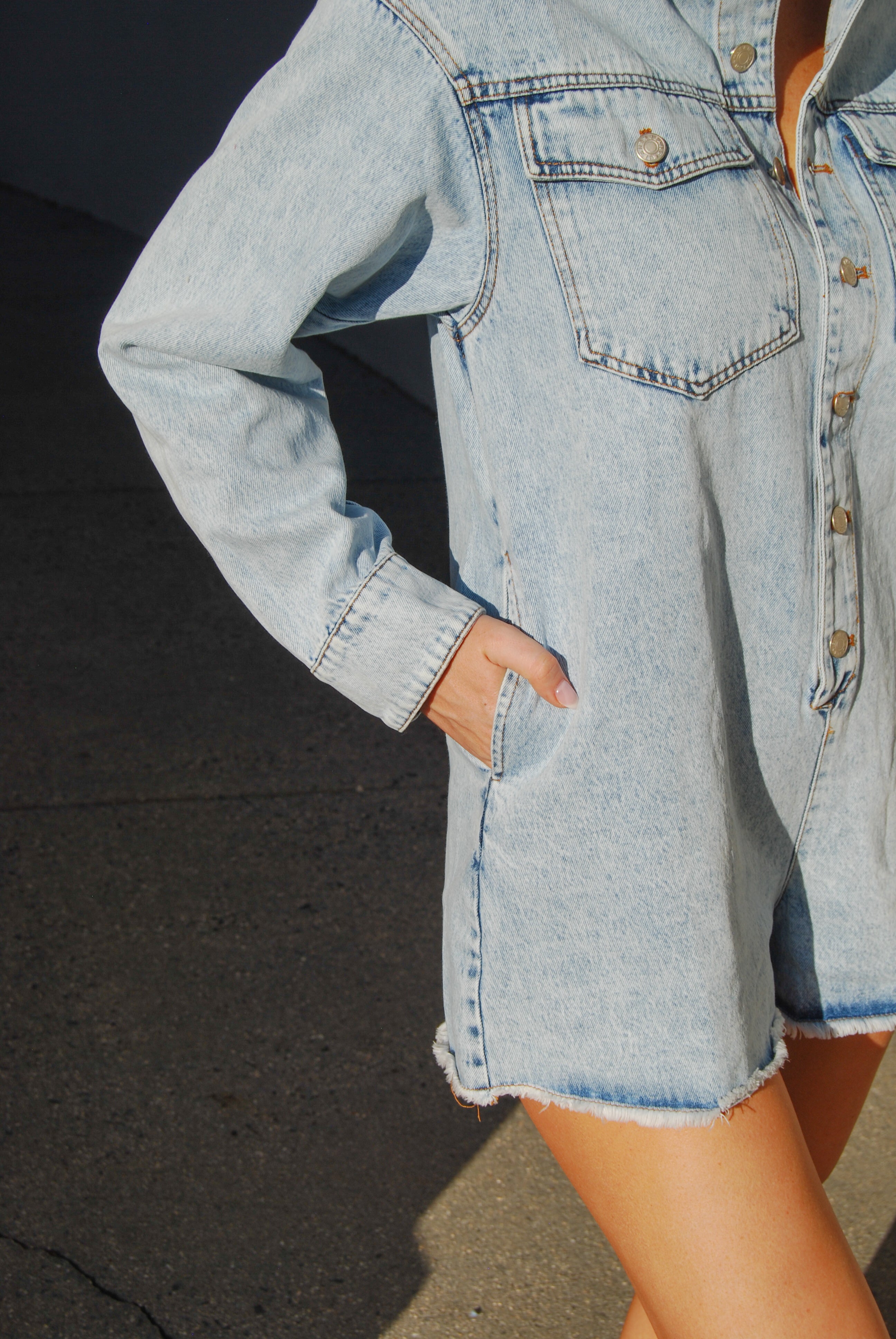 Effortlessly chic, this oversized denim romper offers a relaxed fit and structured style with its button-front design and chest pockets. The frayed hem adds a casual touch, making it perfect for everyday wear. So go ahead, show off your easy-going vibes in this romper.