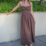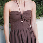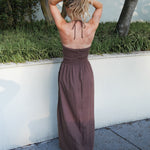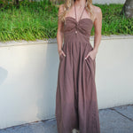 Slip into our Espresso Time Maxi Dress and make a statement! This twist-front, linen dress comes with a halter tie, pockets, and a flattering cut. Perfect for any occasion, , it'll have you turning heads and feeling confident.