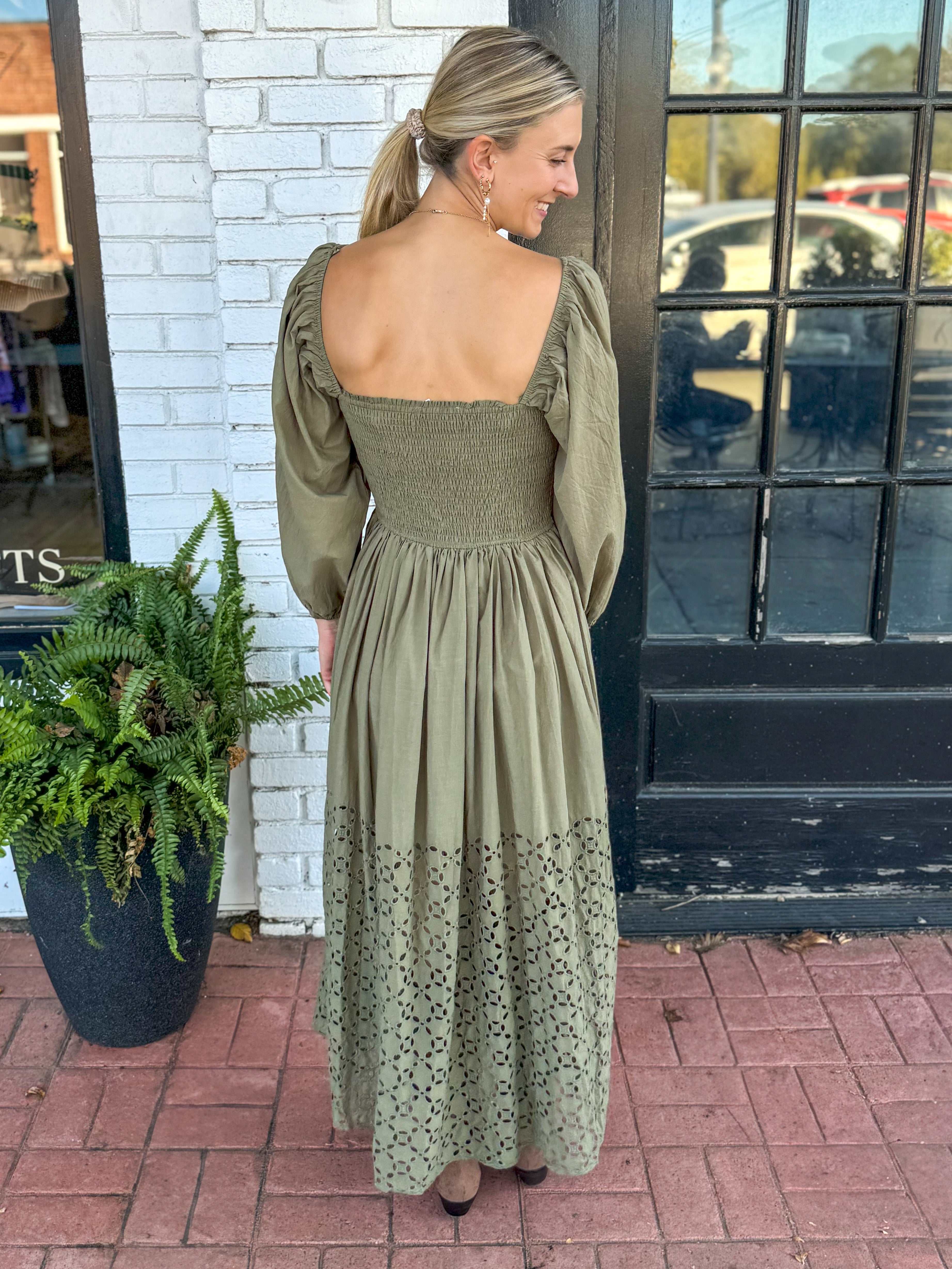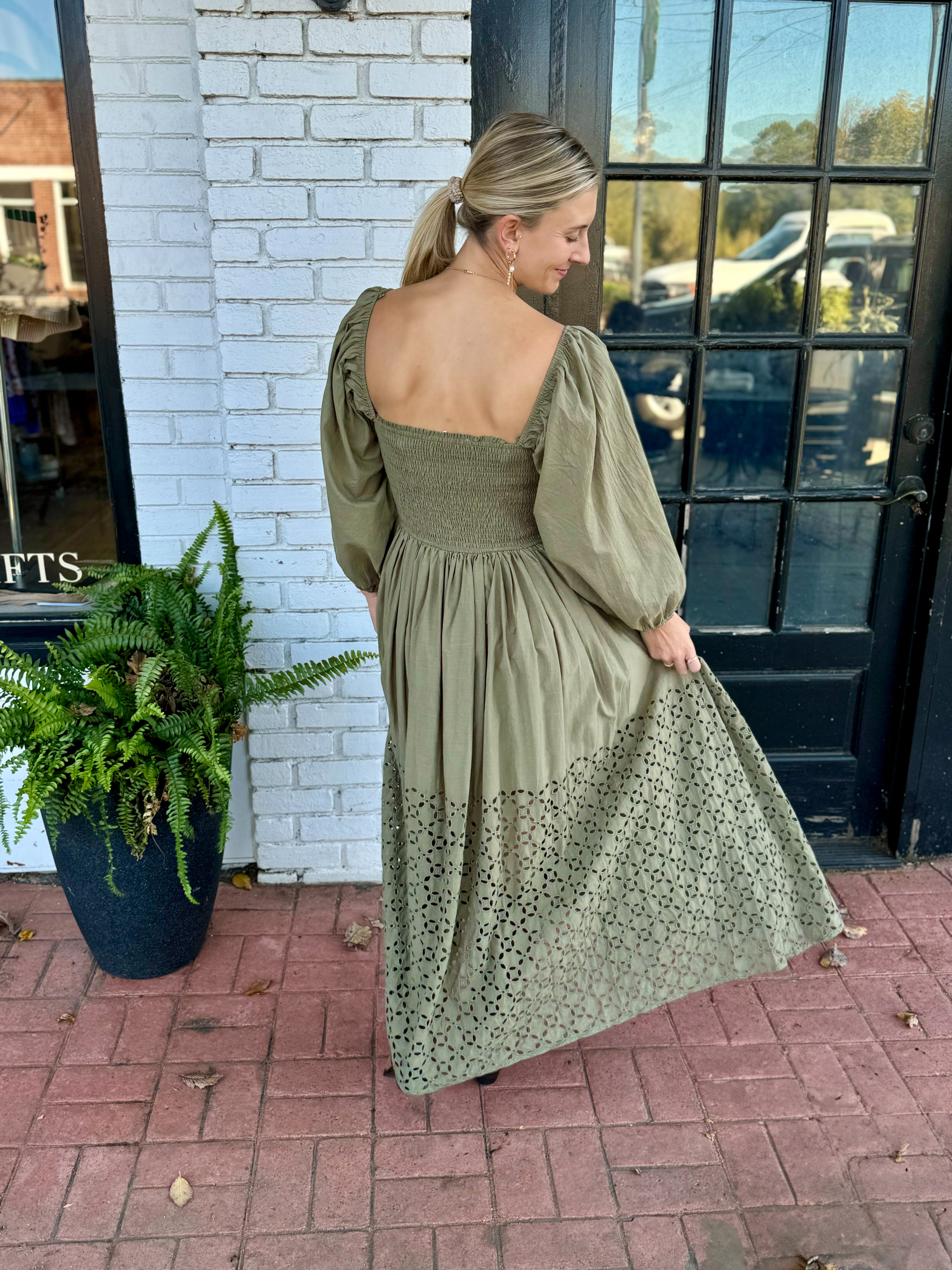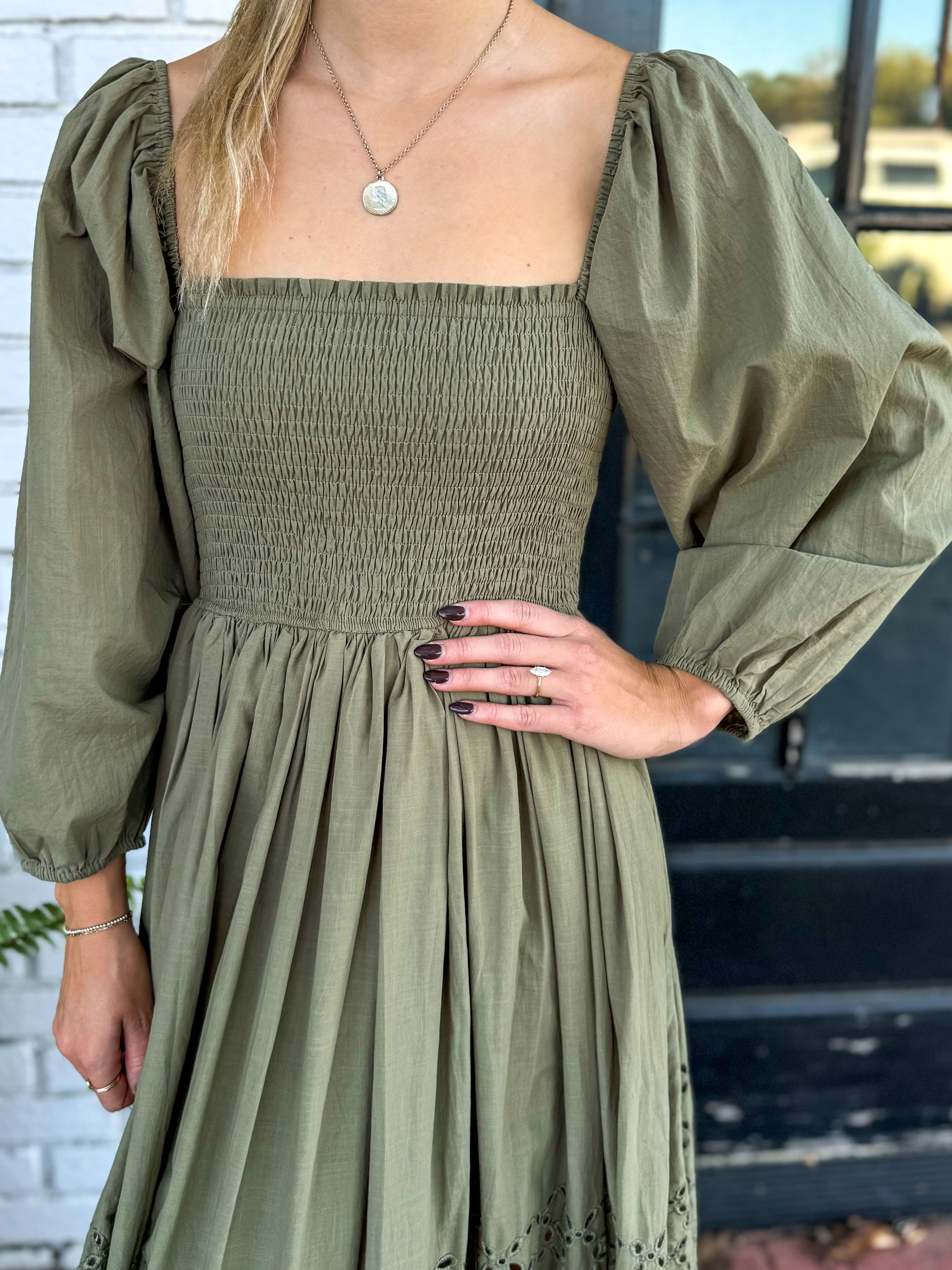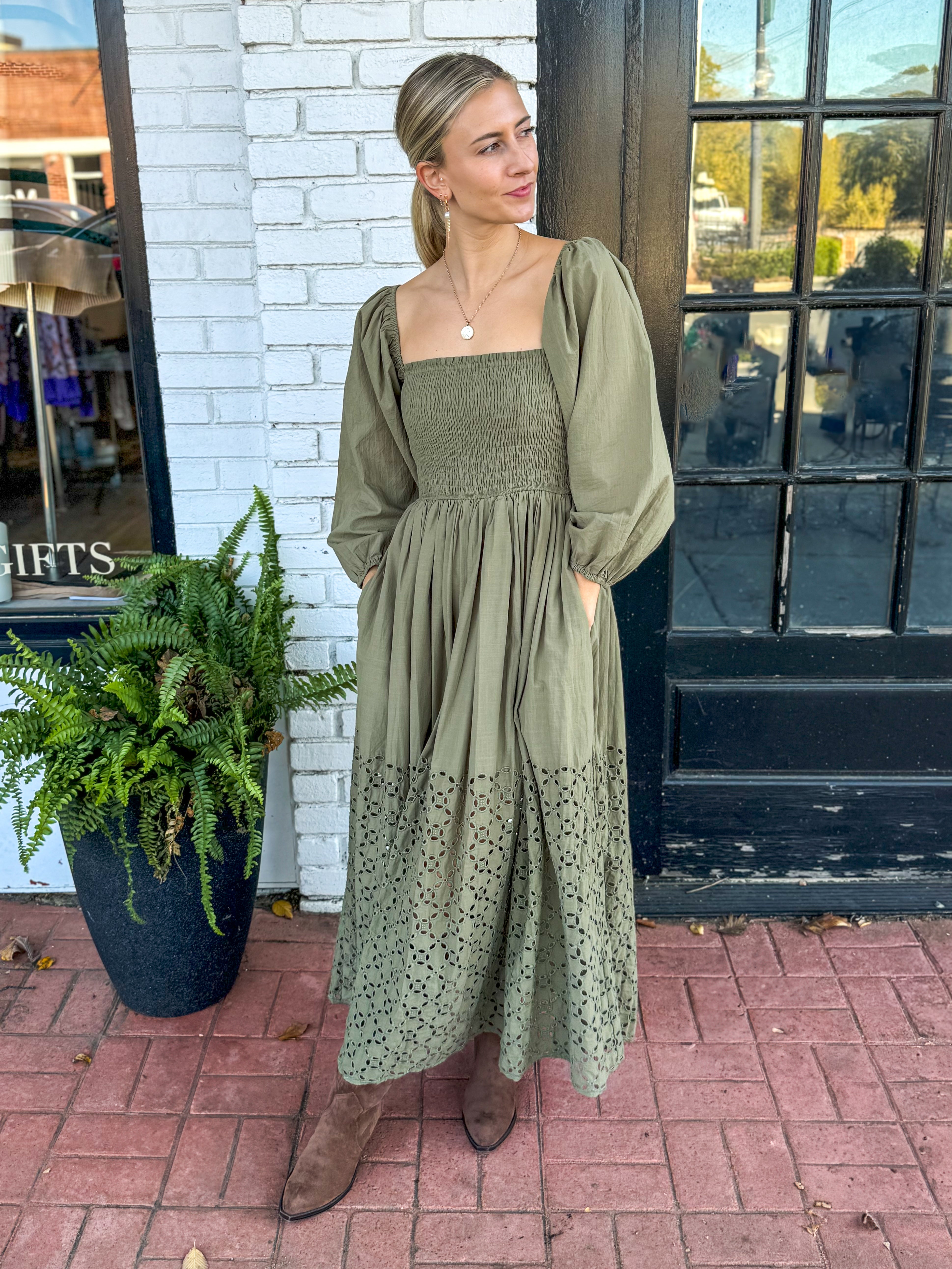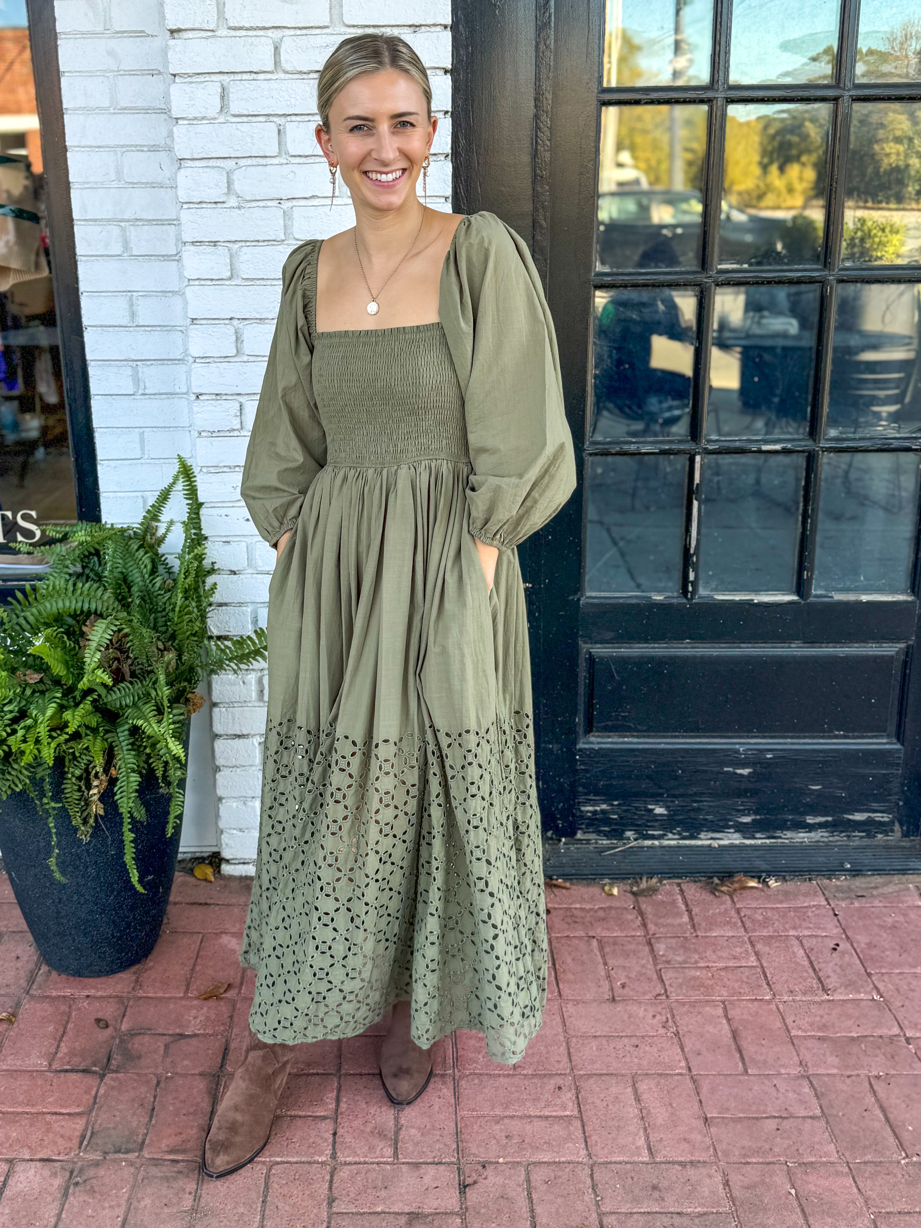 Get ready to turn heads with our Eyelet Midi Dress! This stunning dress features a beautiful eyelet skirt, paired with charming puff sleeves and a ruched bodice. Perfect for fall, this dress is a must-have for any fashion lover's wardrobe.