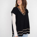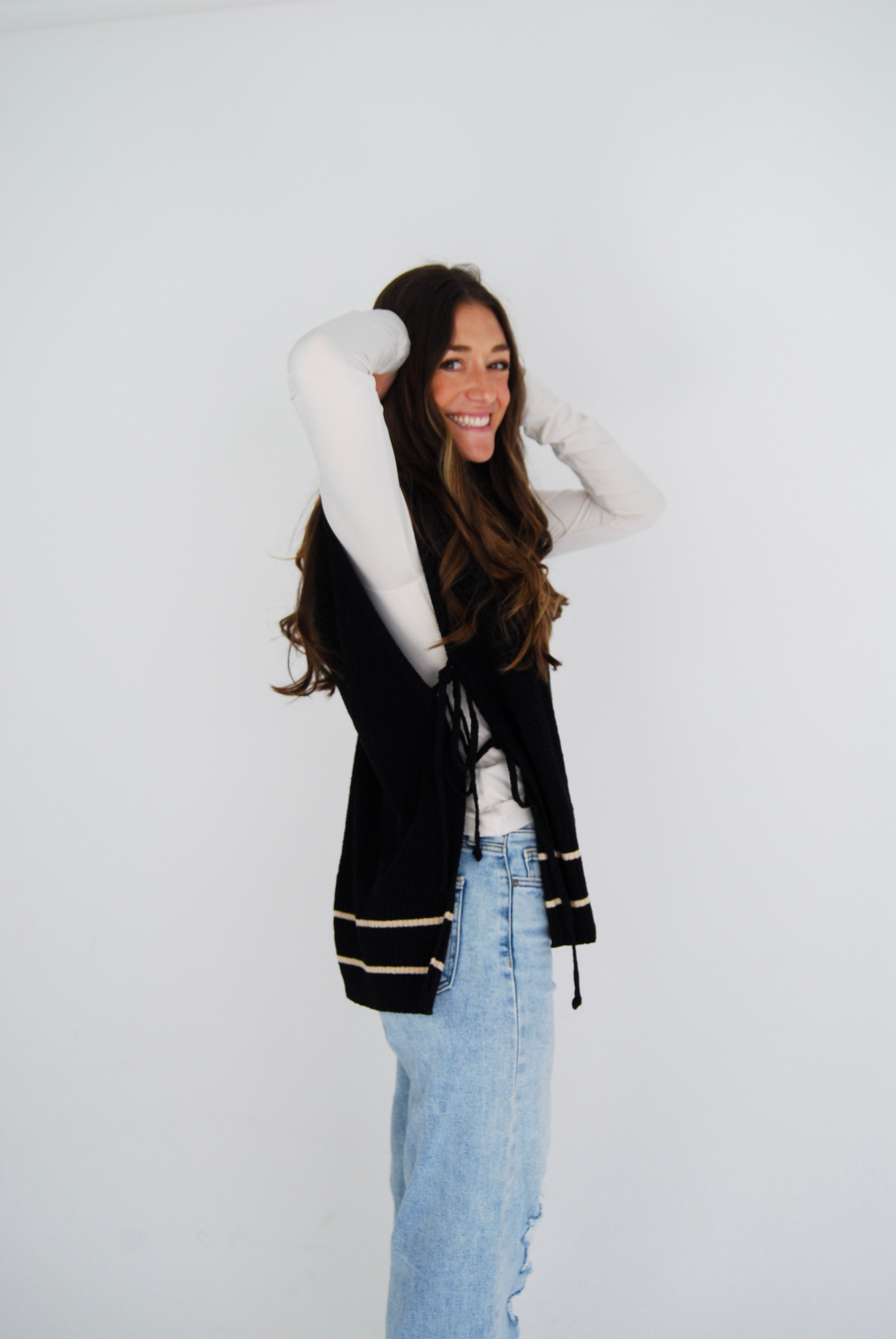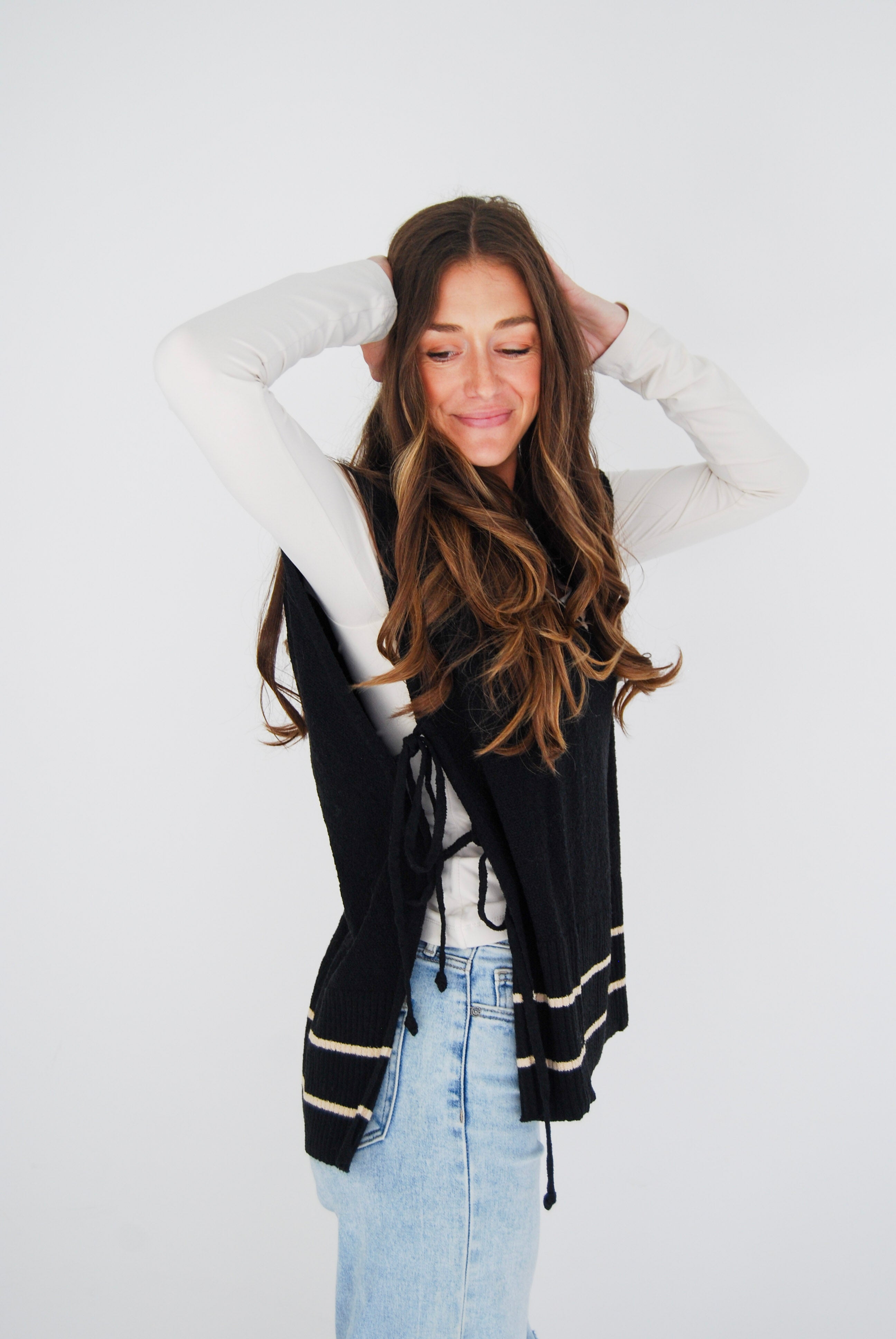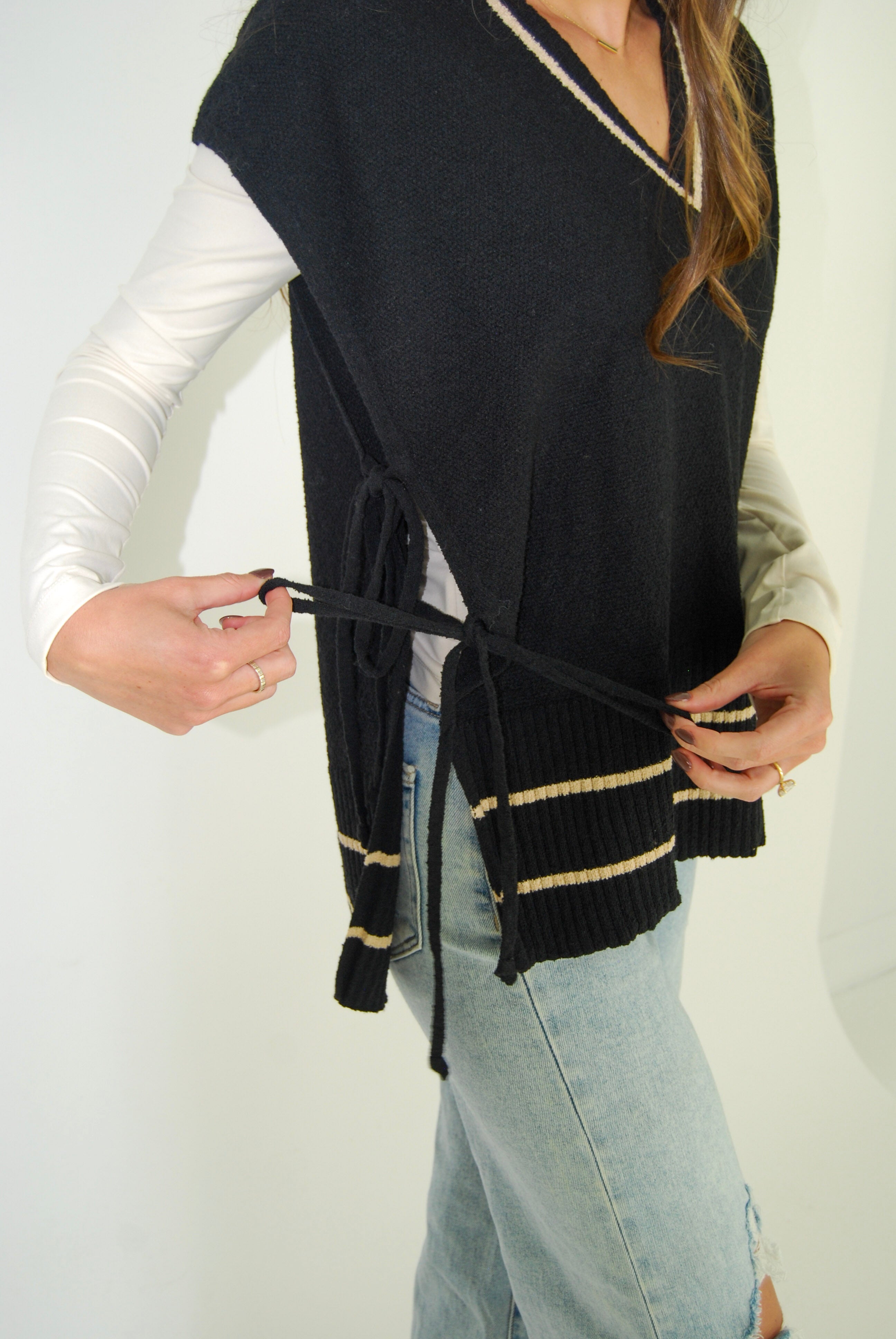 This playful v-neck knit vest features eye-catching striped details and open sides with adjustable ties for a fun twist. Perfect for layering over your favorite tops, it adds effortless style and cozy charm to your fall wardrobe. Easy to mix, match, and love all season long!