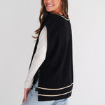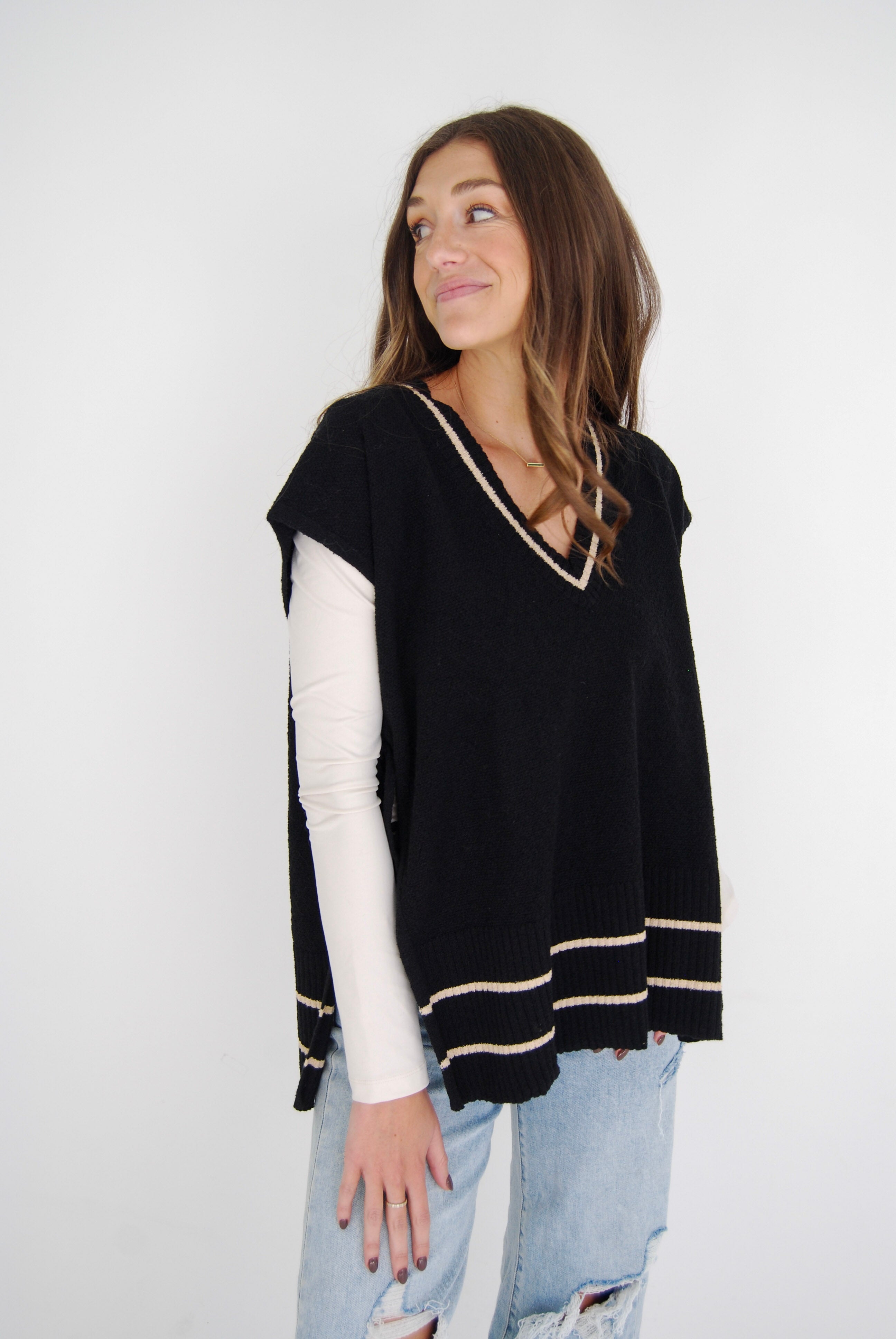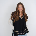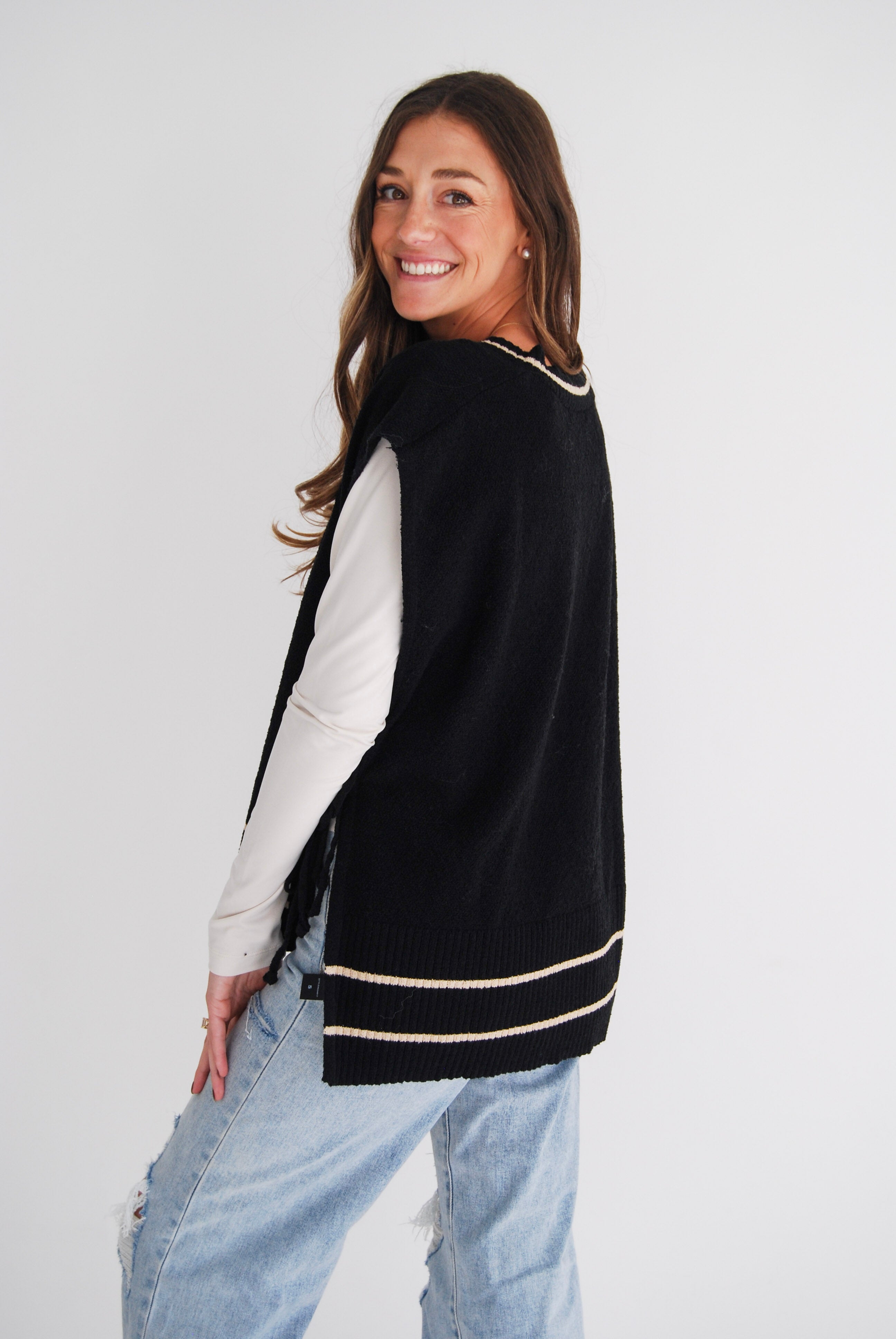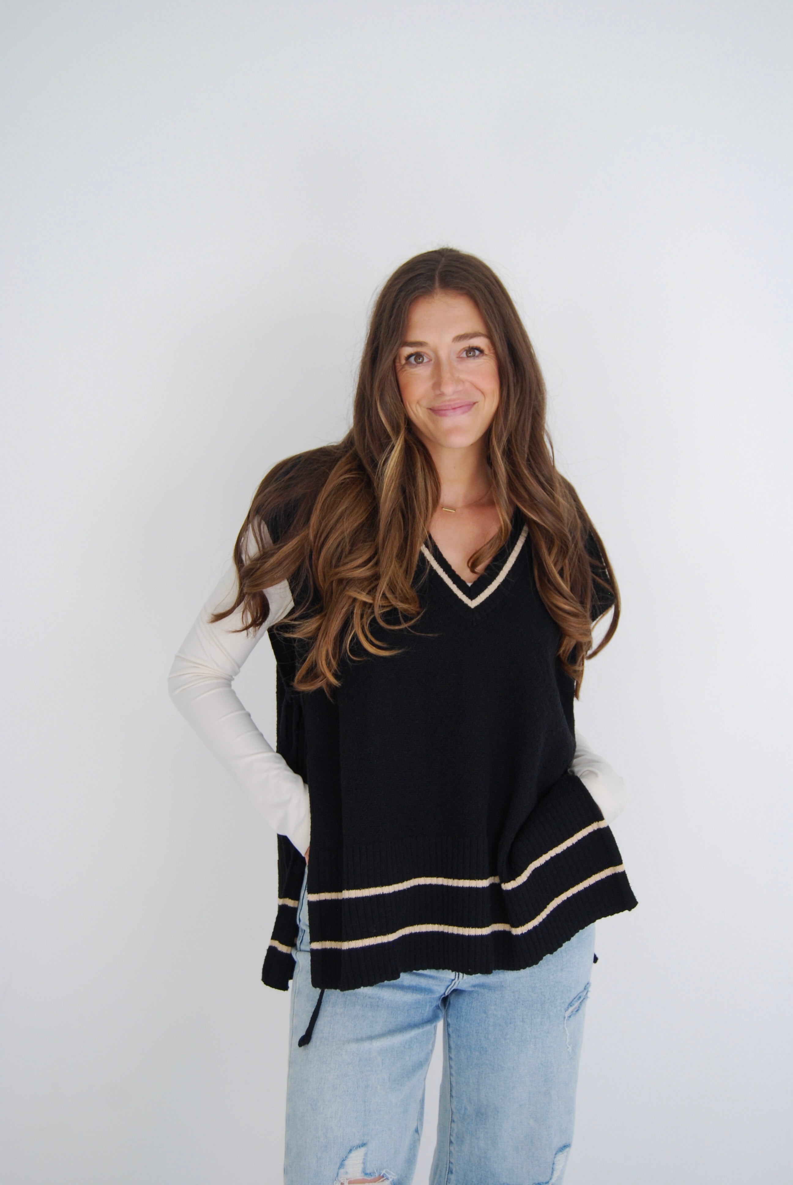 This playful v-neck knit vest features eye-catching striped details and open sides with adjustable ties for a fun twist. Perfect for layering over your favorite tops, it adds effortless style and cozy charm to your fall wardrobe. Easy to mix, match, and love all season long!
