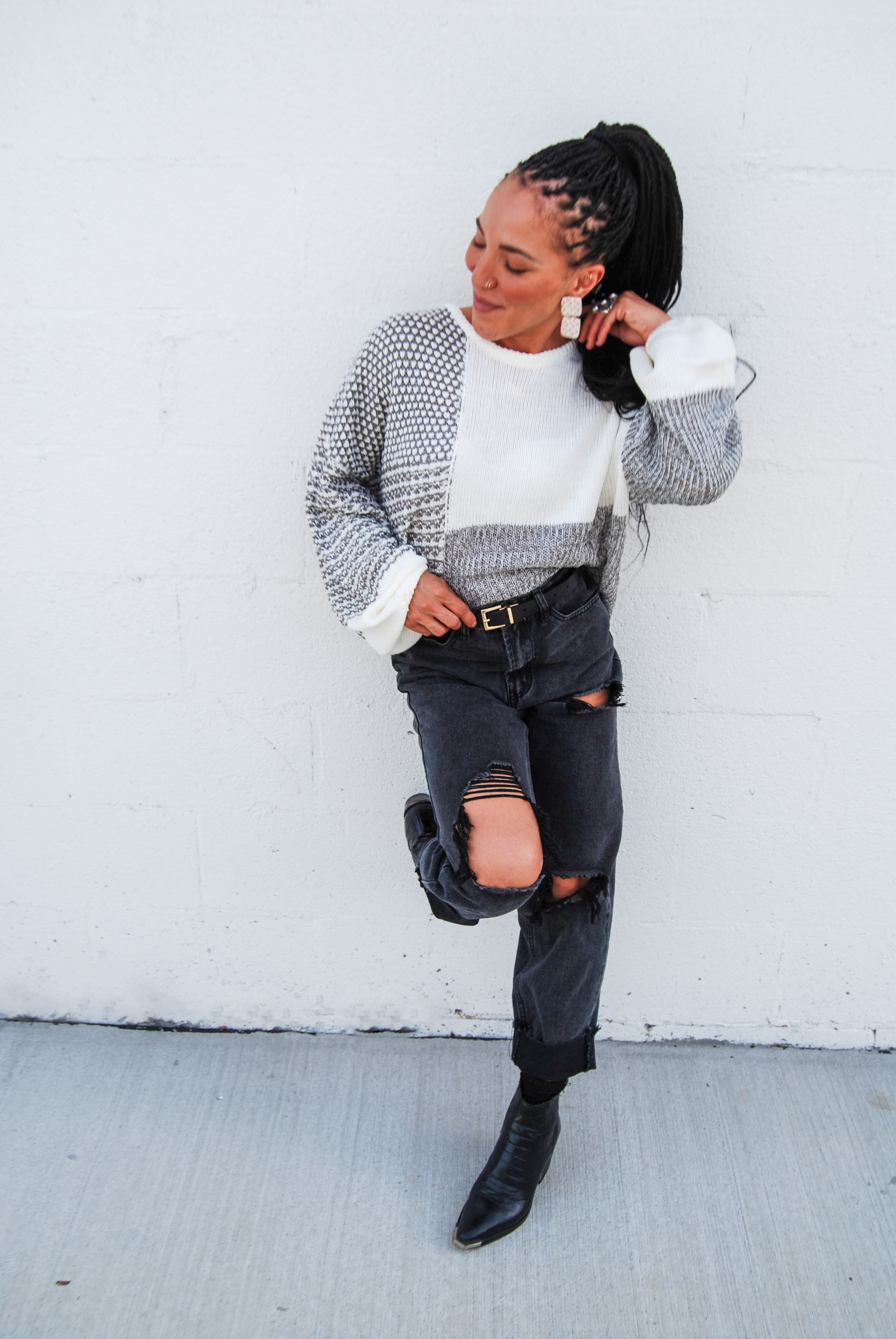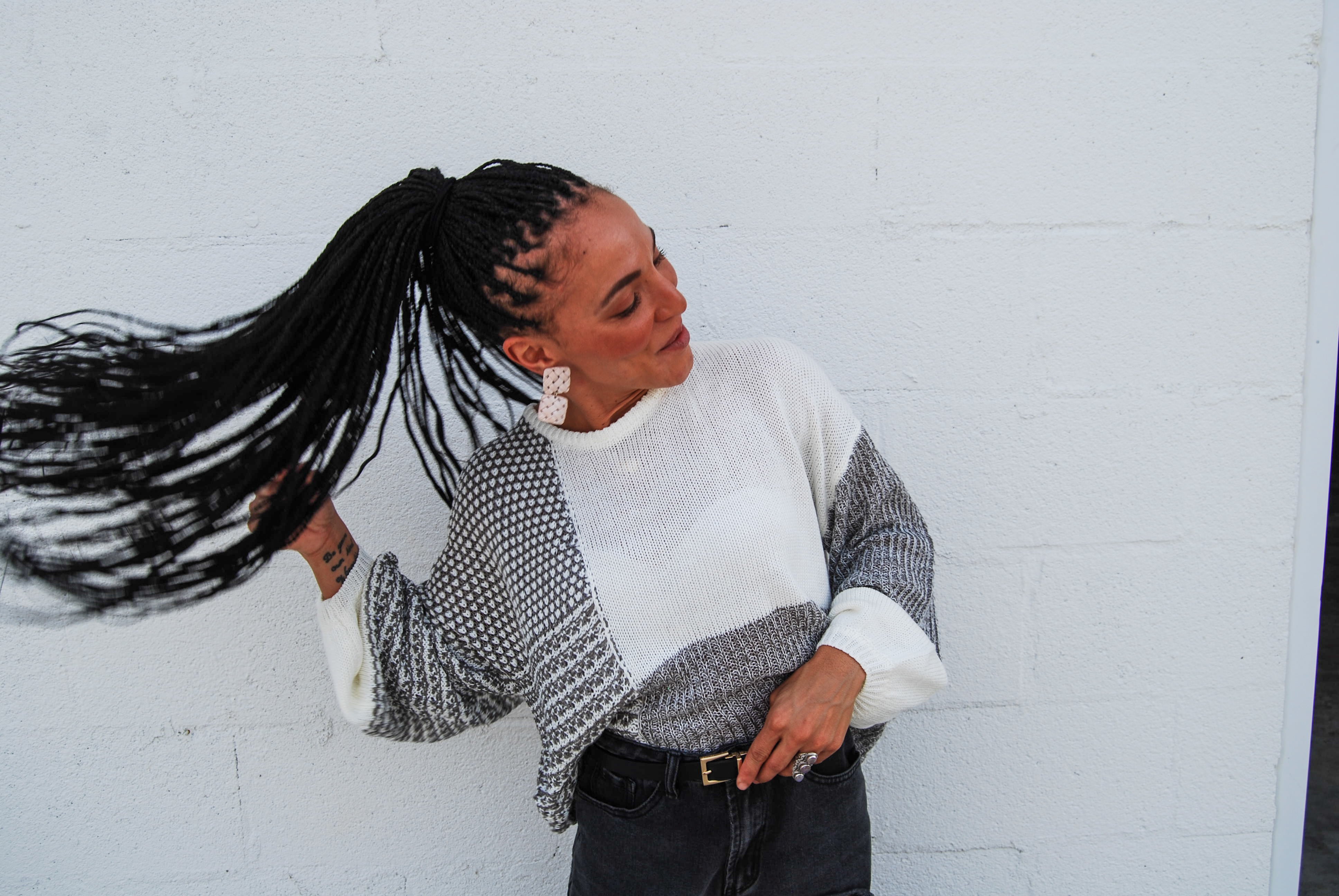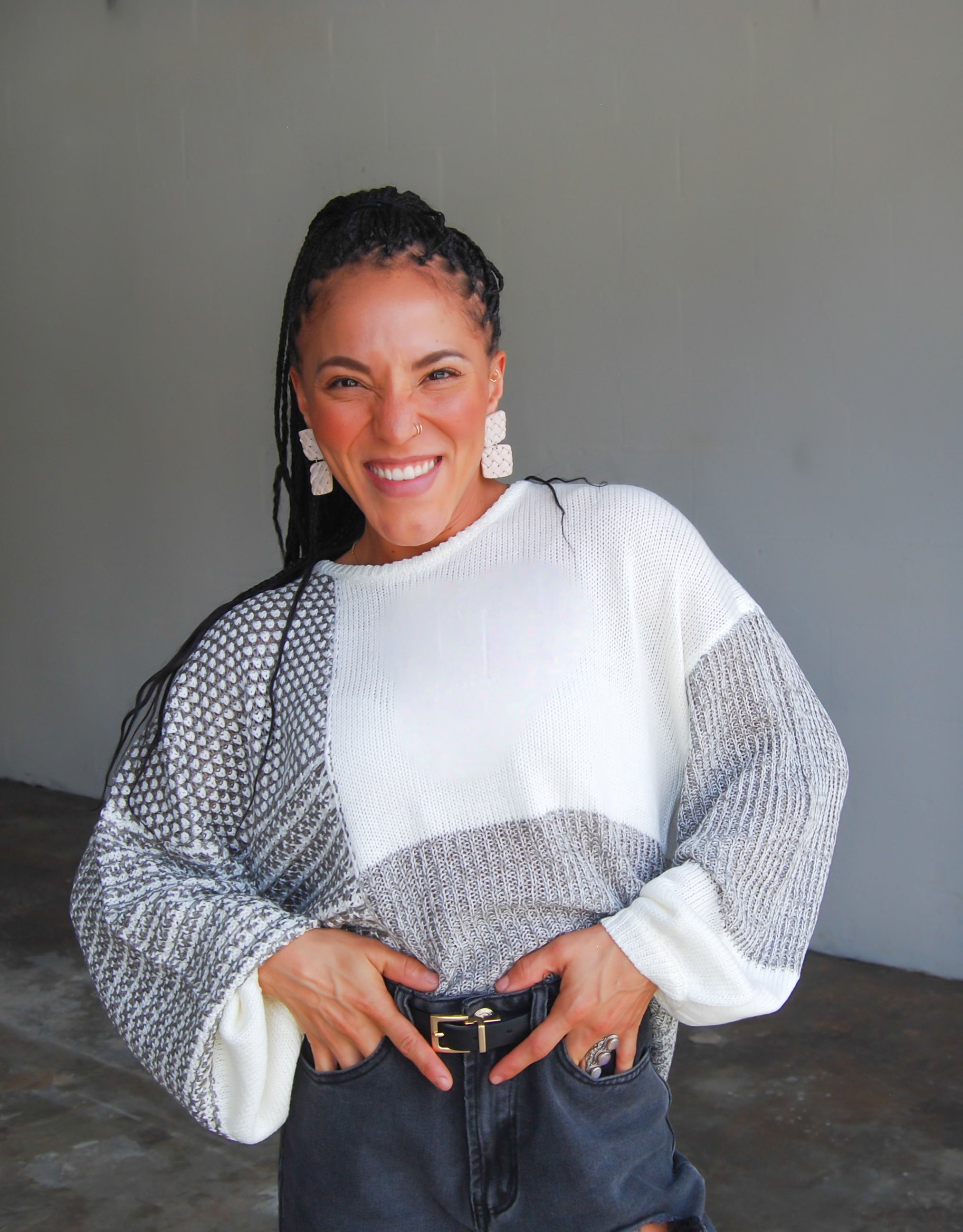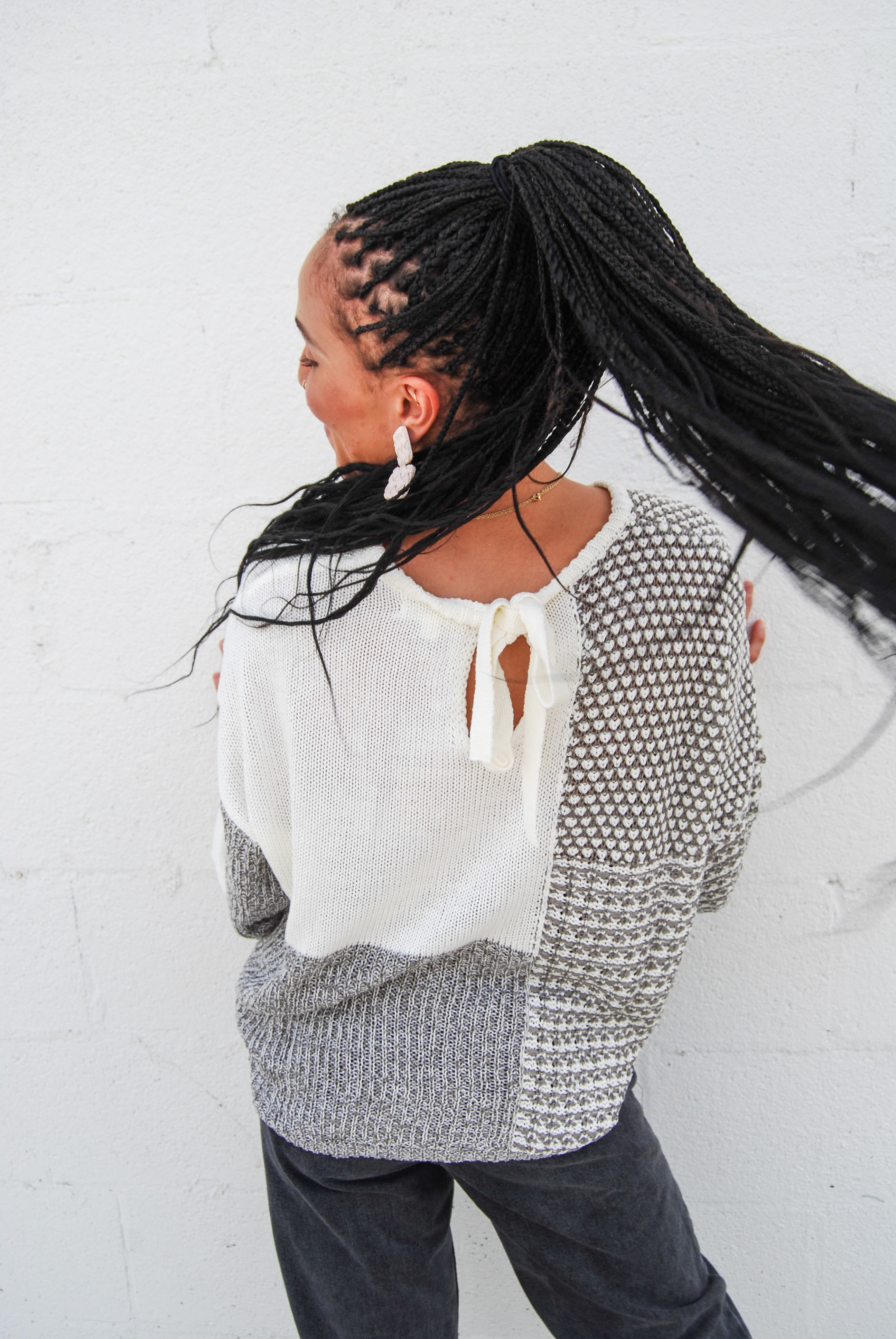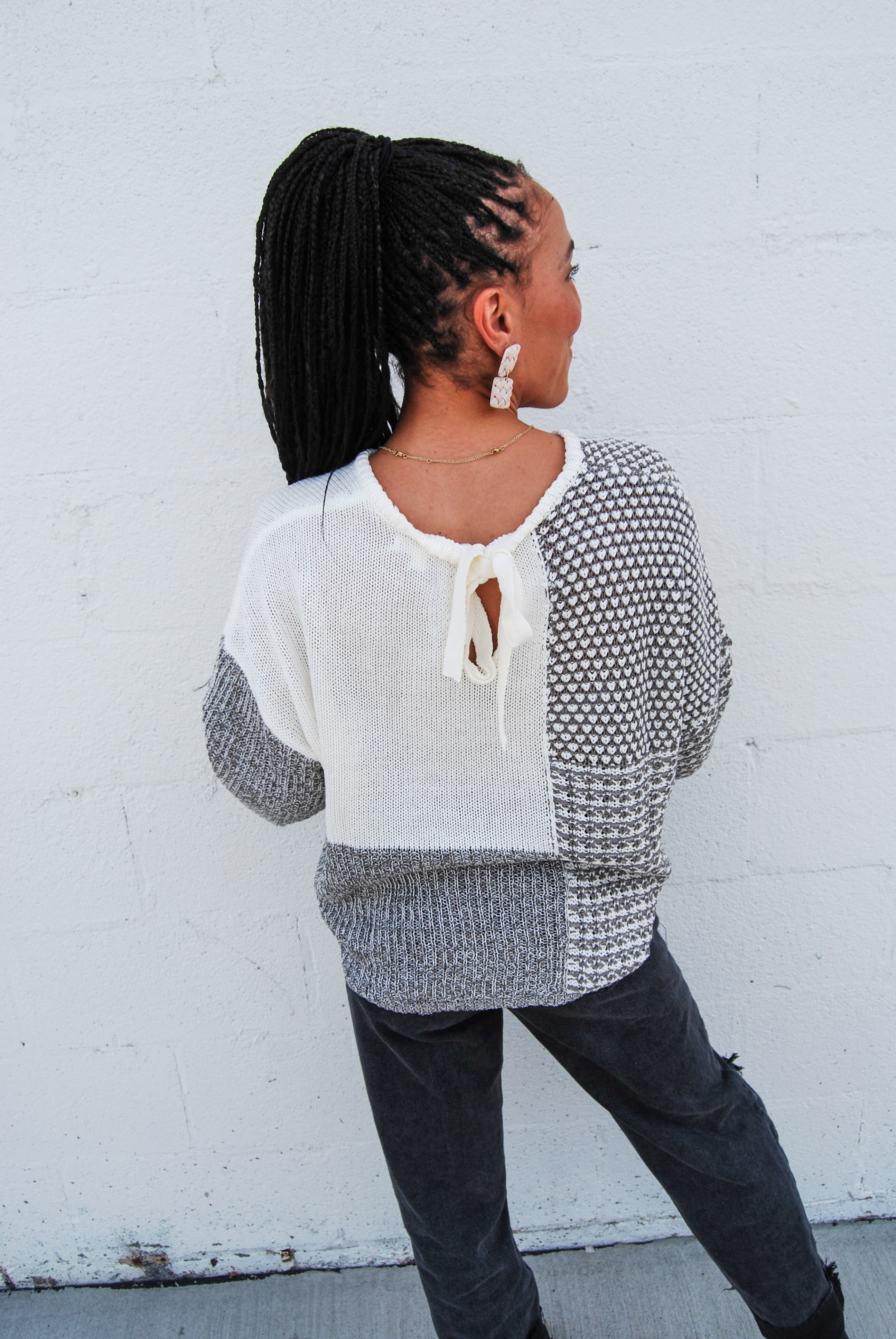 The Felicity Sweater is a sweater that has it all. Featuring a beautiful lux knit, color blocking pattern, drop shoulder and a cute tie back detail we know this will make a subtle statement! This sweater feels luxurious and is the perfect weight for middle temp days!