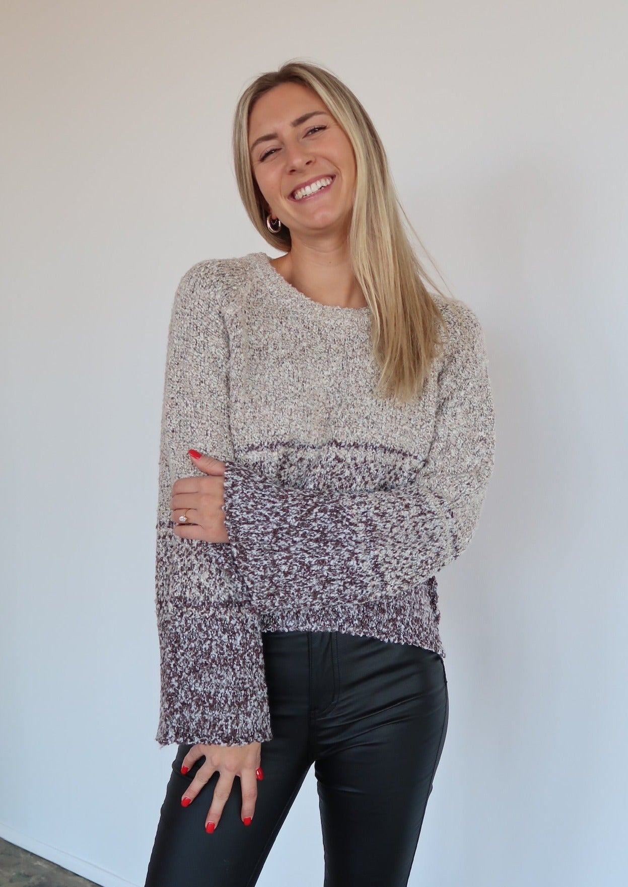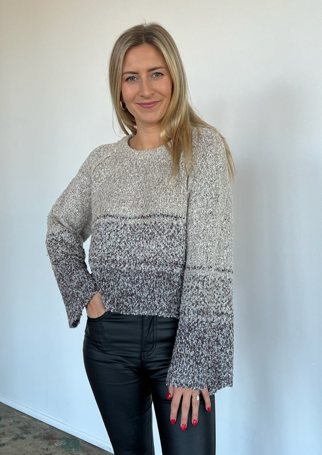 Introducing the Fraya Sweater featuring a classic scoop neckline, relaxed fit with wide bell sleeves and ombre-inspired stripe detailing. Perfect for effortlessly elevating your style.