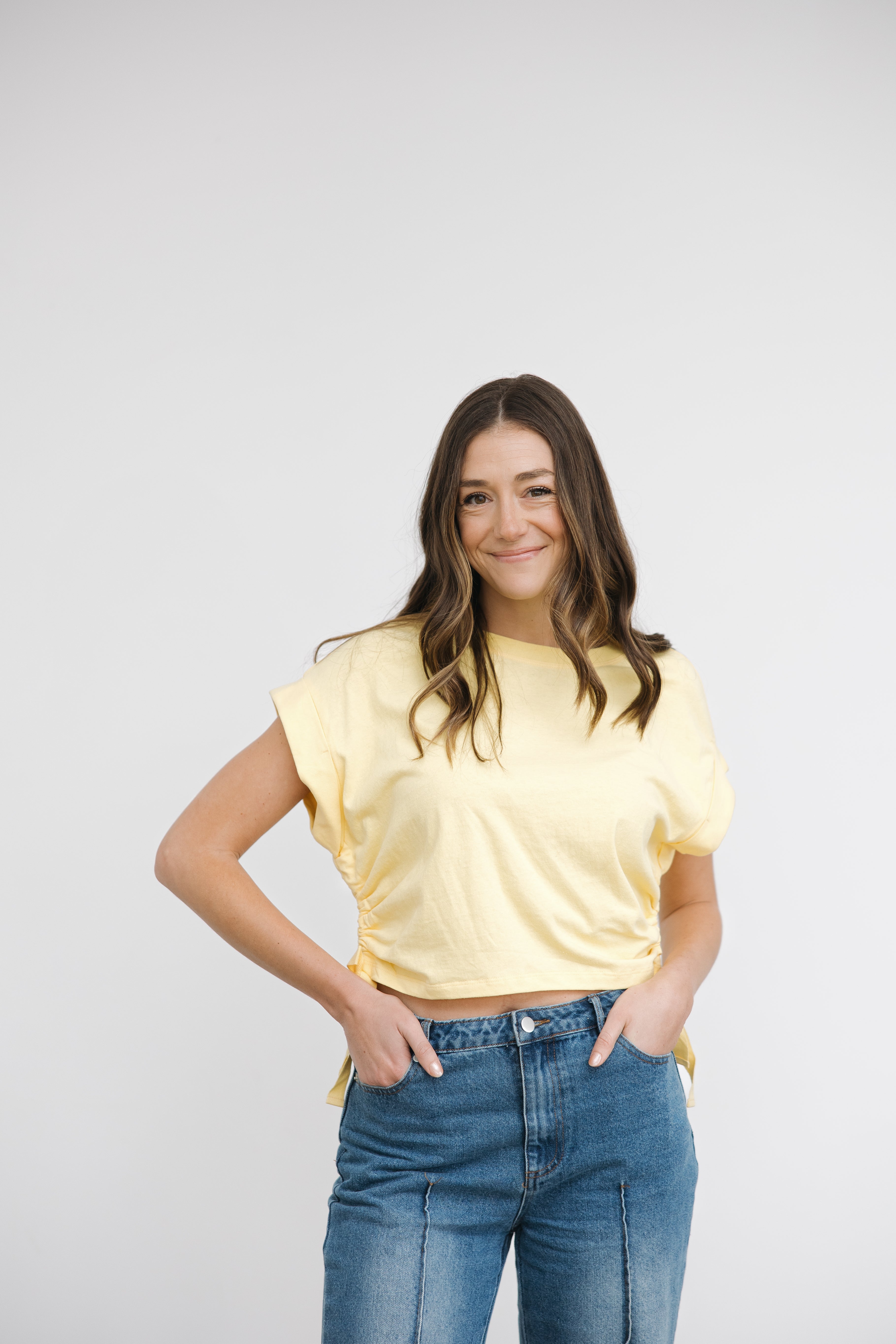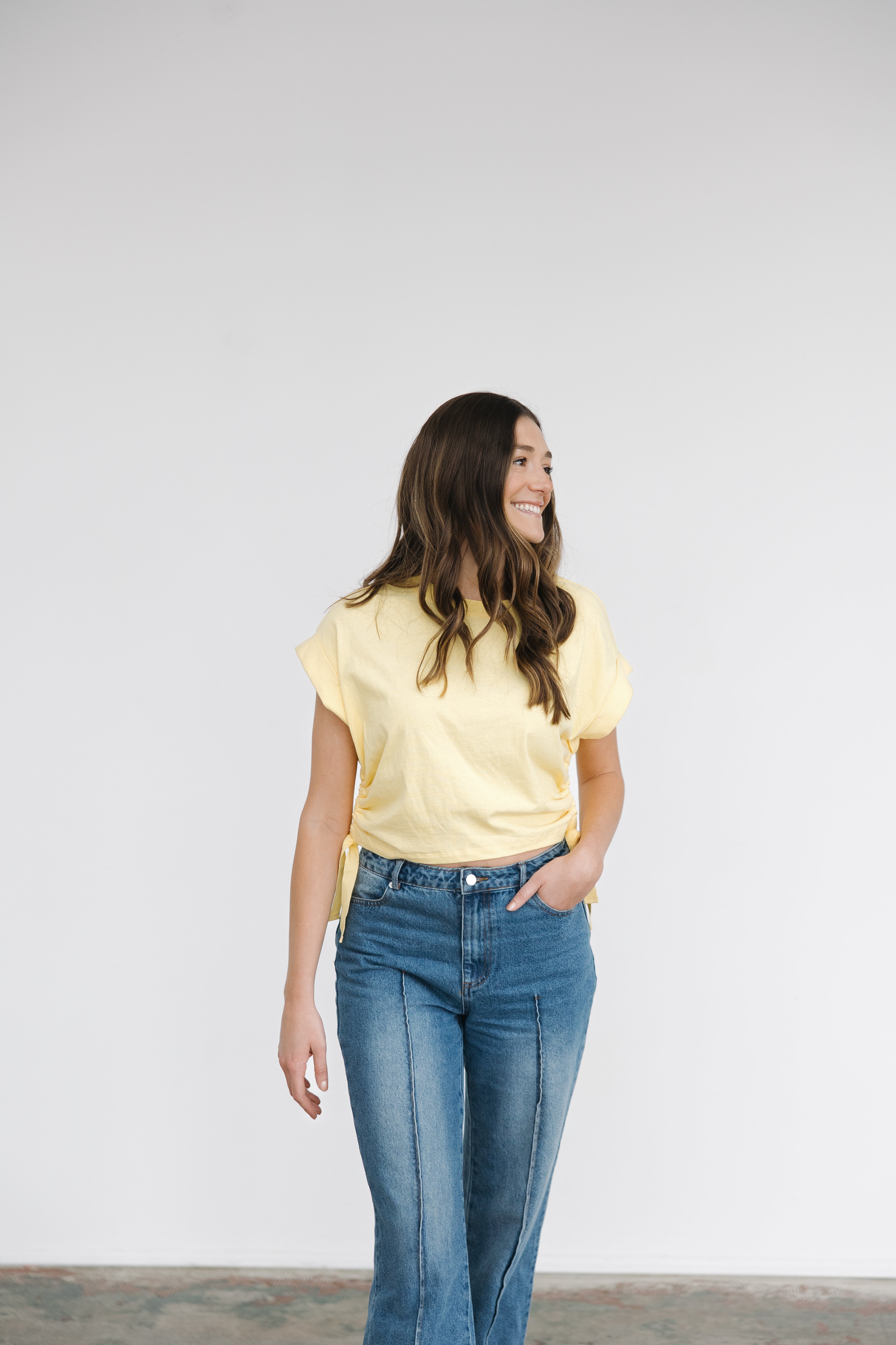 Upgrade your casual style with our Go To Side Scrunch Tee. This short sleeve crewneck tee features a playful rolled hem sleeve and side tie detail, adding a unique touch to your everyday look. Say goodbye to boring basics and hello to a quirky and fun wardrobe staple!