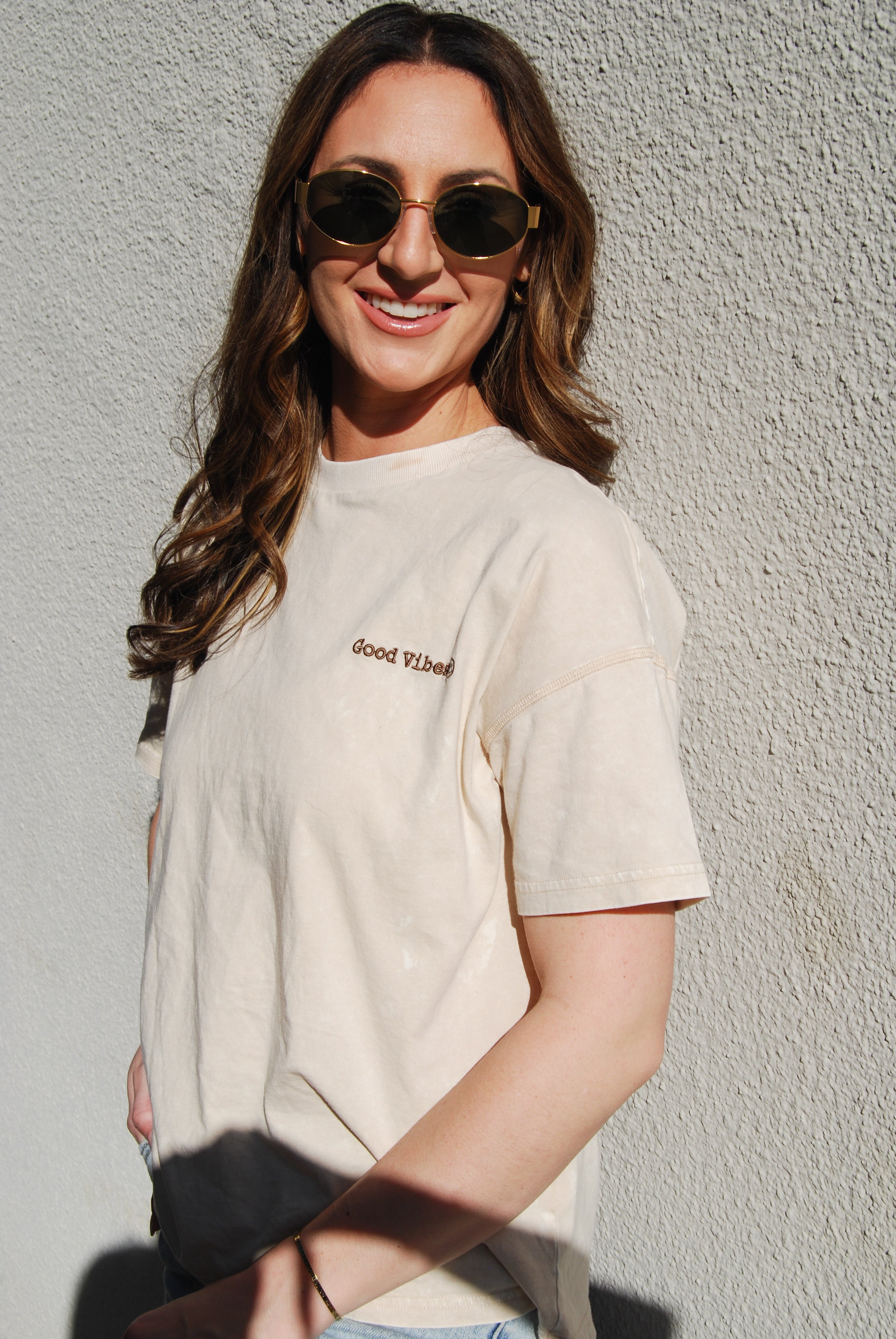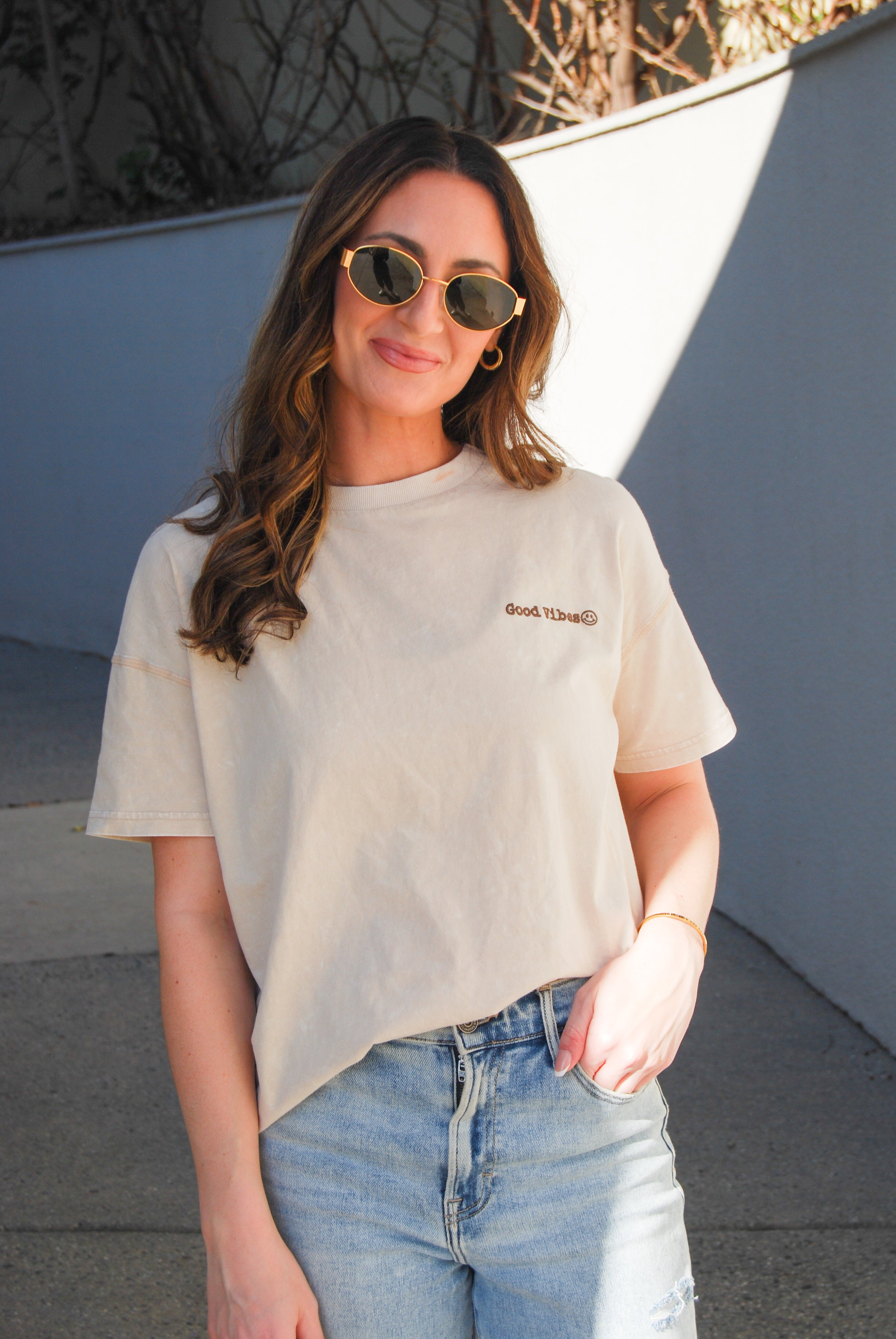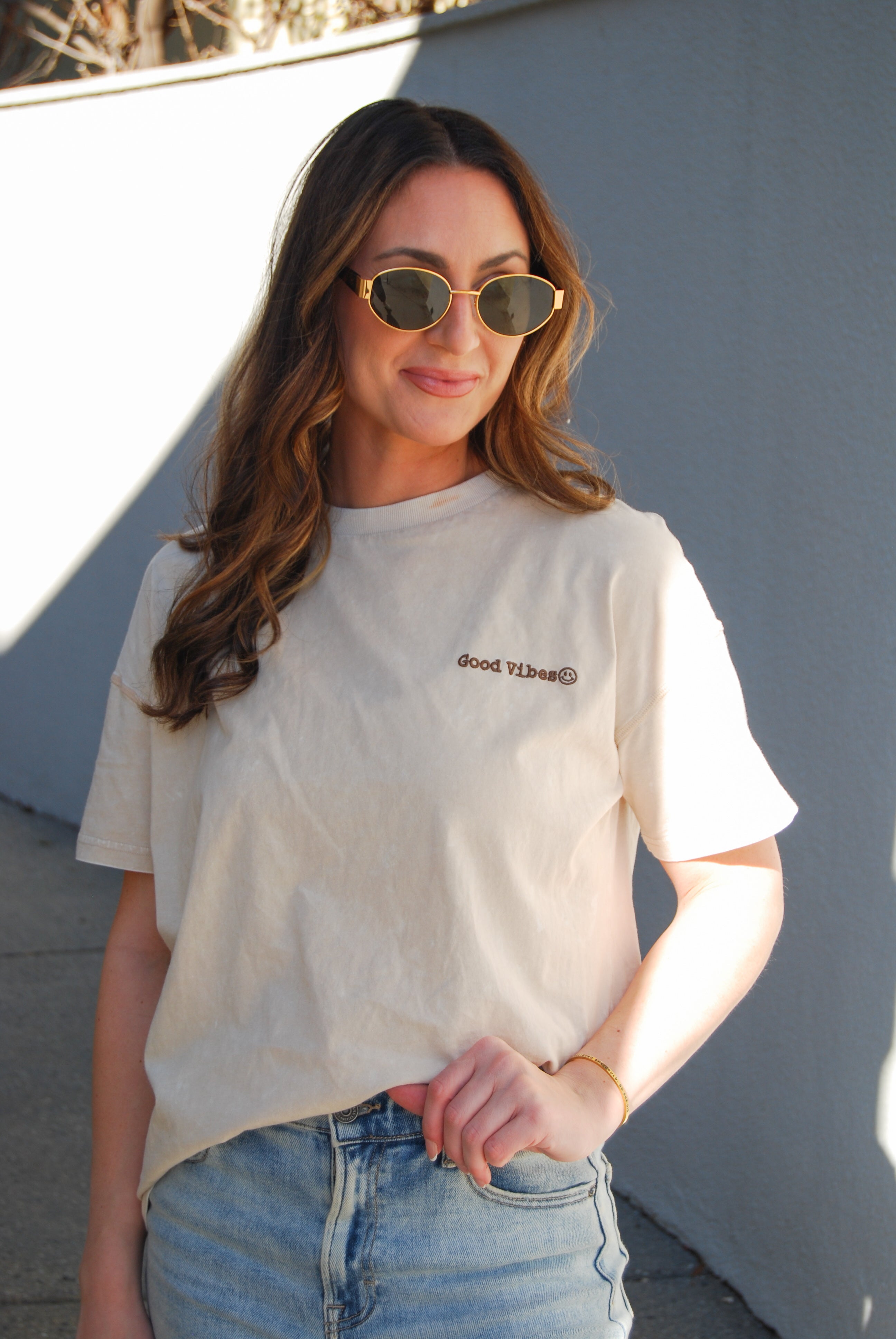 Elevate your casual look with our Good Vibes Tee! This whitewashed relaxed fit tee features playful embroidery that will keep you feeling positive all day long. Perfect for adding a touch of happy to your wardrobe.