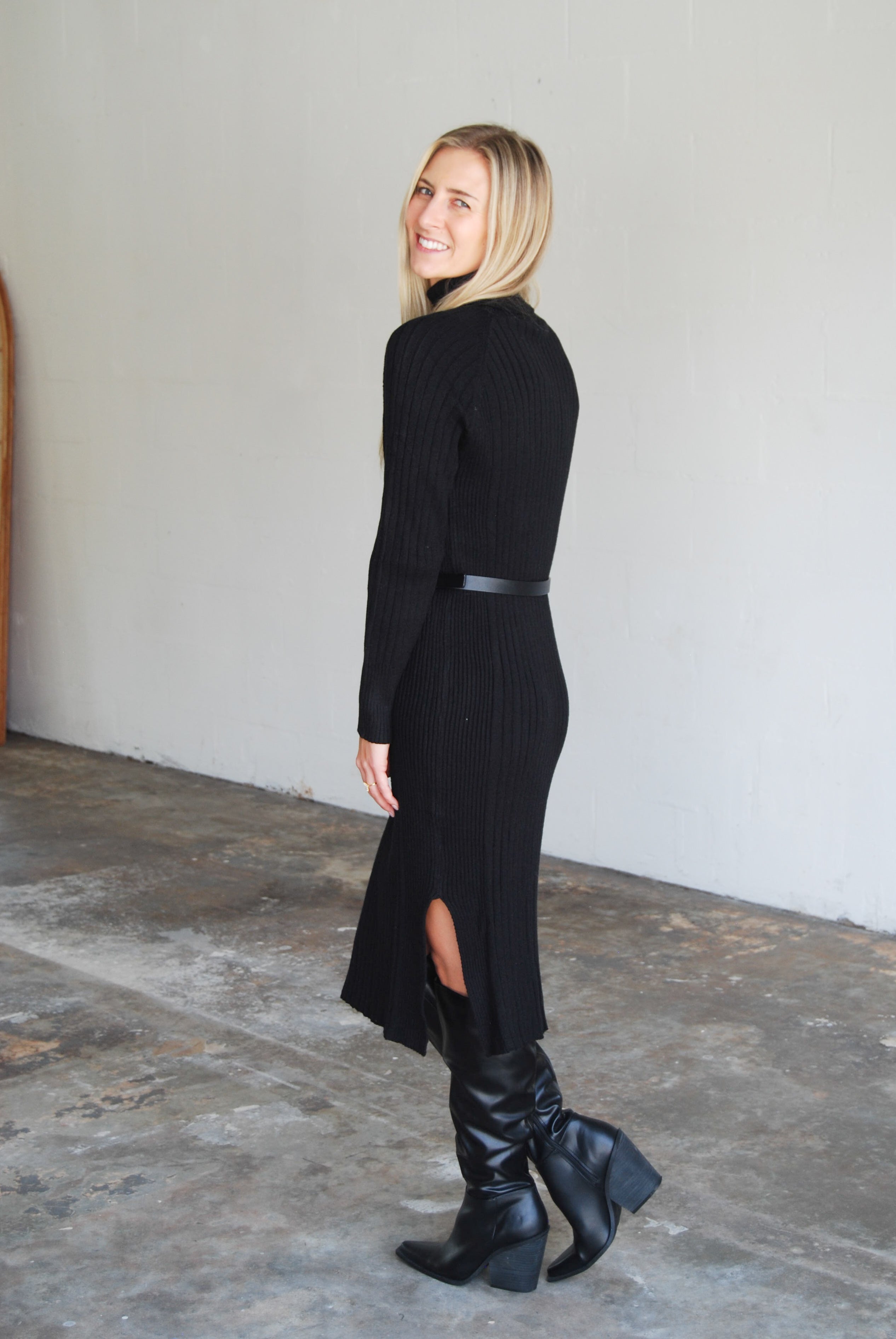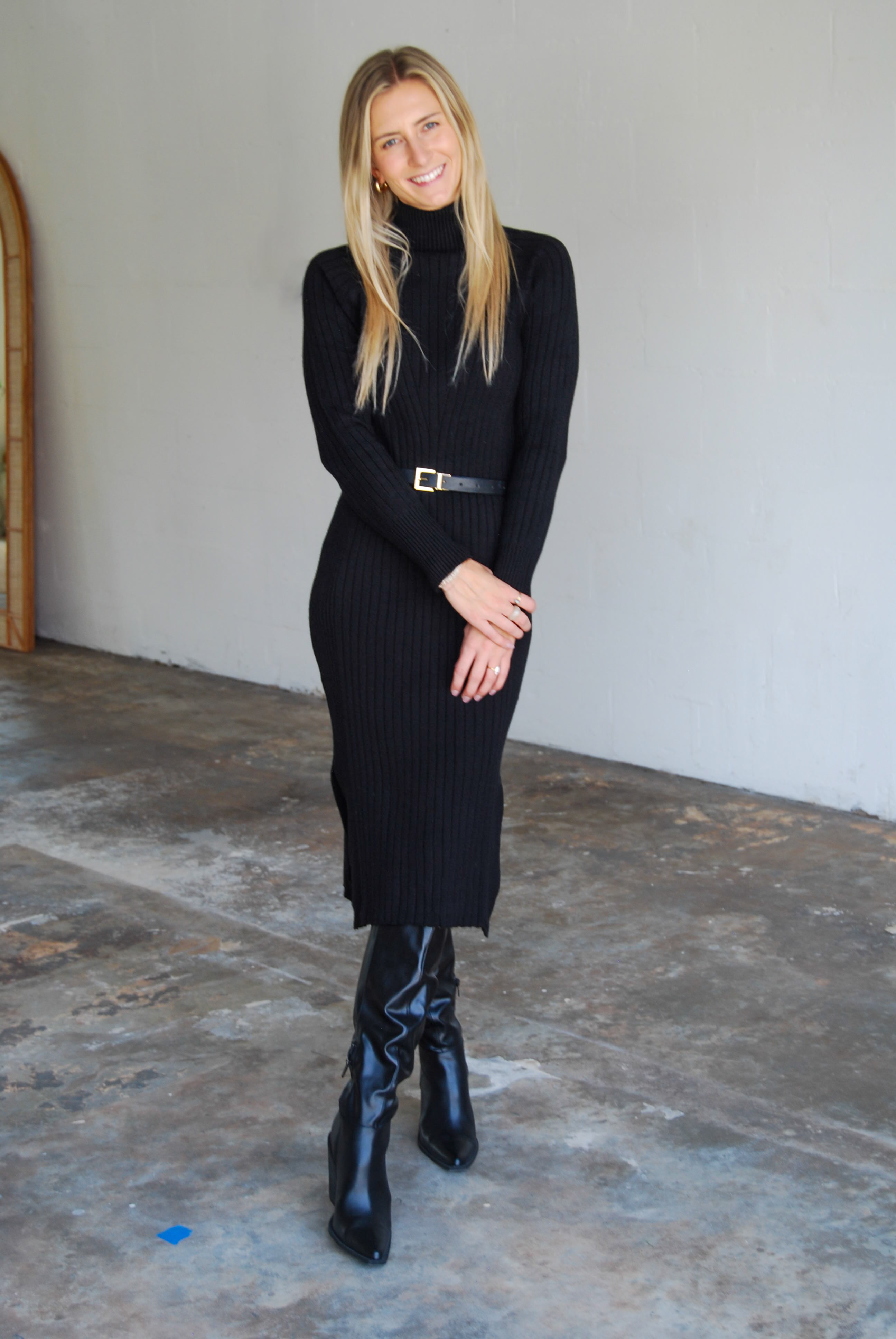 This buttery soft midi turtleneck dress is the ultimate winter wardrobe staple! With beautiful ribbing detail and a small side slit this dress is true stylish comfort.