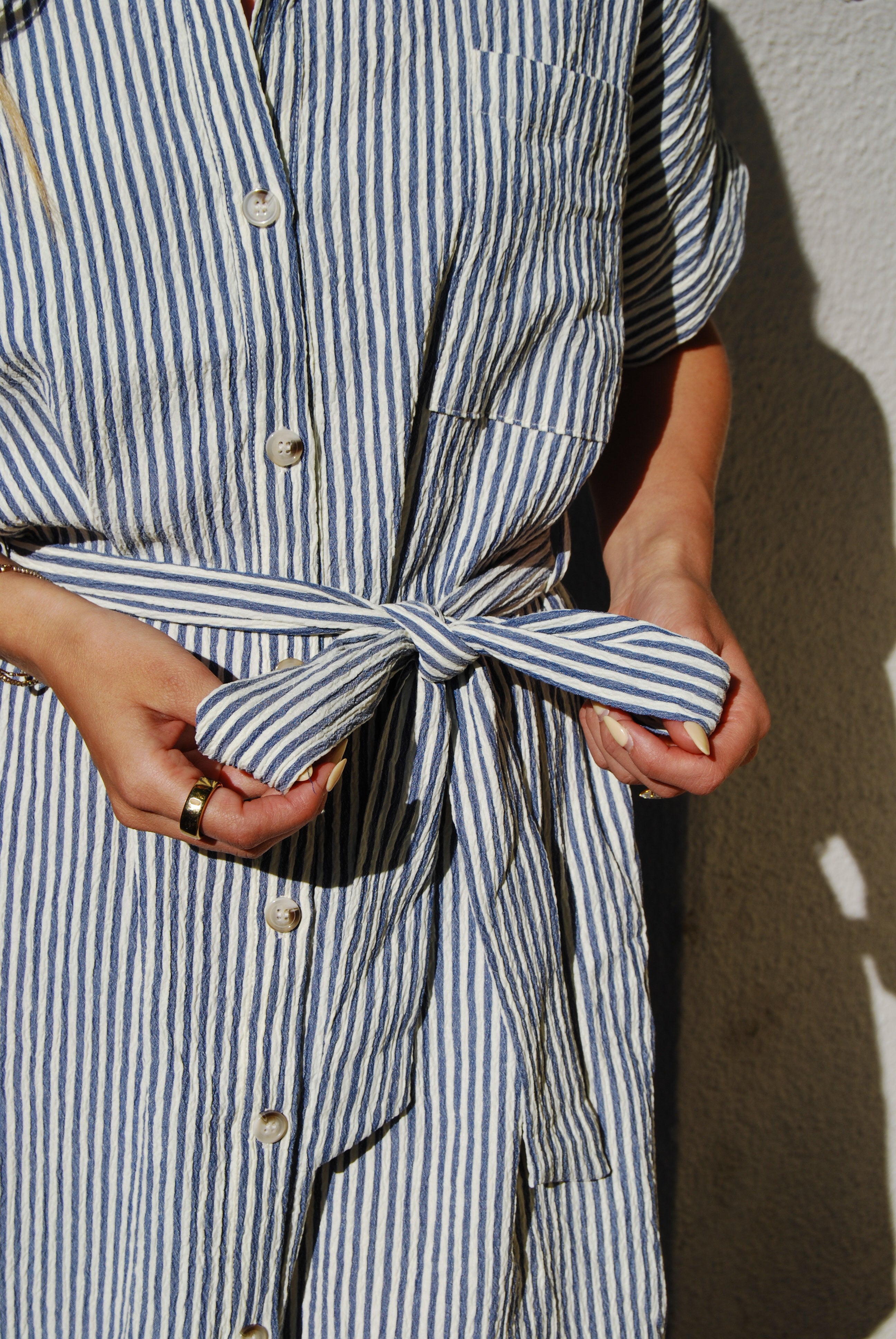 Get ready to breeze through your day with the In The Breeze Dress! This lightweight, striped shirt dress features a removable belt and front buttons for an effortless yet stylish look. Swap out the tie belt for a leather or woven one for an elevated look! Perfect for any occasion, this dress will have you feeling comfortable and chic.