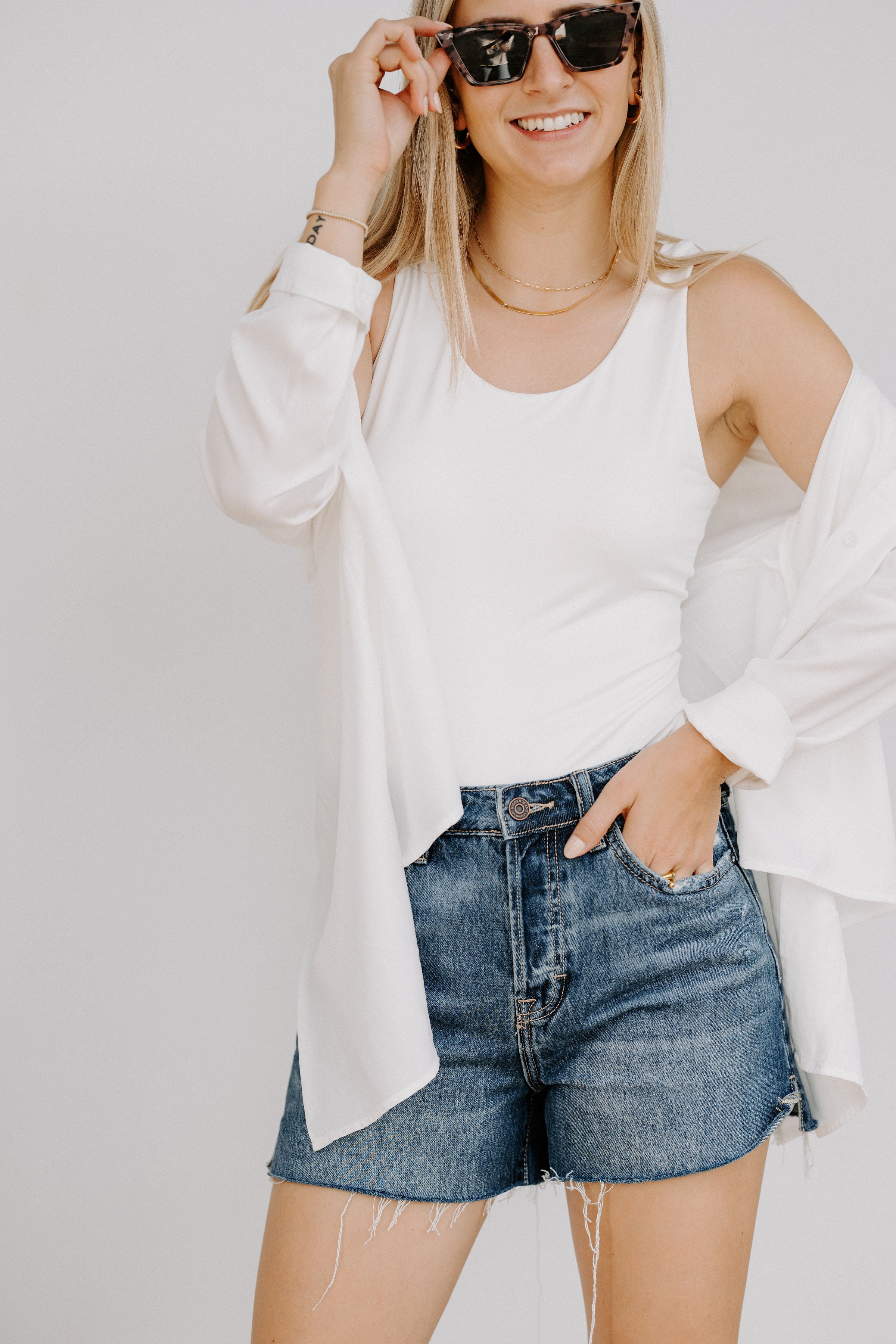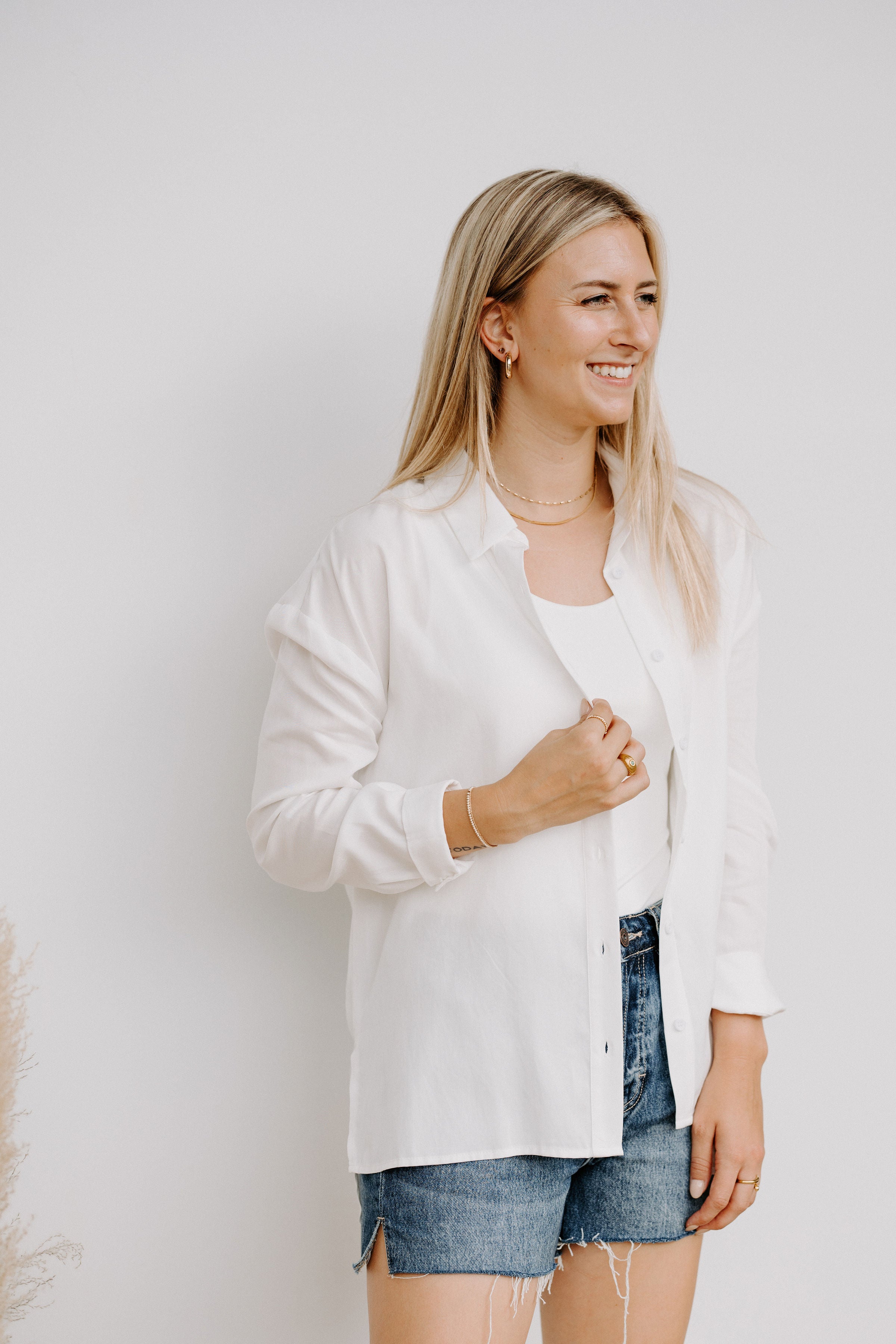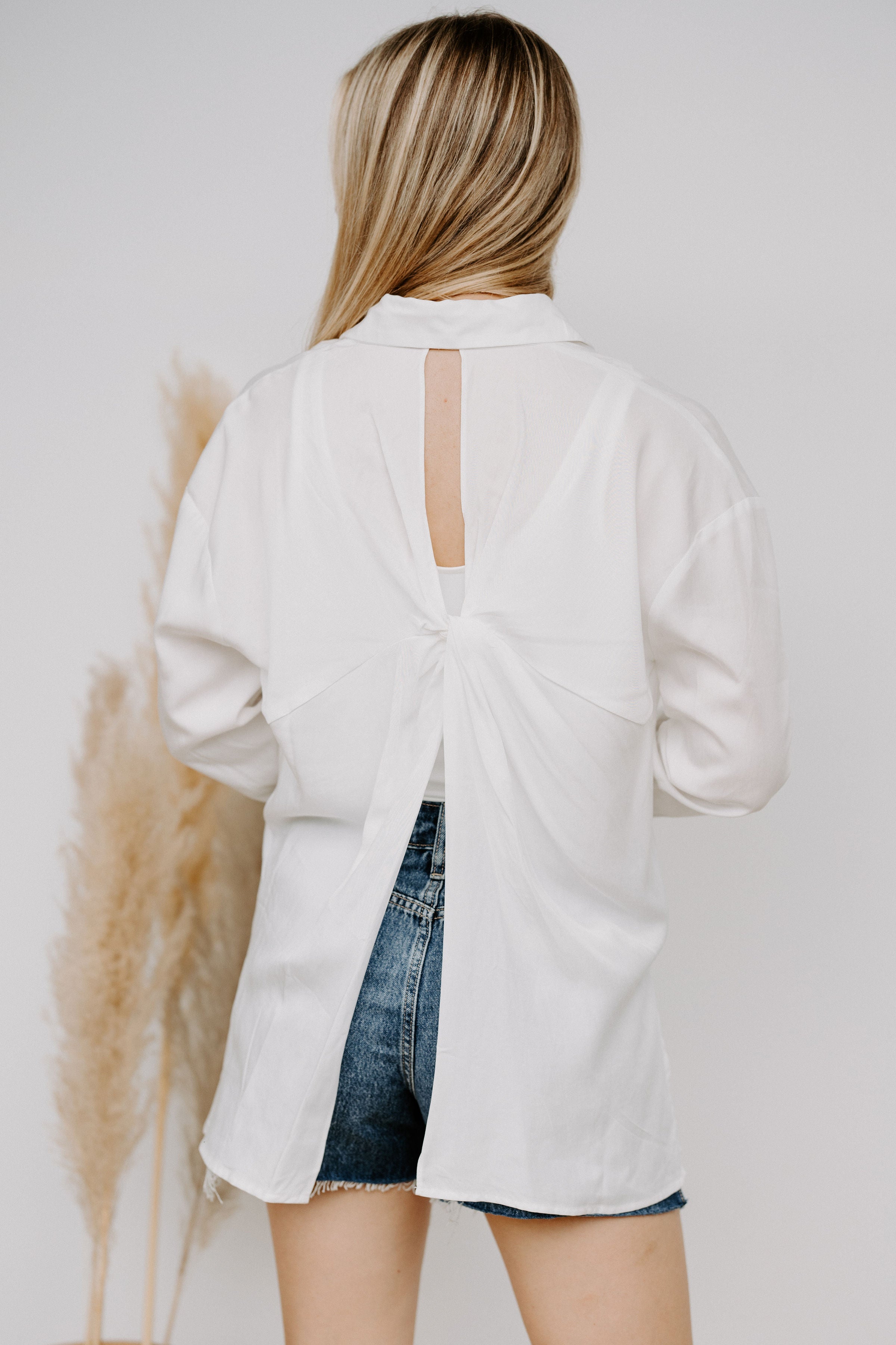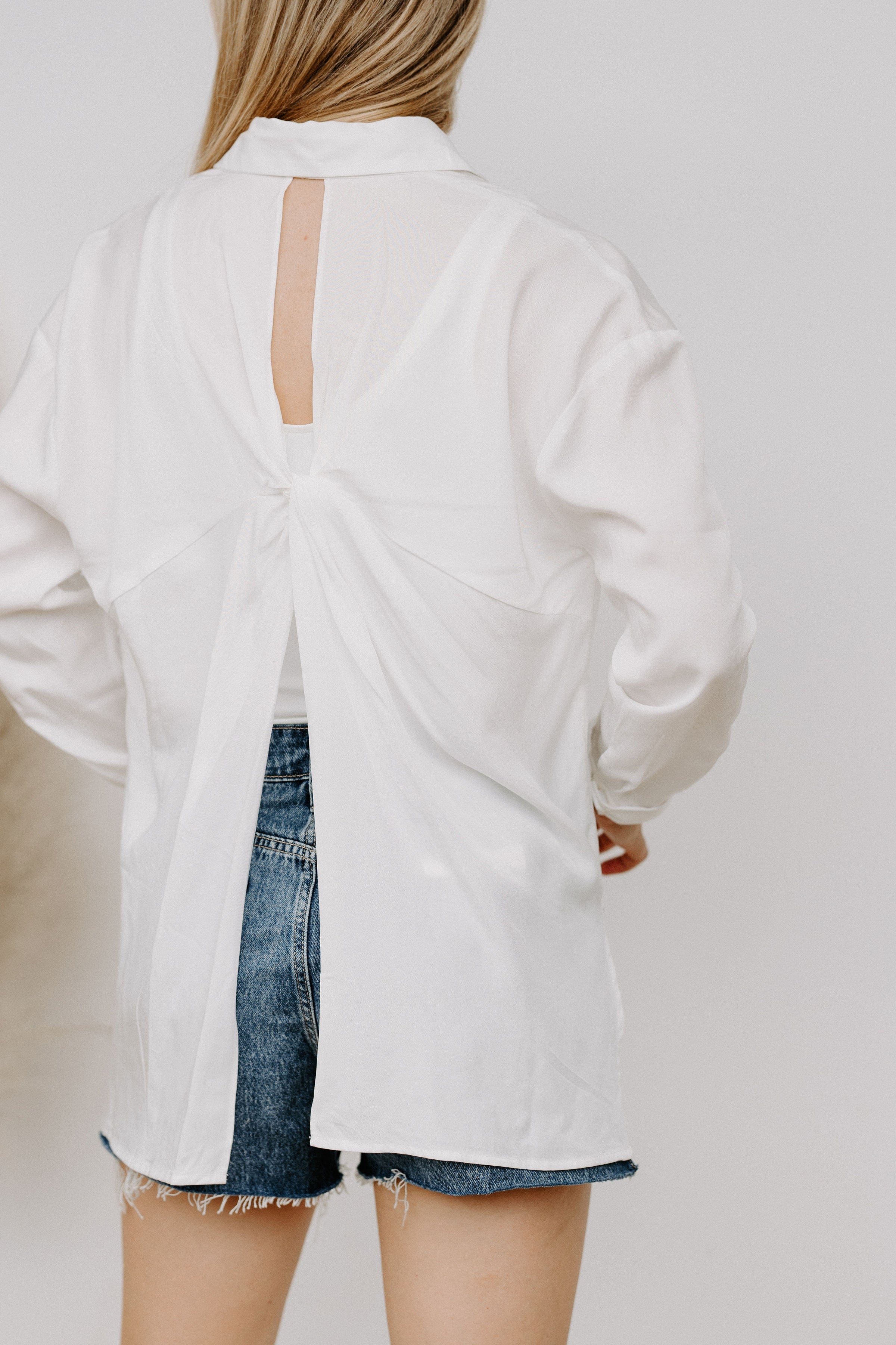 The Island Breeze Button-Up is a fun twist on a classic style. This high-quality white button-up features an open back with a super fun twist detail. We love that this can be dressed up or down but is still a timeless style that will last for many seasons.