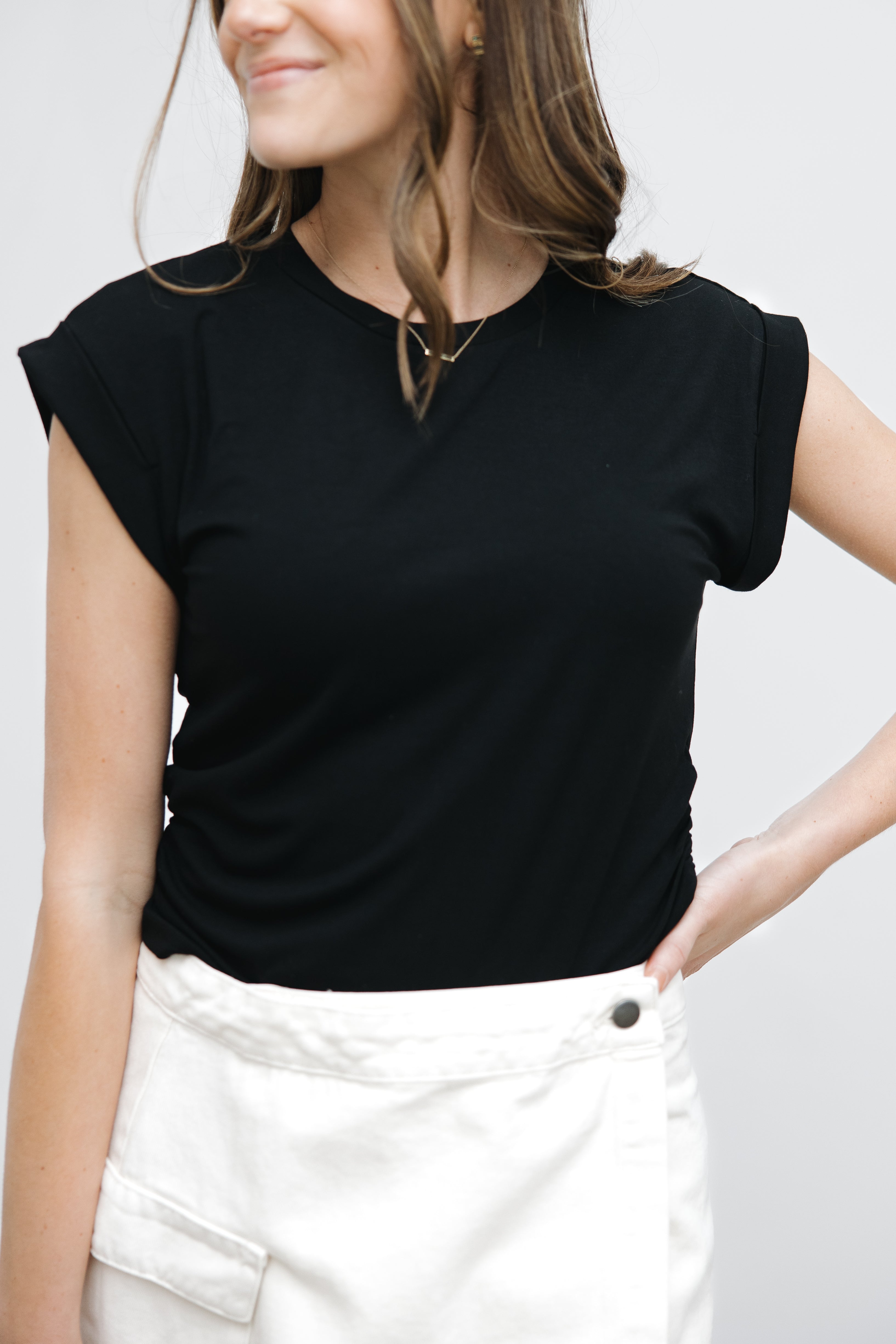 Get ready to upgrade your t-shirt game with the Its A Must Tee! Made from buttery soft fabric, this tee features side cinching detail and rolled sleeves for a stylish touch. You won't want to take this comfy and chic tee off!