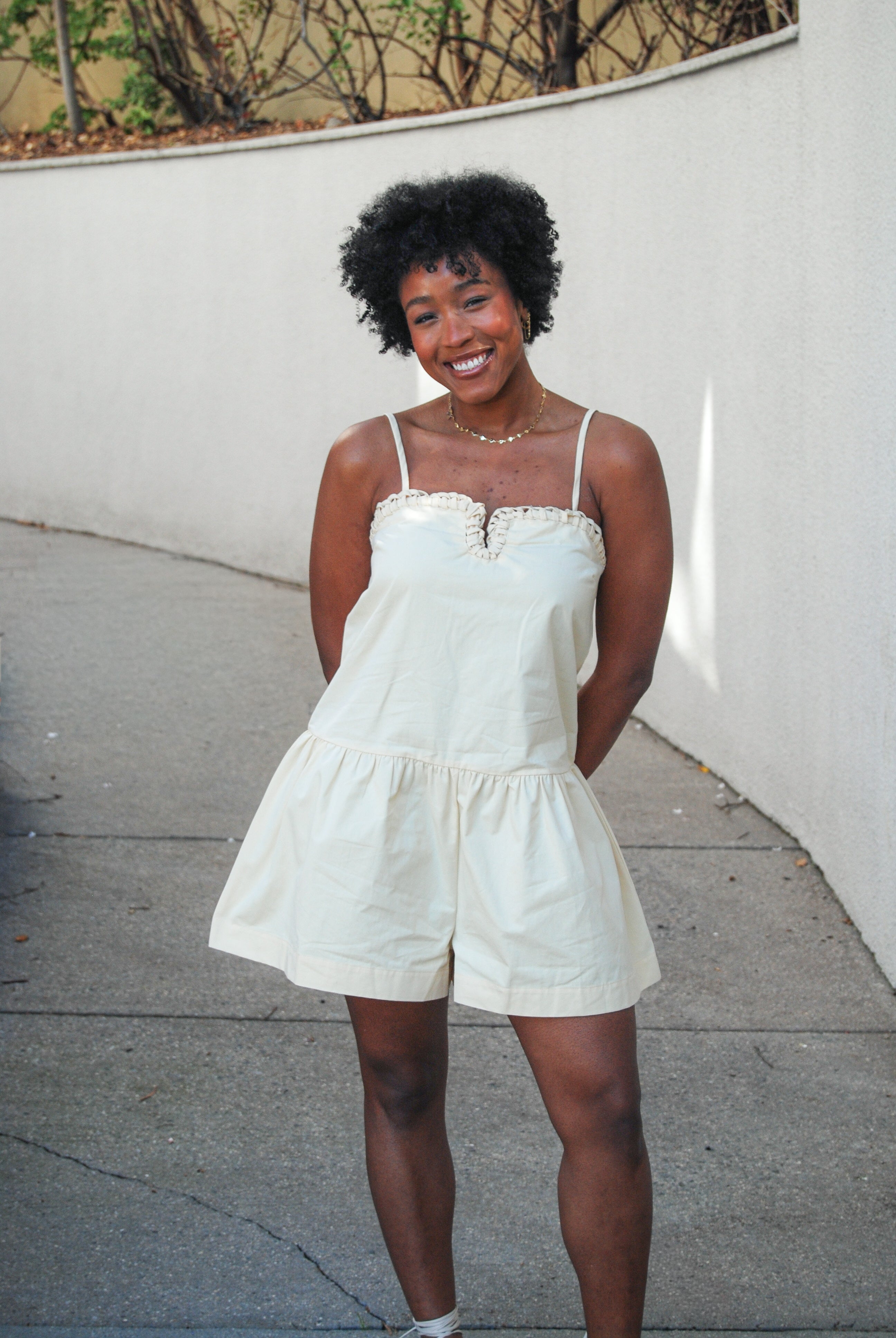 Slip into pure sunshine with the Undeniably Joyful romper that's basically a hug you can wear. The tiered silhouette and gentle A-line flare create an effortlessly chic vibe, while the ruffled neckline and delicate spaghetti straps add just the right touch of feminine flair. Fully lined for comfort, complete with a hidden back zipper, and crafted from 100% cotton that feels as good as it looks. One piece, endless possibilities—because getting dressed should feel like joy.