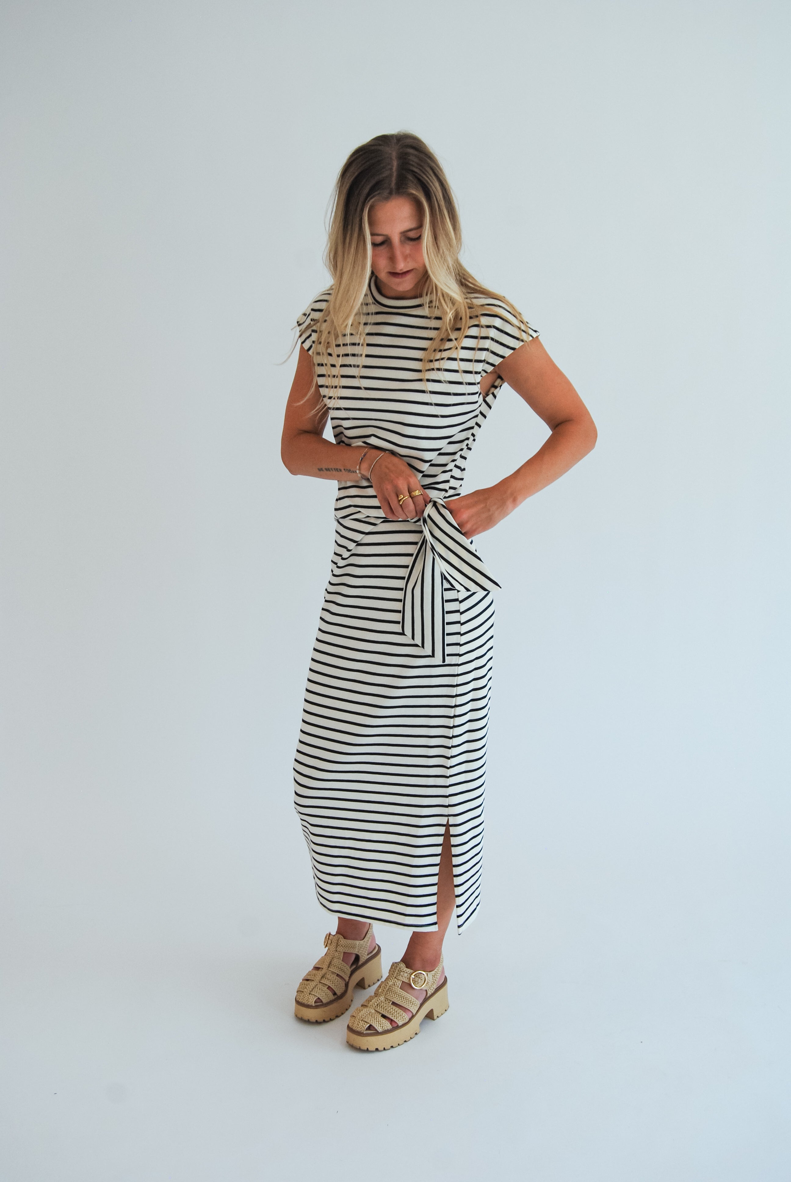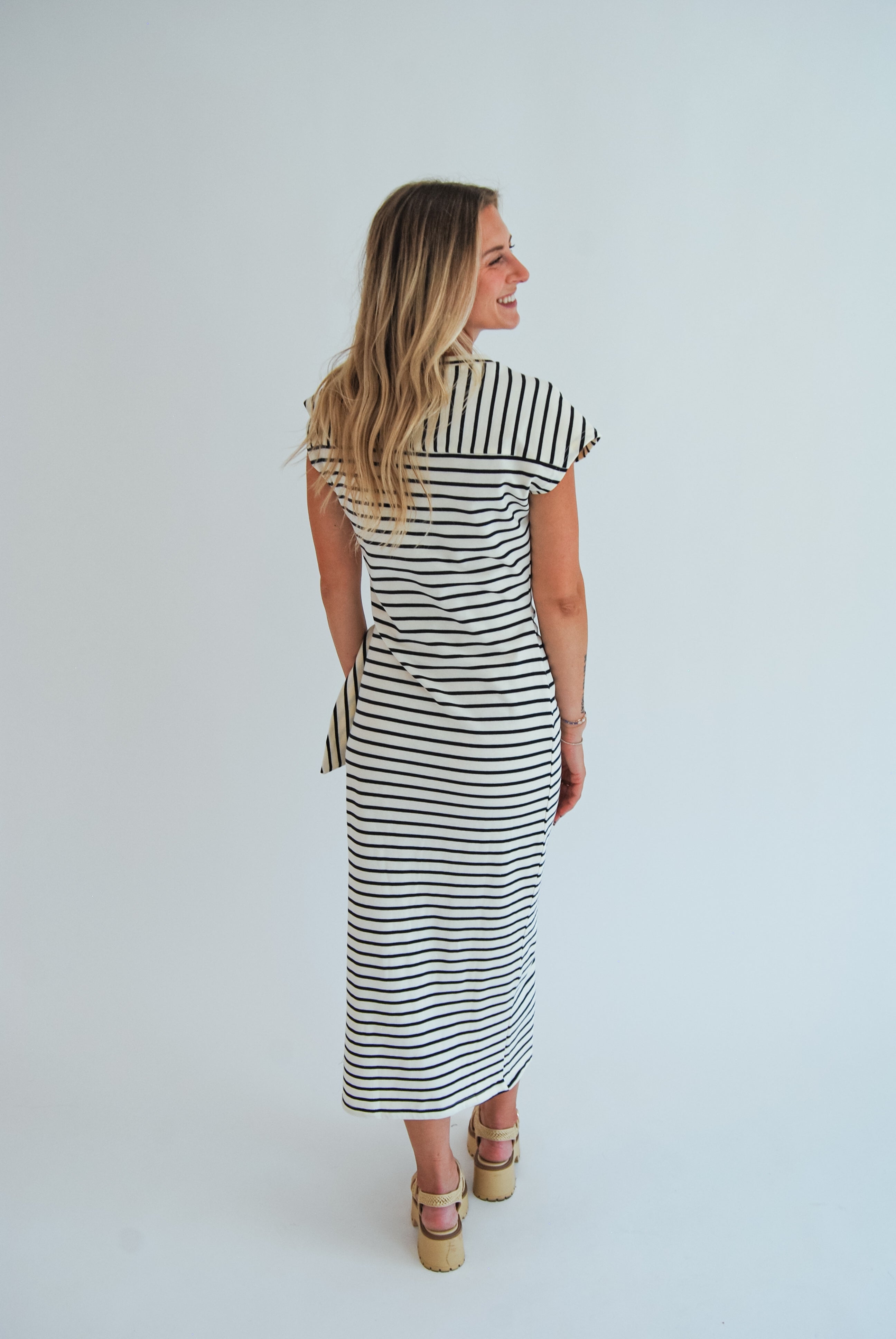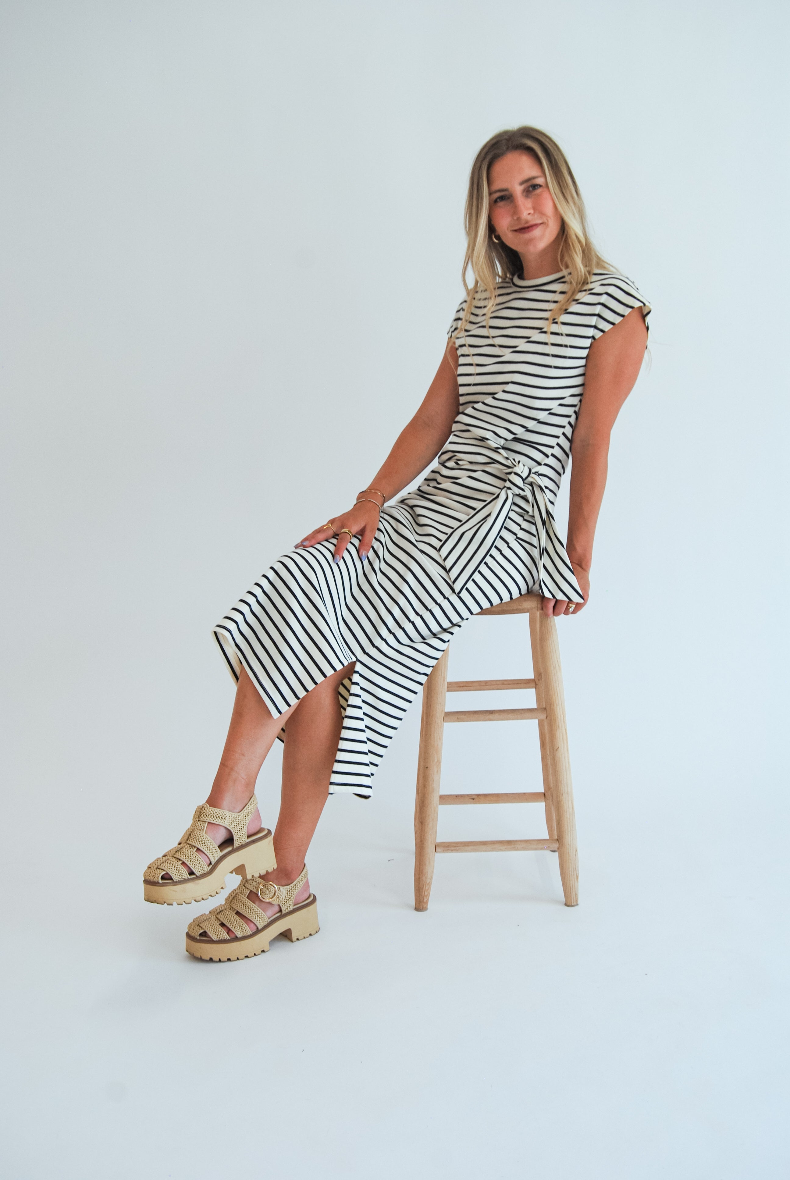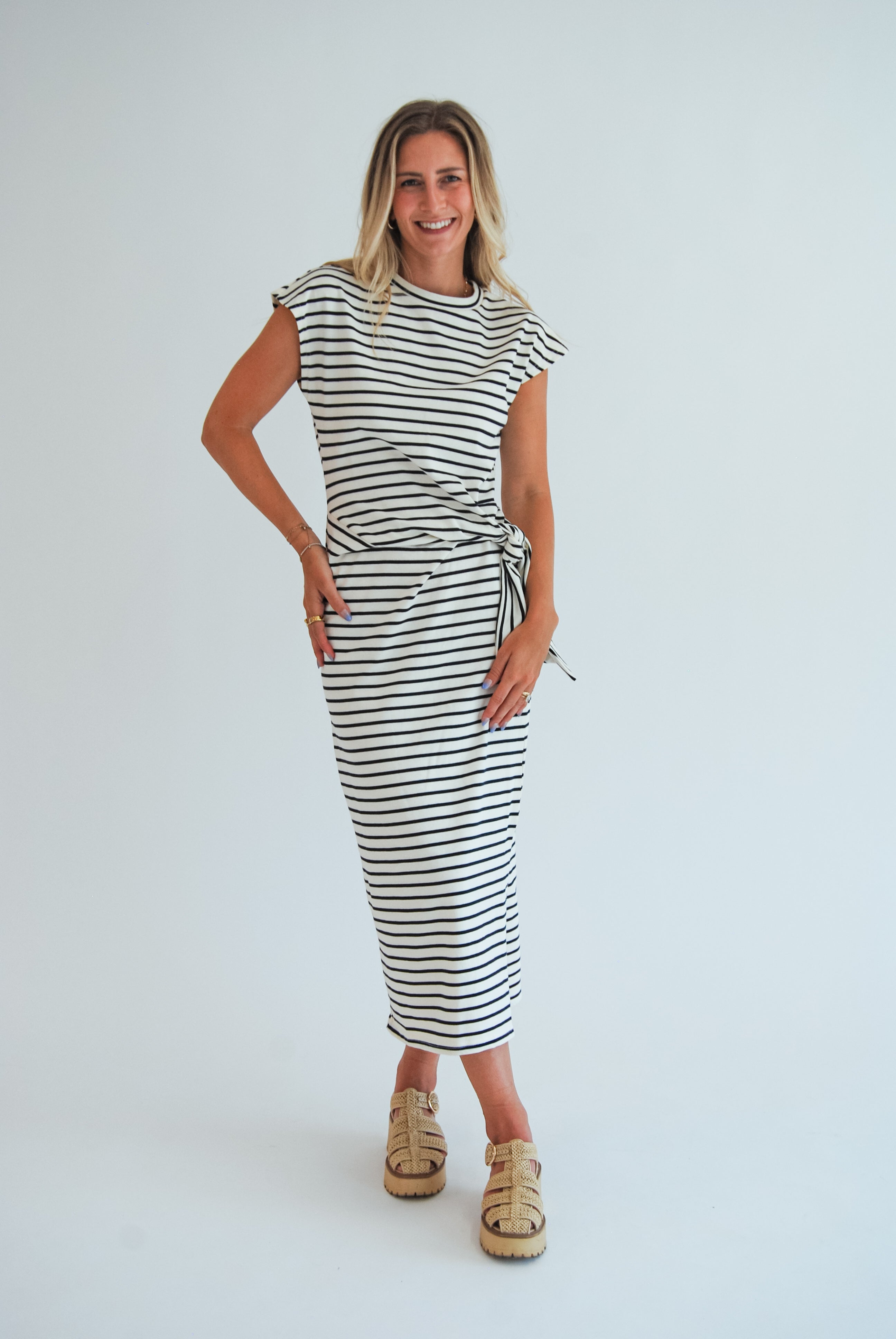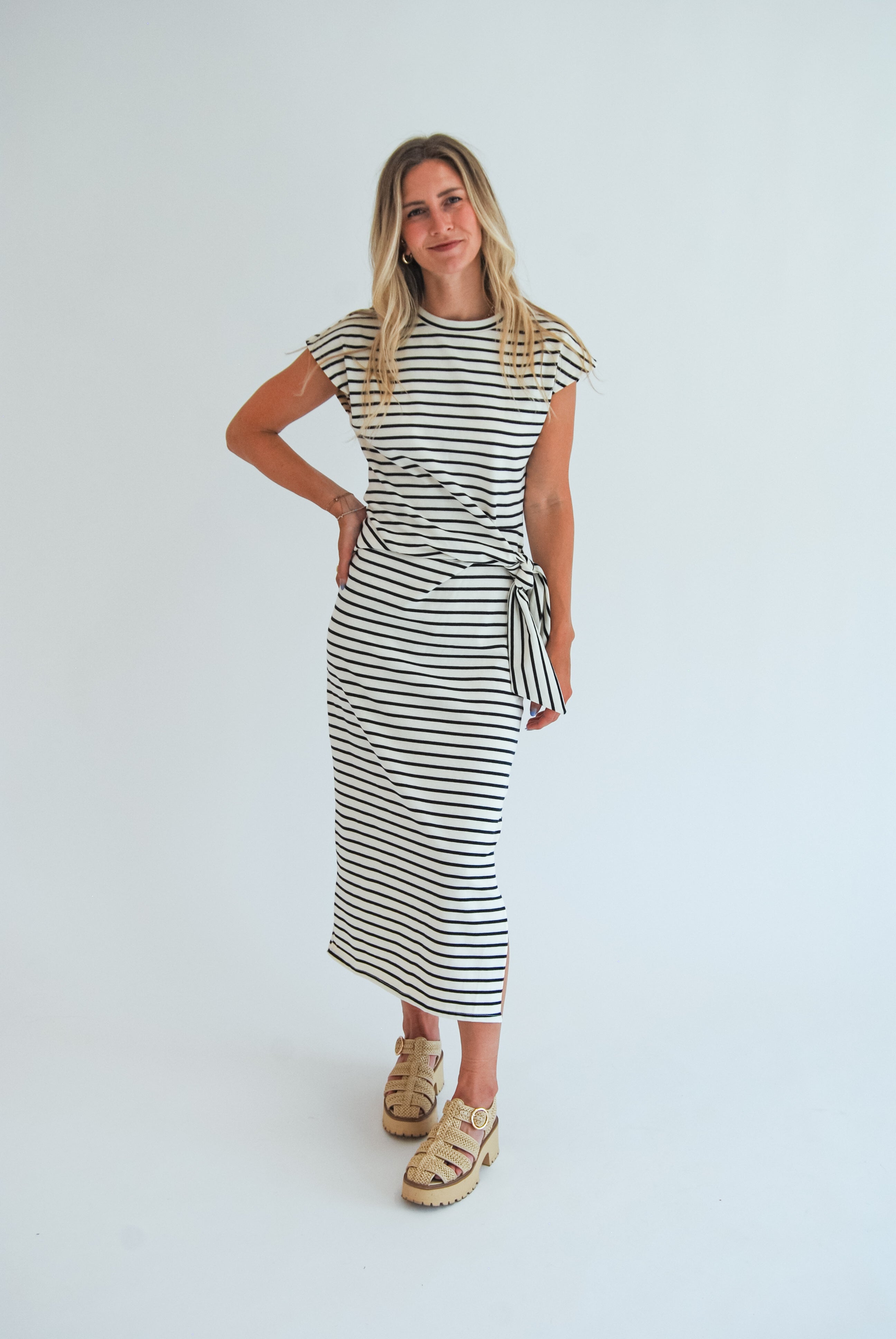 Step out in style with the Locked In Dress, featuring playful stripes and a charming waist knot that flatters your figure. The side slit adds a flirty twist, making this midi dress perfect for fun-filled days and lively nights. Embrace effortless confidence wherever you go!