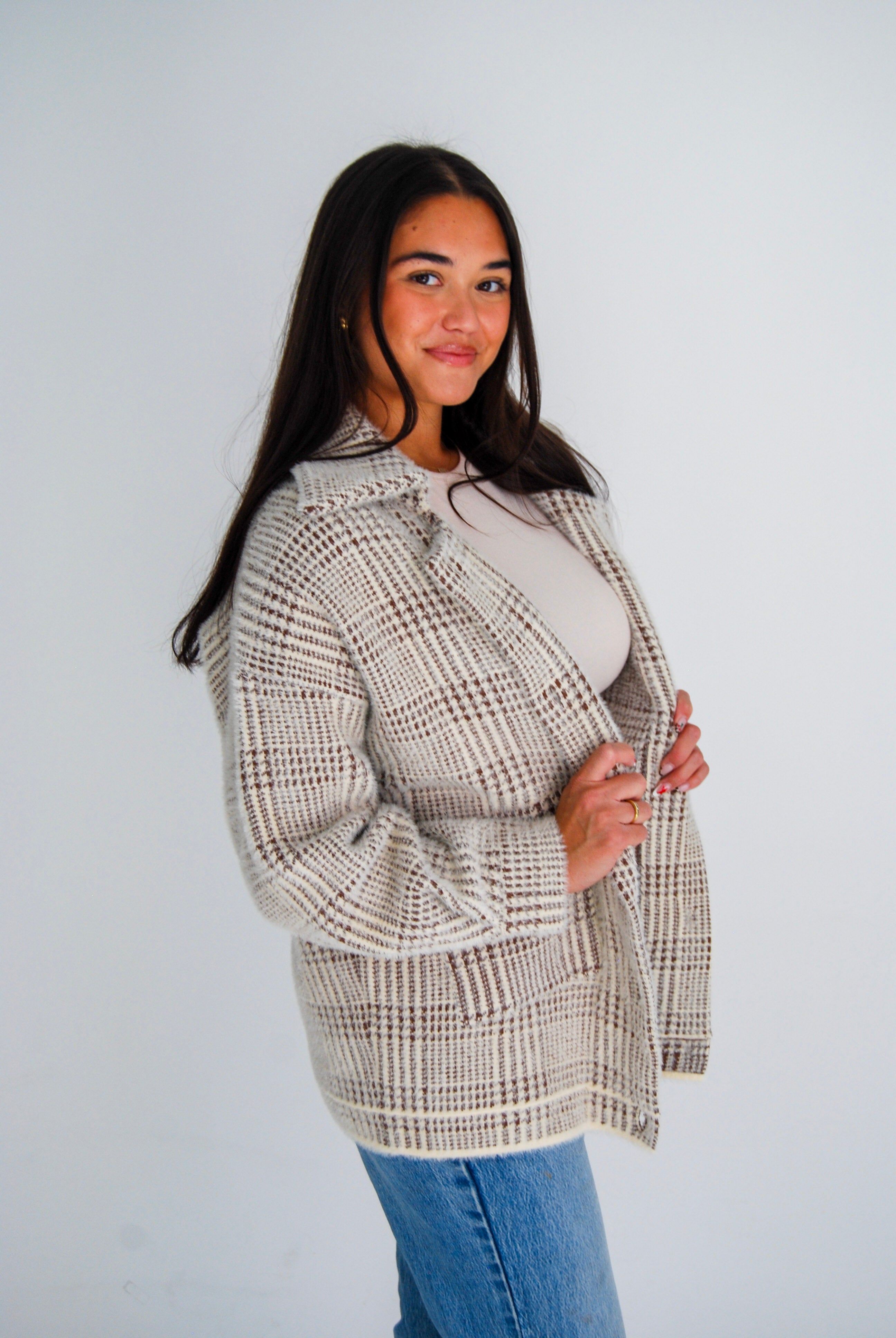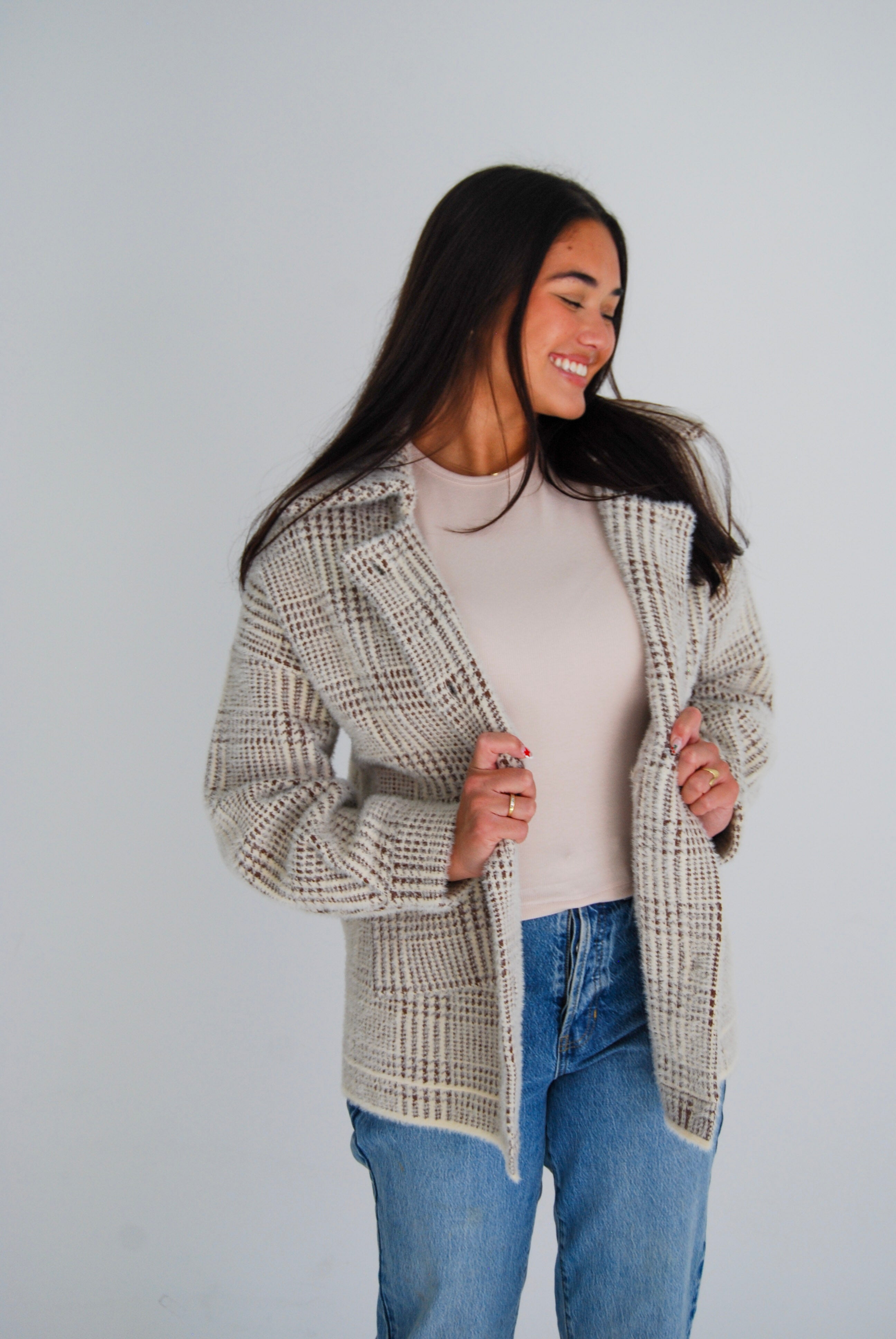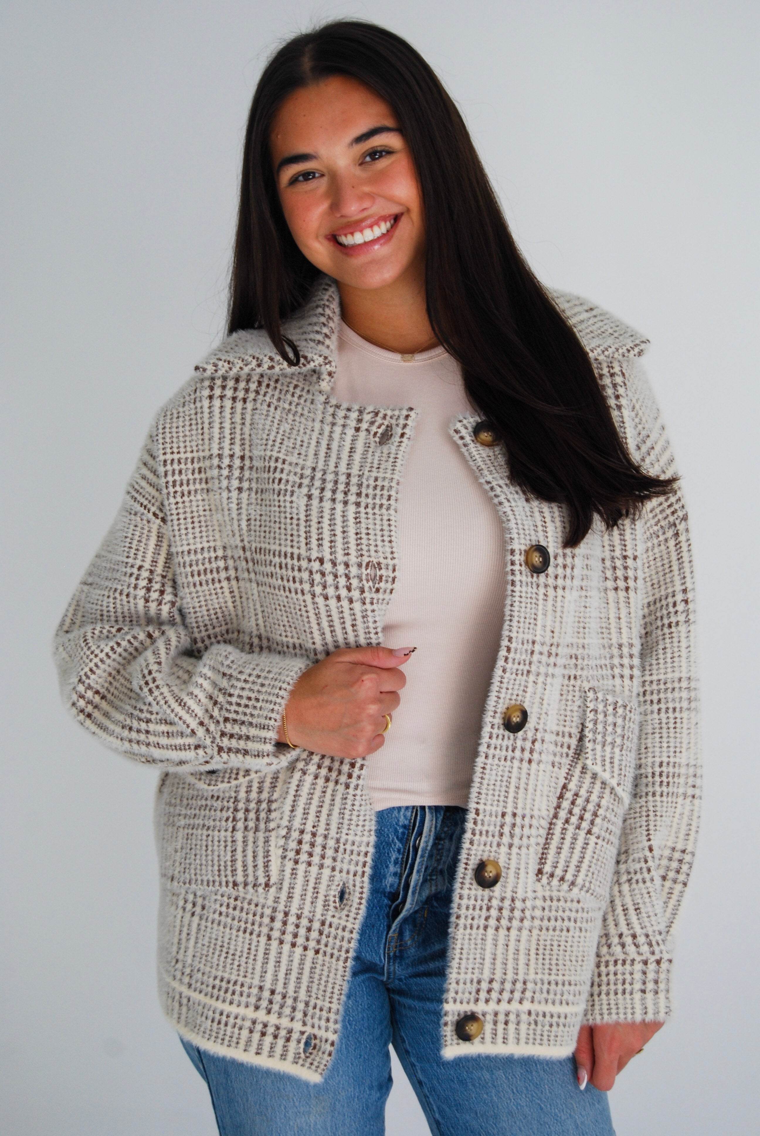 Wrap yourself in cozy charm with the Lola Plaid Shacket. This fuzzy, blanket-soft shacket features a classic collar and is the perfect layer for those chilly days when you want to stay warm without sacrificing style. Ideal for transitioning into colder months, it combines comfort and playful plaid for an effortlessly cool look.