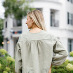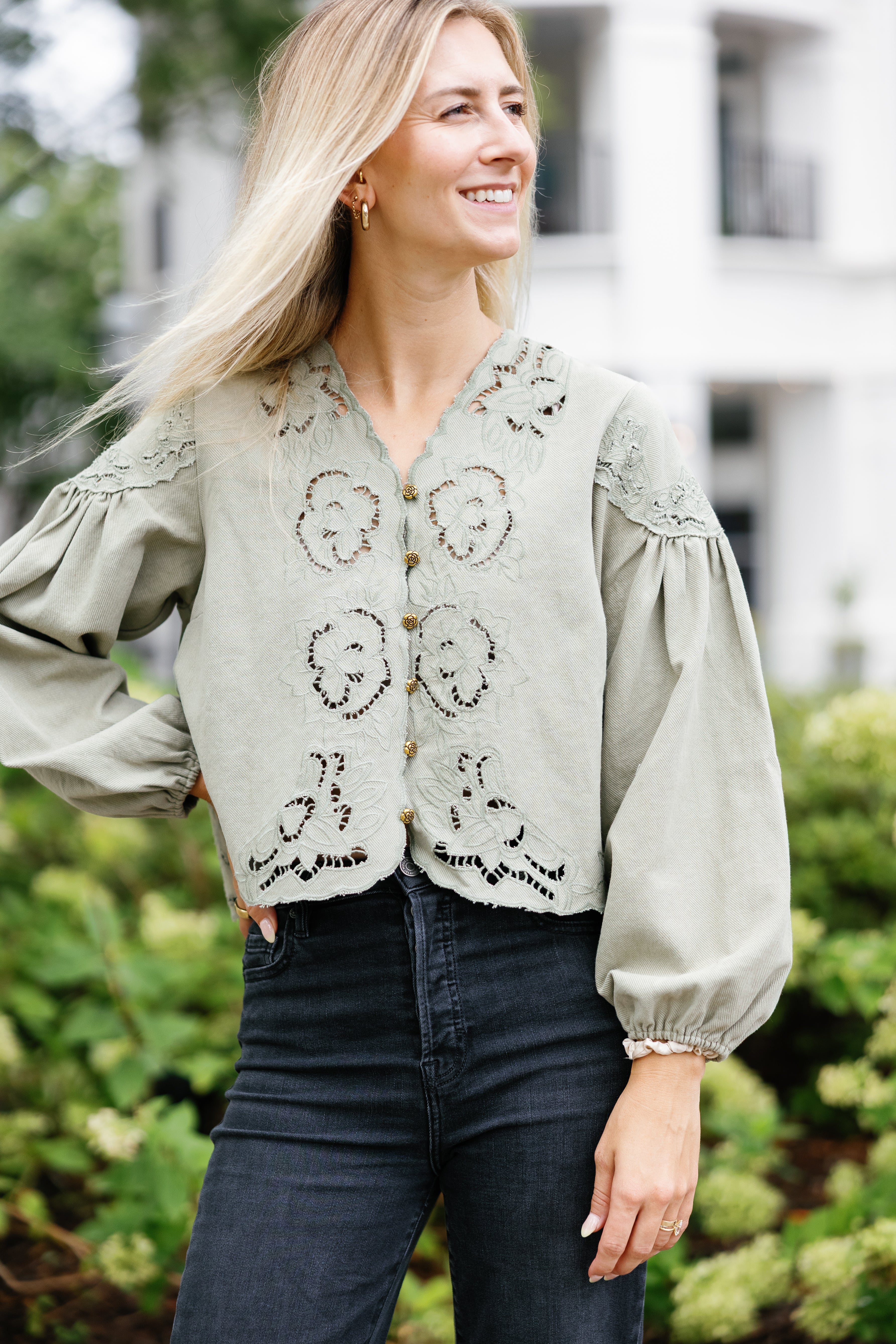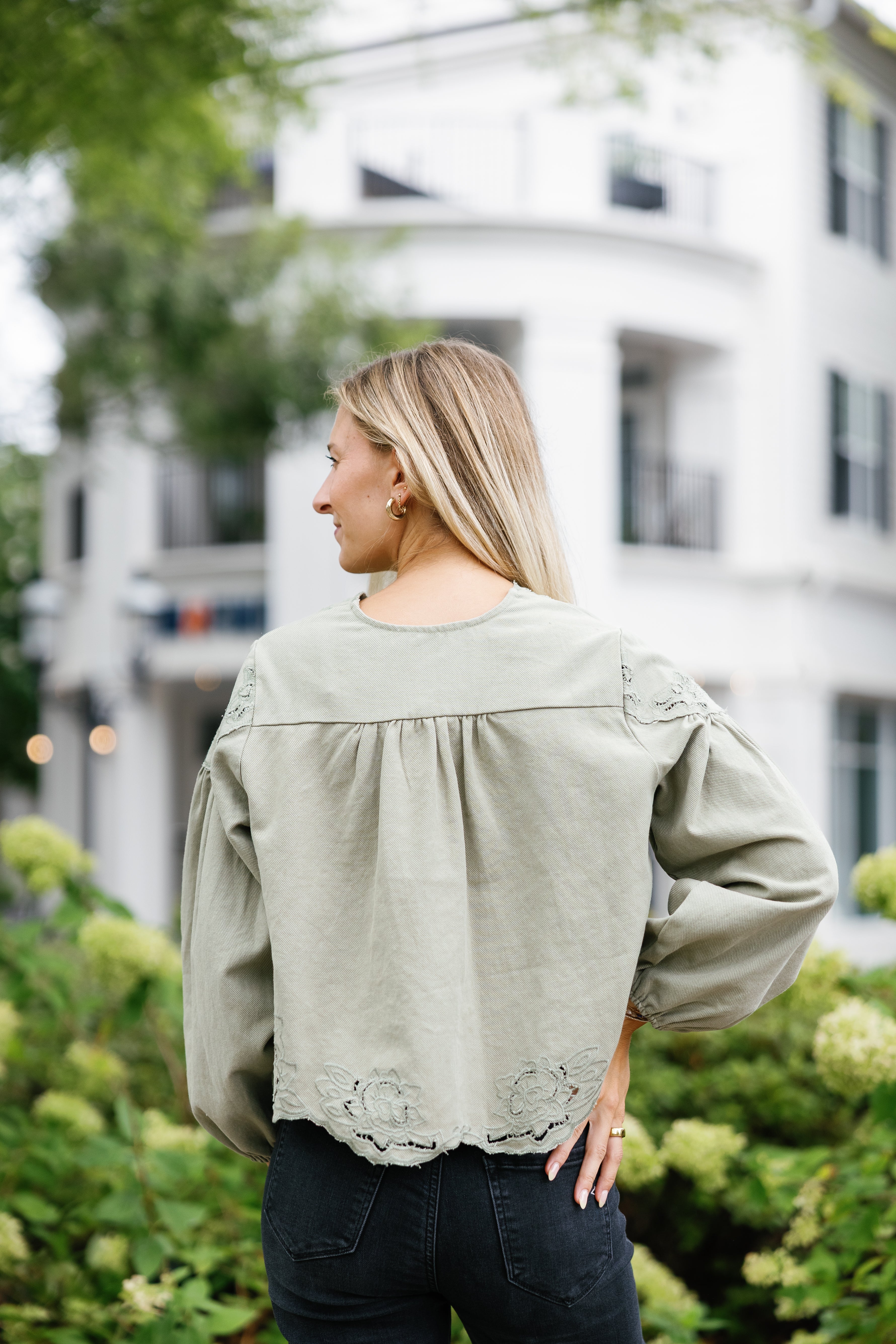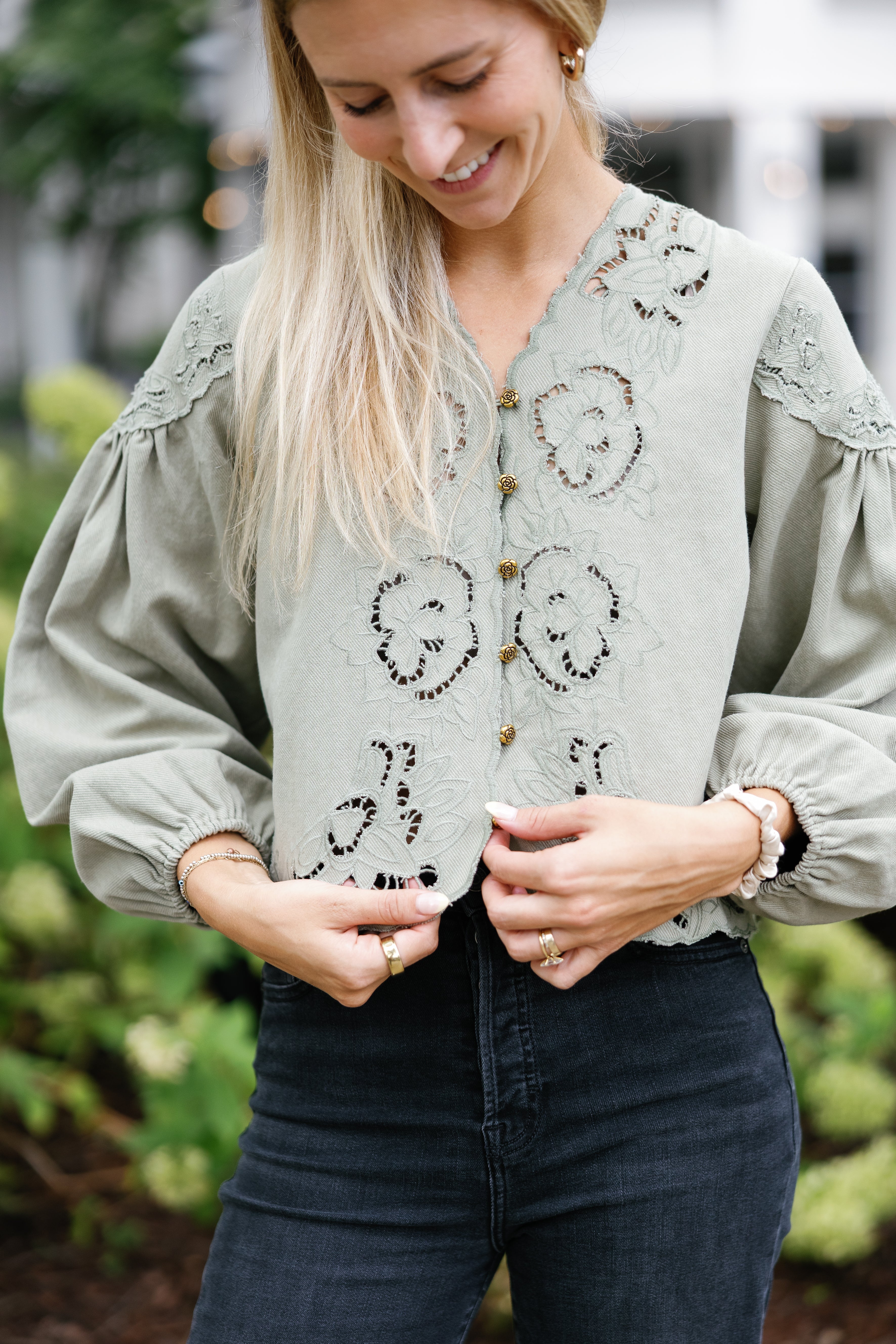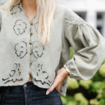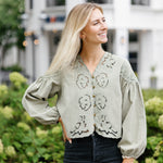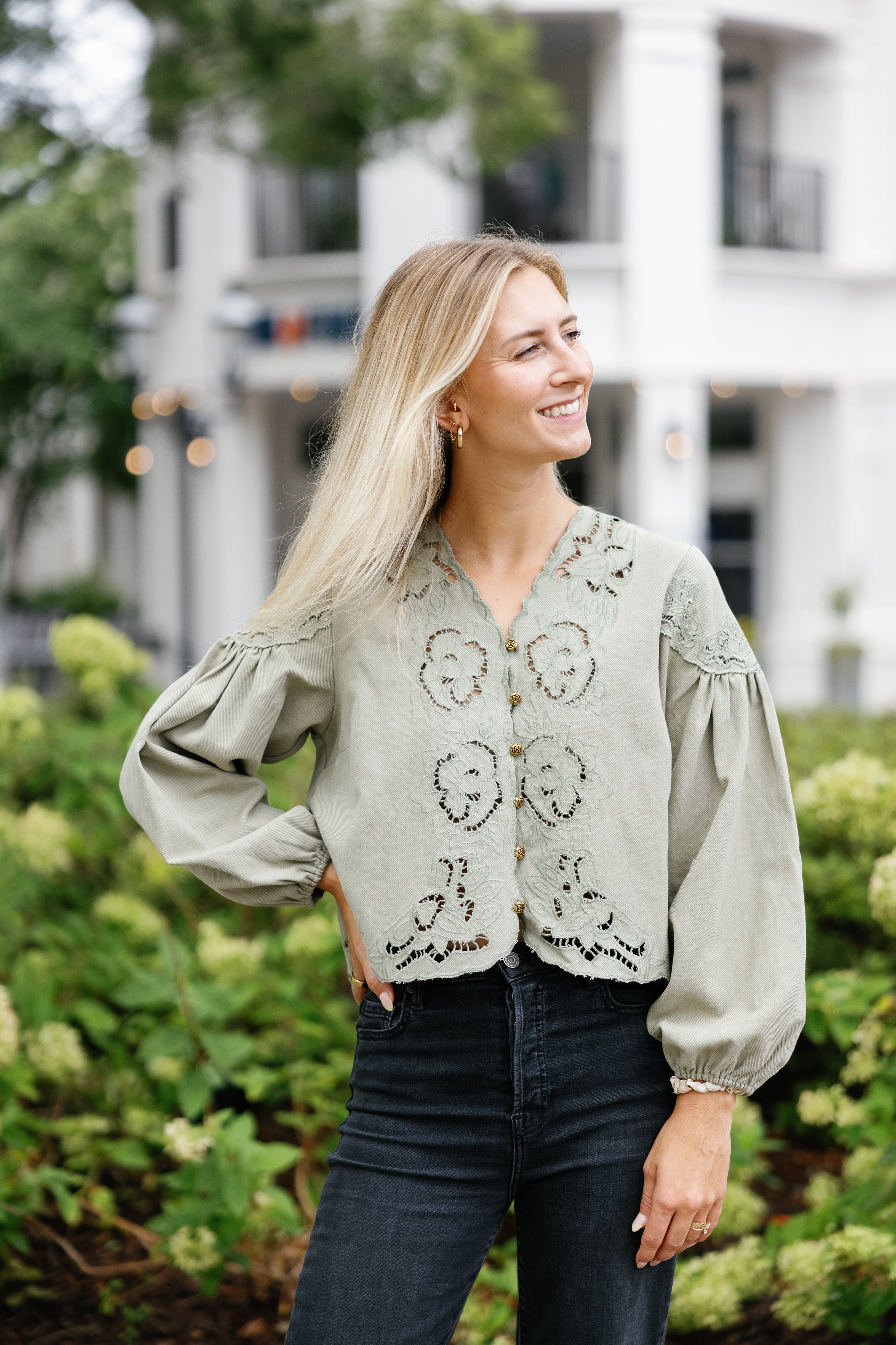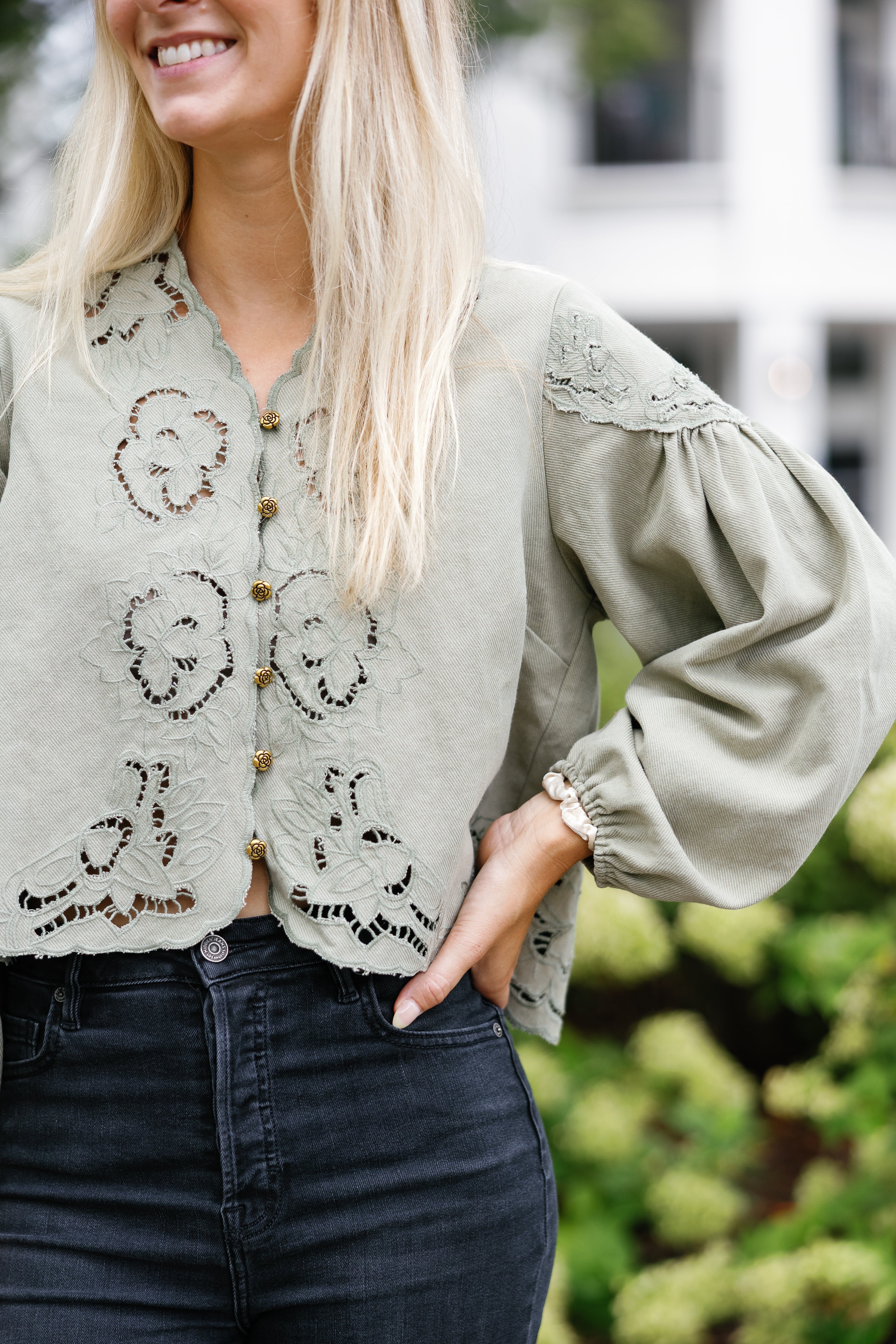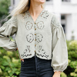 Bring playful charm to your wardrobe with the Lucy Denim Blouse. This delightful piece features intricate floral embroidery and delicate cutouts that add a touch of whimsy. With a flattering v-neck, button-down front, and balloon sleeves ending in elastic cuffs, it offers both comfort and a flirty silhouette perfect for any casual outing or weekend adventure.
