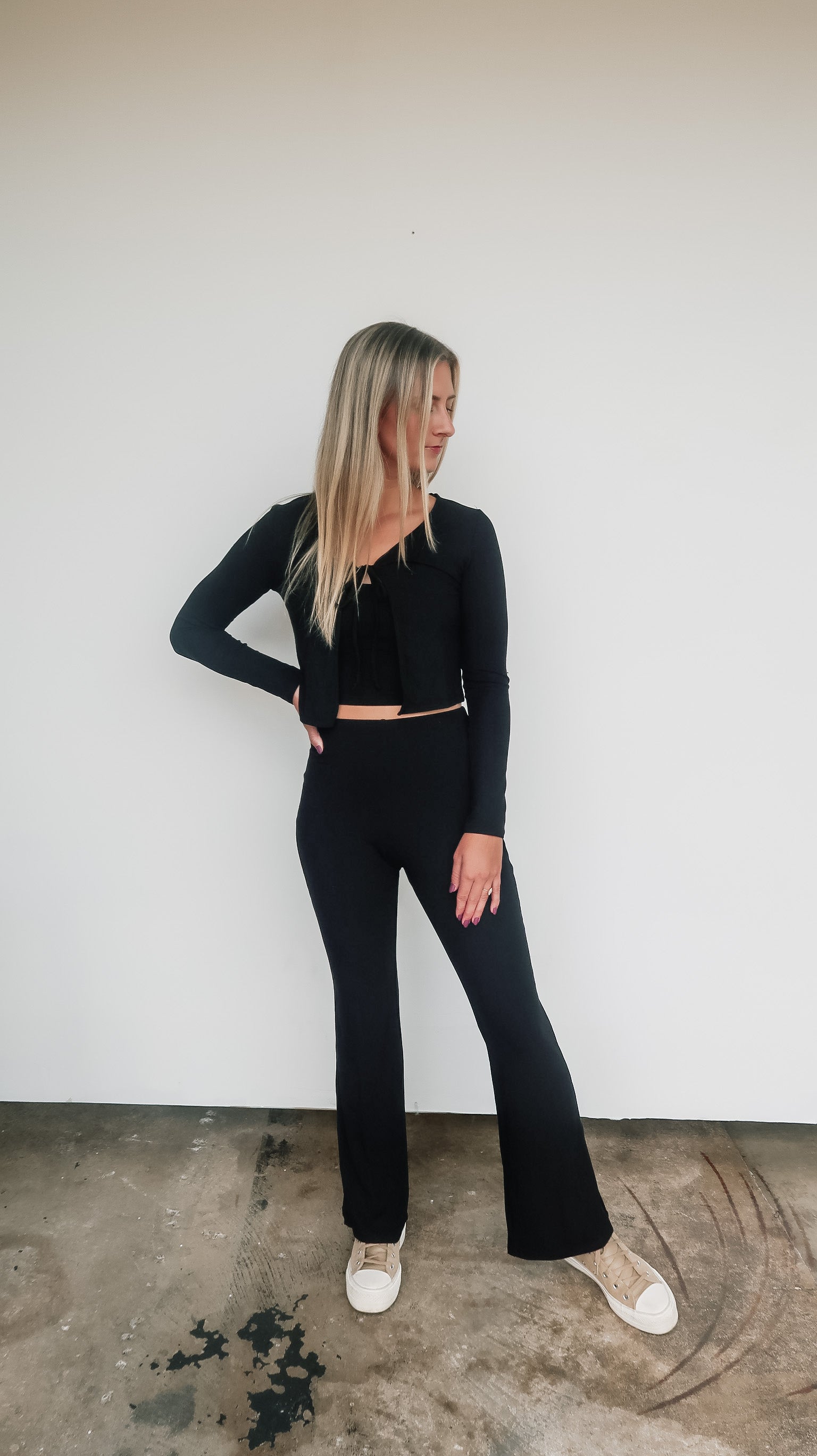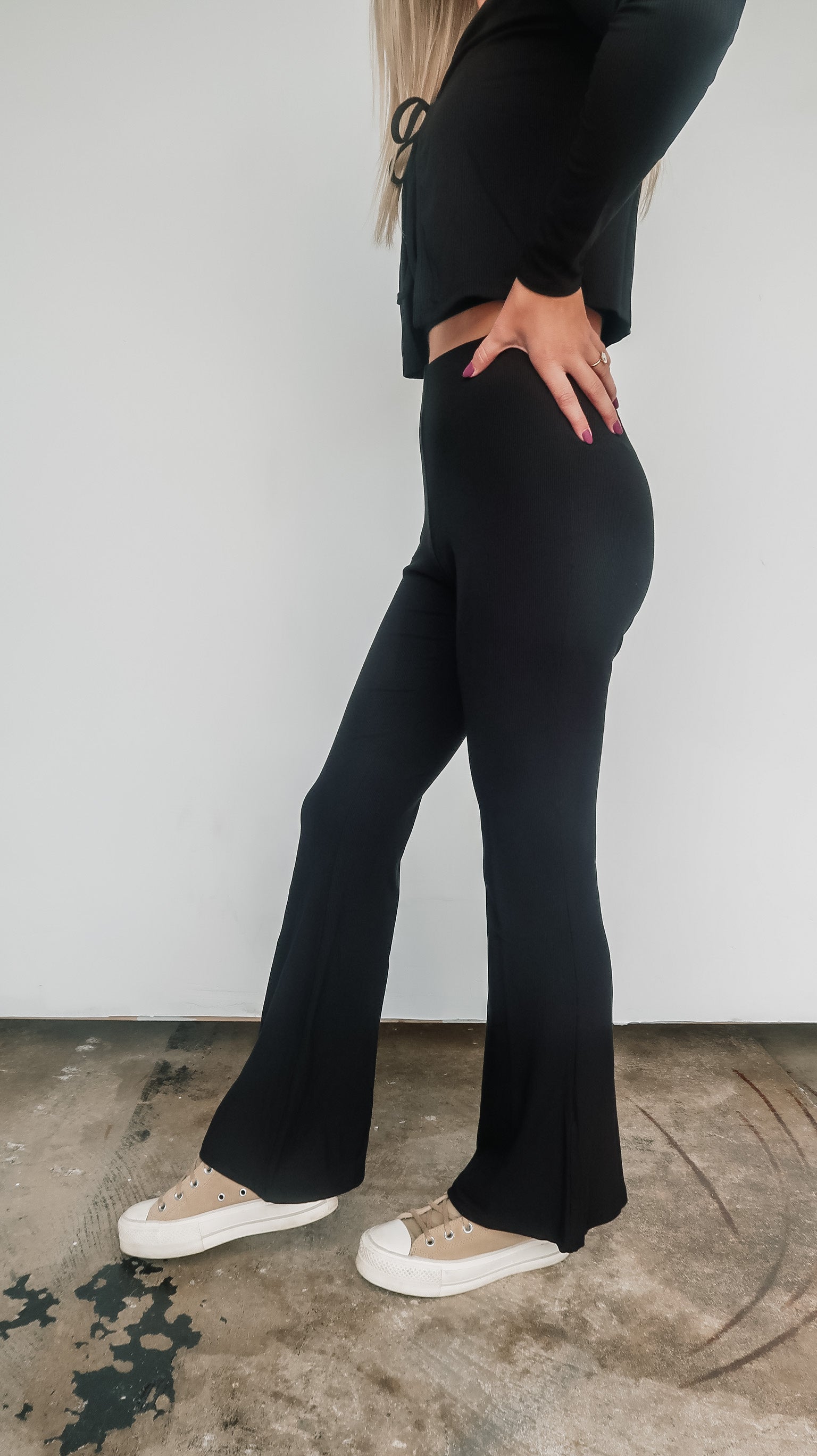 The Mia Flare pants are buttery soft black ribbed pants that are the perfect closet staple. These can be dressed up or down and paired with our Mia Cardigan set its the ultimate travel set!