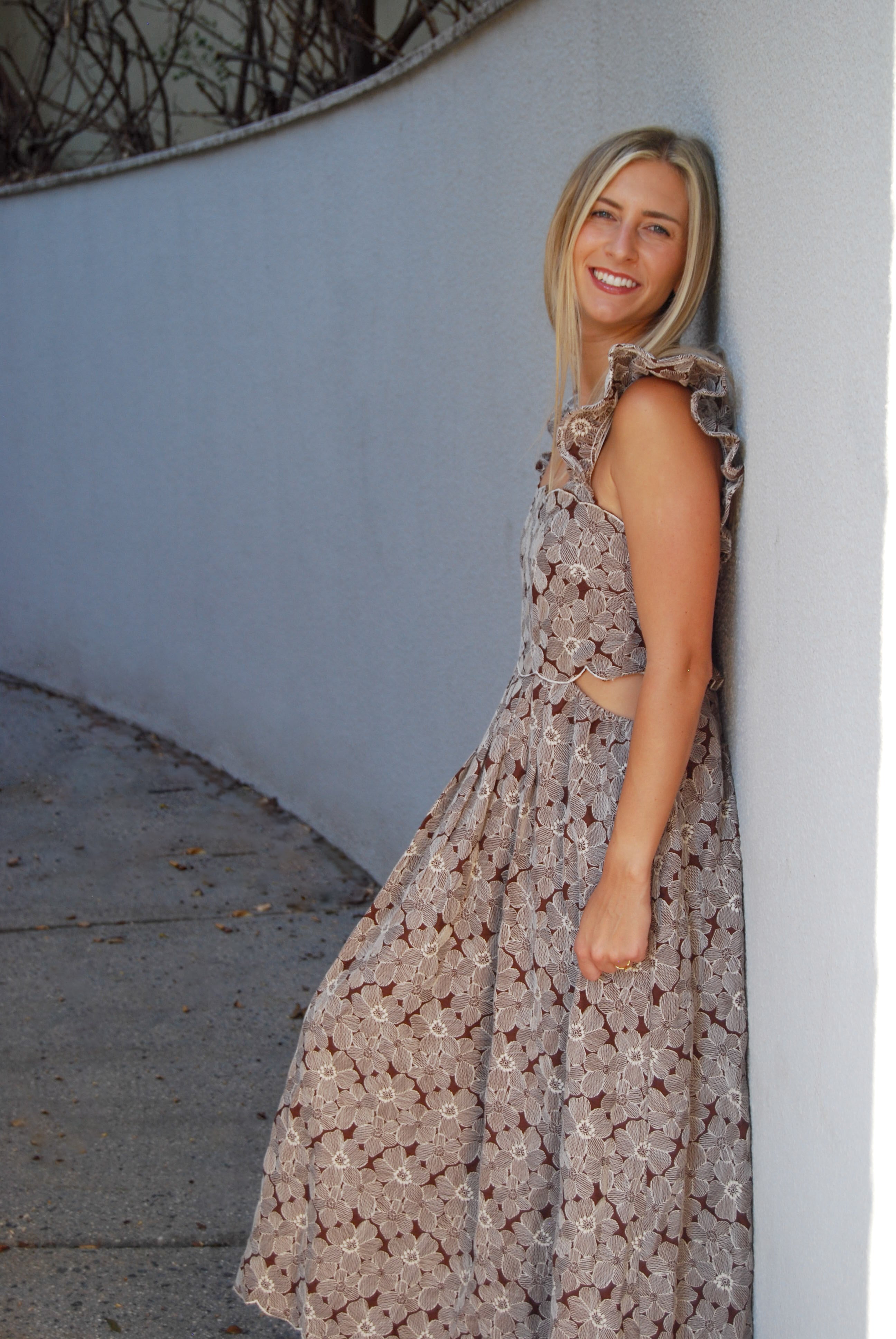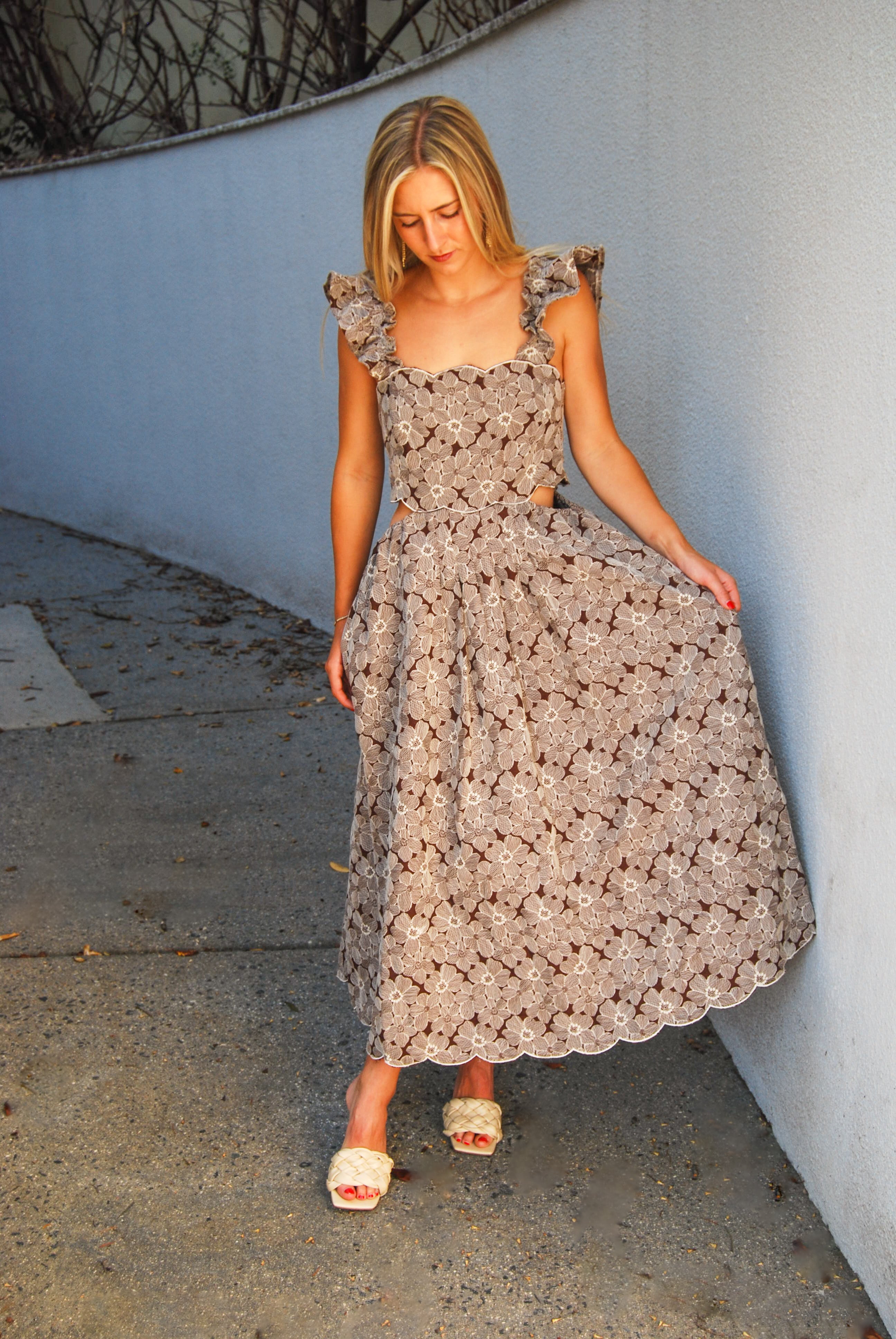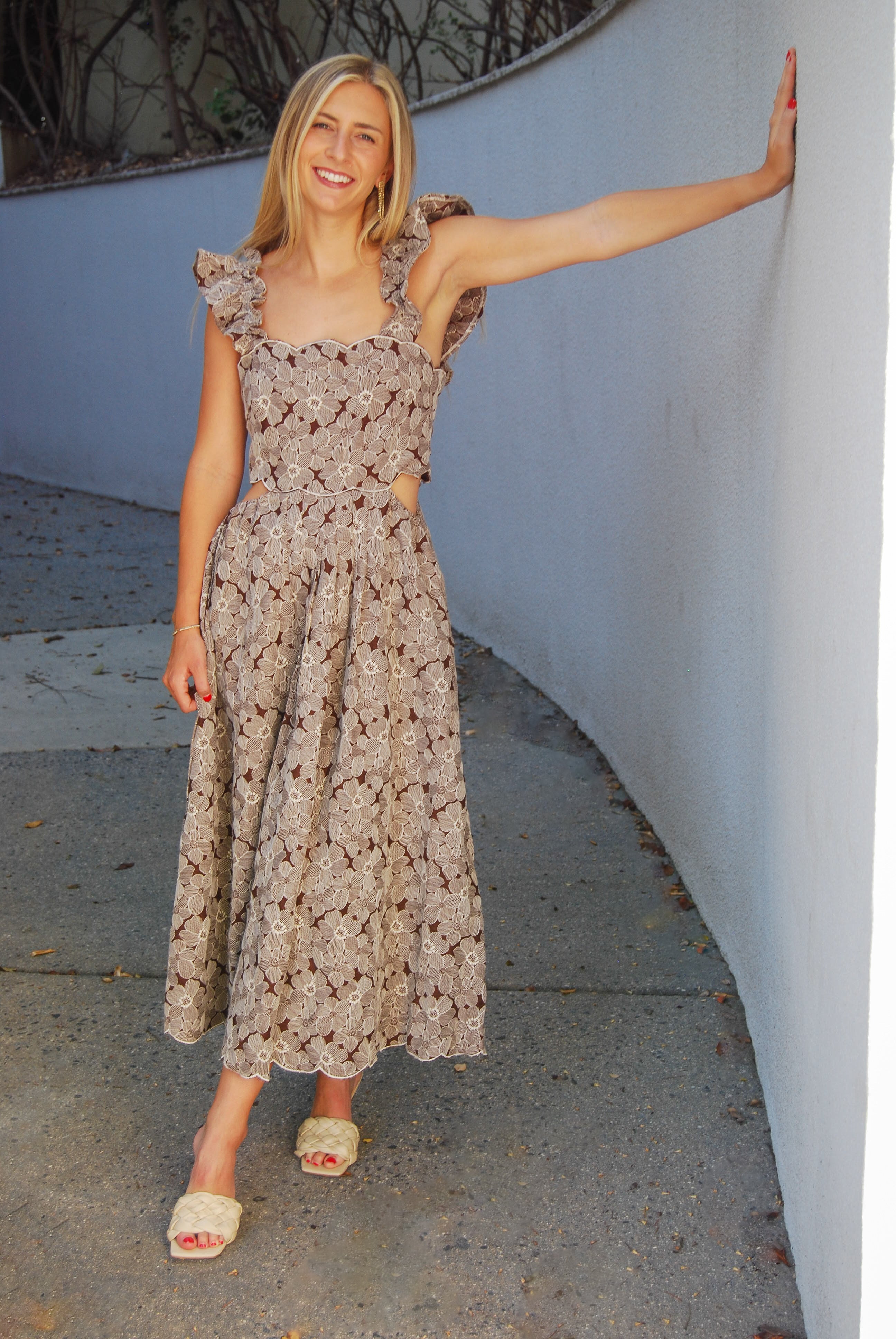 Introducing the Minos Midi Dress, the perfect blend of elegance and uniqueness. With elegant ruffle sleeves and a beautiful embroidered floral design, this dress is sure to turn heads. The side cutout adds a playful touch to this one-of-a-kind dress.