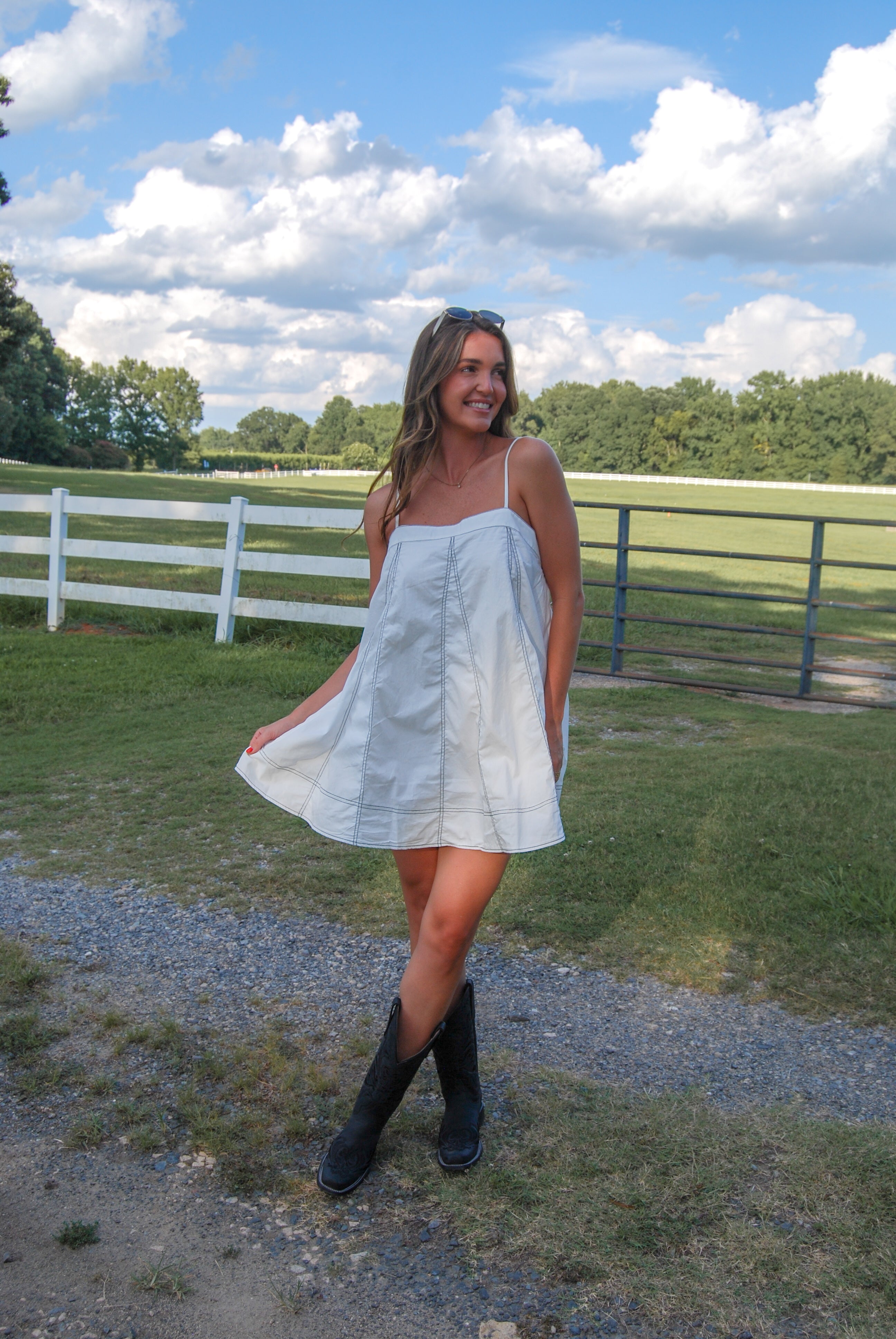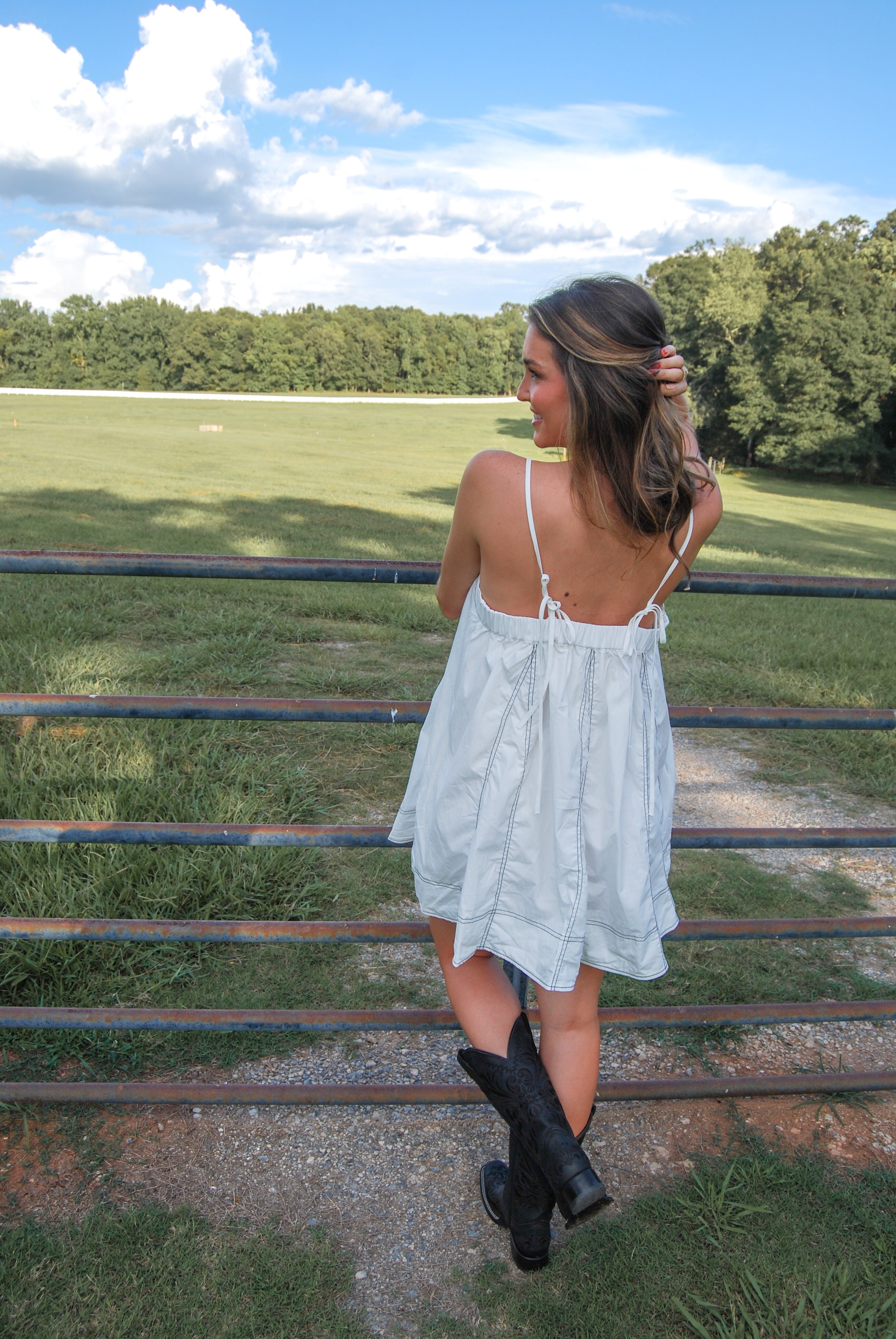 The Montana Dress is a flirty white mini swing dress featuring adjustable ties for a perfect fit and charming contrast stitching that adds a fun twist. Fully lined for comfort, it’s your go-to piece for effortless style and playful vibes all day long.