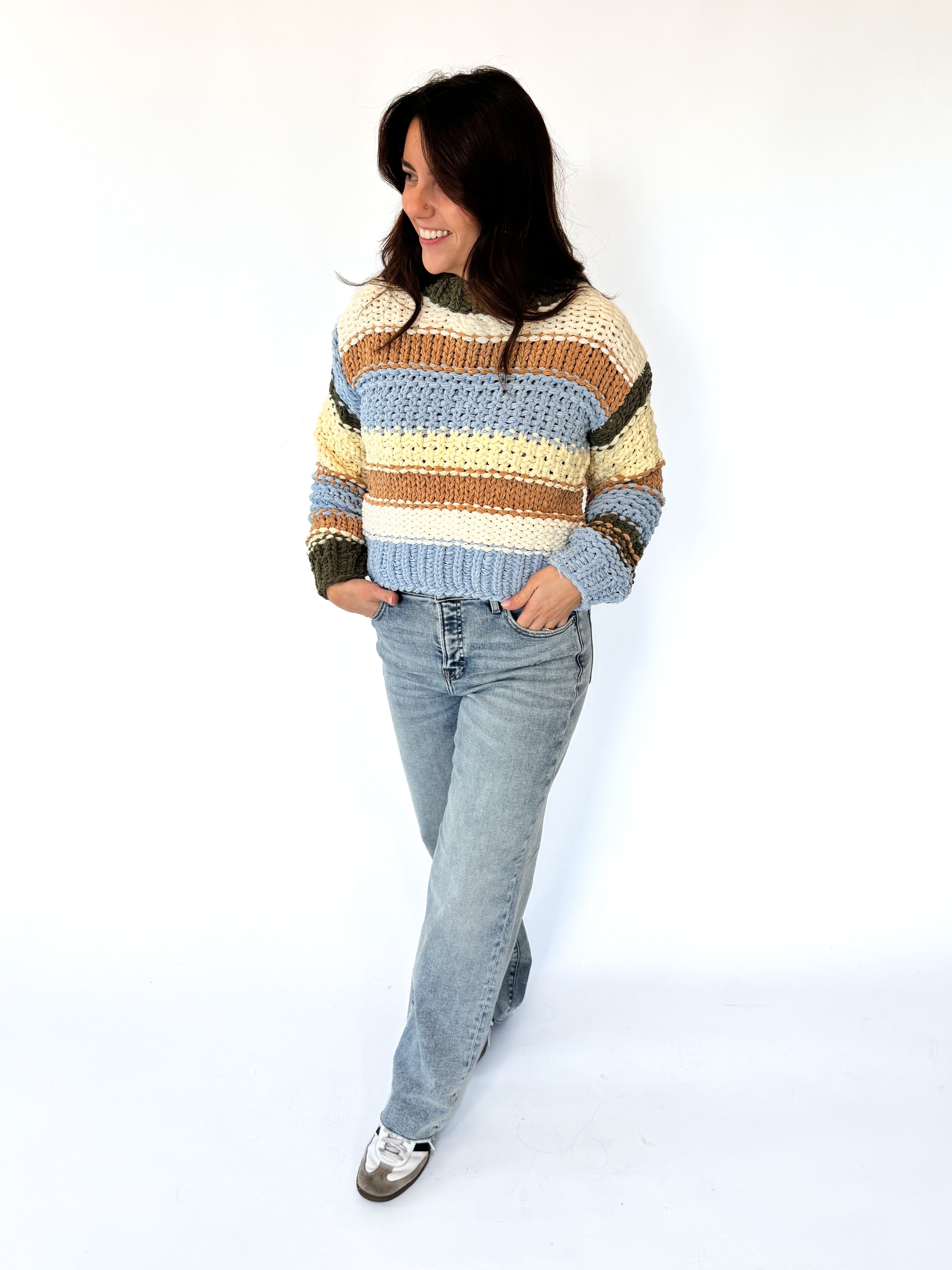 Wrap yourself in comfort with this Mother Earth Chunky Knit Sweater, featuring bold striped contrast that brings instant personality to your wardrobe. The oversized chunky knit construction delivers that perfect cozy hug you crave, while the playful design is guaranteed to lift your spirits and spark joy. Whether you're lounging at home or stepping out for the day, this cute essential pairs effortlessly with your favorite jeans.