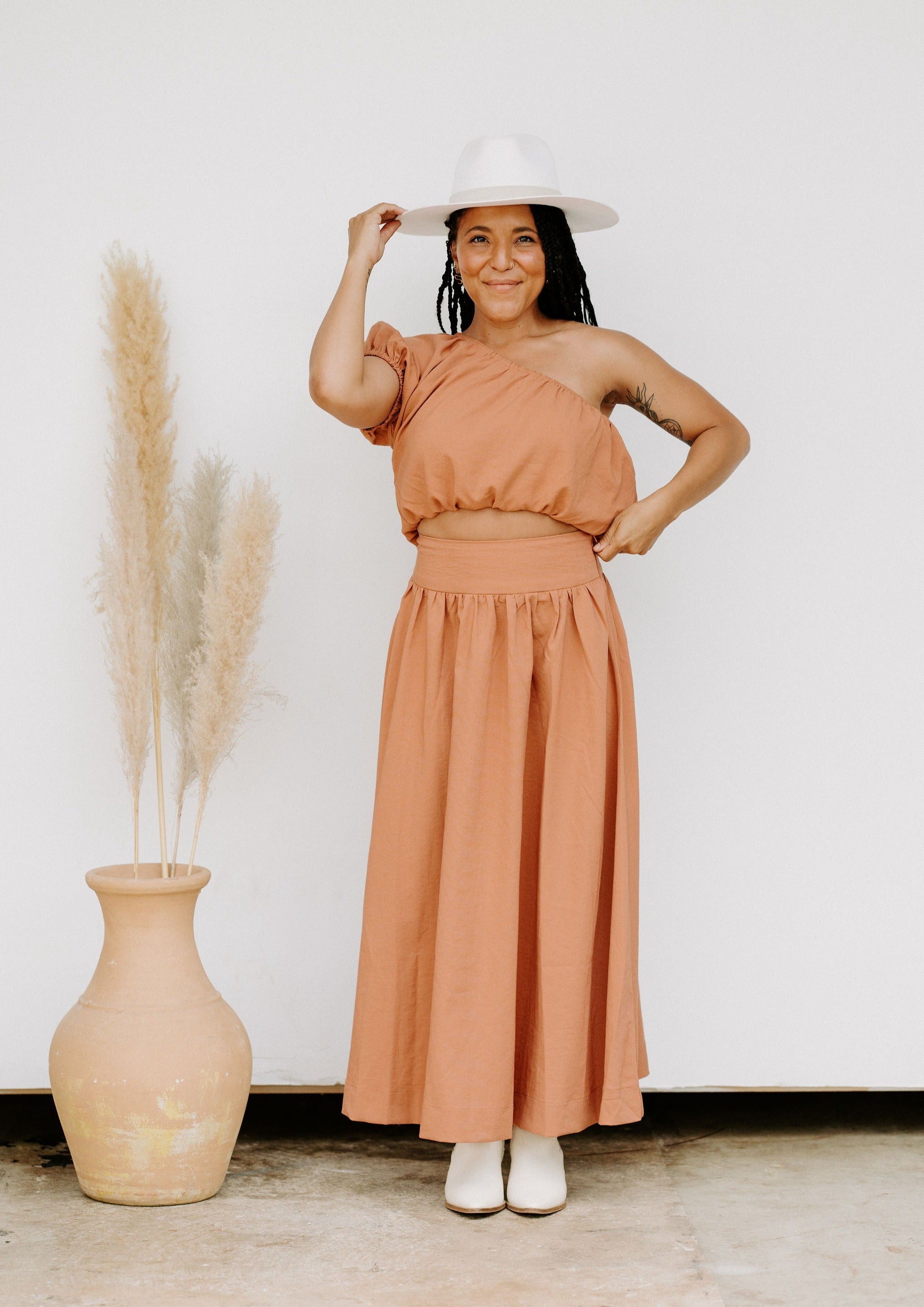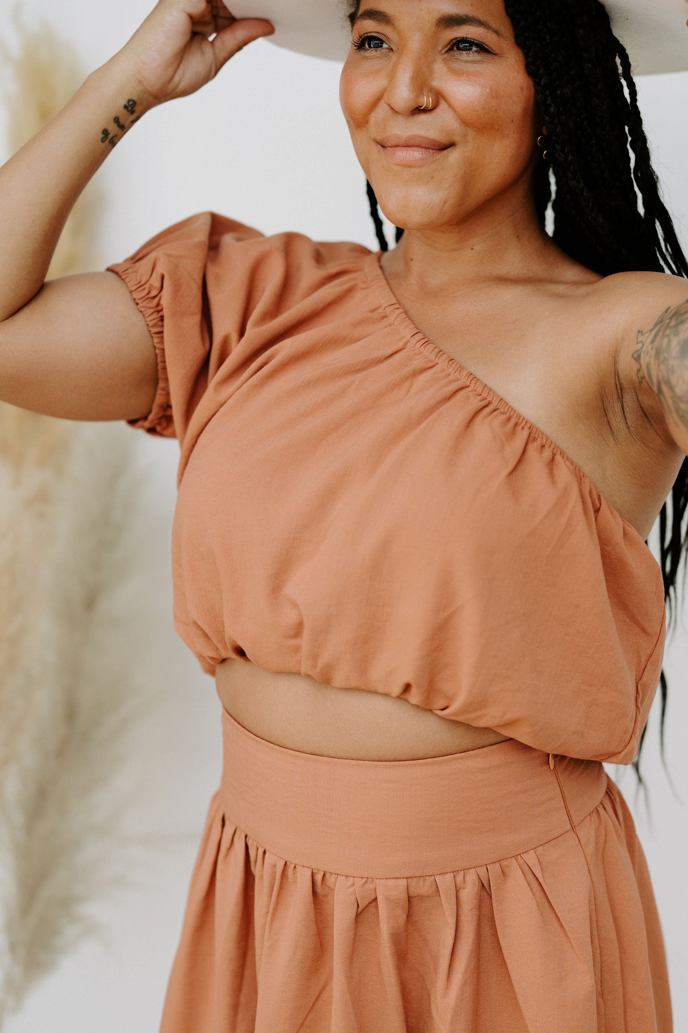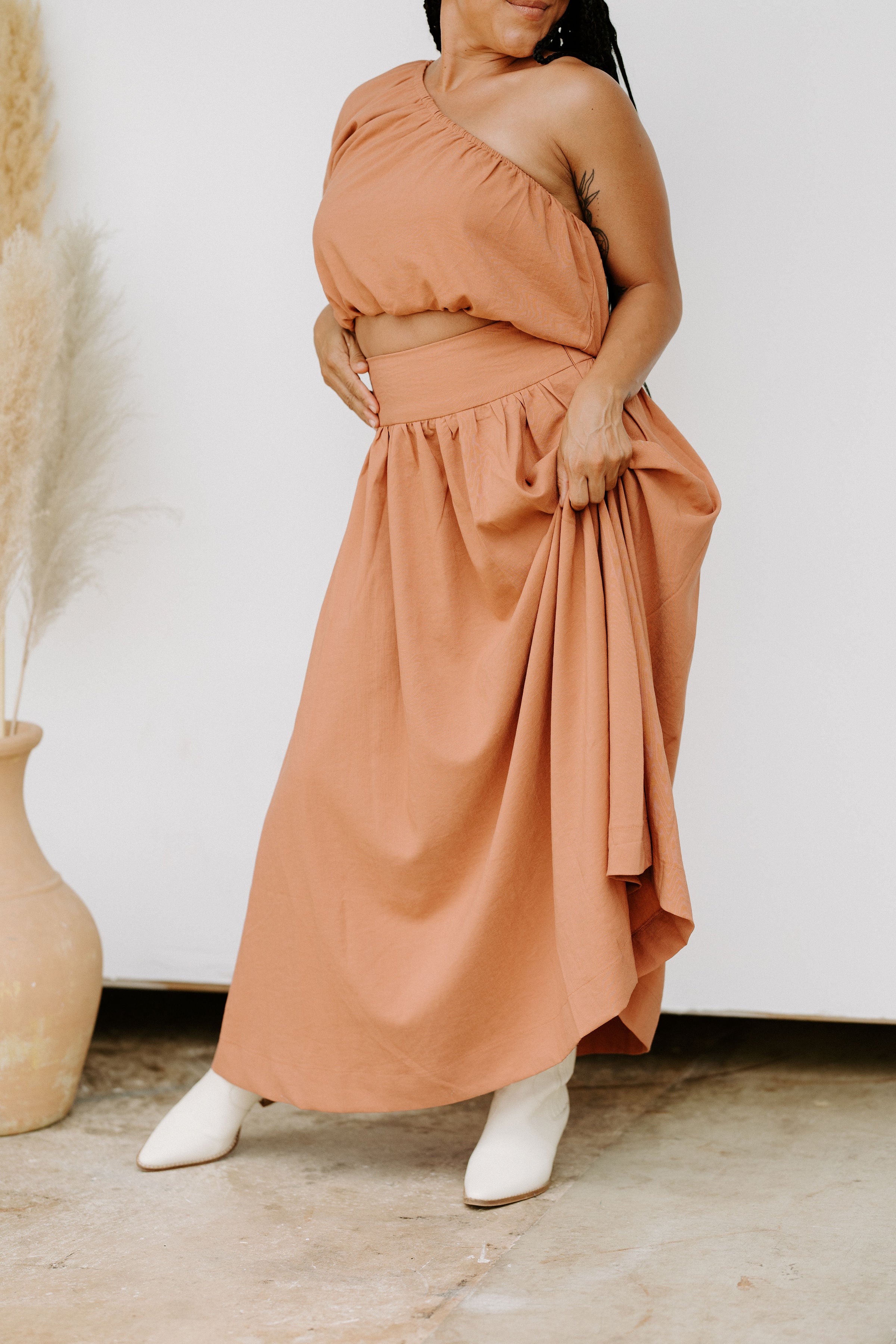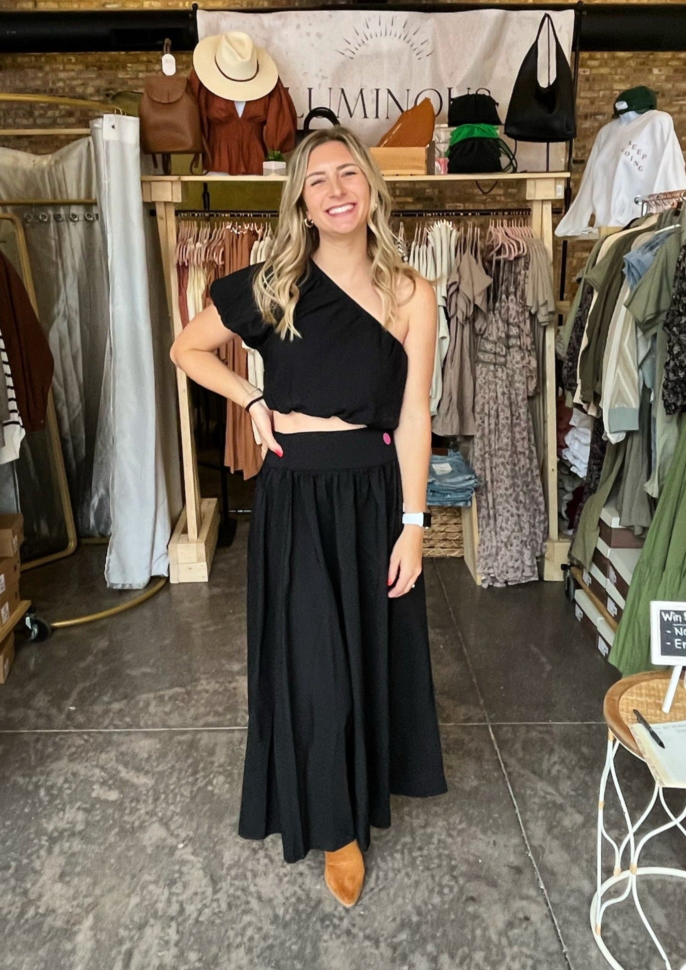 We are OBSESSED with the Out On The Town Set. This two piece features a one shoulder elastic top with a midi skirt bottom. This set is both chic yet effortless and the styling options are endless. Wear it together for a fashion forward look, pair the top with your favorite denim or style the skirt with a graphic tee and sneaks!
