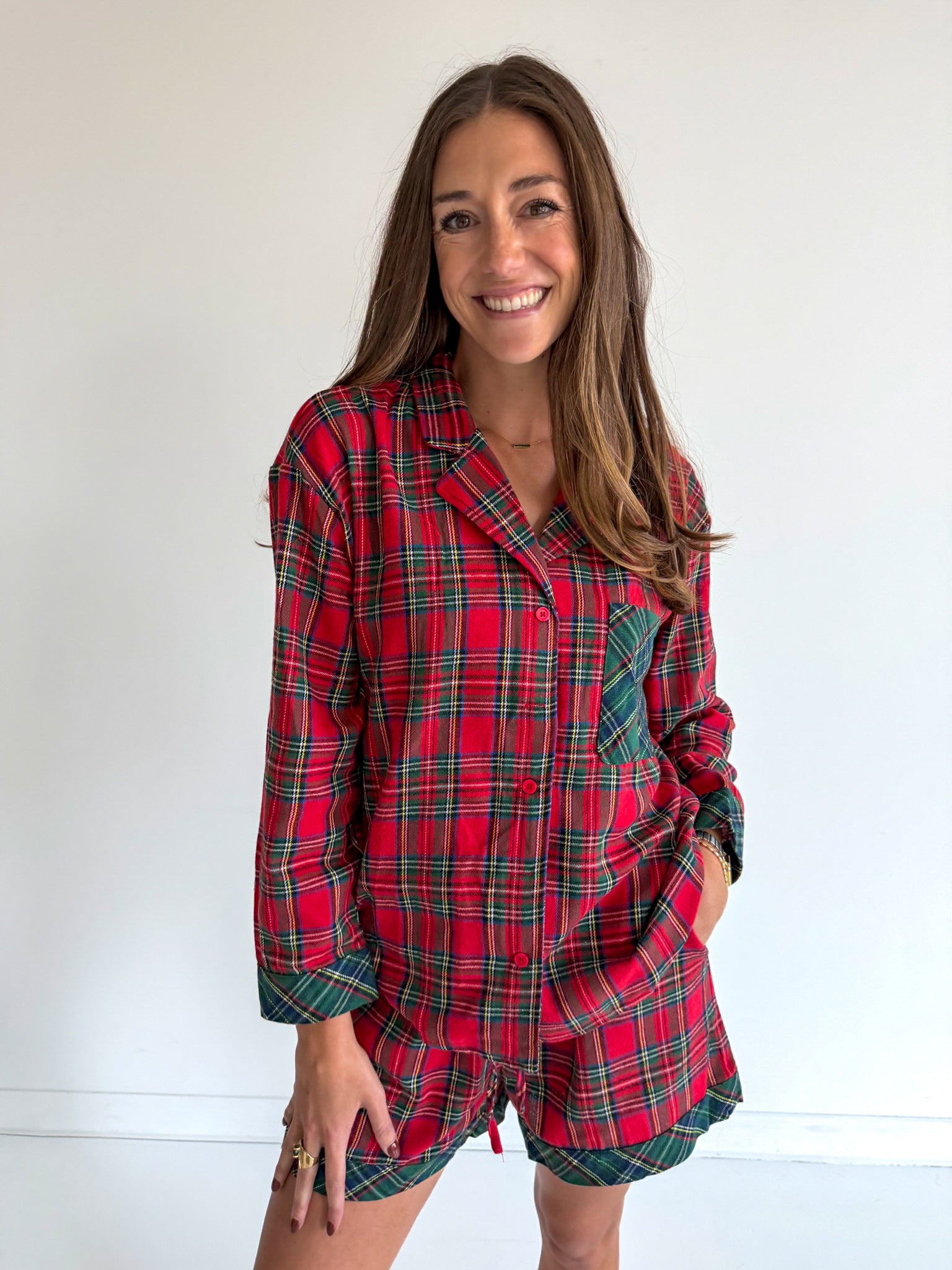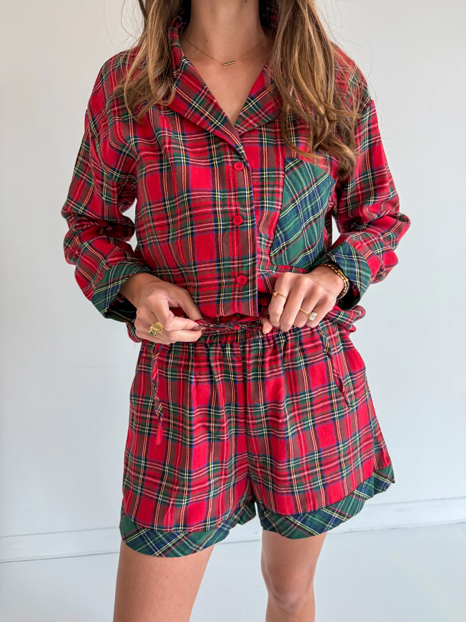 Cozy up in festive style with these charming plaid pajamas! Featuring a classic collared button-up top paired with comfortable short bottoms, they're perfect for holiday lounging or gift-giving. The timeless plaid pattern brings cheerful charm to your sleepwear rotation, while the relaxed fit ensures all-night comfort. Whether you're sipping cocoa by the fire or catching some Z's, these pajamas deliver that perfect blend of cute and cozy that makes you want to stay in them all day long.