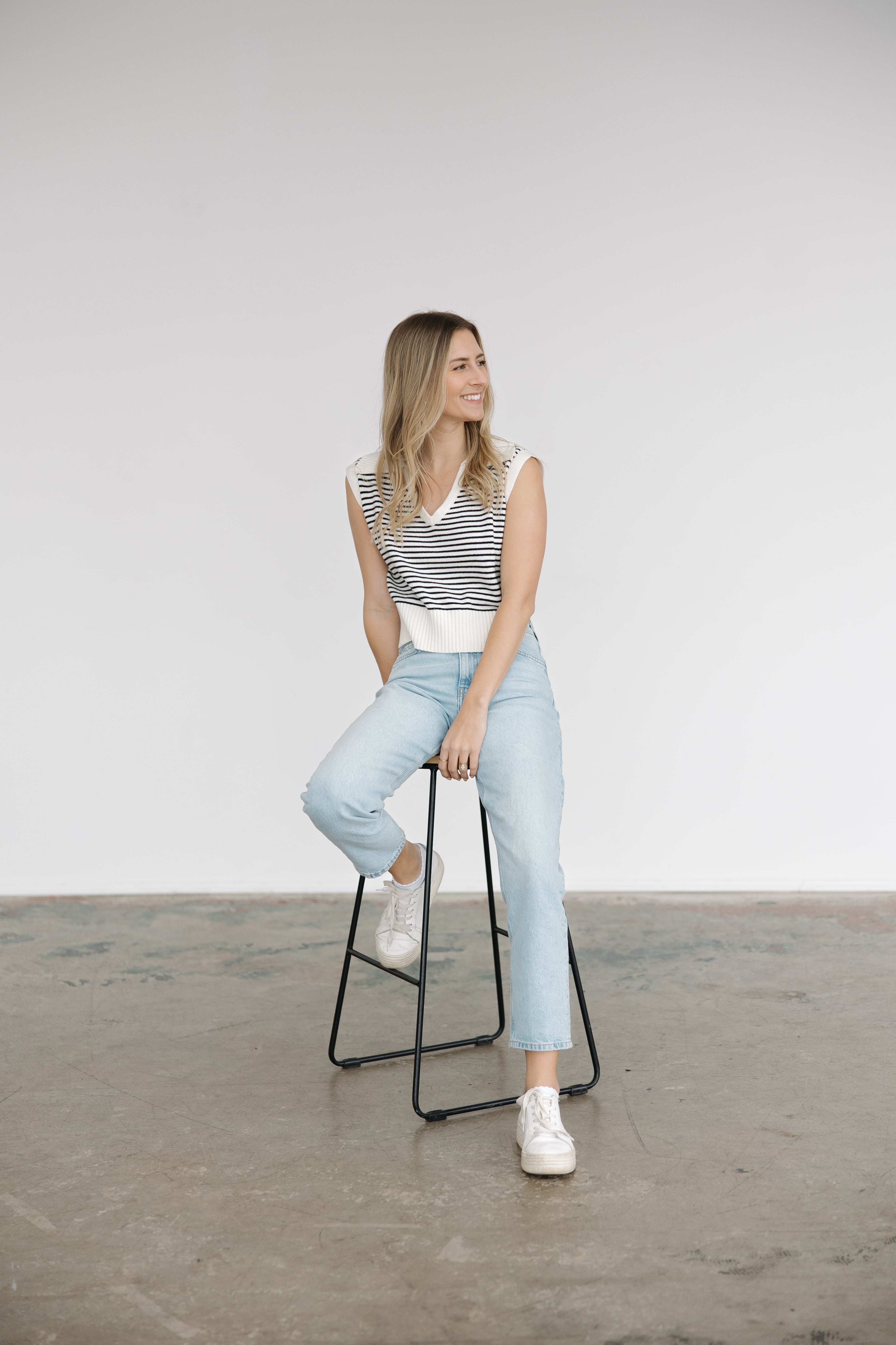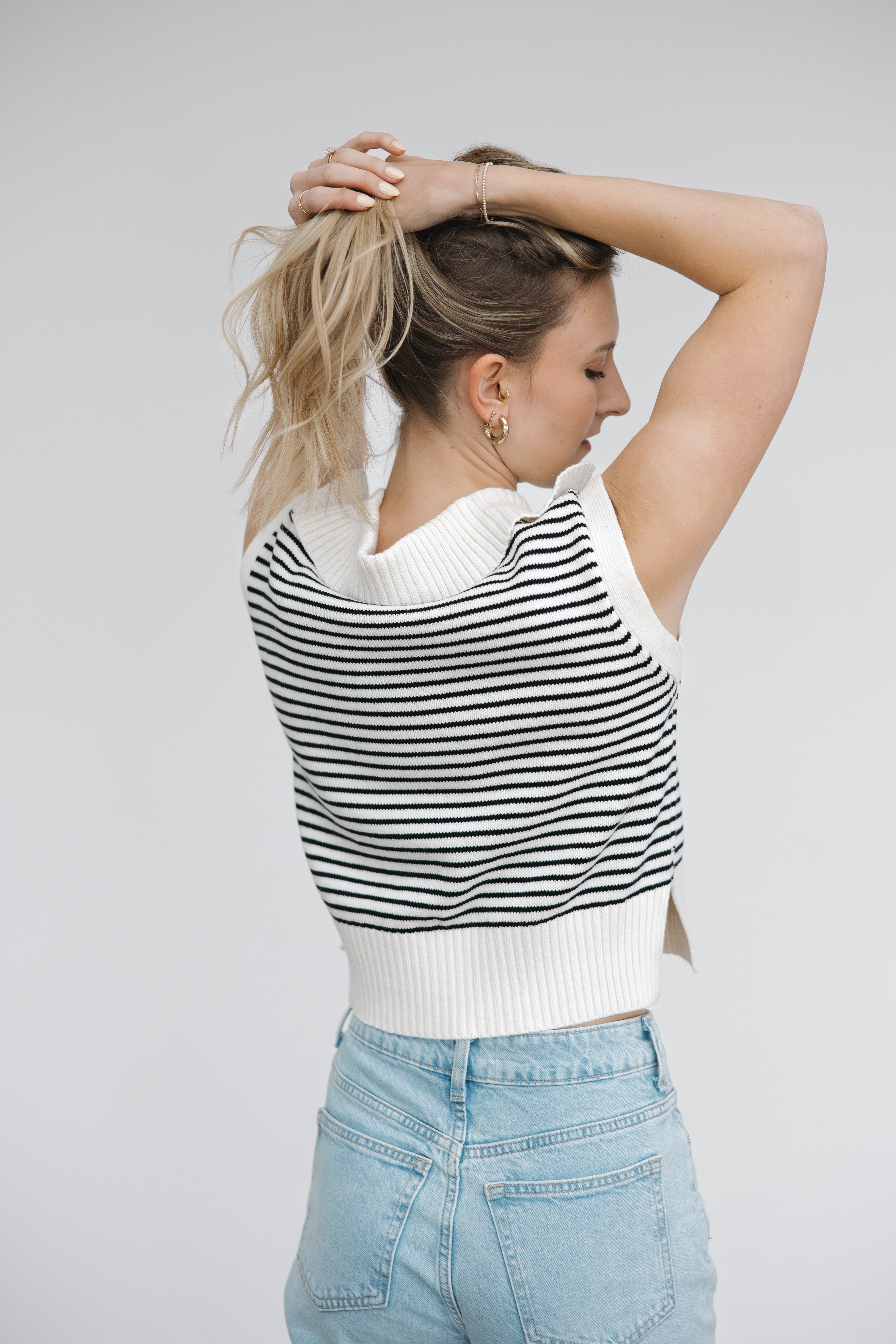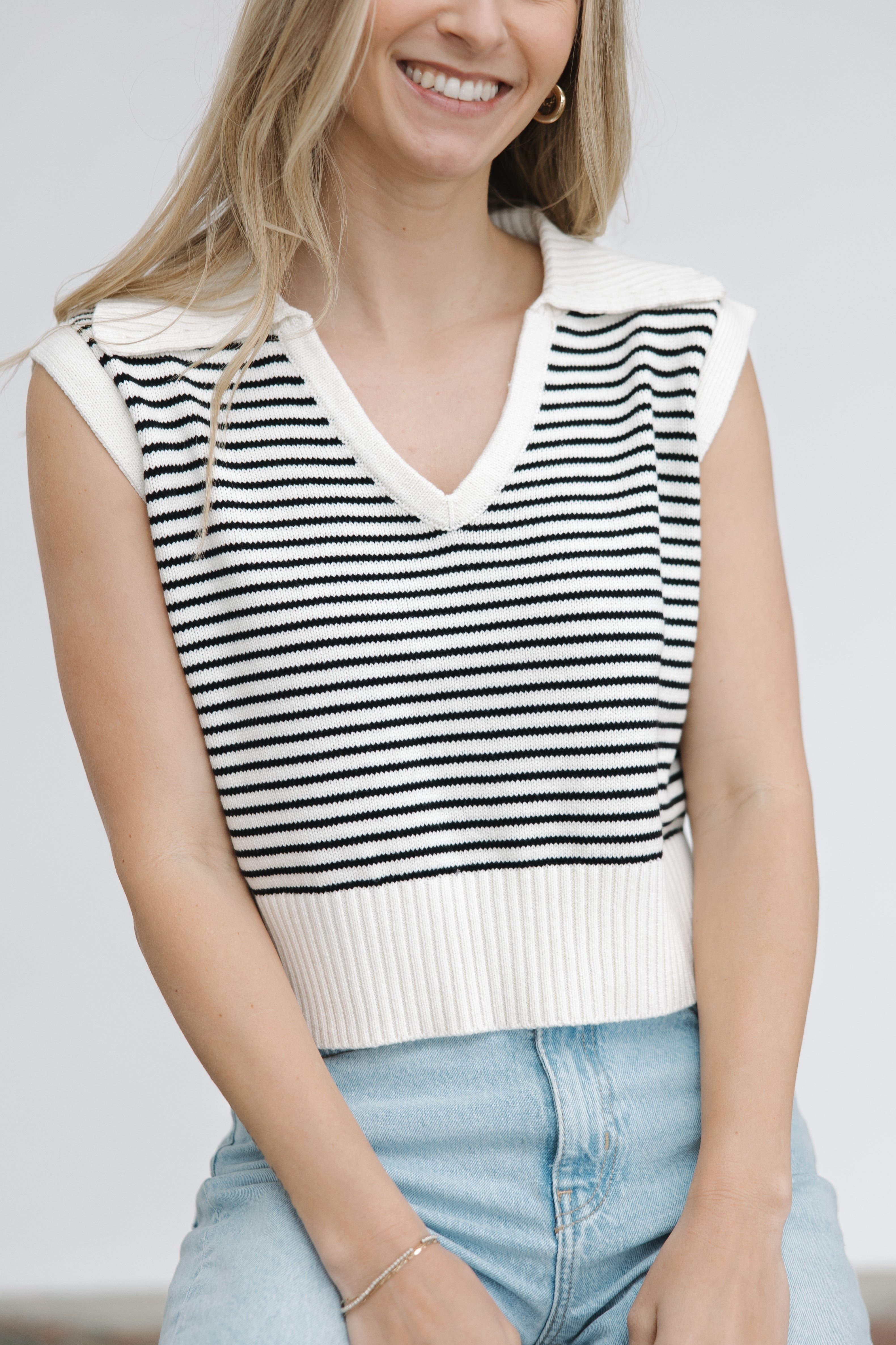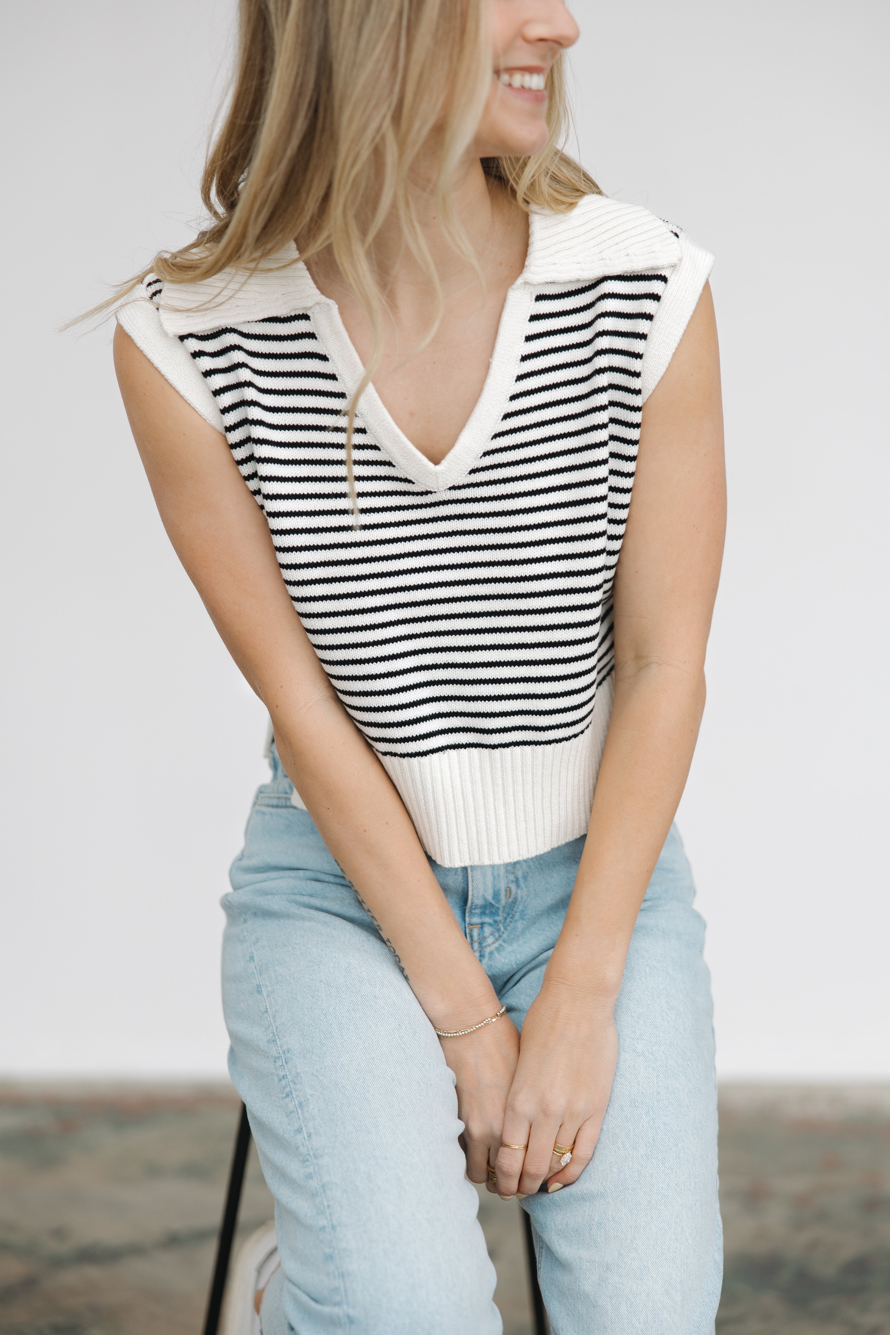 Get ready to put together the perfect outfit with our sleeveless striped top! The knit fabric provides comfort and the collared neckline adds a touch of sophistication. Plus, the ribbed hem adds a unique detail to this versatile piece. Add this top to your wardrobe for a stylish and comfortable option!