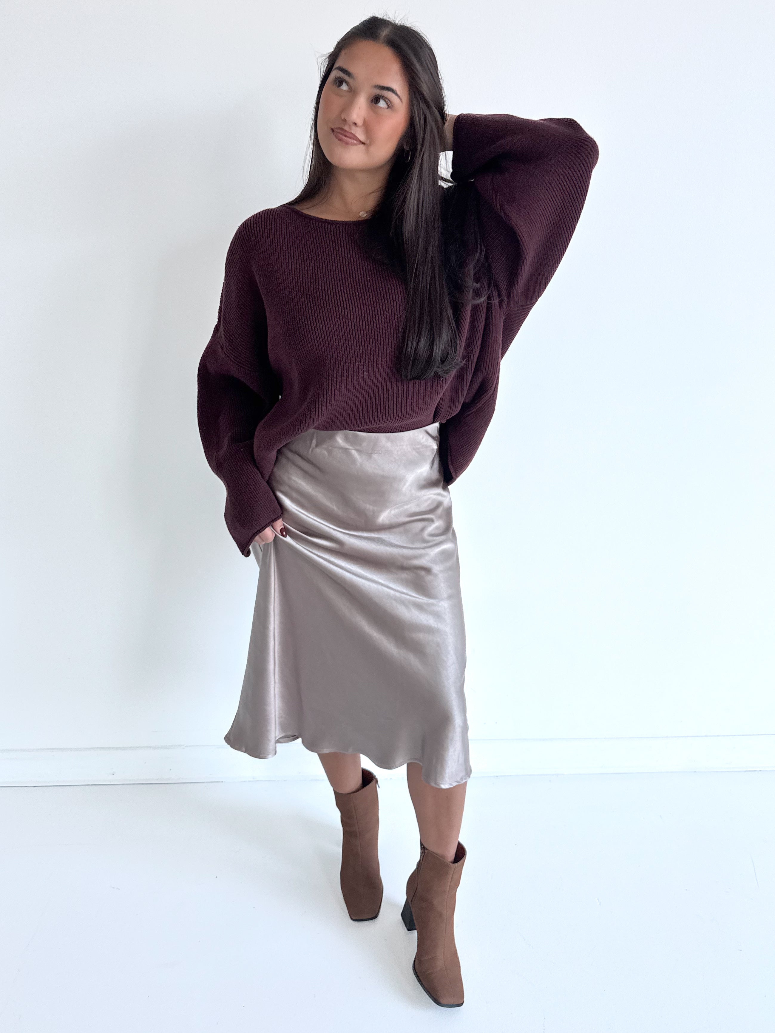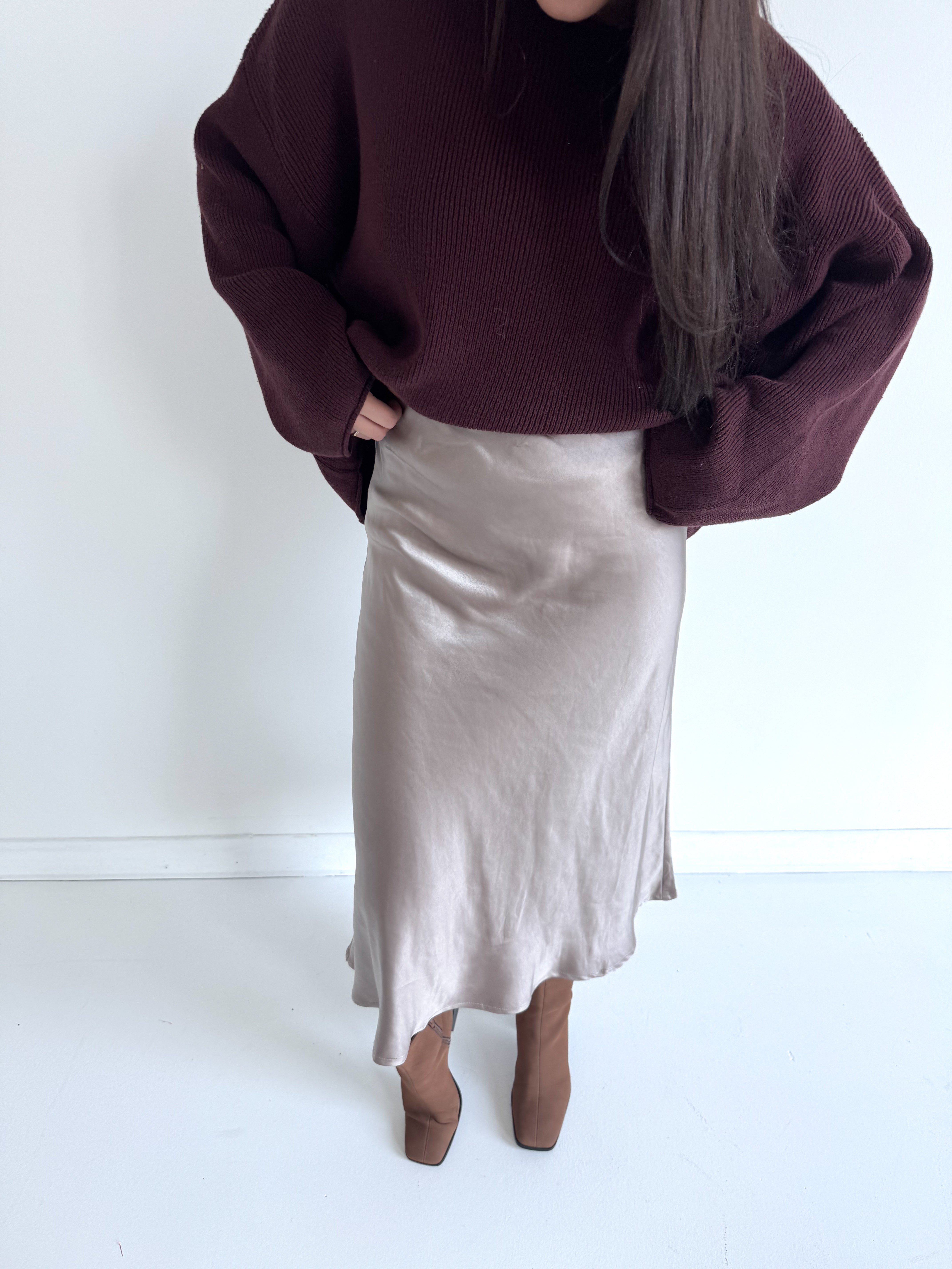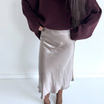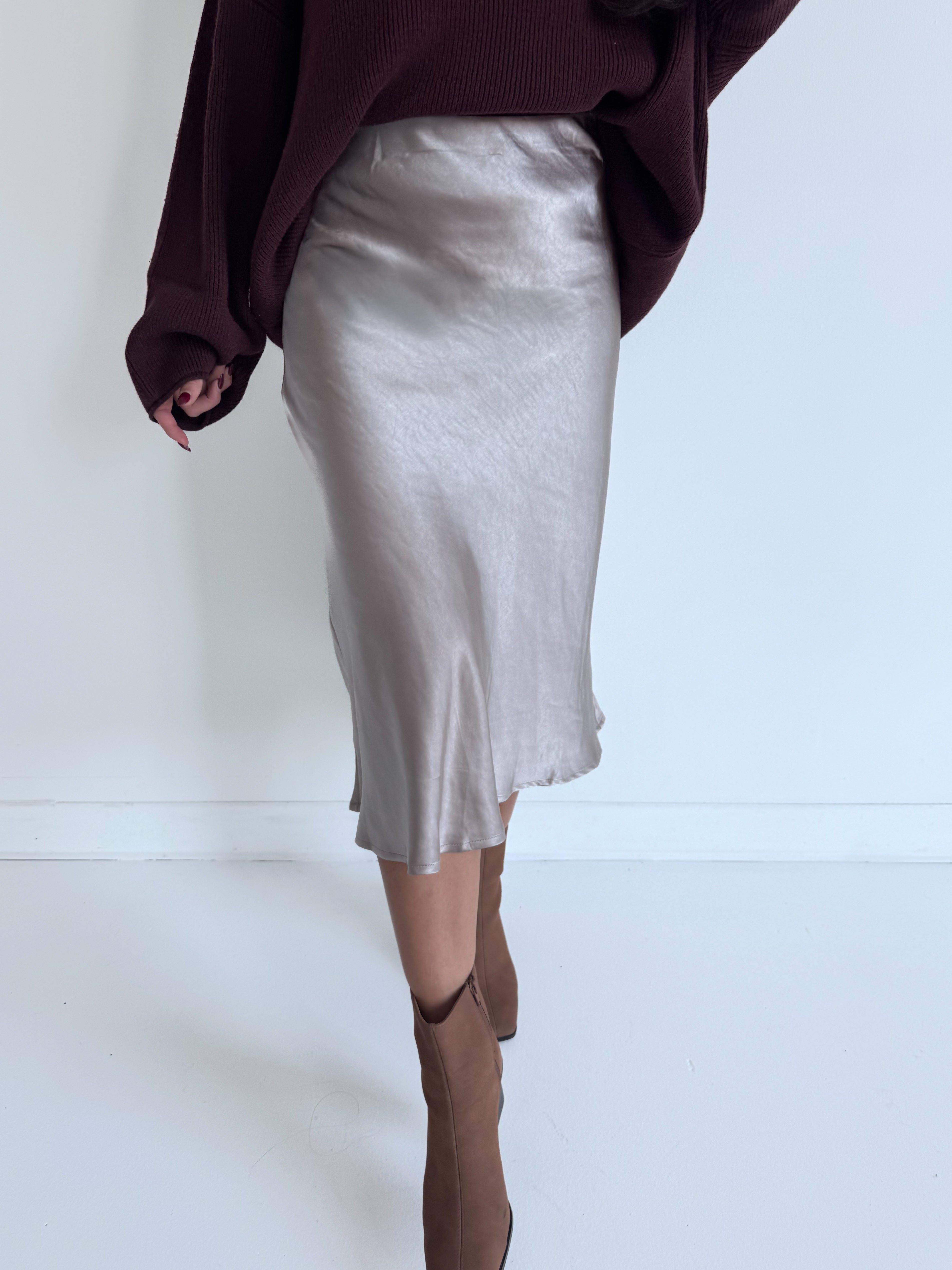 Slip into pure sophistication with this satin midi skirt—a shimmering showstopper that plays beautifully with light. The fluid drape flatters every figure while keeping things effortlessly chic, whether you're heading to a holiday party or grabbing drinks with friends. Style it minimalist with a crisp tee or go bold with a statement blouse. Either way, you've got a timeless piece that works as hard as you do.