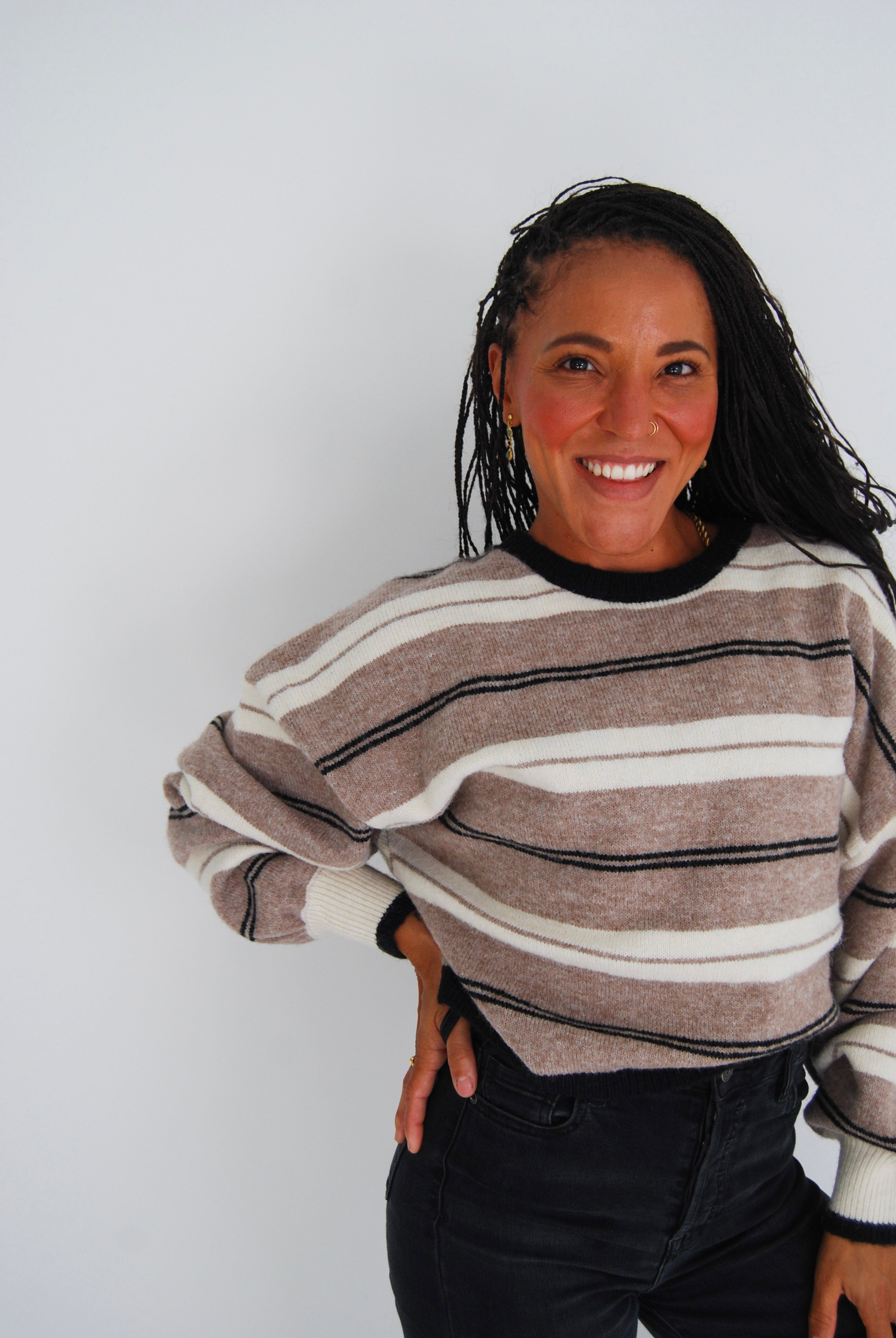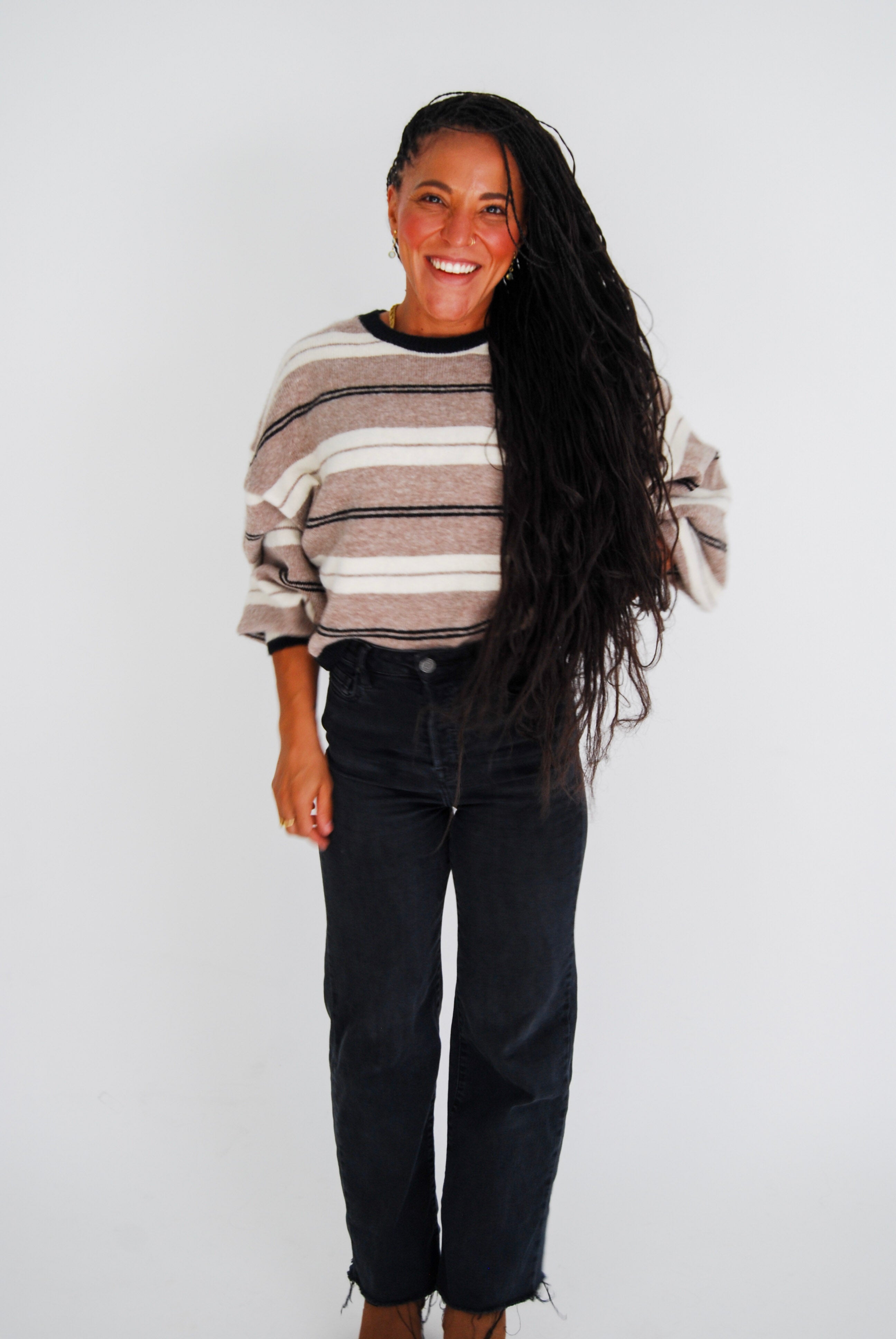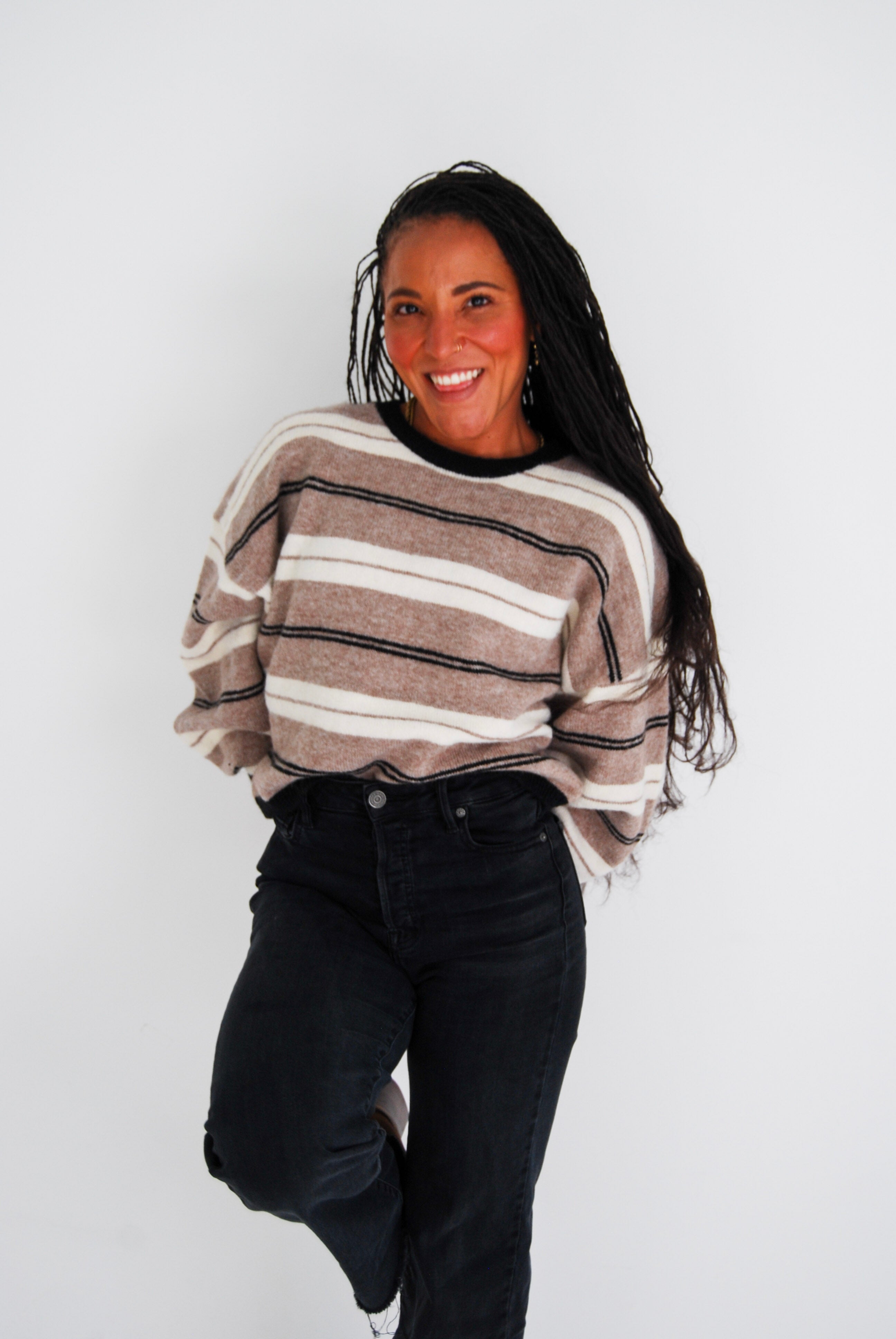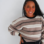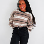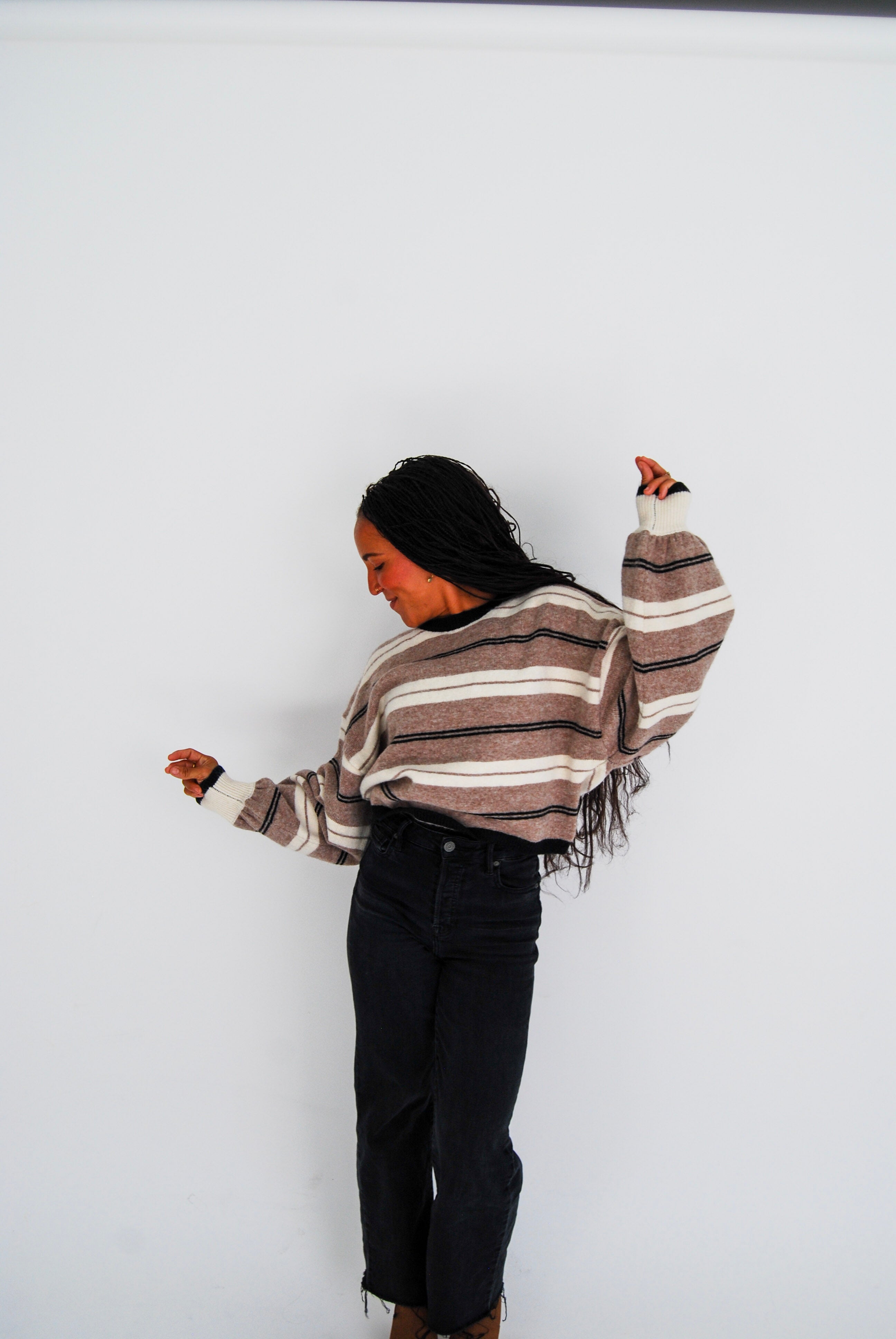 Stay snug and stylish in the Sandstone Striped Sweater, featuring breezy dolman sleeves and a ribbed collar and cuffs for that perfect cozy hug. Its slightly cropped cut adds a fun twist, making it ideal for layering or pairing with your favorite high-waisted jeans. Embrace comfort with a playful edge in this charming knit!