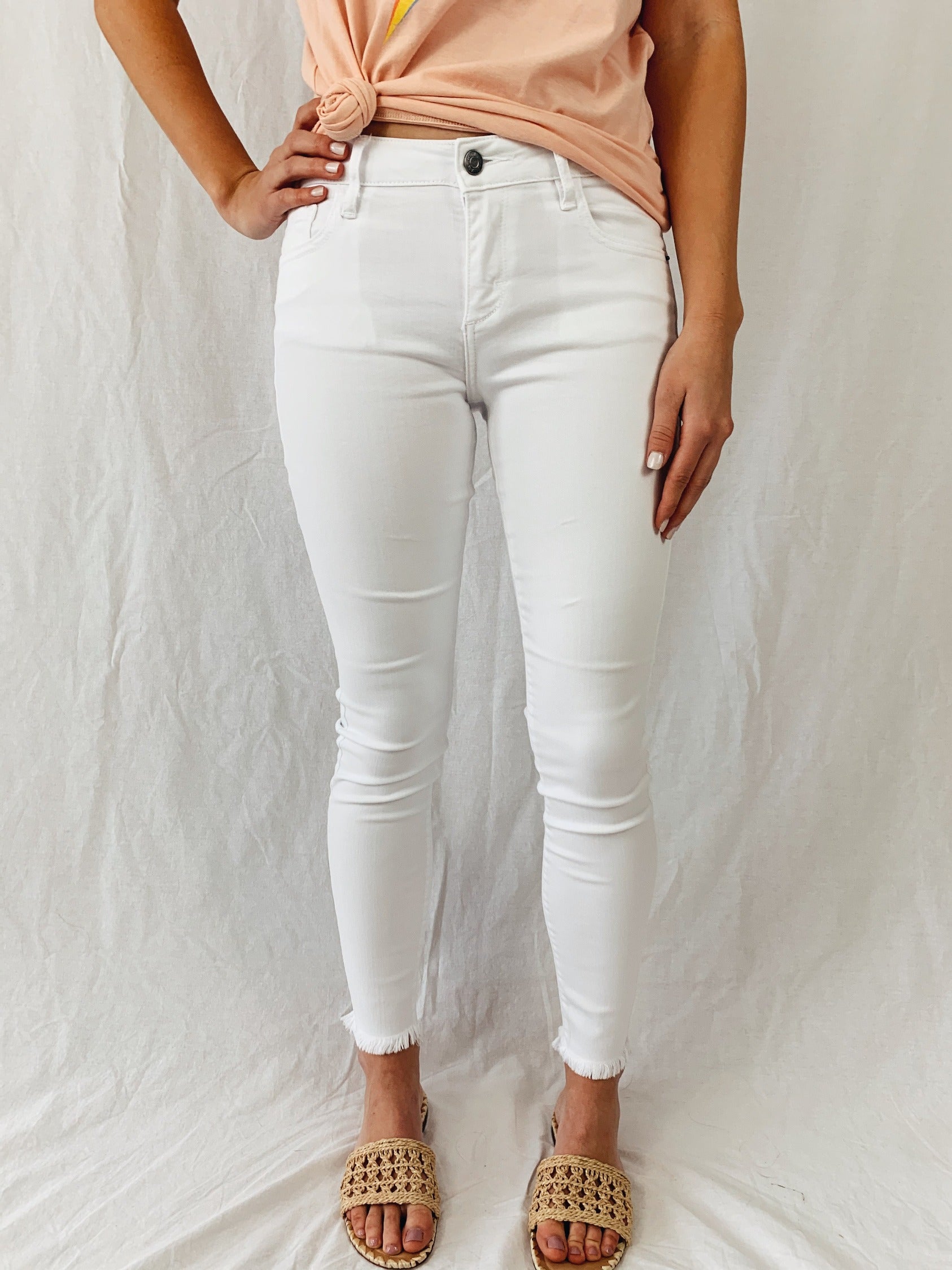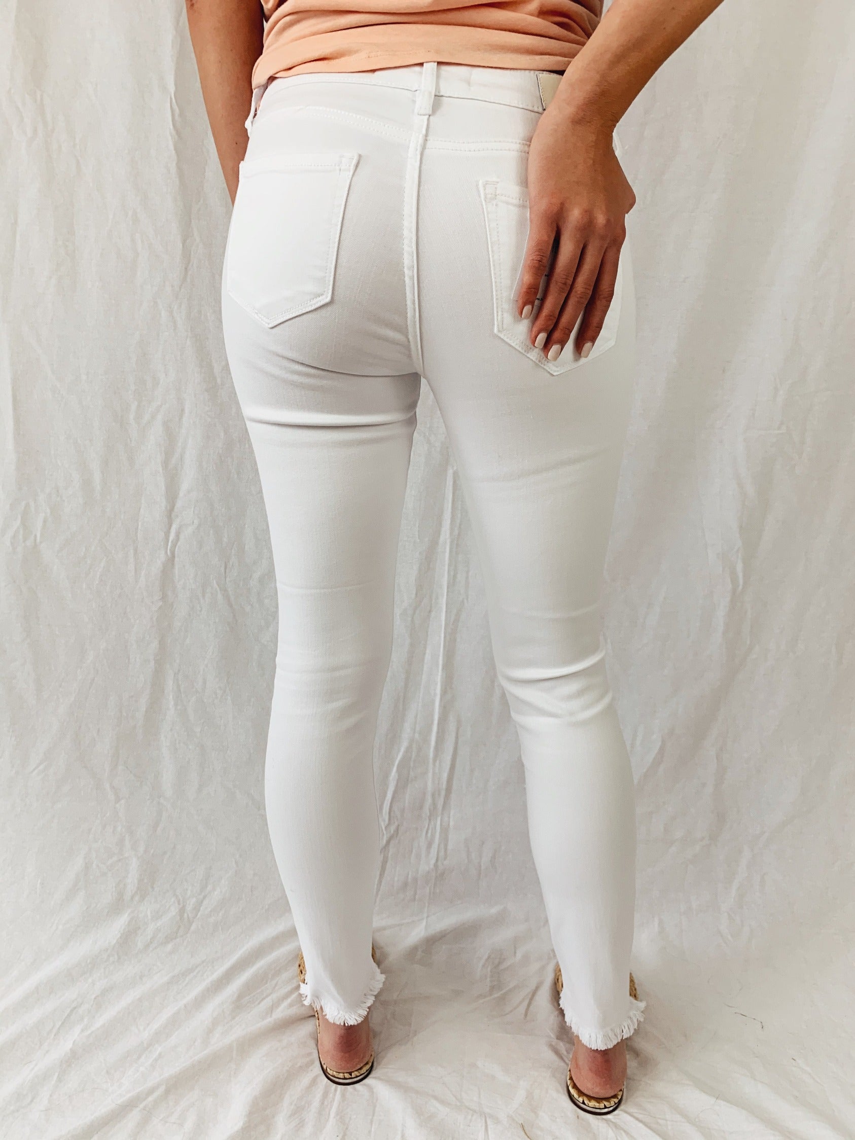 Everybody needs a solid pair of white denim in their closet, it's a must! The Sasha jean is mid rise stretch denim with a frayed hem. The perfect staple jean with just a little added flare.