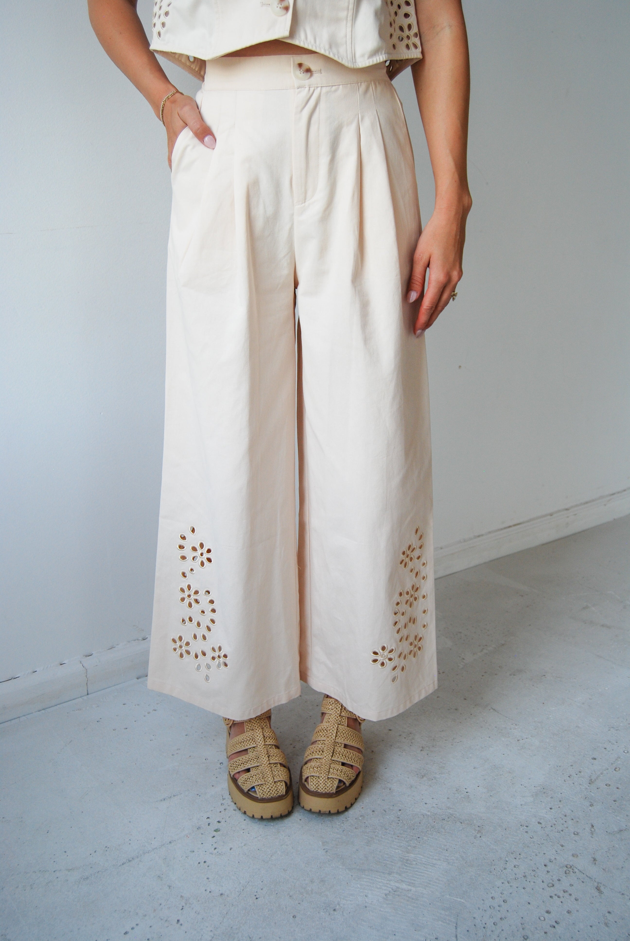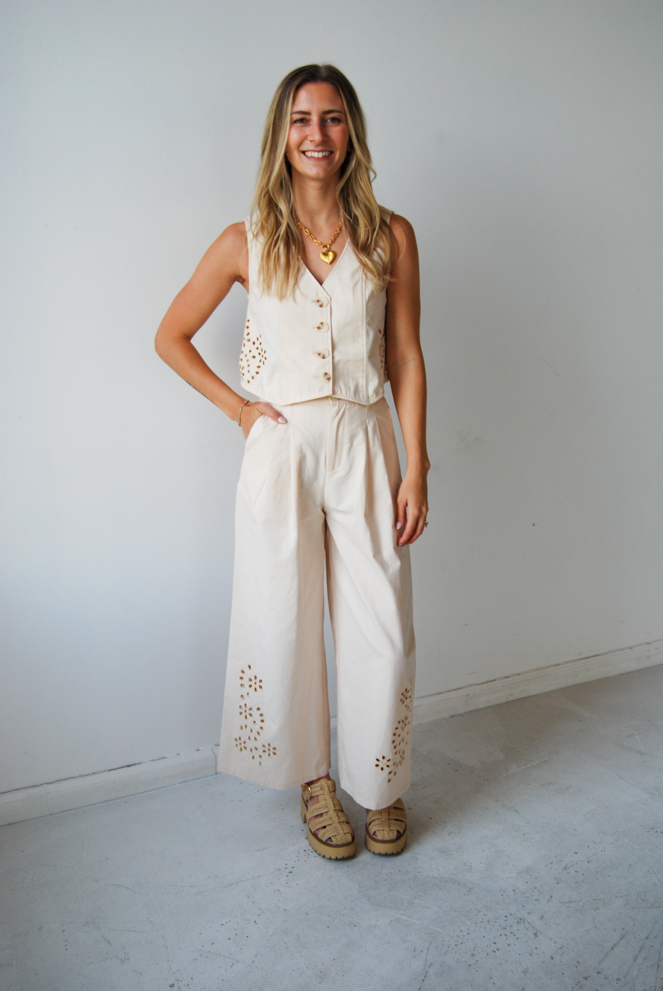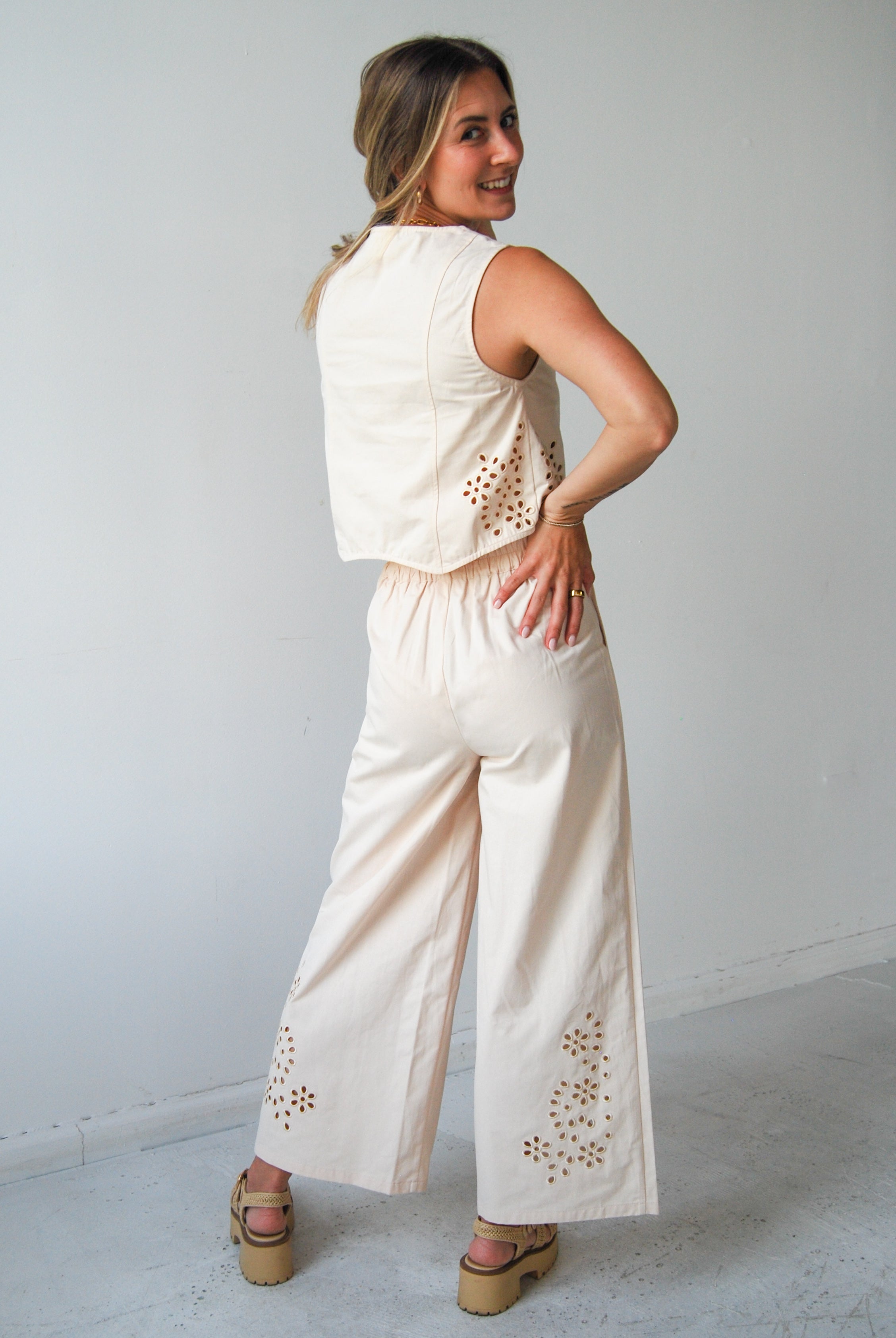 Unapologetically stylish in our She's A Statement Maker Pant. The eyelet embroidered fabric adds a touch of interest to any outfit, while the high waist and elastic back provide all-day comfort. With front pleats and a wide leg, these pants are a statement piece in and of themselves. Pair it with our matching top for the ultimate set moment!