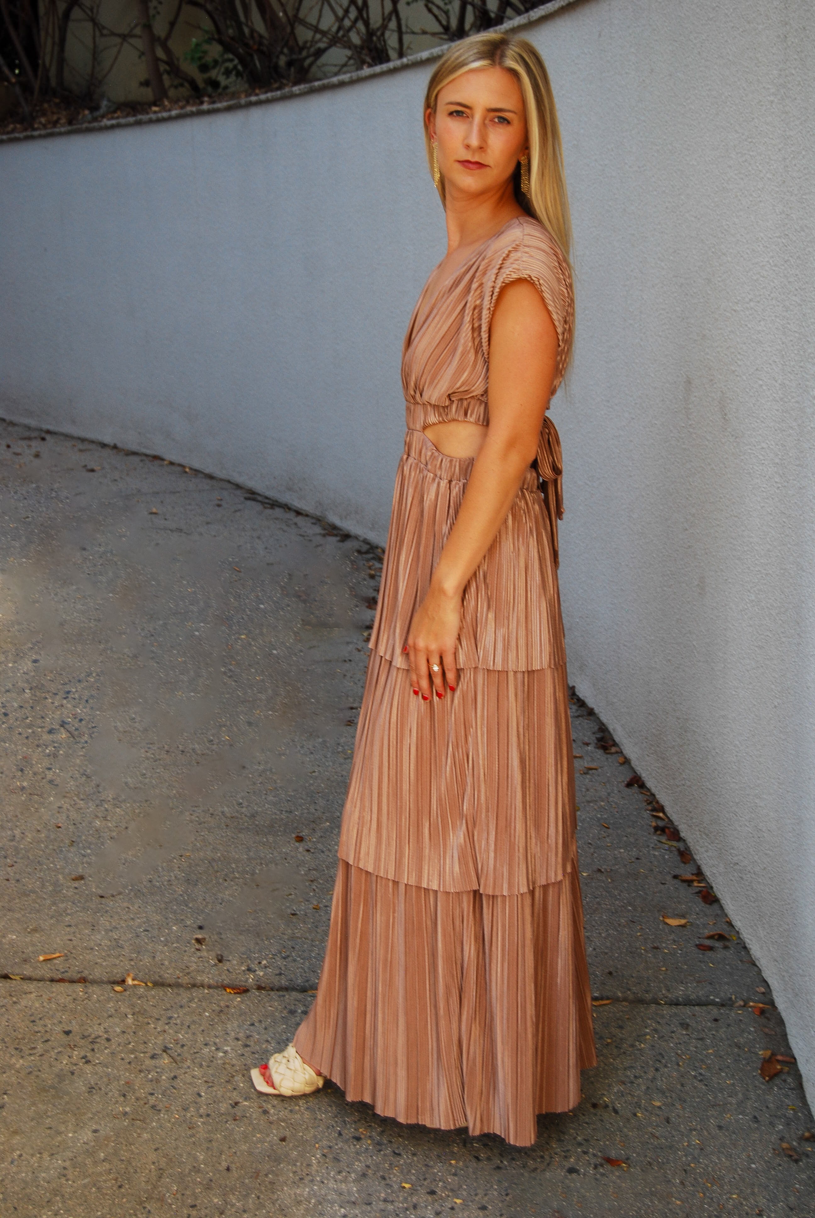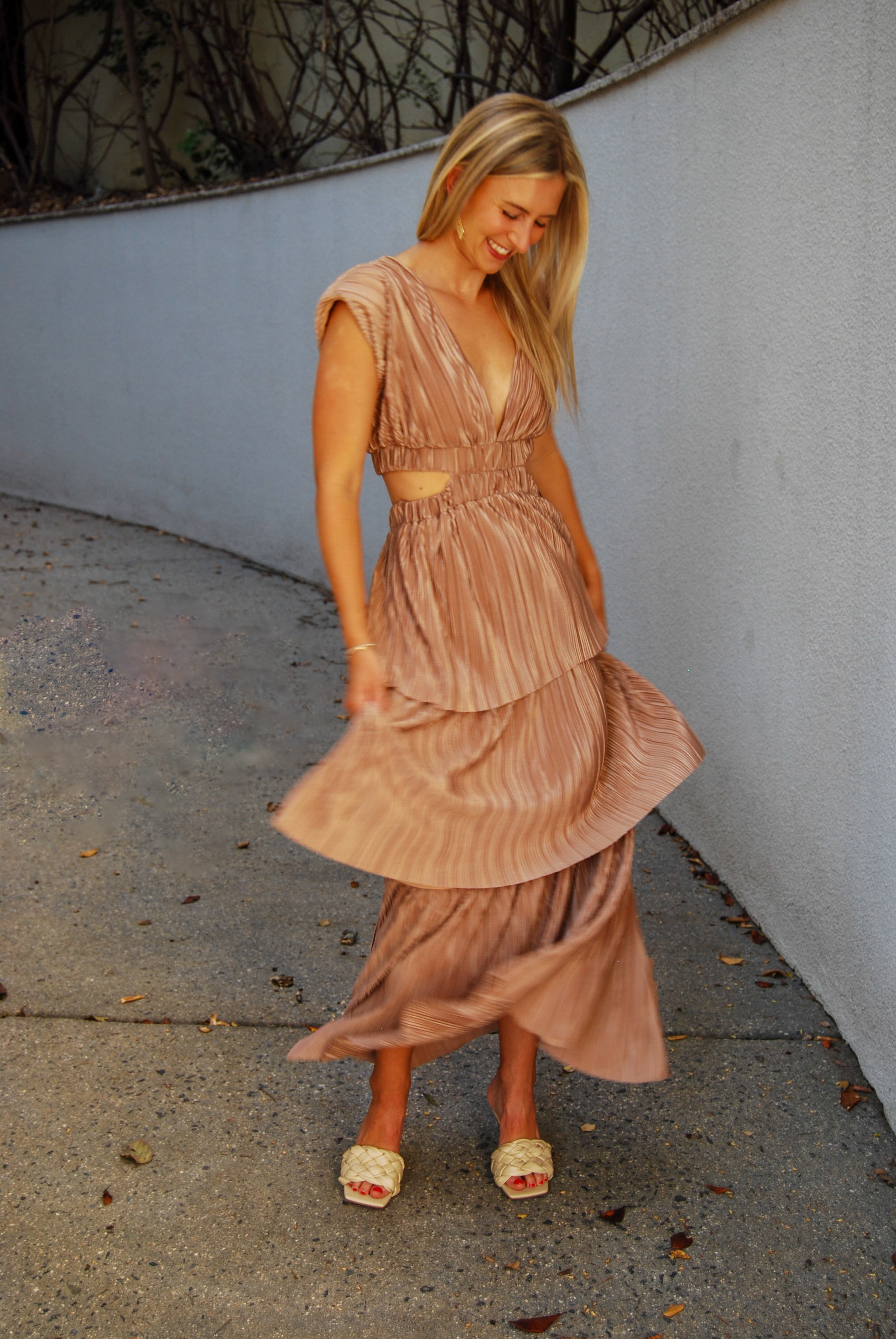 Get ready to turn heads in our She's A Stunner Dress! This champagne tiered maxi dress features a plunging neckline and open back, making you the ultimate show stopper. Perfect for any special occasion, this dress will have you feeling confident and gorgeous.
