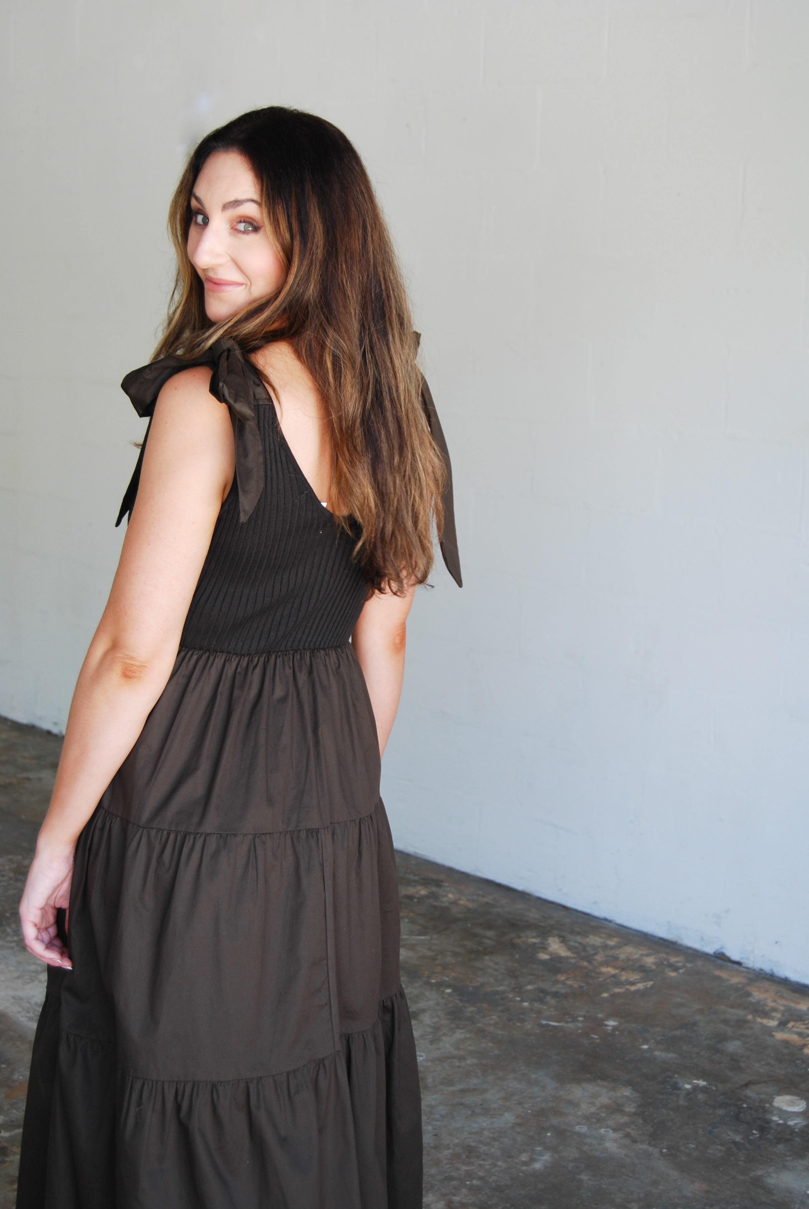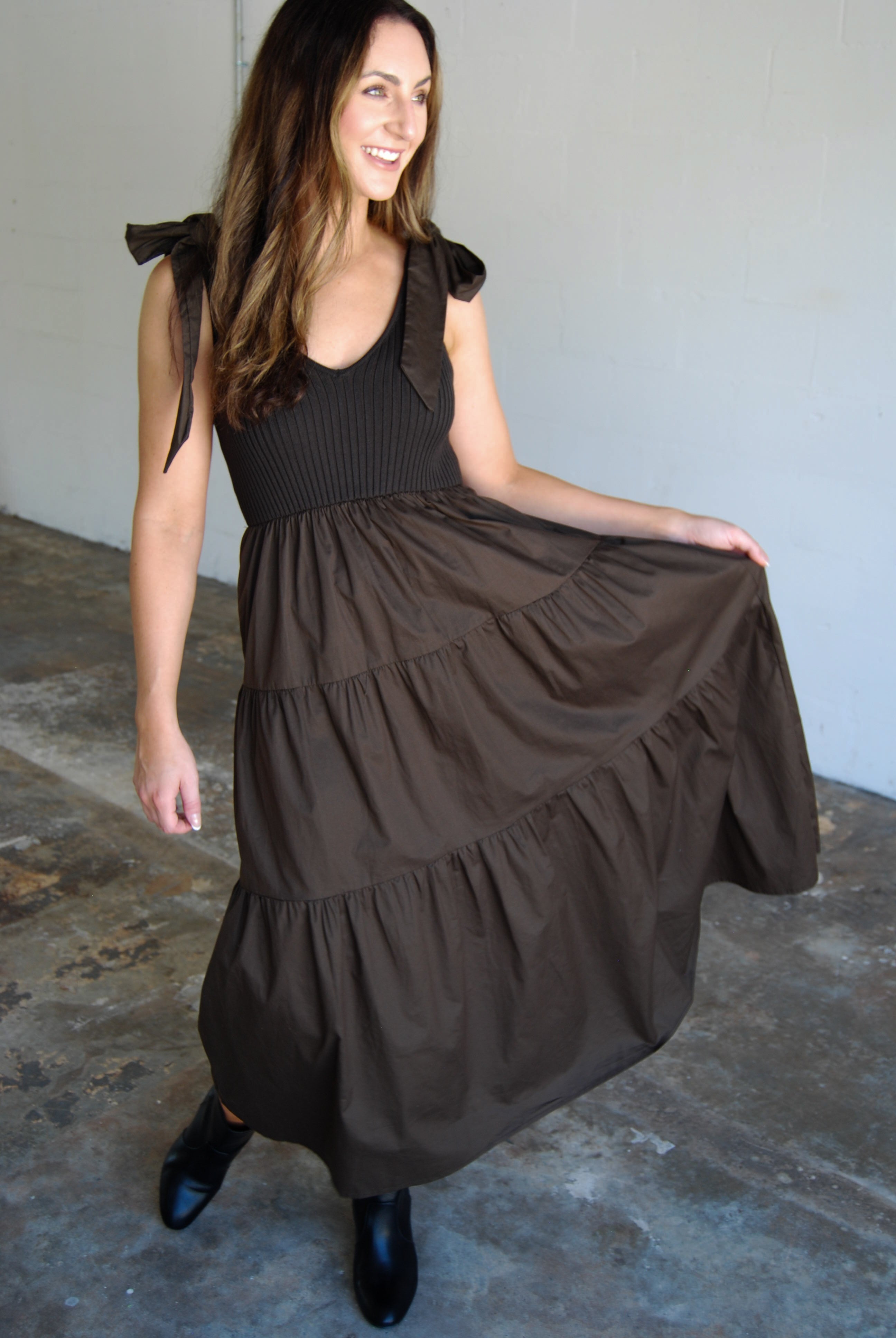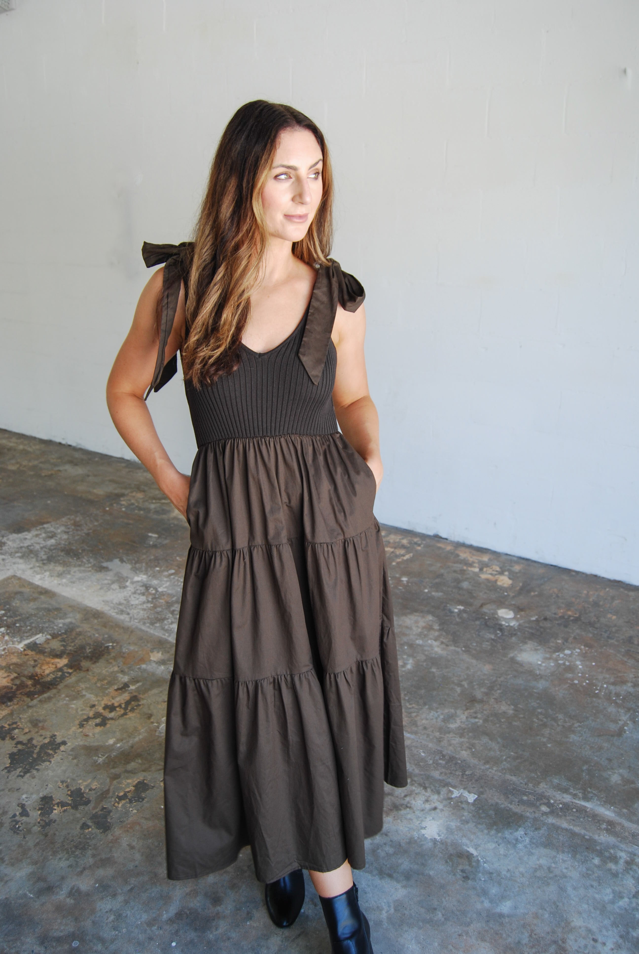 Get ready for some flirty fun with our Sienna Dress! This midi dress features a unique mix of knit and cotton fabrics for a comfy and stylish fit. Plus, with pockets and decorative shoulder ties, it's as practical as it is playful. Don't miss out on this must-have addition to your wardrobe!