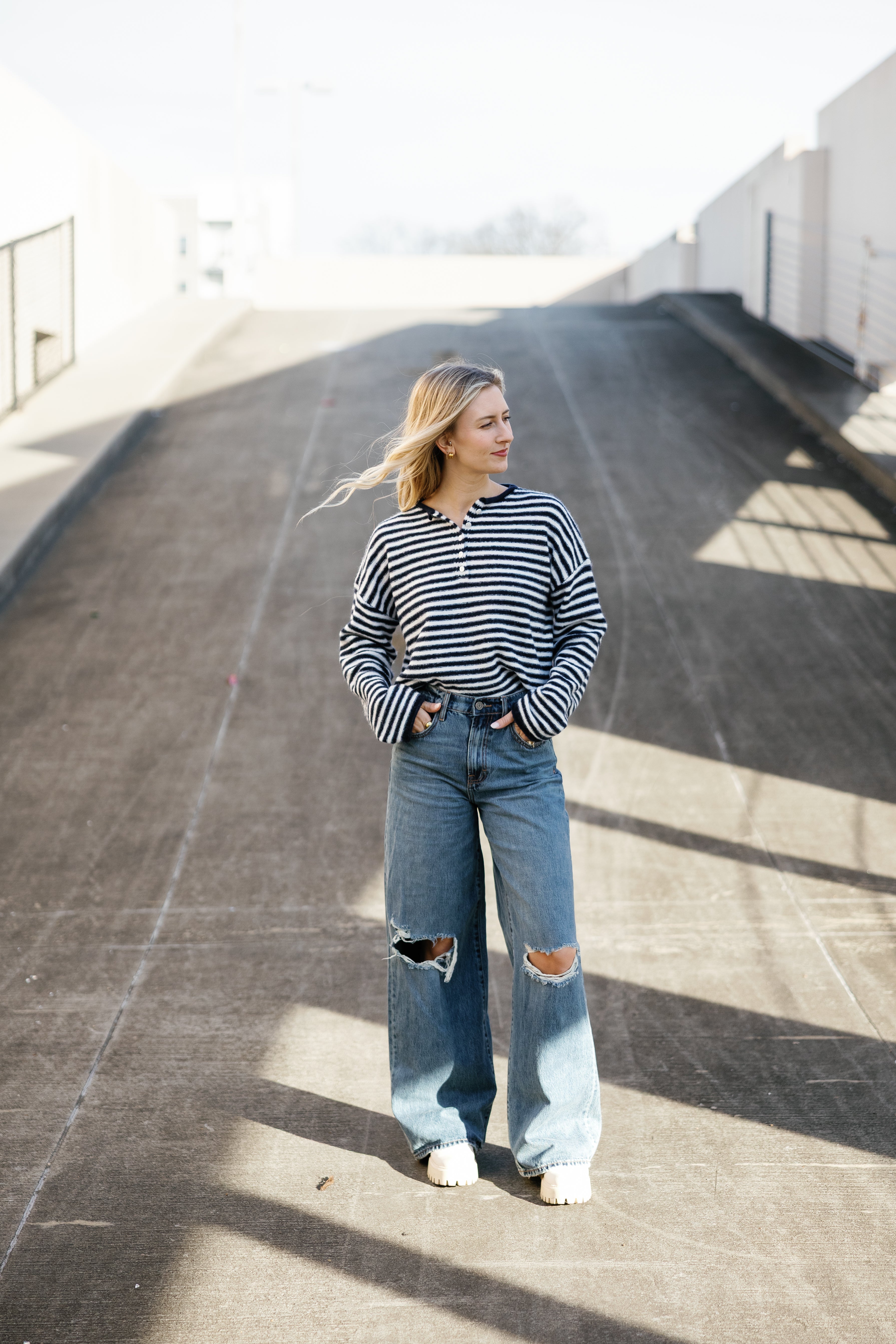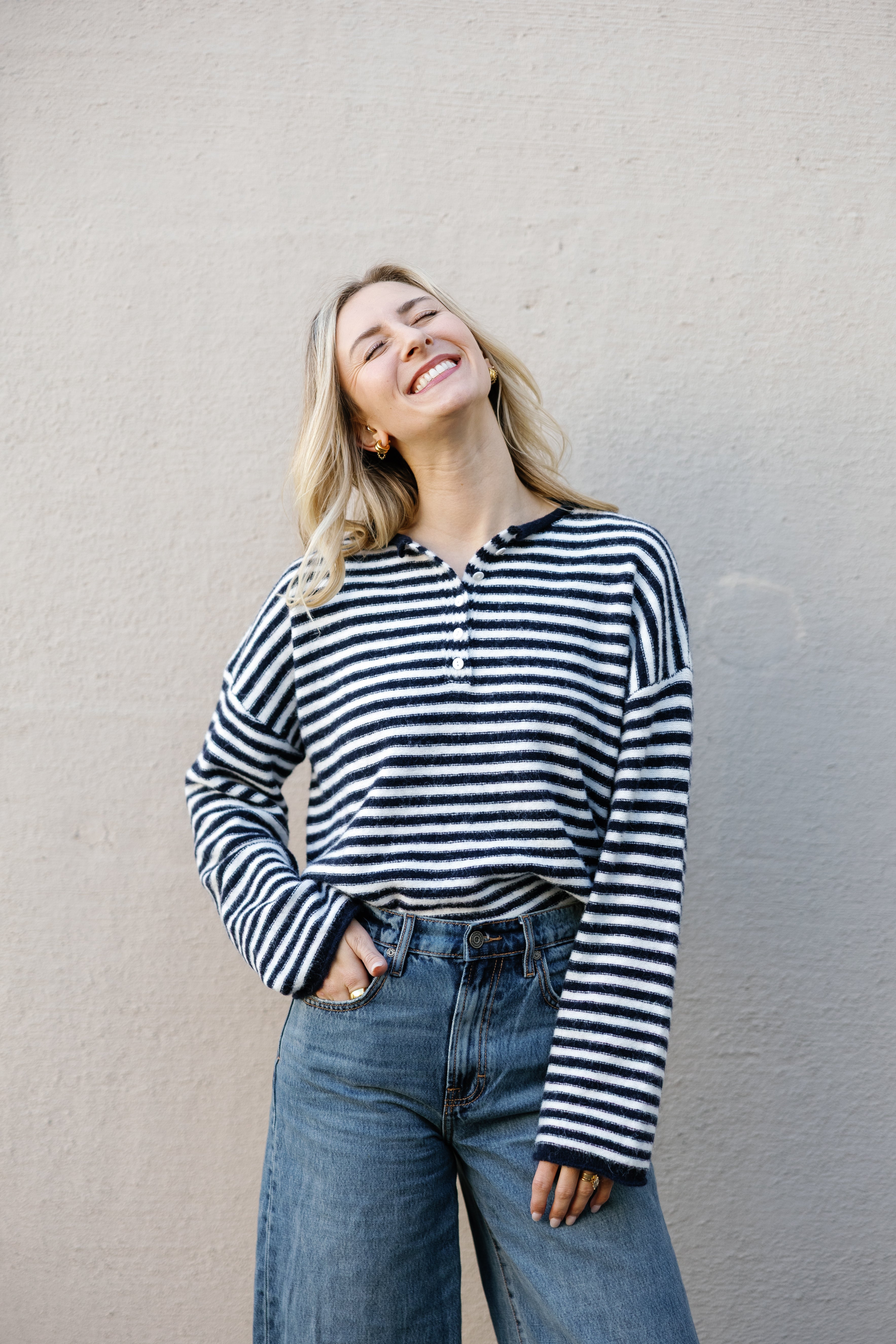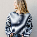 Introducing the New England Sweater—your wardrobe's new best friend. Sink into sumptuous soft knit adorned with striking stripes that bring visual interest to any outfit. The signature Henley neckline paired with a functional button placket strikes that perfect balance between casual and put-together. Slouchy drop shoulders and extended sleeves create an inviting, relaxed silhouette that begs to be layered. Throw it on solo for instant charm, or layer it for endless styling possibilities. Pure comfort meets playful style.