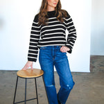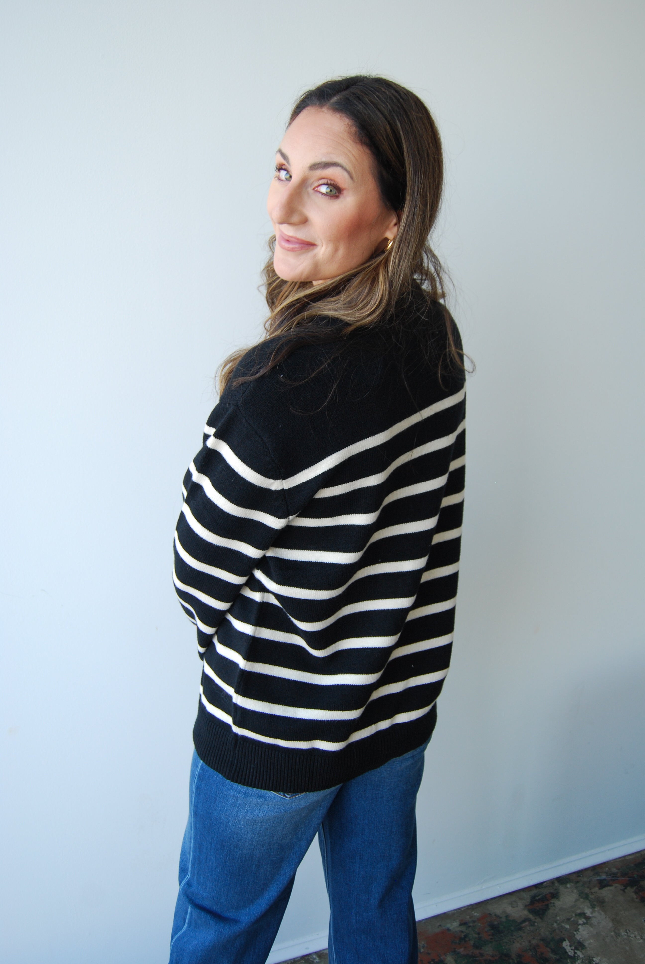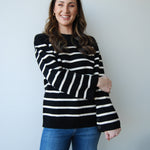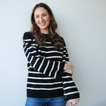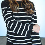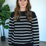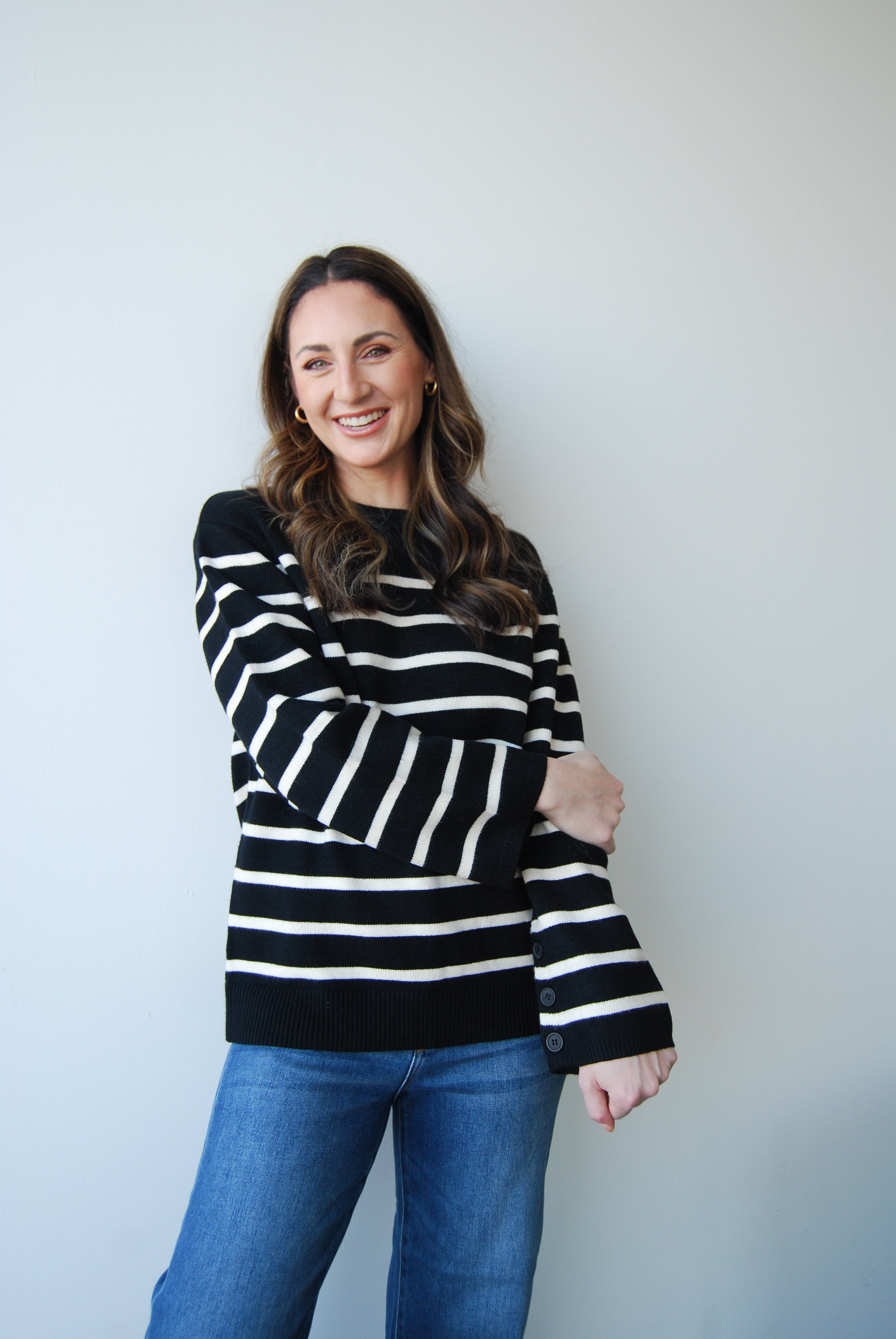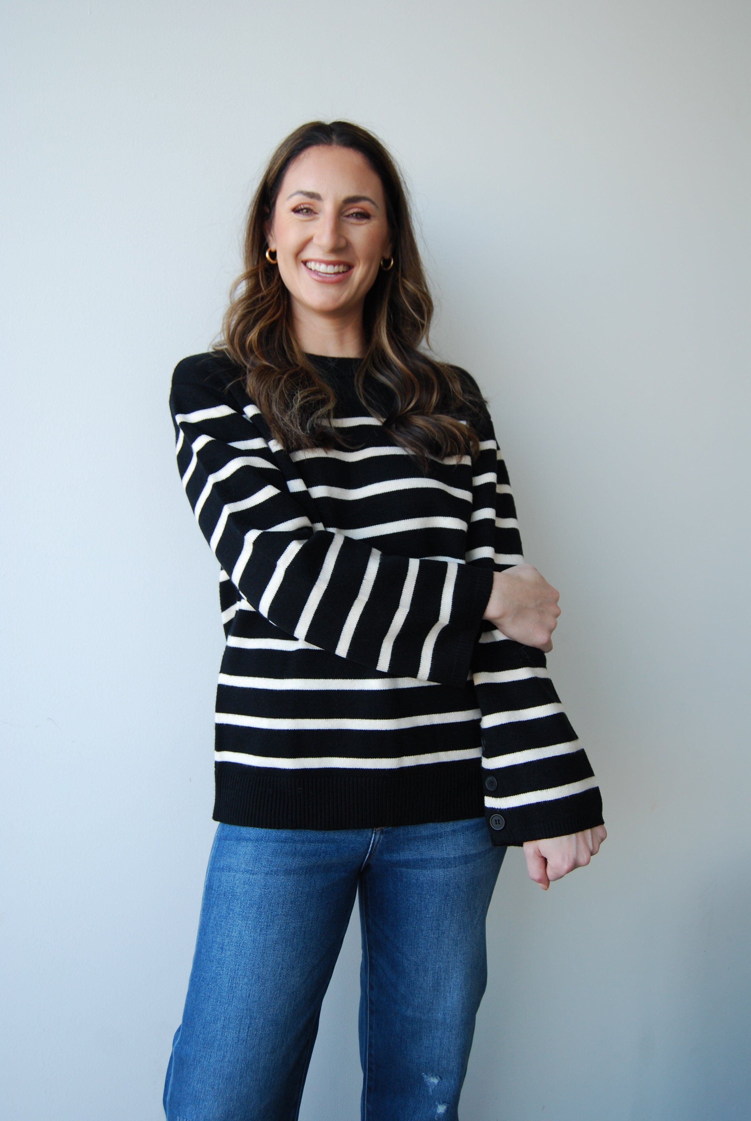 Get ready to add some sophisticated chic to your wardrobe with our Striped Simplicity Sweater! This timeless black and white striped sweater features unique button details on the sleeves, adding a touch of elegance to your outfit. Step out in style and fashion with this must-have piece.