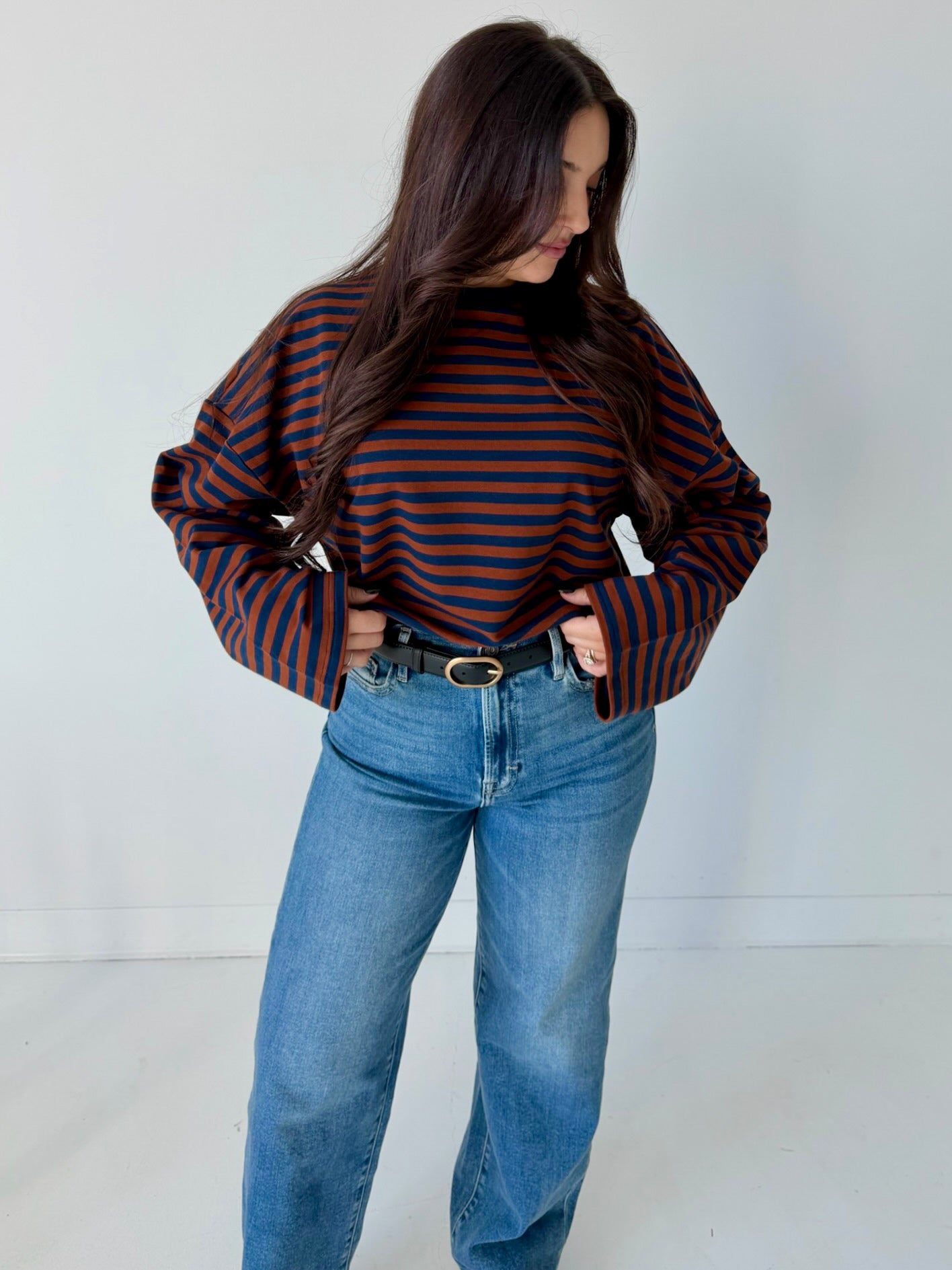 This striped long sleeve is your new go-to for effortless cool. Crafted in a cozy midweight terry knit, it showcases a bold striped design that demands attention. The relaxed fit, dropped shoulders, and generously wide sleeves create that perfect "I woke up like this" vibe, while the ribbed crew neck keeps things polished. Layer it, wear it solo—either way, you've got a timeless pattern that brings personality to your everyday rotation.