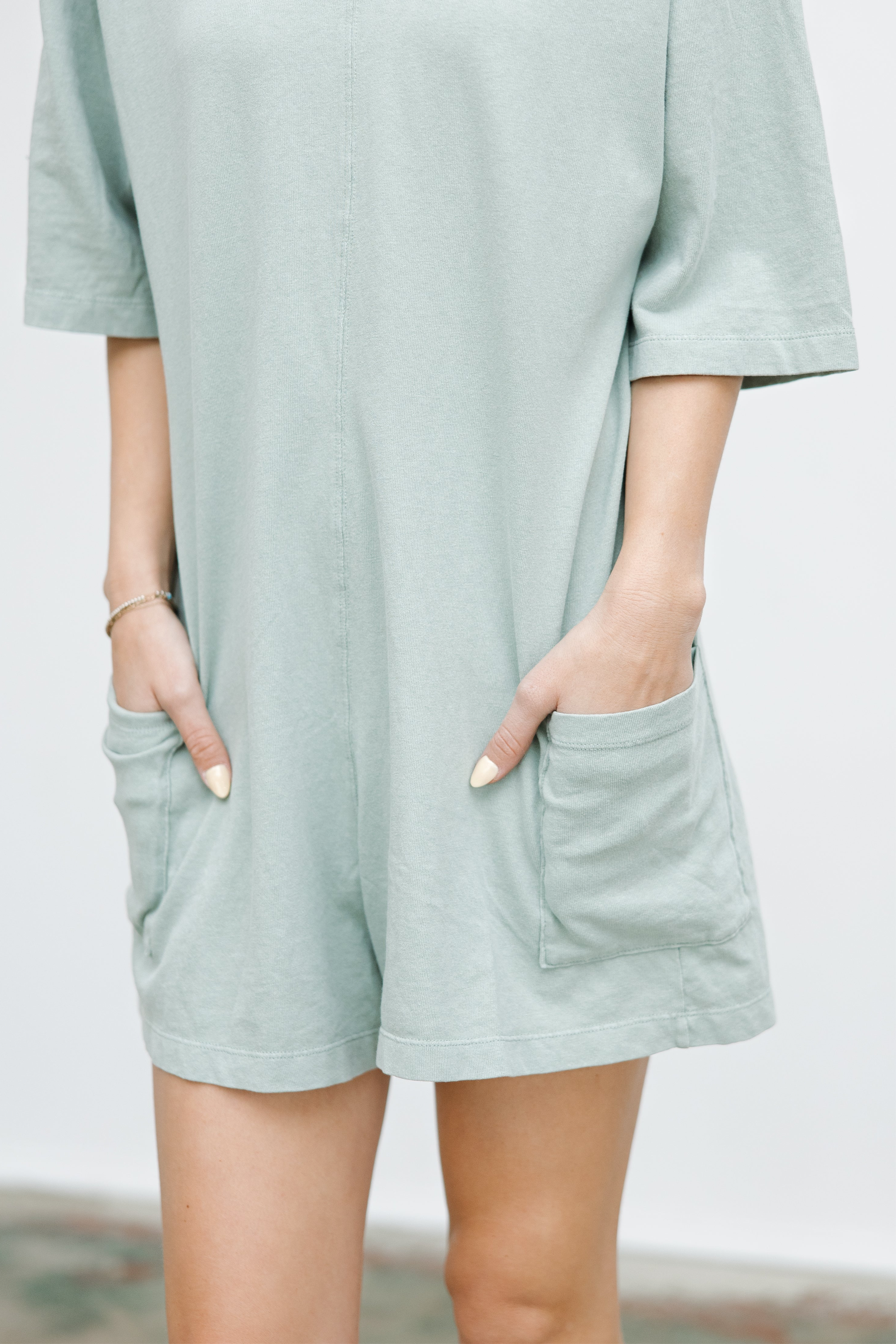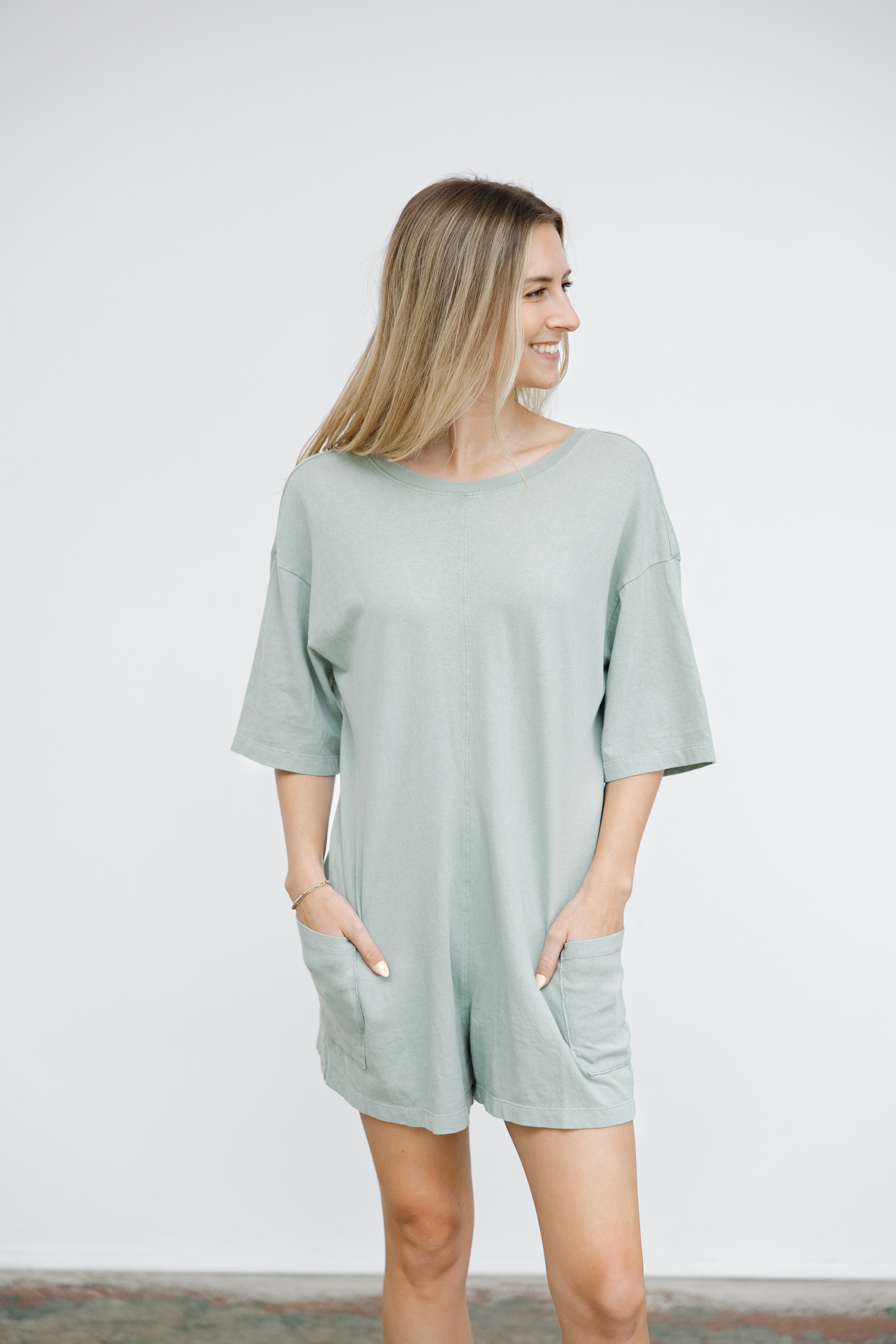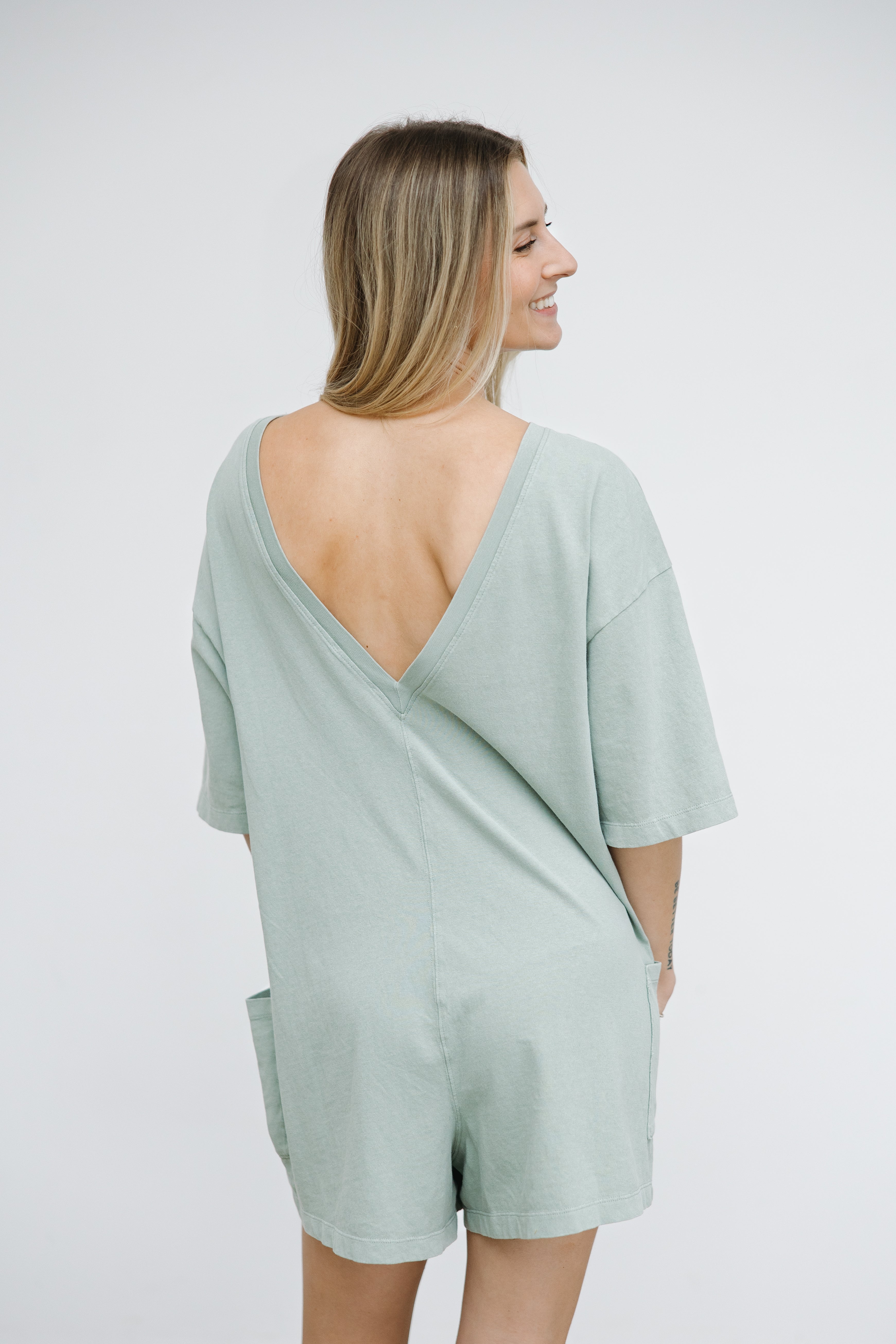 Introducing The Runaround Romper! A spin off the Free People hot shot onesie this cozy romper boasts a roomy fit and relaxed shape that's perfect for on-the-go days. With convenient front pockets and a unique V-shaped back, you'll never want to take it off!