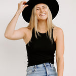 The Tiana Tank is a ribbed black knit tank that is a closet essential. Super comfy with a slightly shorter hemline this is great for pairing with high waisted bottoms or layering underneath your favorite shirts!