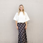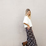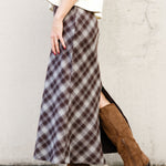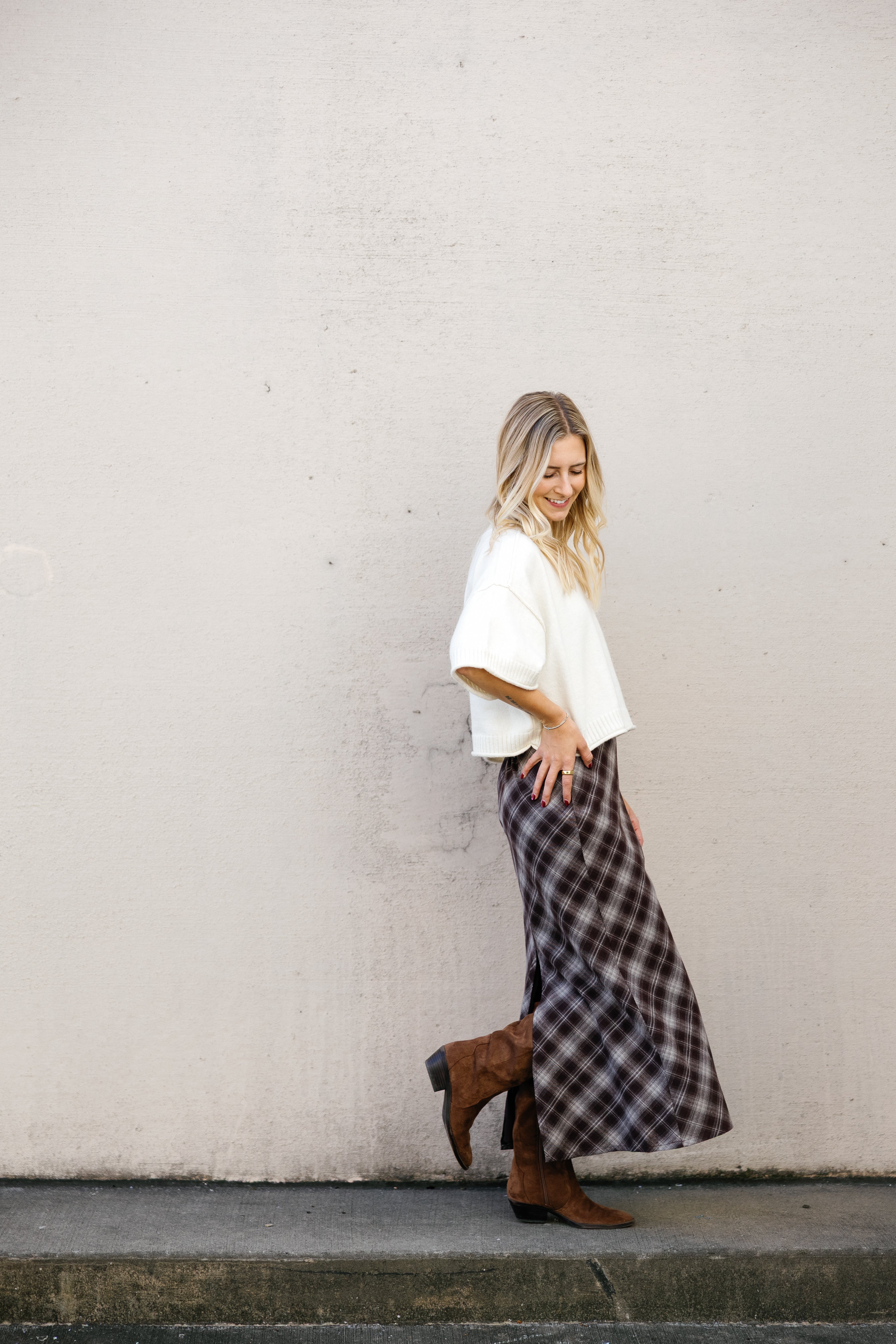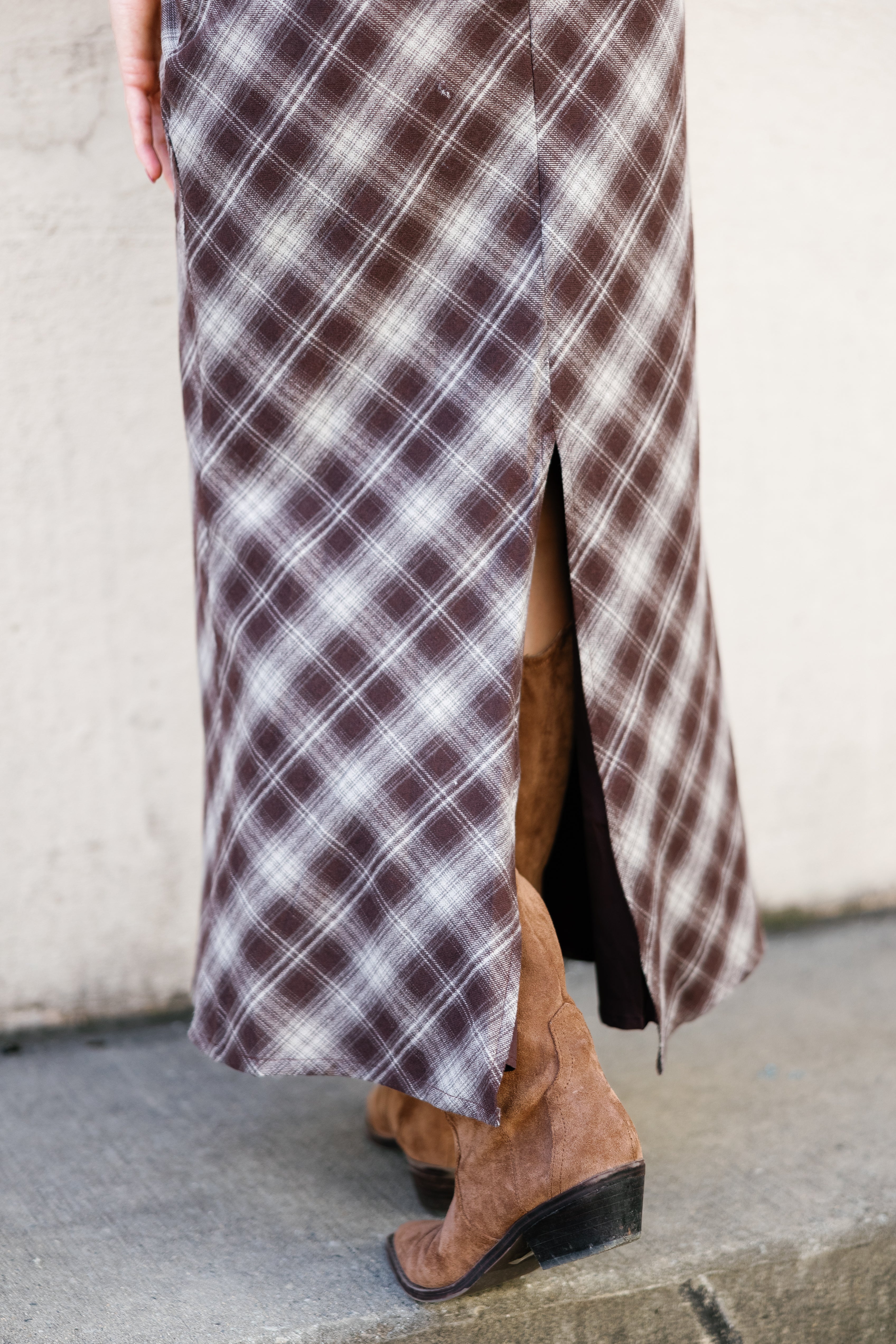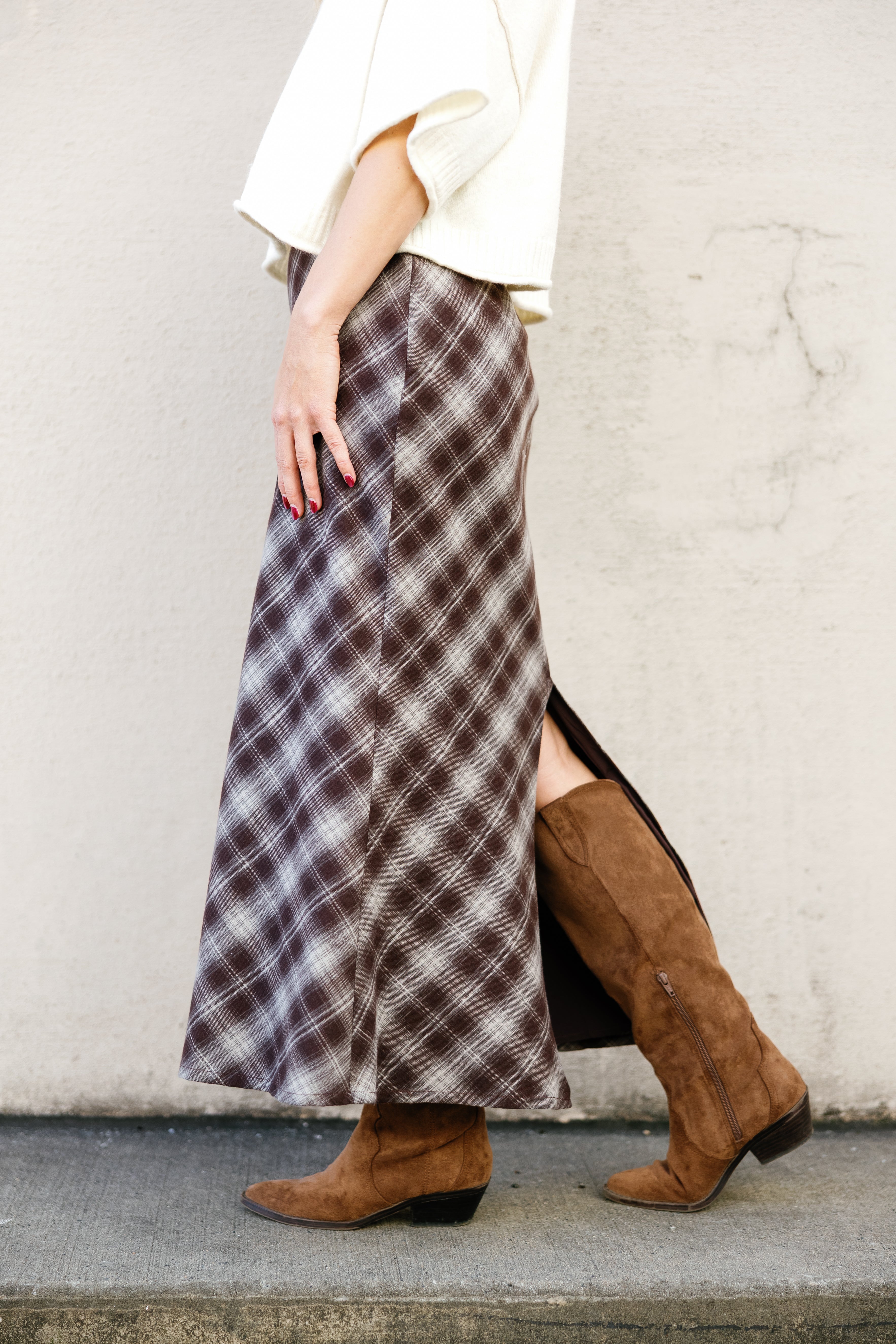 The timeless Give Thanks midi skirt is a wardrobe staple cut in a sleek, flattering A-line silhouette. Designed with a subtle back slit for ease of movement and comfort, this brown check midi skirt offers versatile styling. It pairs perfectly with boots or heels for any occasion, transitioning effortlessly from casual to dressy looks. The classic pattern ensures this slim-fit A-line skirt will be a favorite for seasons to come.